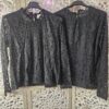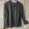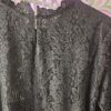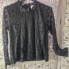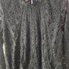 Blouse noire en dentelle, fleurs ajourées au niveau des bras, manches longues, doublée devant et derrière, col arrondit en dentelle. Magnifique ! A porter avec un gilet sans manches en fausse fourrure. Marque Choklate