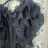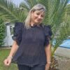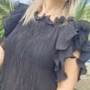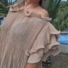 Blouse plissée, manches courtes en froufrou, col élastique ondulé, avec la possibilité de mettre cette blouse en épaules dénudées. Bas ondulé