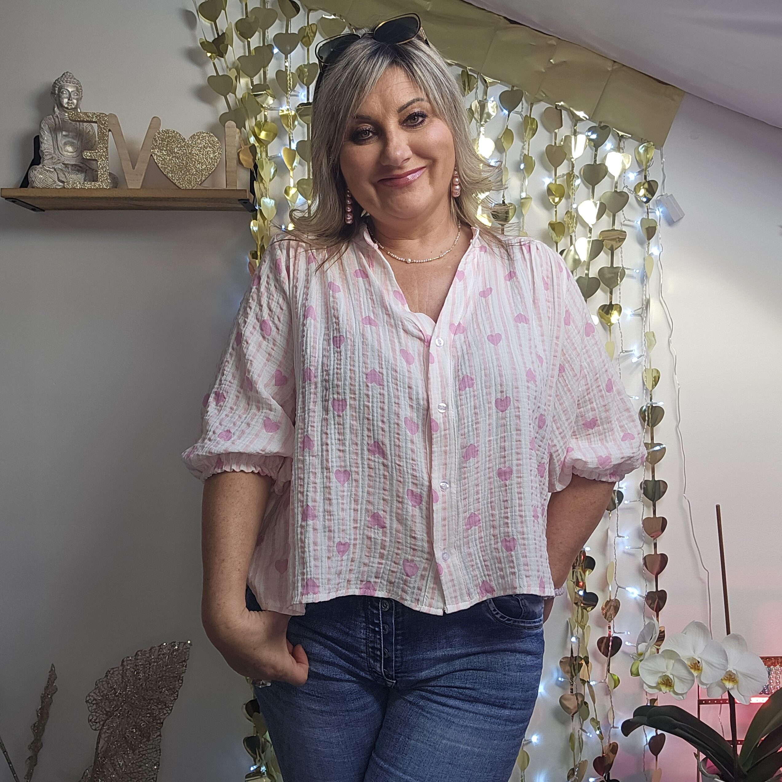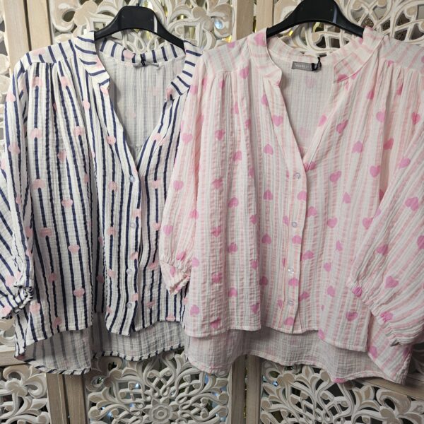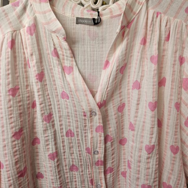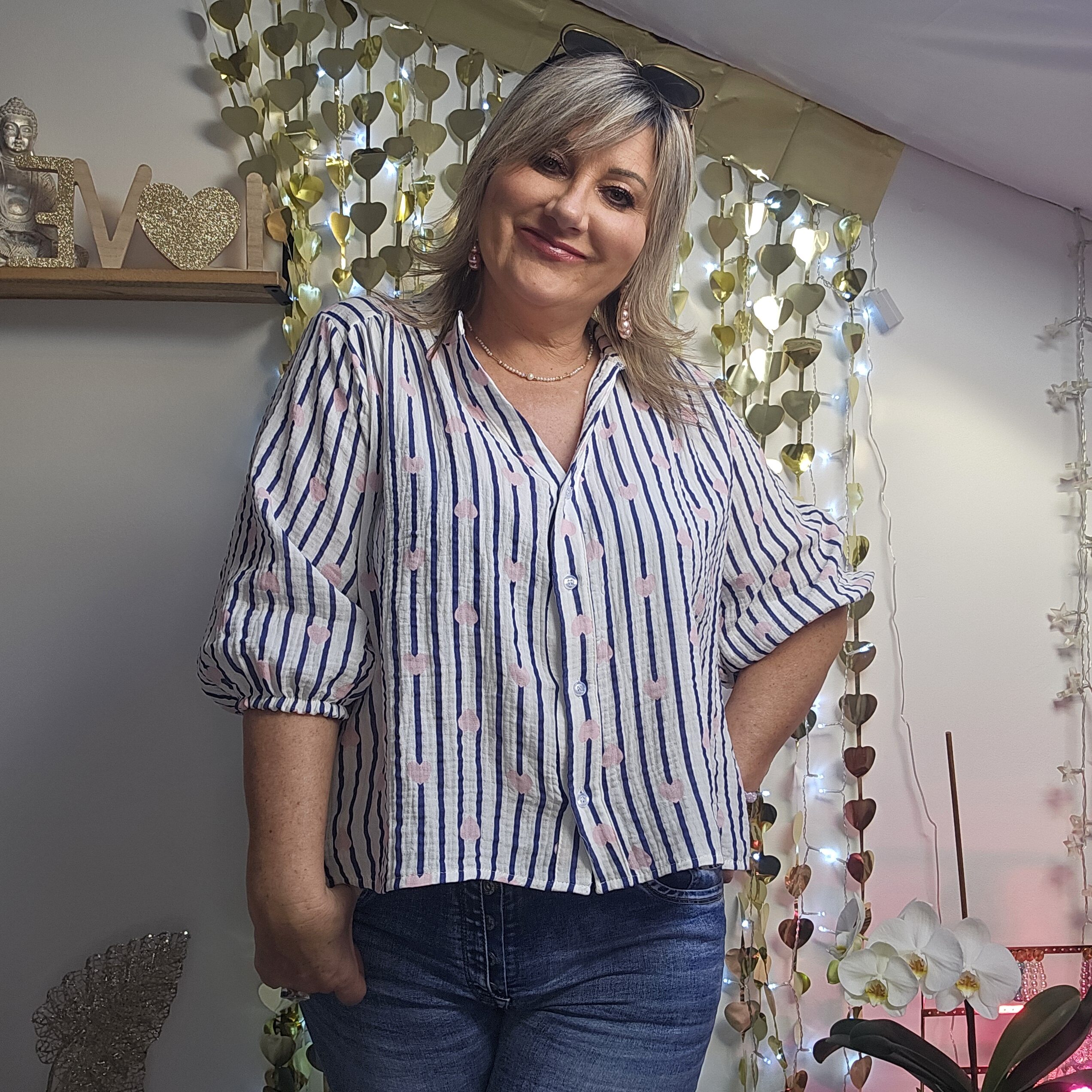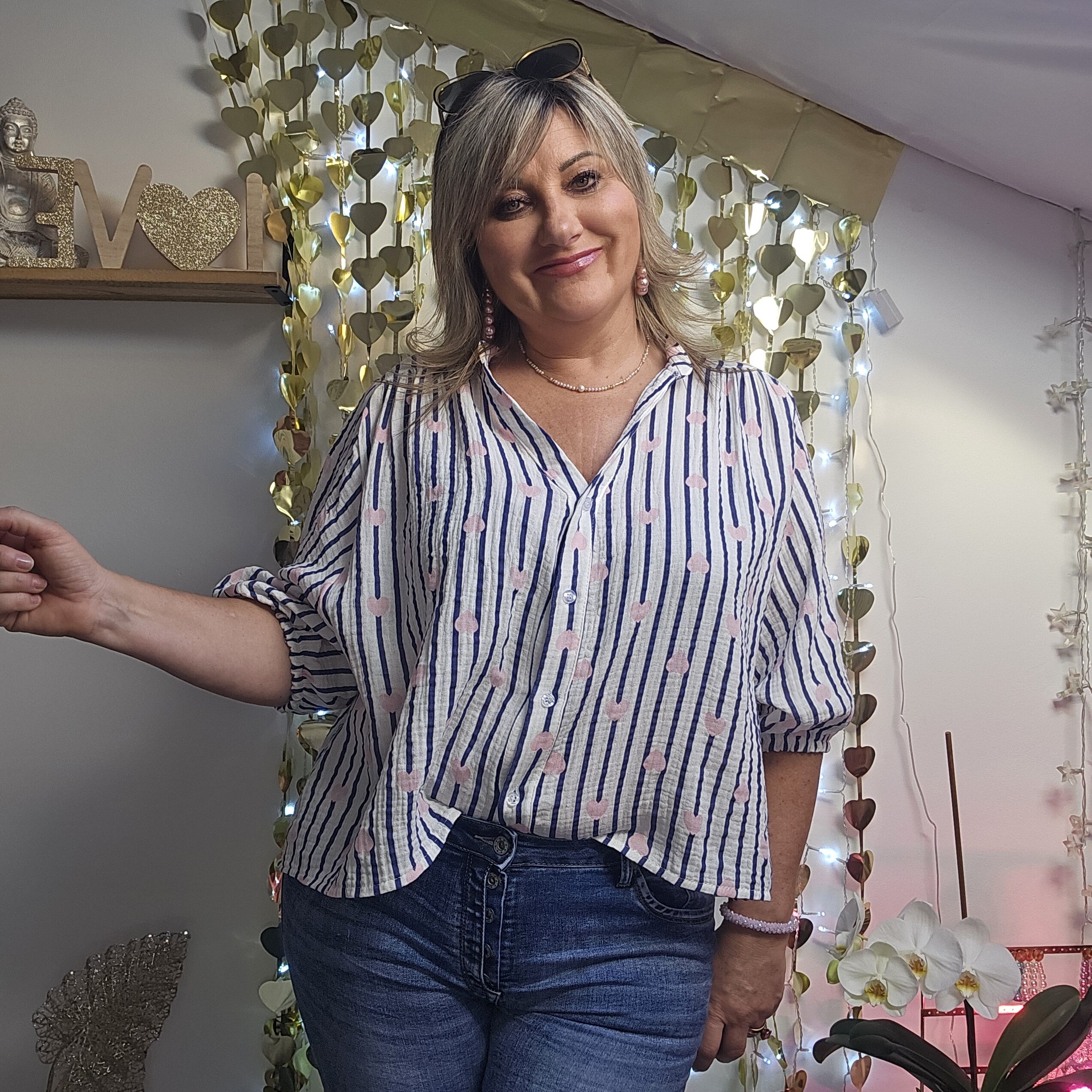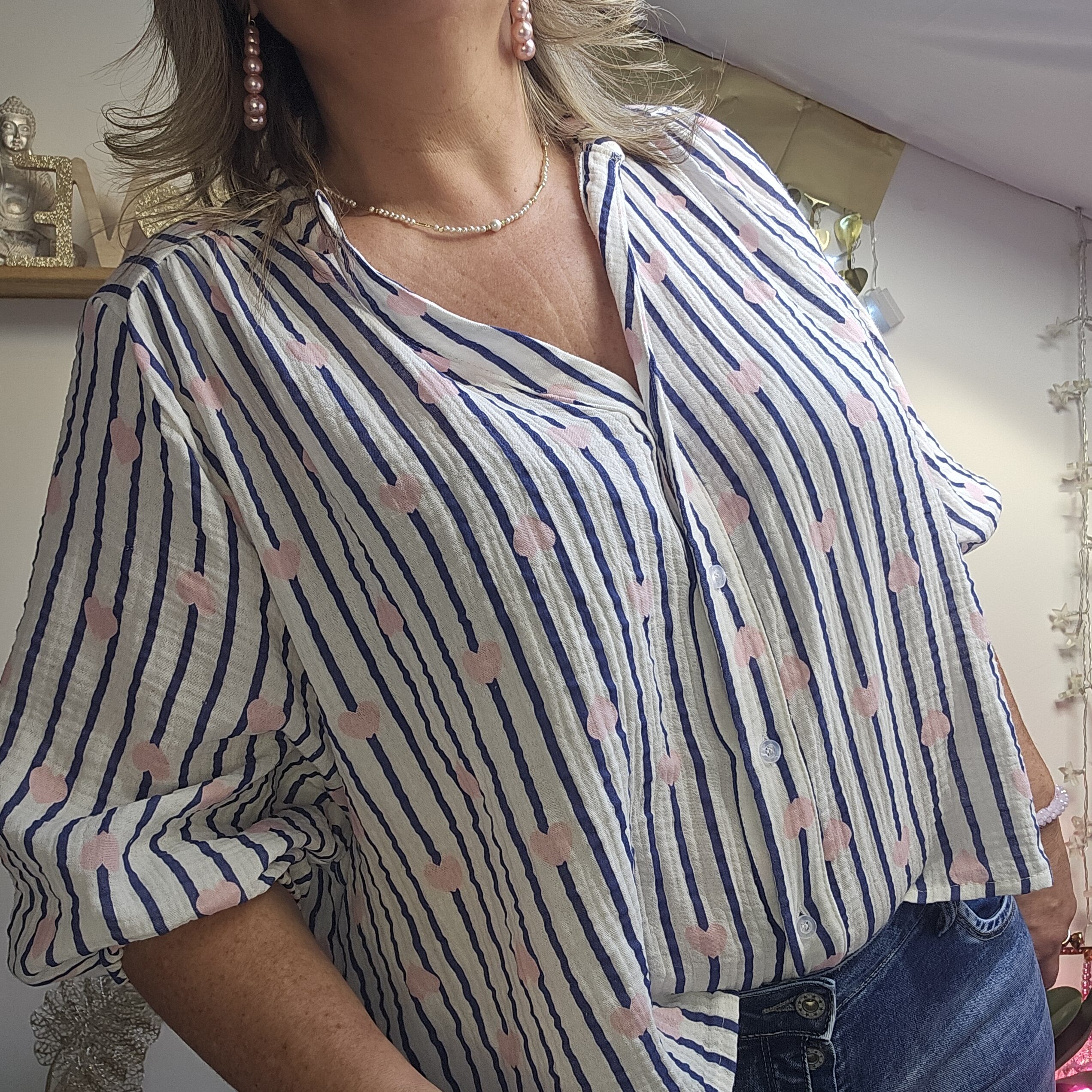Mon regard pailleté : Chemise très légère, et agréable à porter. On aime l’originalité de cette blouse, des rayures et des cœurs. Peut se porter avec un jean’s.