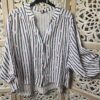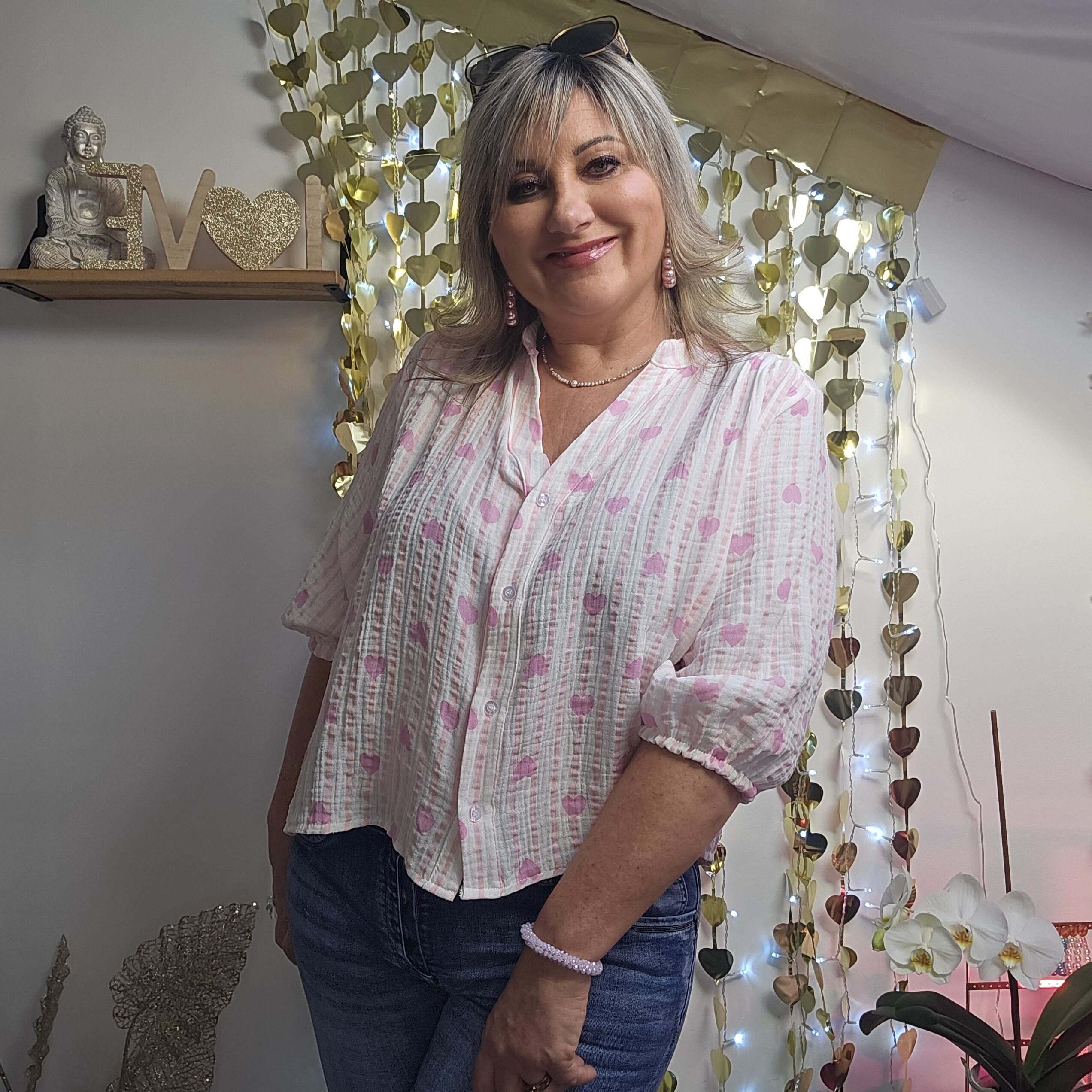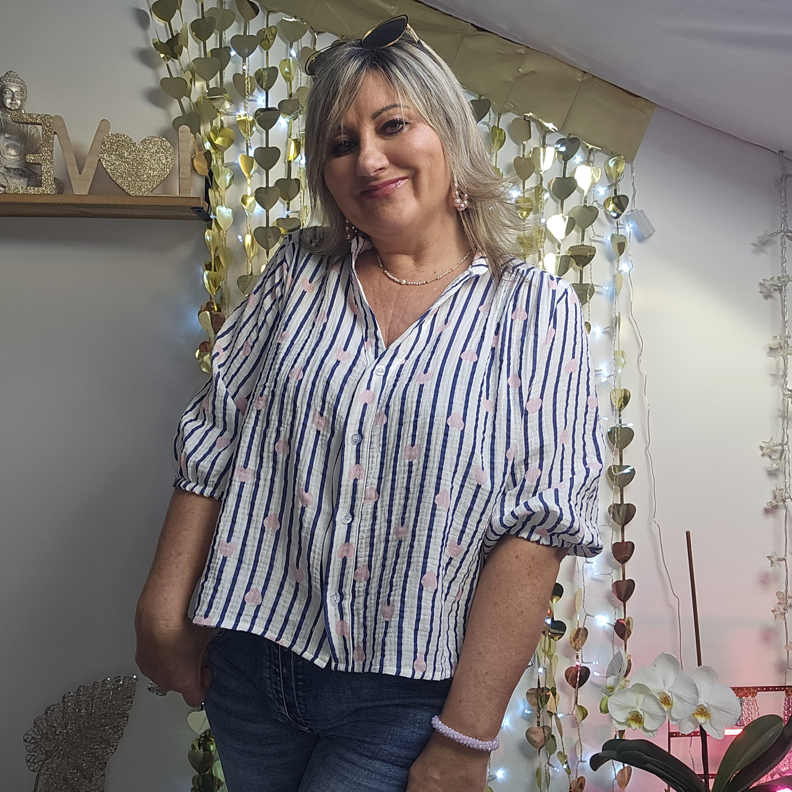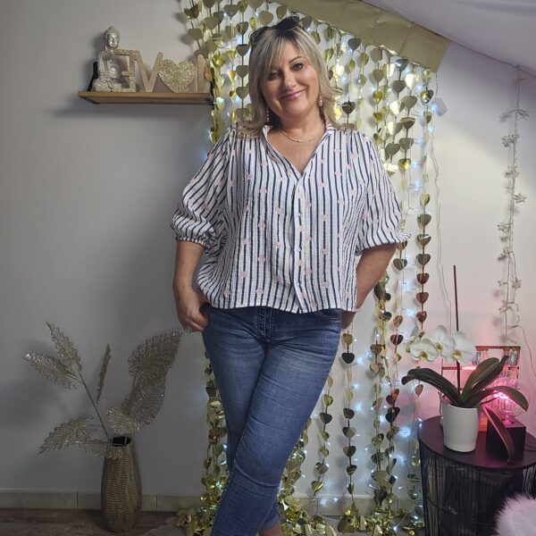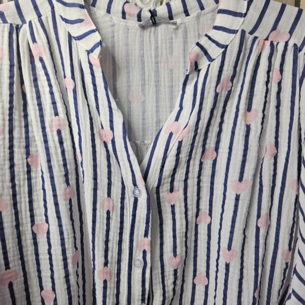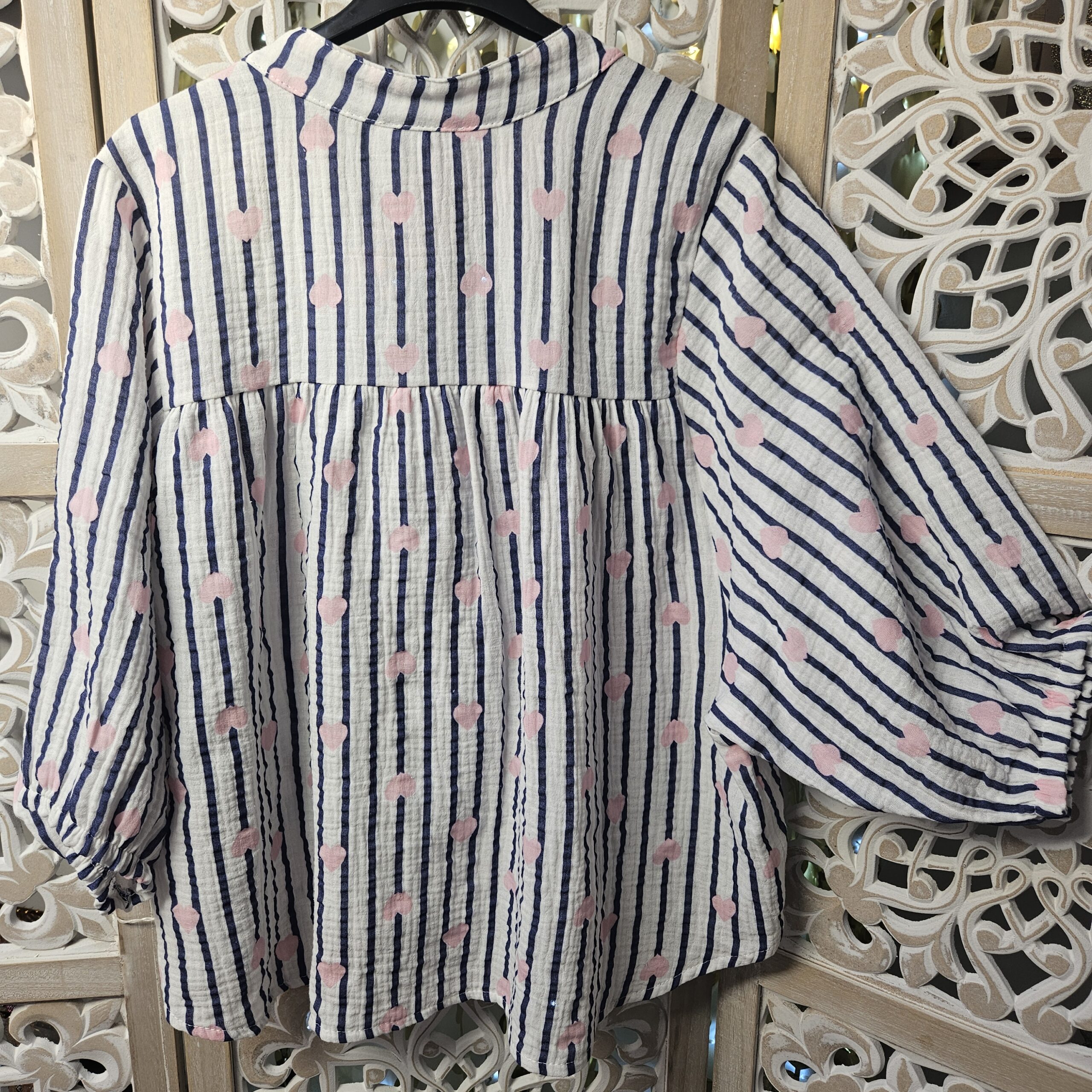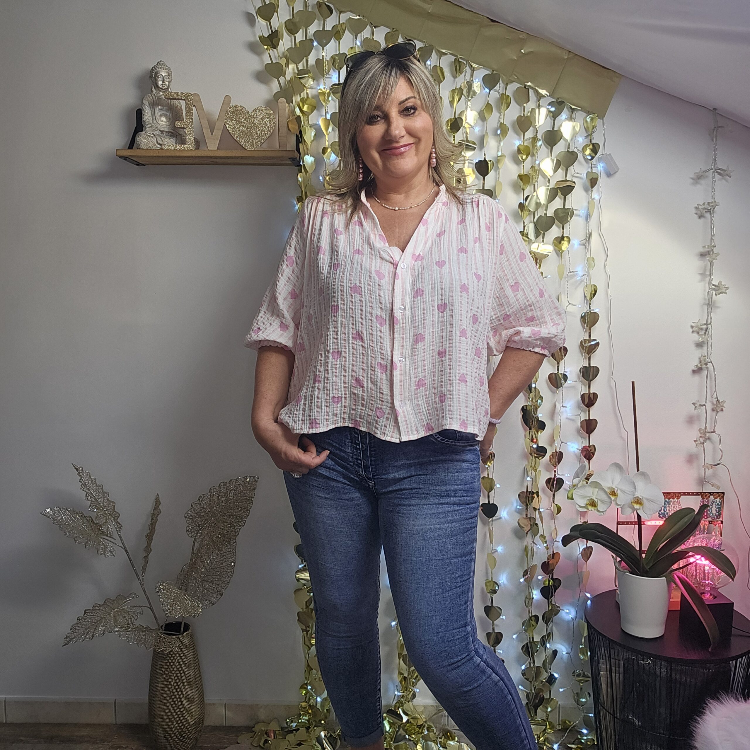 Mon regard pailleté : Chemise très légère, et agréable à porter. On aime l’originalité de cette blouse, des rayures et des cœurs. Peut se porter avec un jean’s.