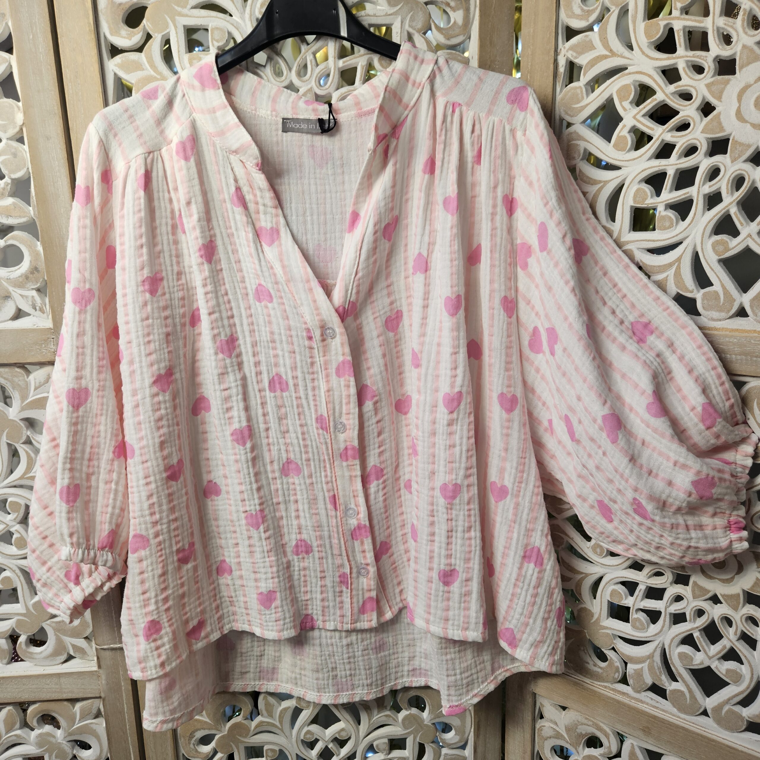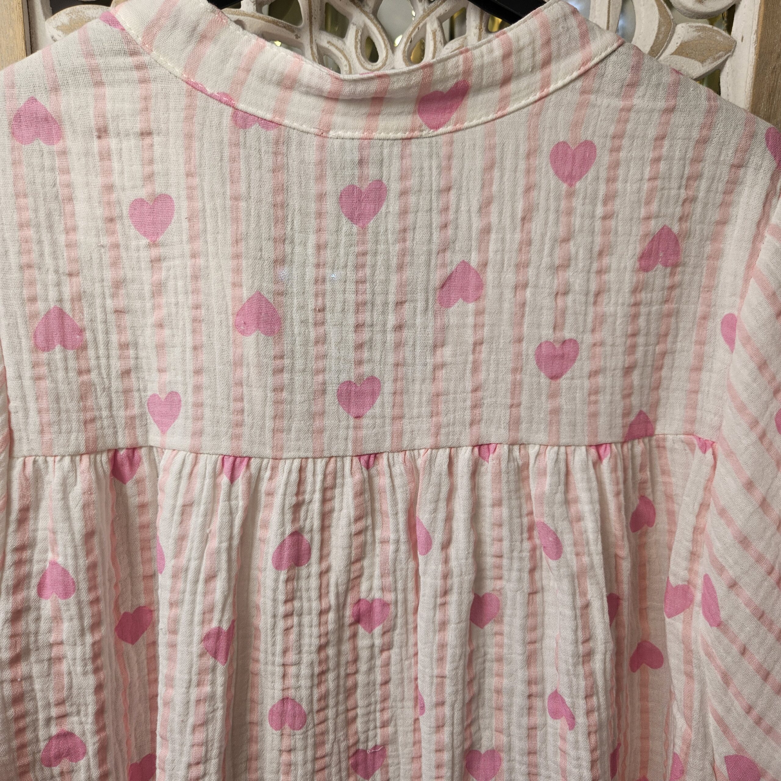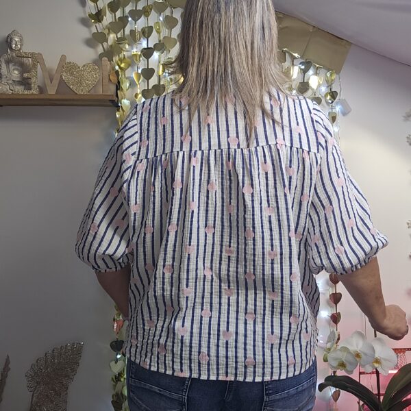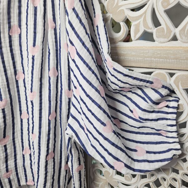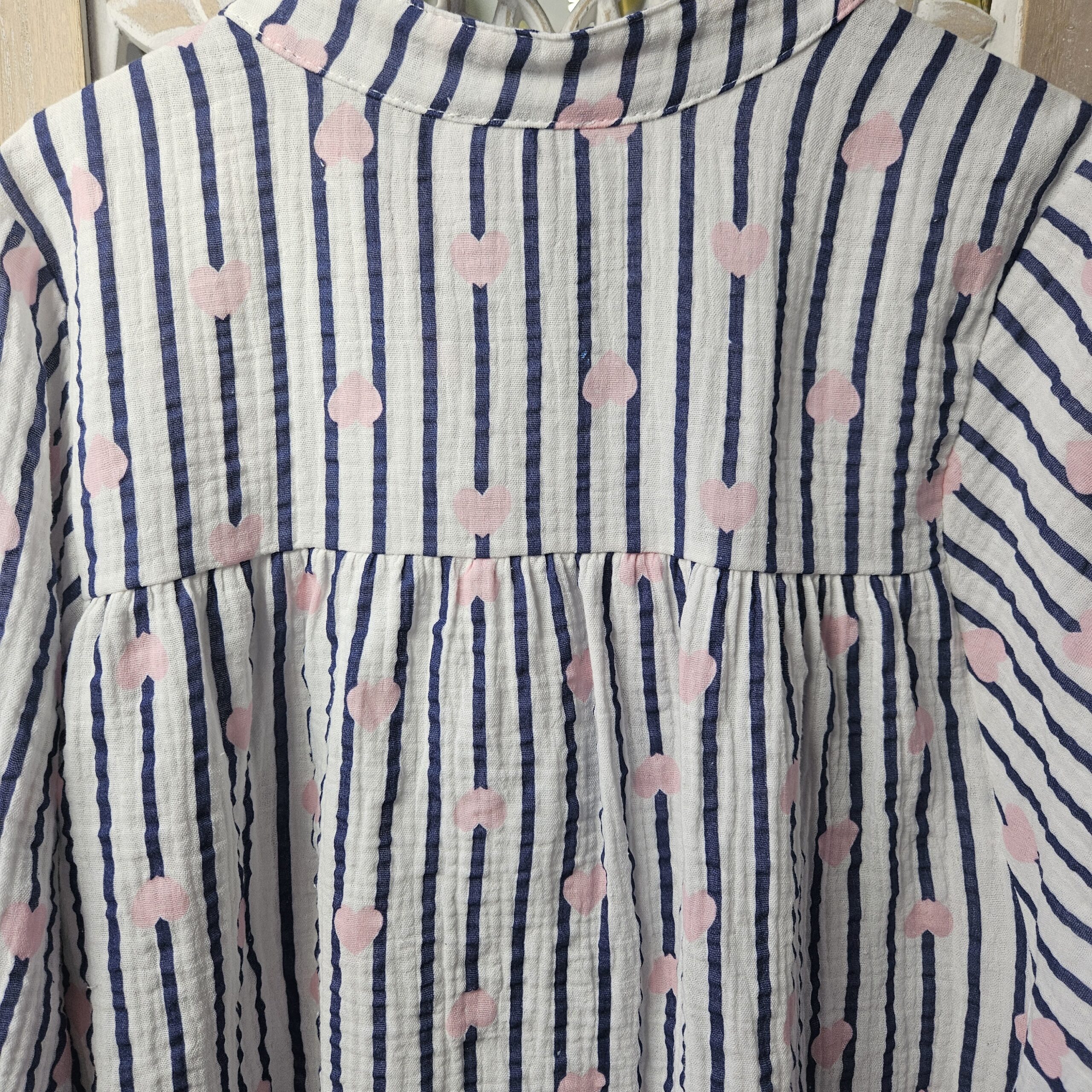 Chemise en gaze de coton, courte devant et légèrement plus longue derrière, en arrondie, col officier et en V, manches 3/4 chauve souris avec élastique au bout. Blouse rayée avec des cœurs roses : existe rayée rose baby avec des cœurs roses et rayée bleu marine avec des cœurs roses. Légère et très agréable à porter.