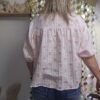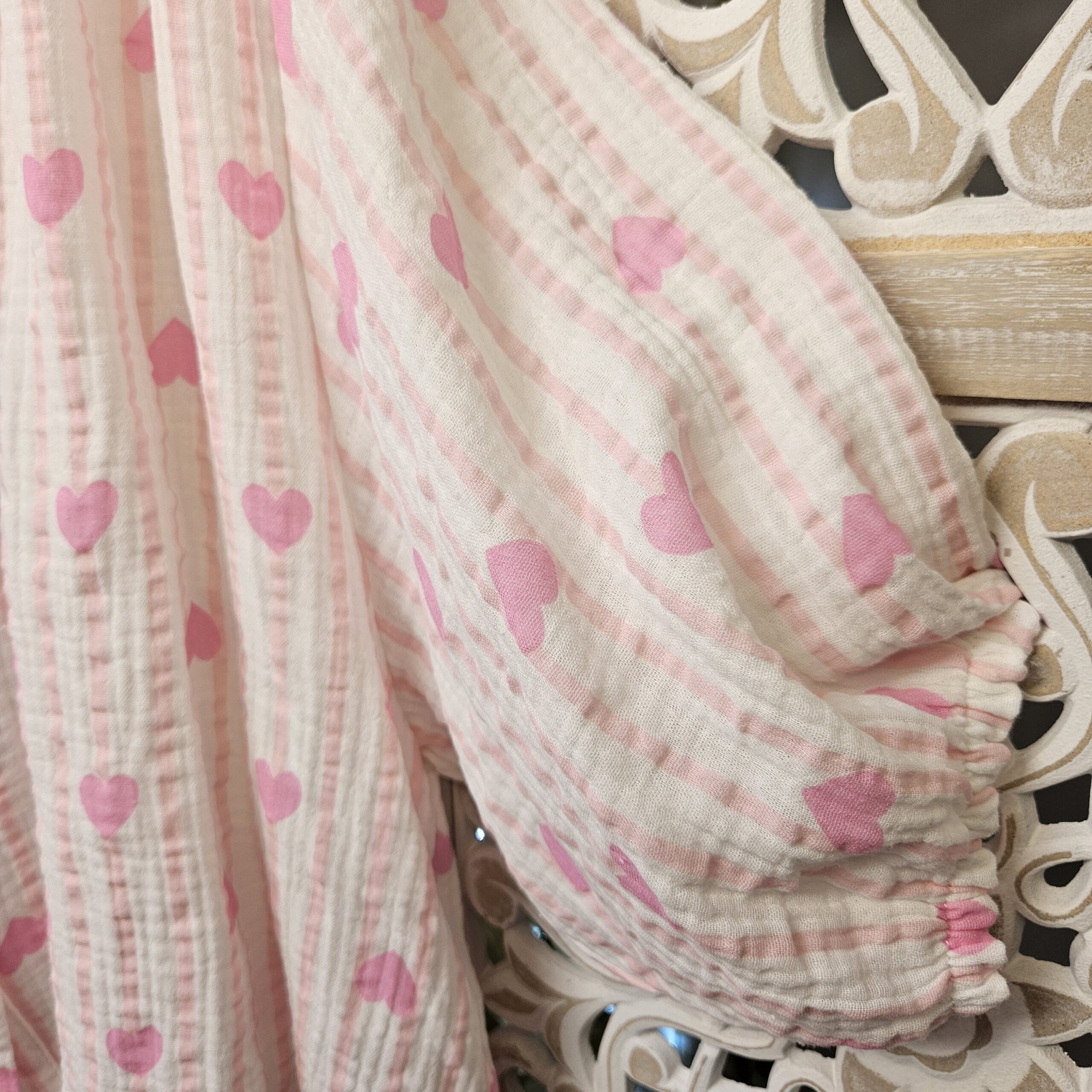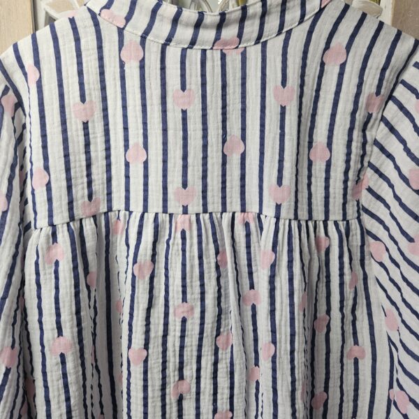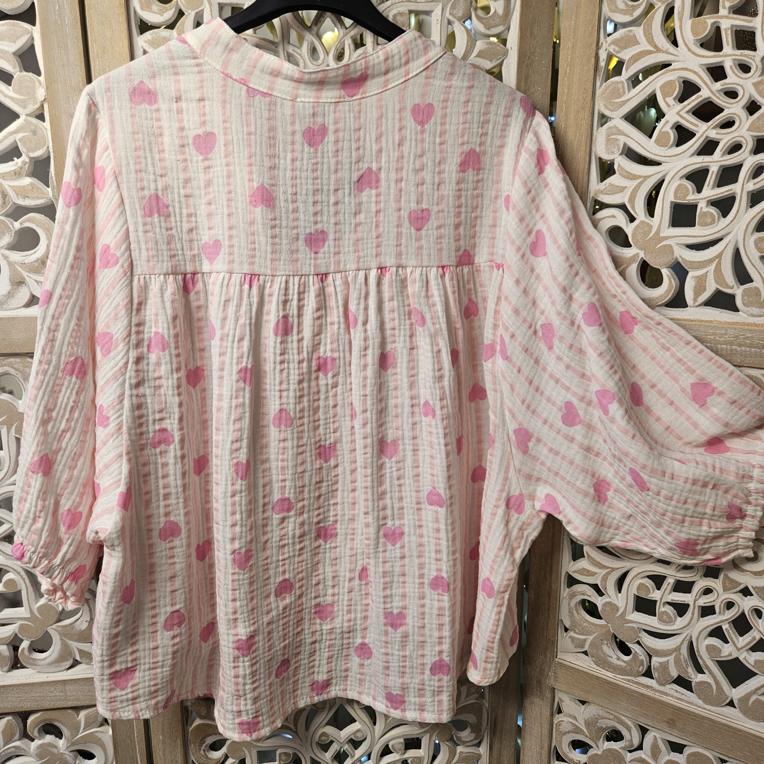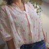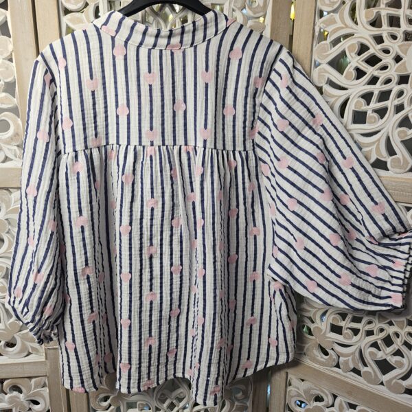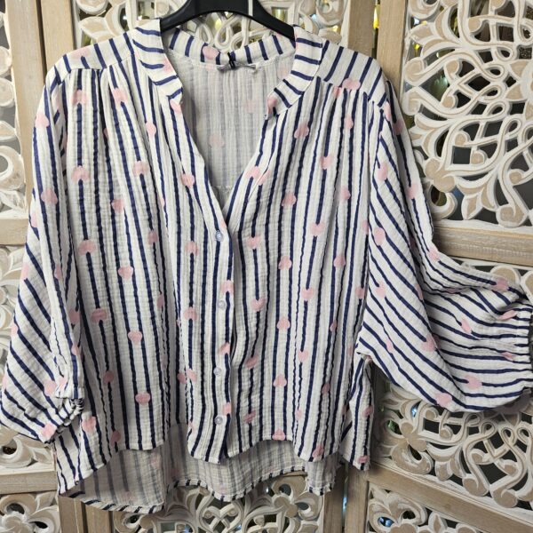 Chemise en gaze de coton, courte devant et légèrement plus longue derrière, en arrondie, col officier et en V, manches 3/4 chauve souris avec élastique au bout. Blouse rayée avec des cœurs roses : existe rayée rose baby avec des cœurs roses et rayée bleu marine avec des cœurs roses. Légère et très agréable à porter.