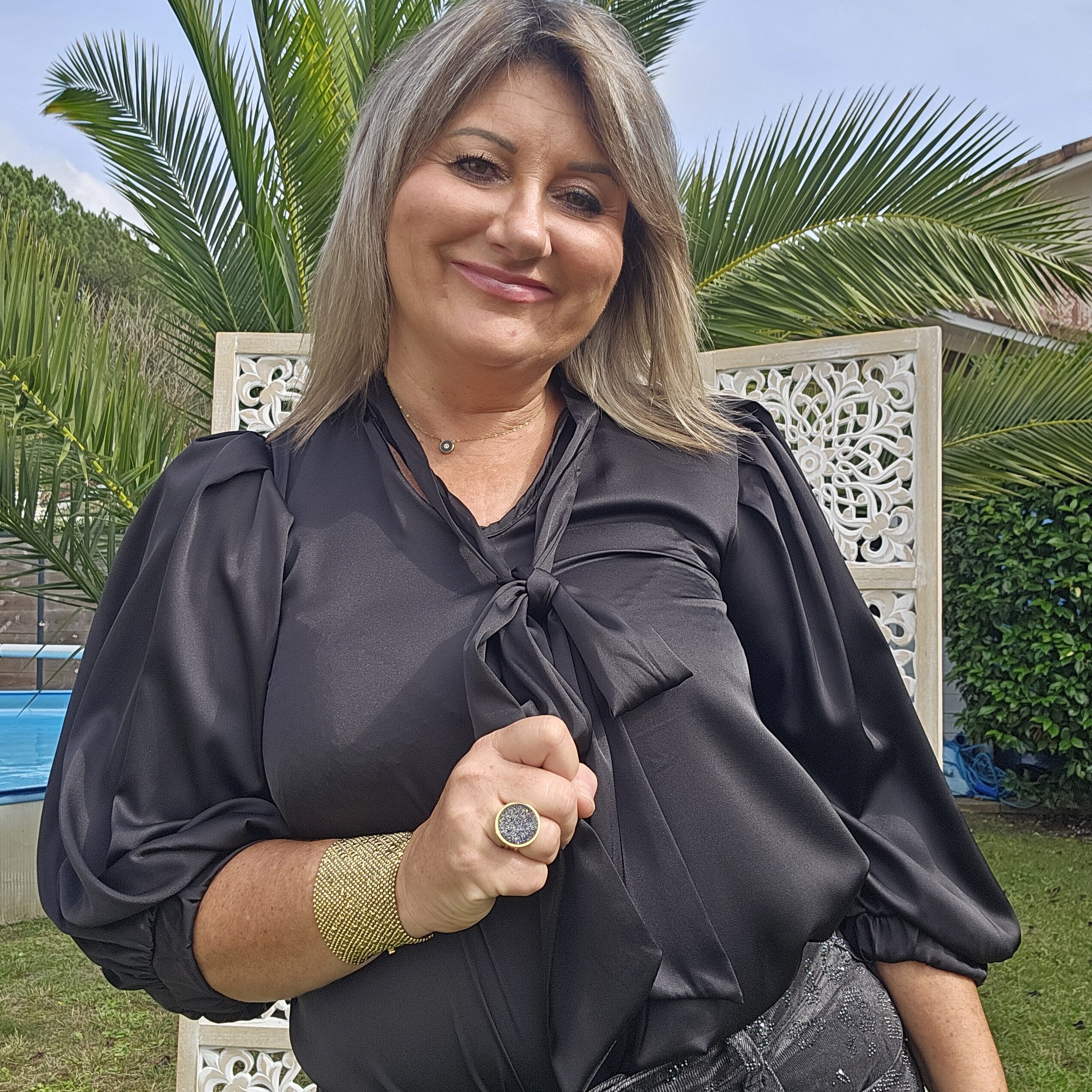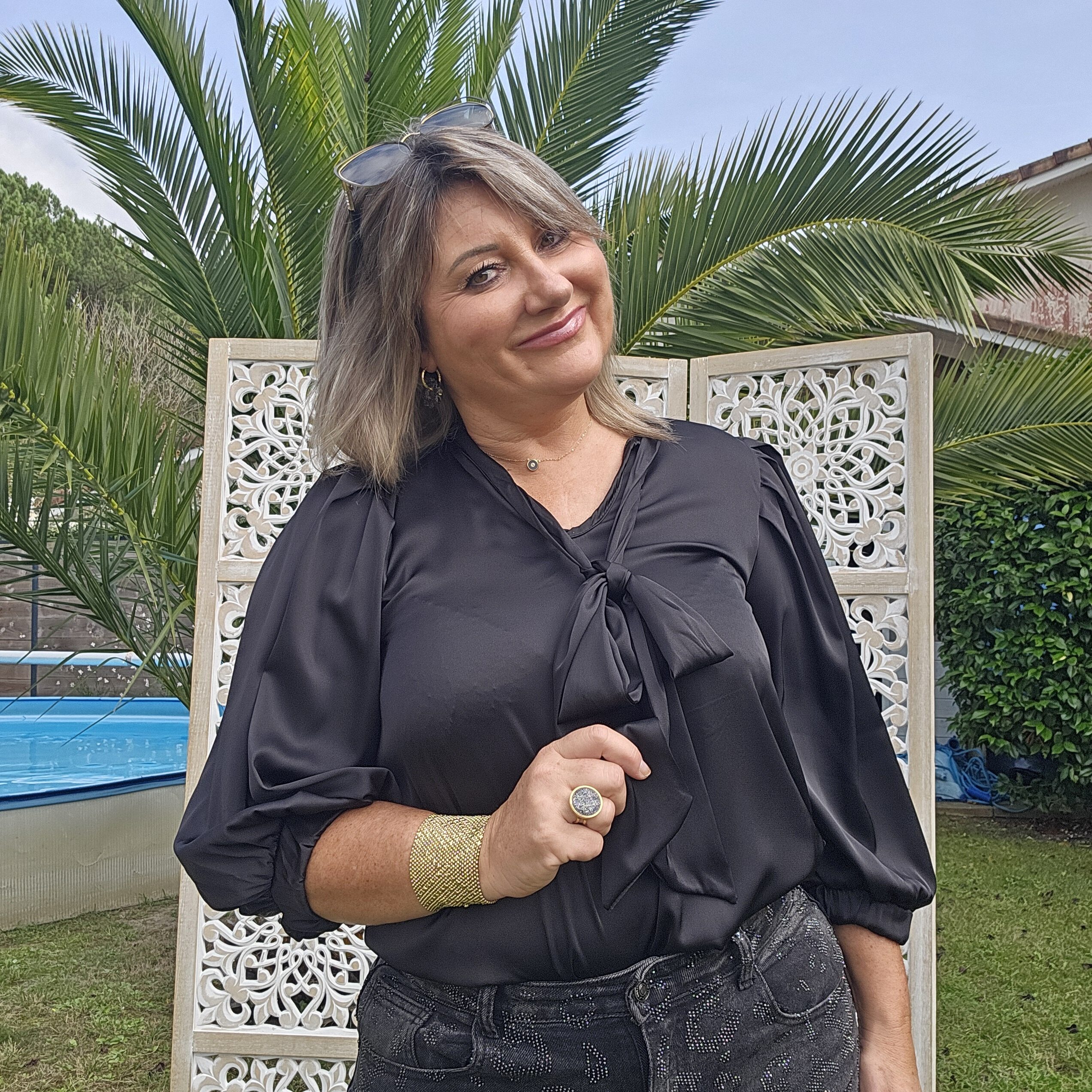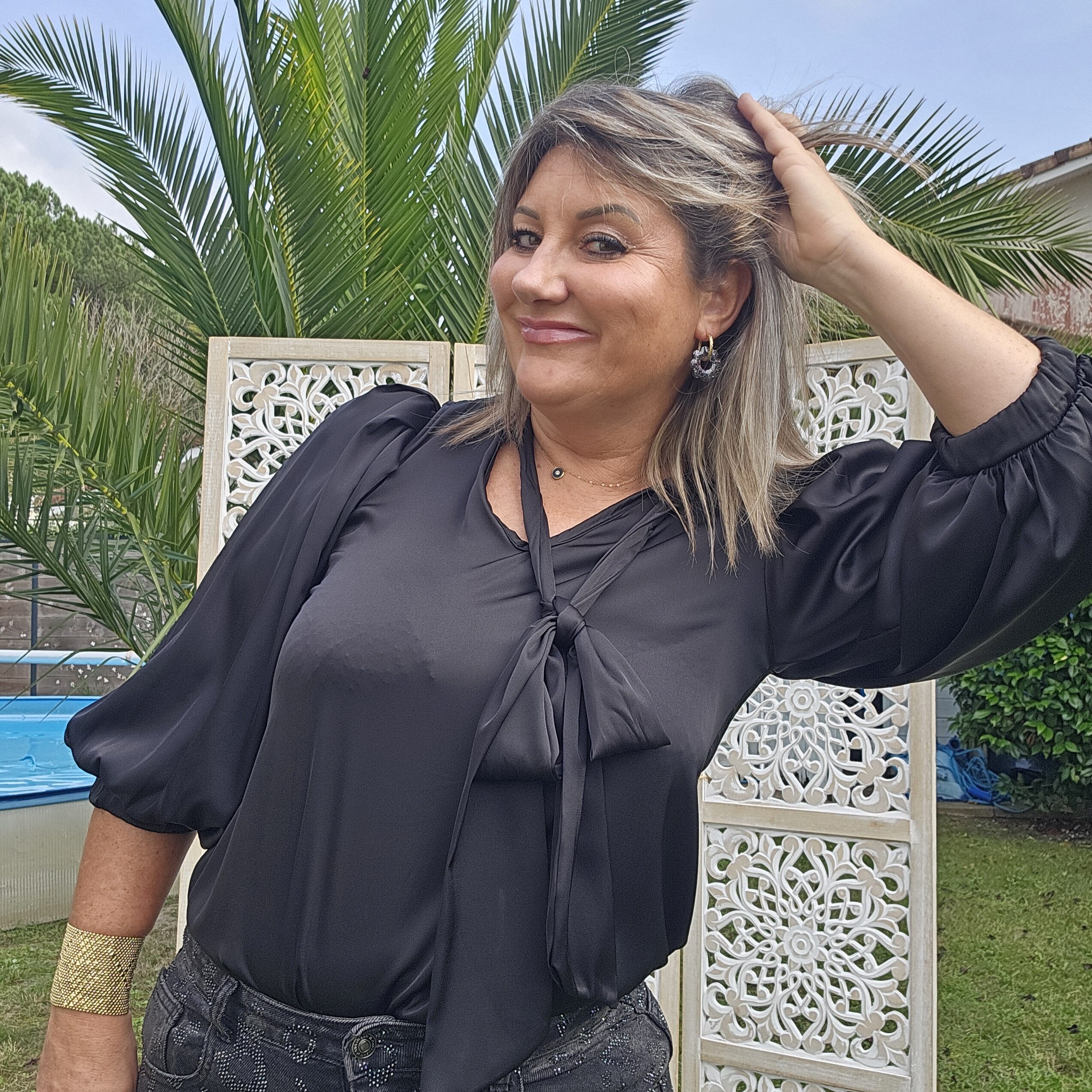 Mon regard pailleté : On aime l’originalité de cette blouse avec son nœud cravate, convient à différentes morphologies.