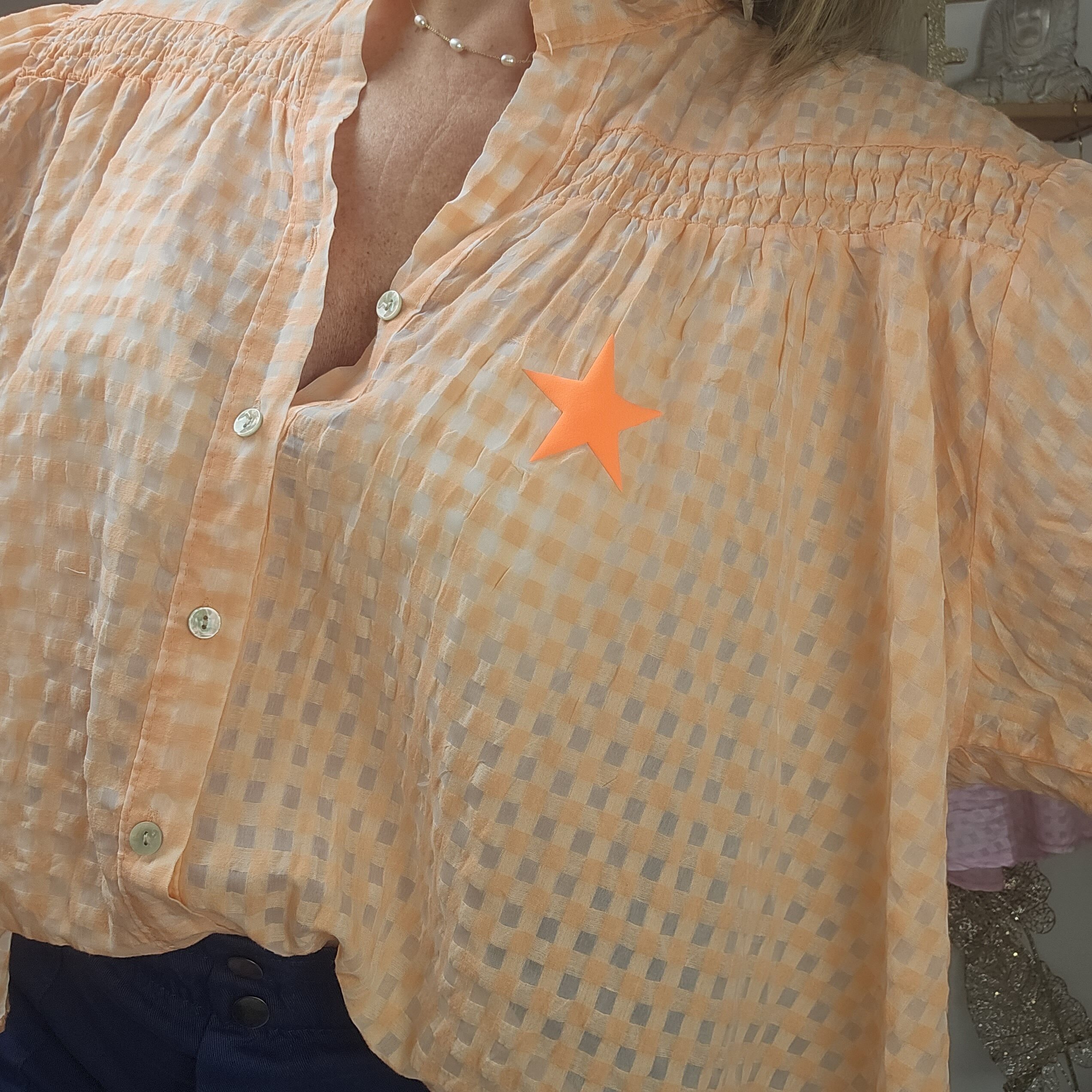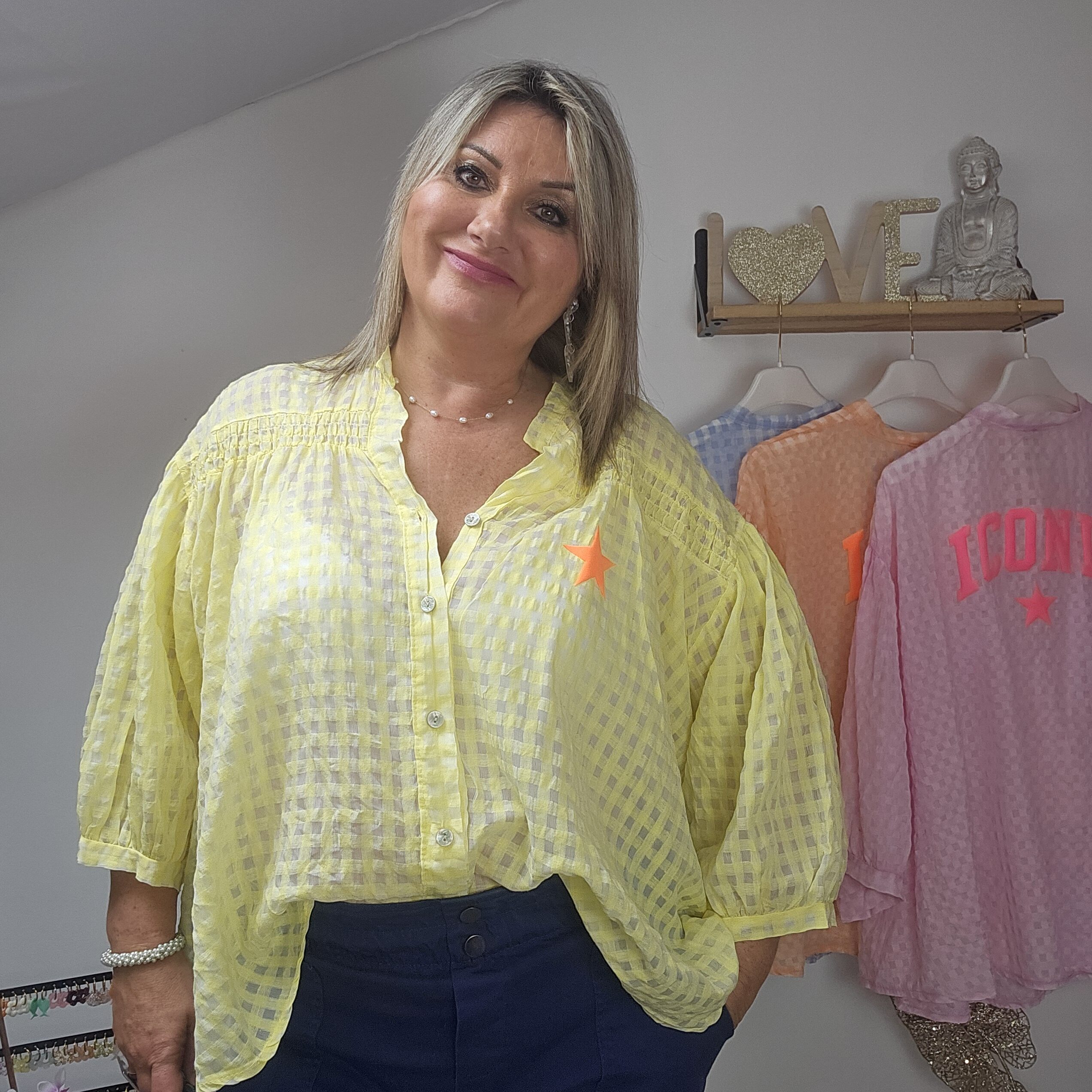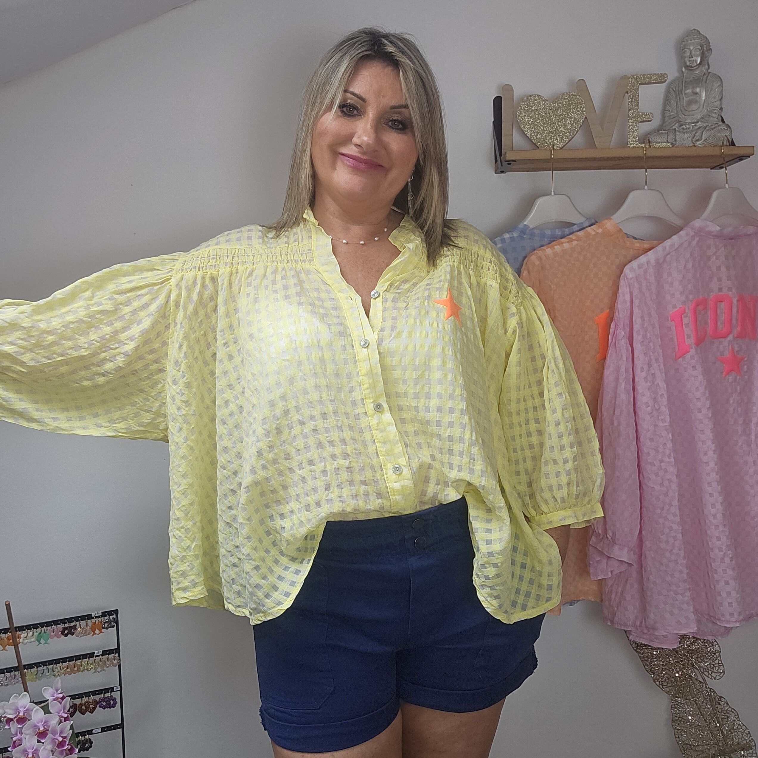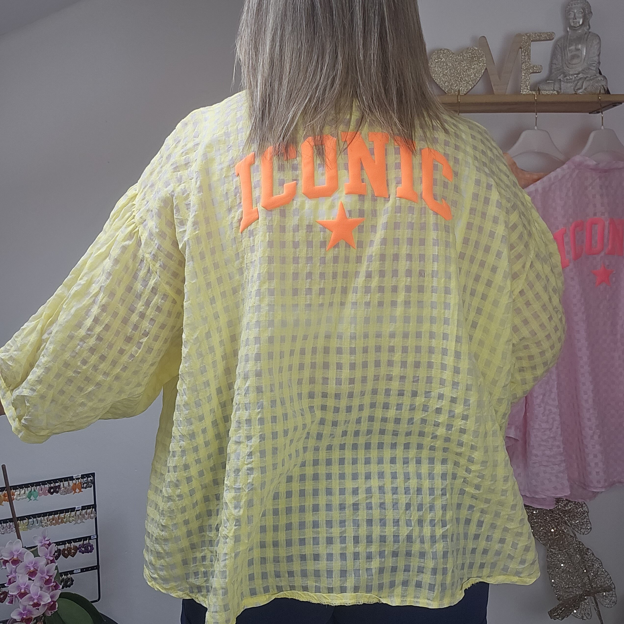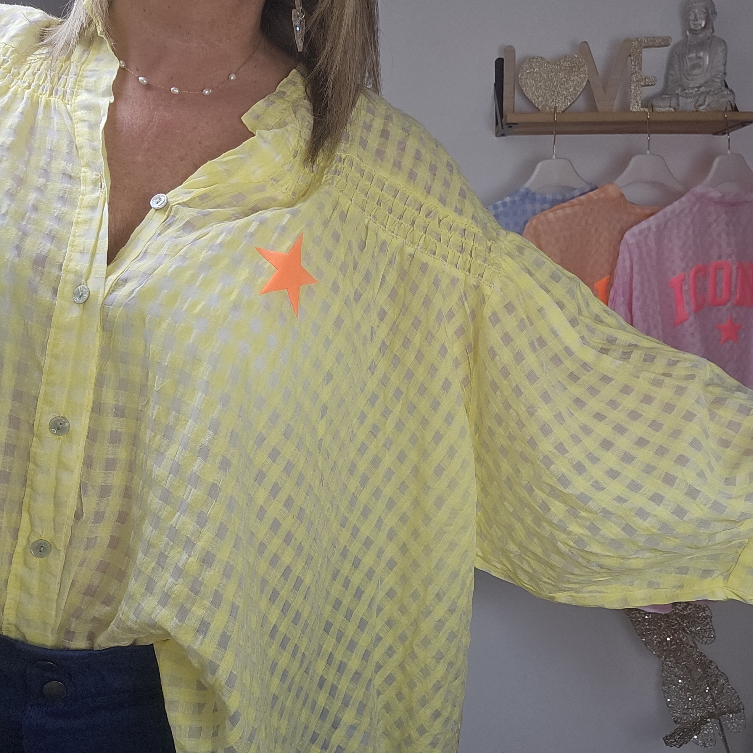 Chemise à carreaux par l’alternance du tissage des fils, manches bouffantes 3/4, col officier, boutonnée. Au dos écriture fluo ICONIC STARS et une étoile. Sur le devant une petite étoile. Cette chemise donne une touche originale et estivale. Coupe ample, évasée et fluide. Légère et très agréable à porter. Existe en jaune, orange, rose, bleu. TU
