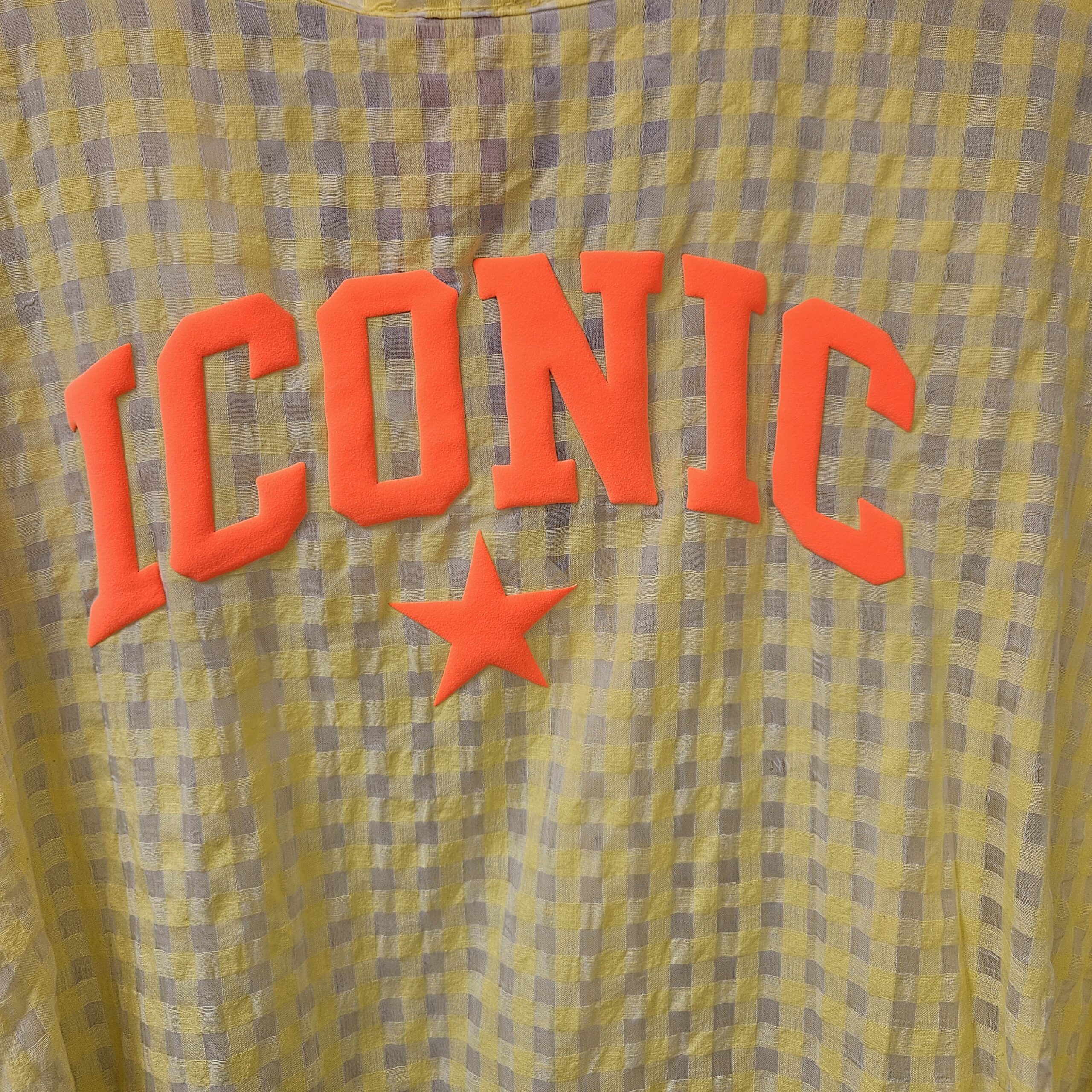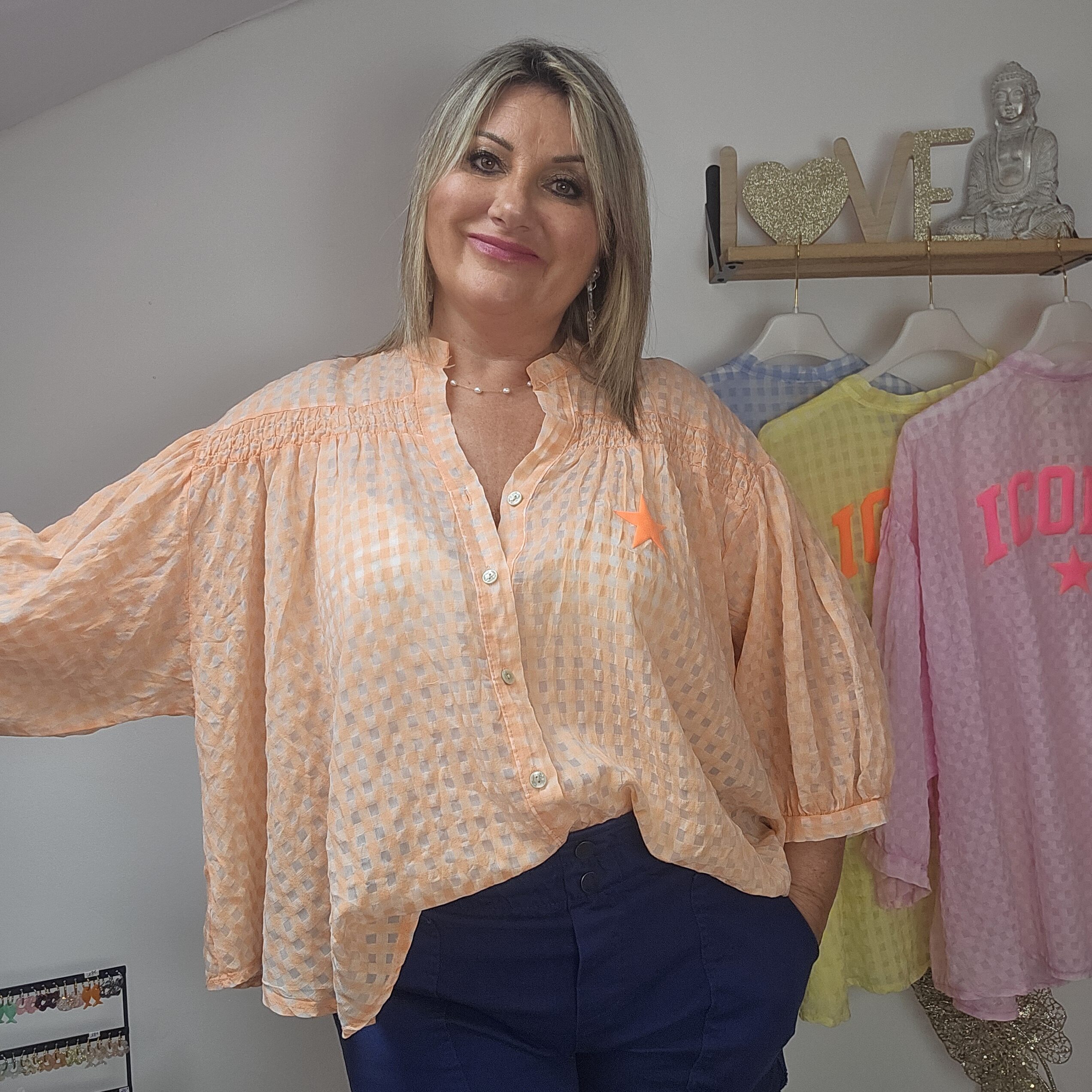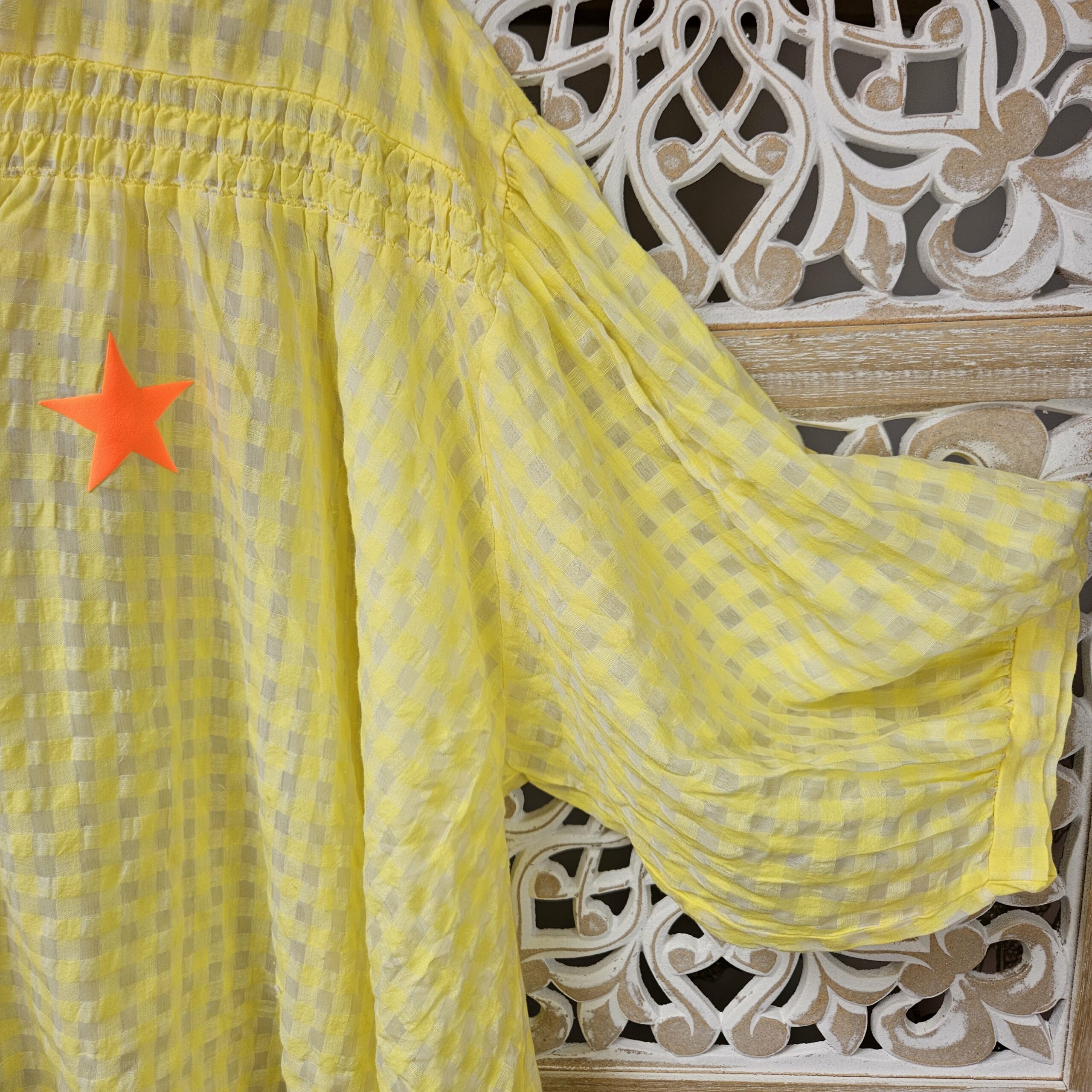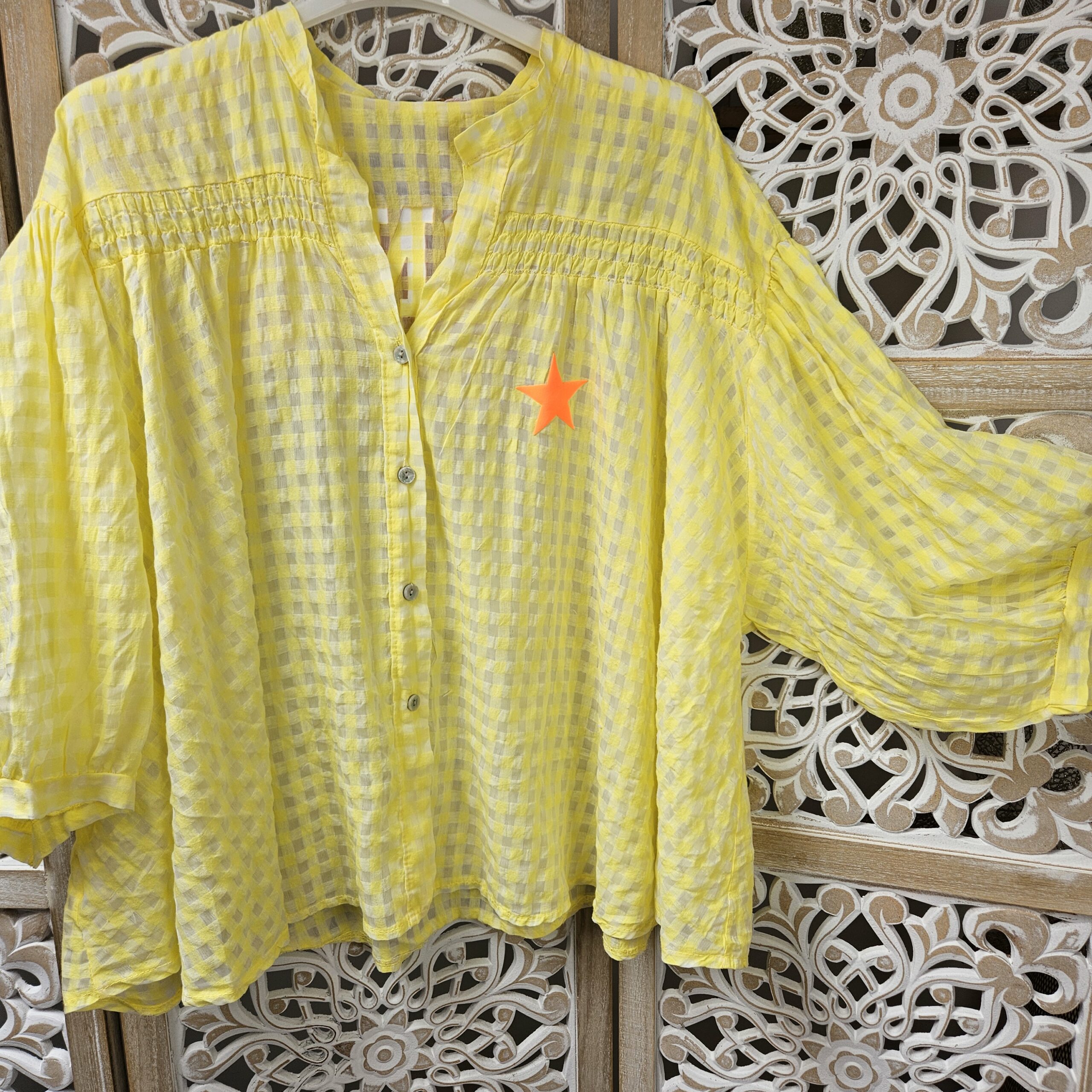 Chemise à carreaux par l’alternance du tissage des fils, manches bouffantes 3/4, col officier, boutonnée. Au dos écriture fluo ICONIC STARS et une étoile. Sur le devant une petite étoile. Cette chemise donne une touche originale et estivale. Coupe ample, évasée et fluide. Légère et très agréable à porter. Existe en jaune, orange, rose, bleu. TU