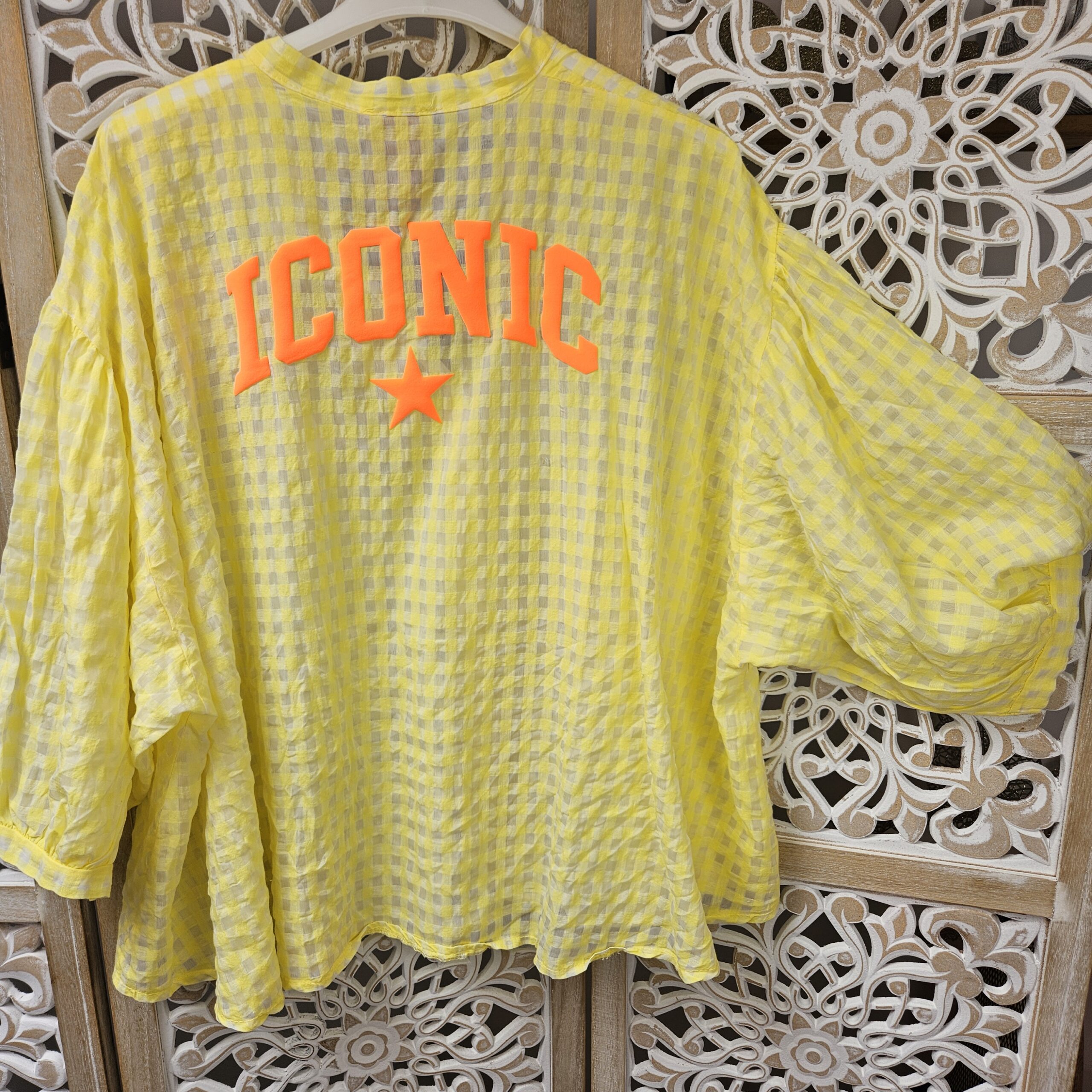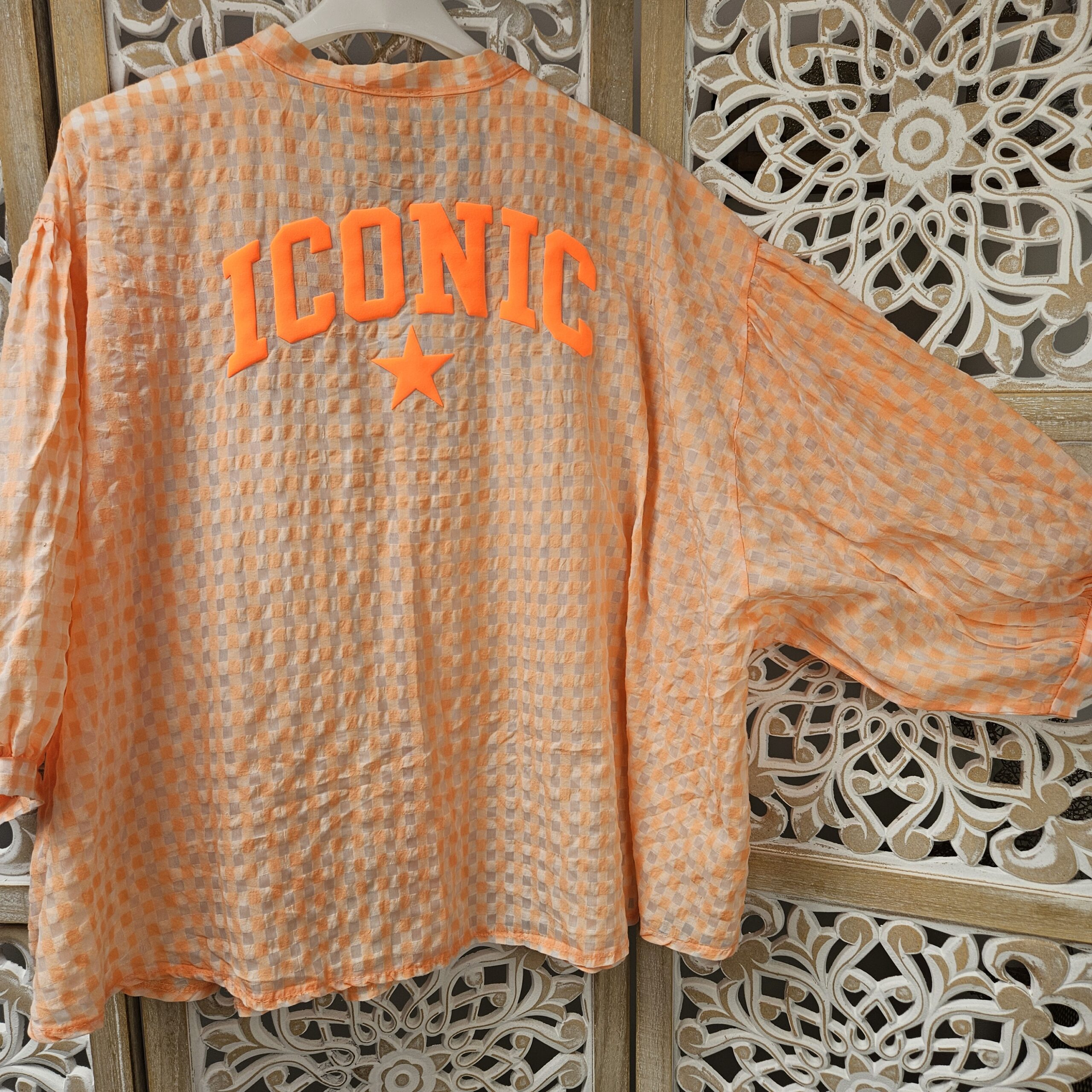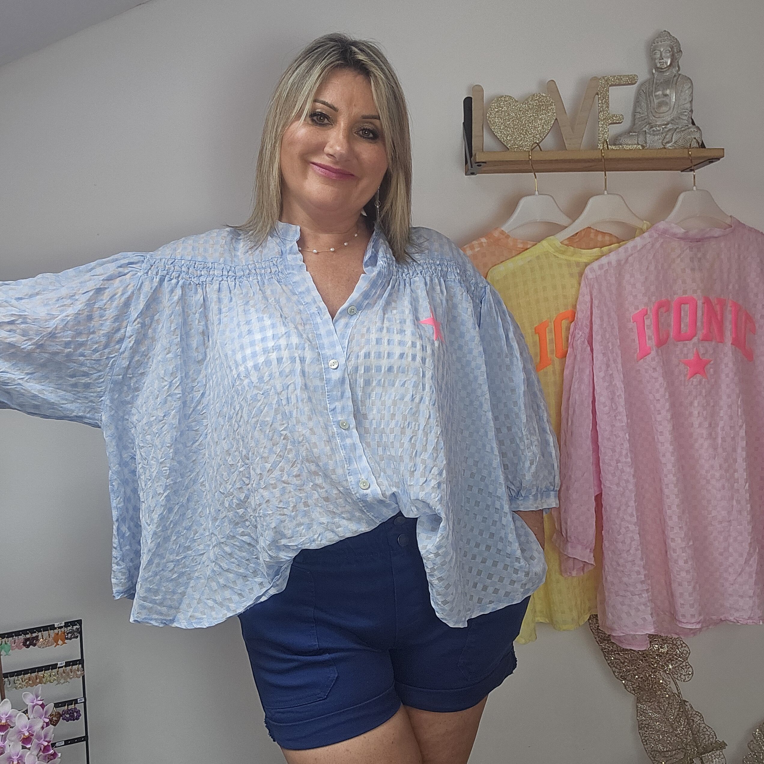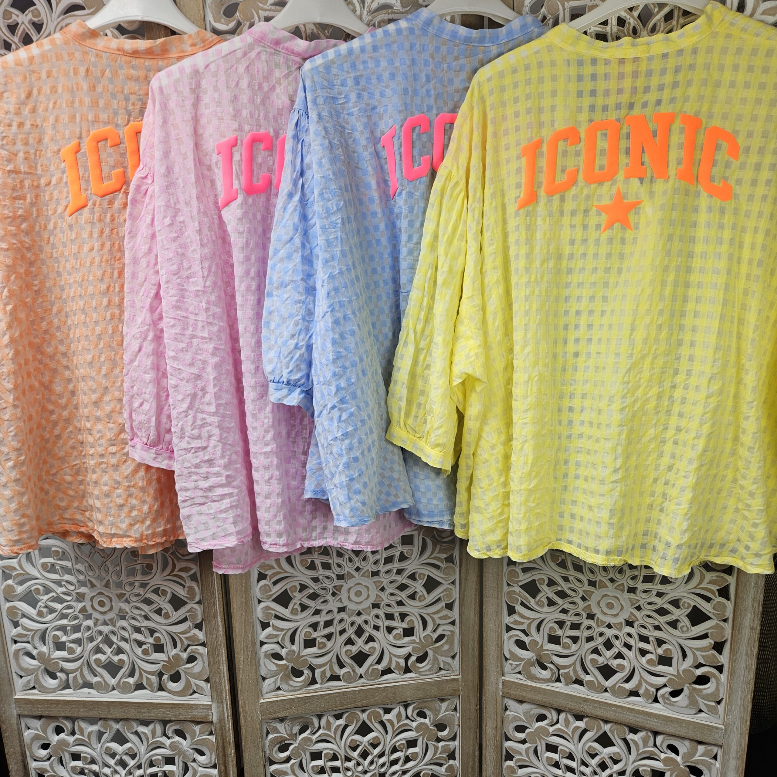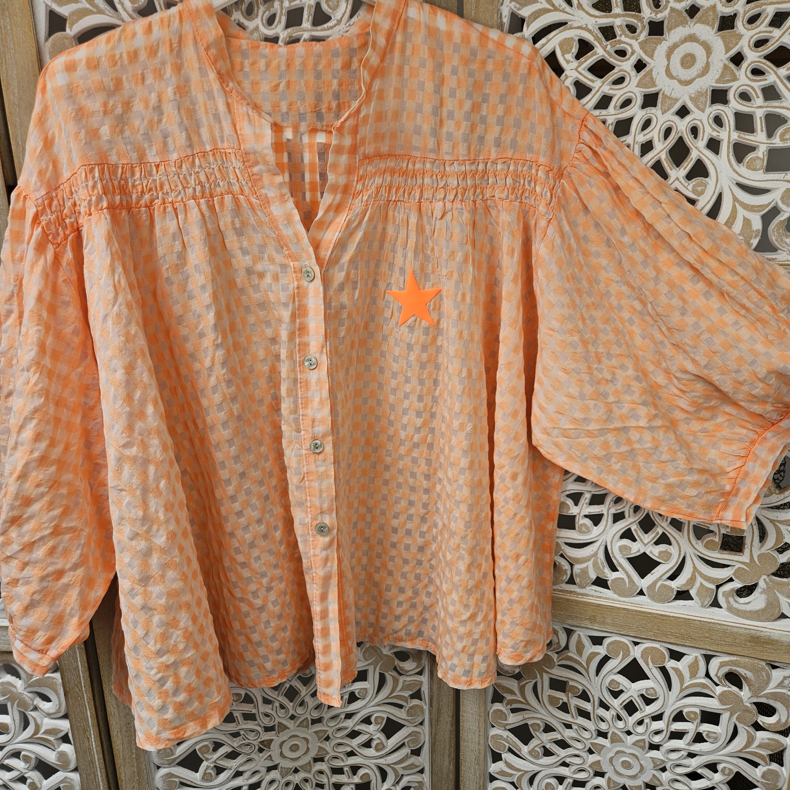 Chemise à carreaux par l’alternance du tissage des fils, manches bouffantes 3/4, col officier, boutonnée. Au dos écriture fluo ICONIC STARS et une étoile. Sur le devant une petite étoile. Cette chemise donne une touche originale et estivale. Coupe ample, évasée et fluide. Légère et très agréable à porter. Existe en jaune, orange, rose, bleu. TU
