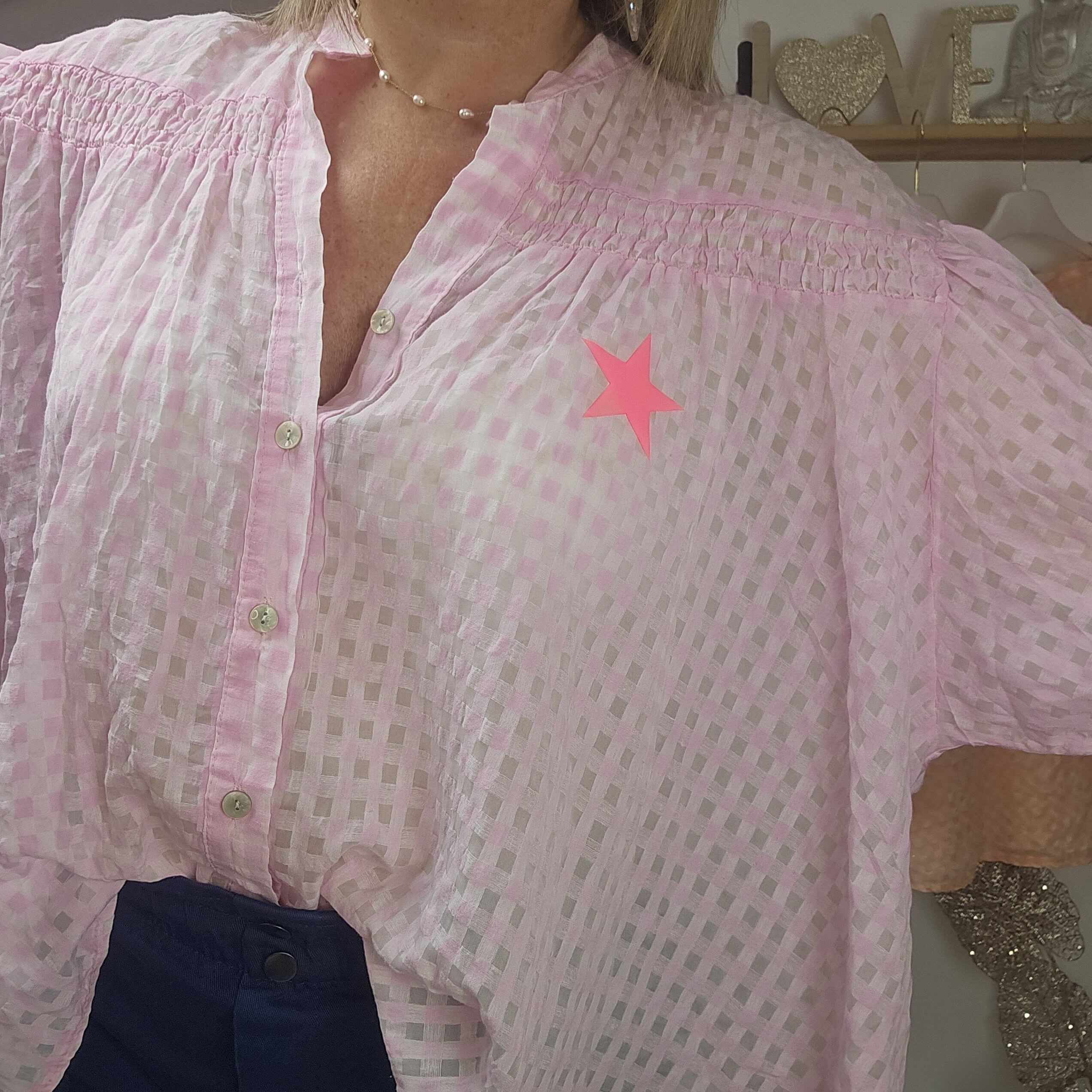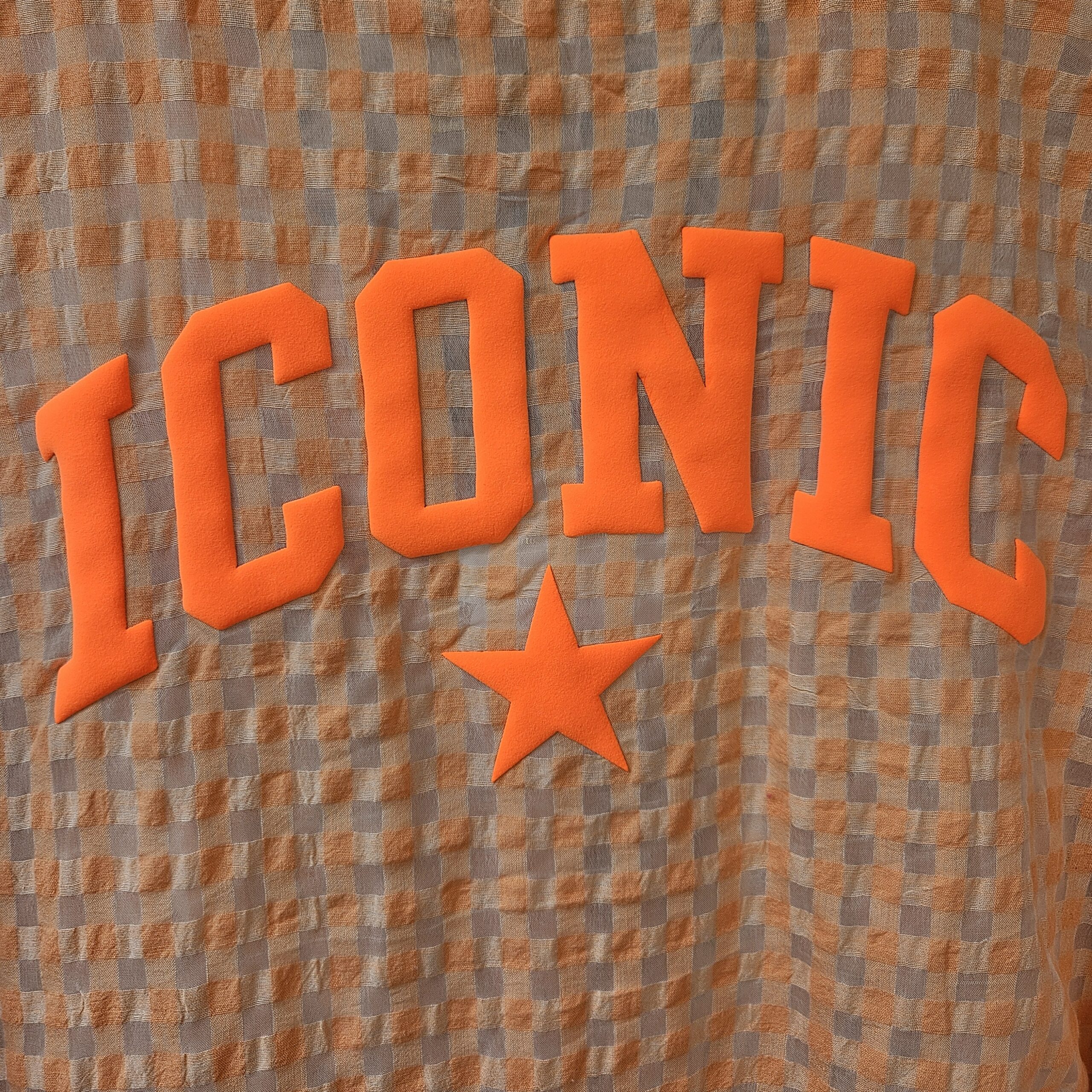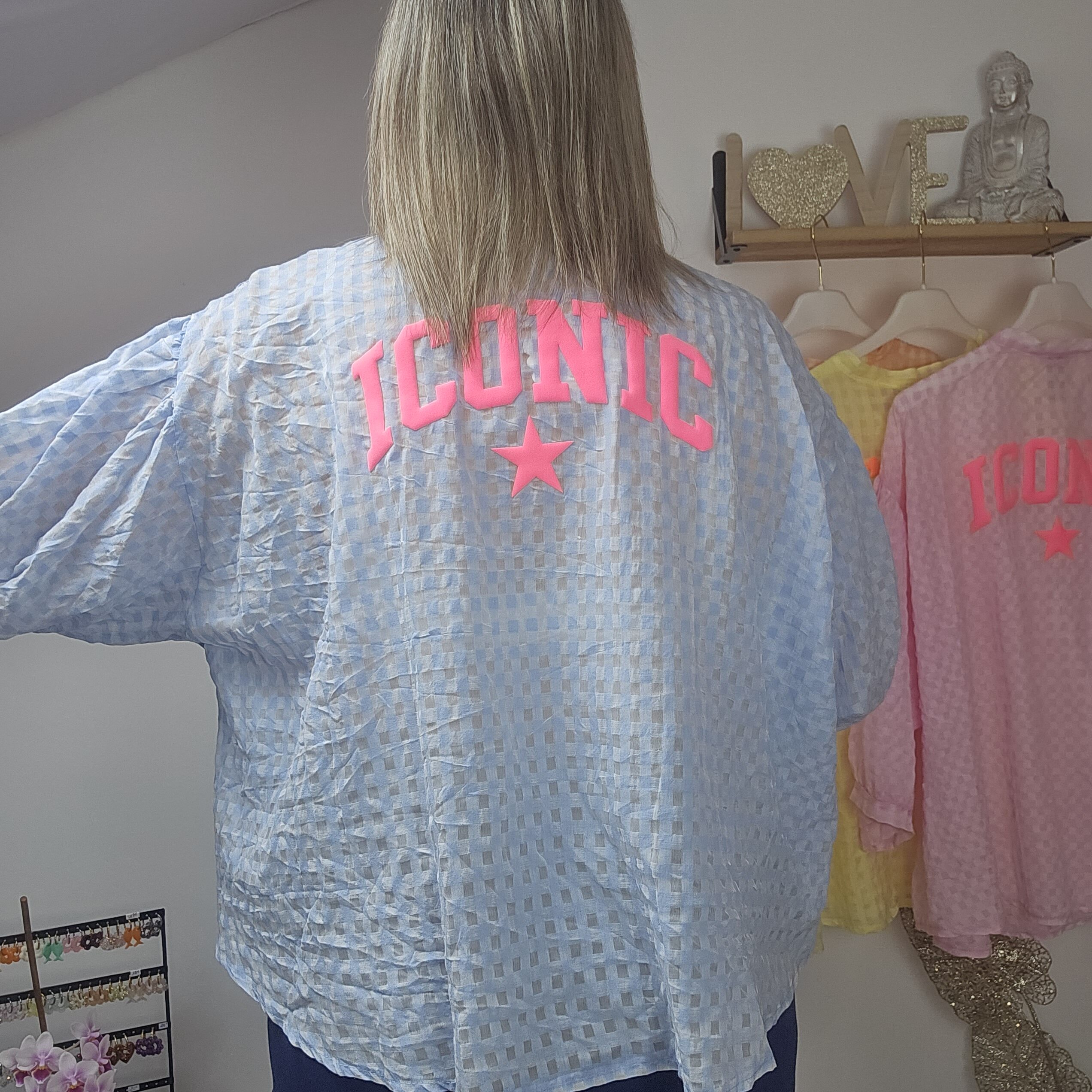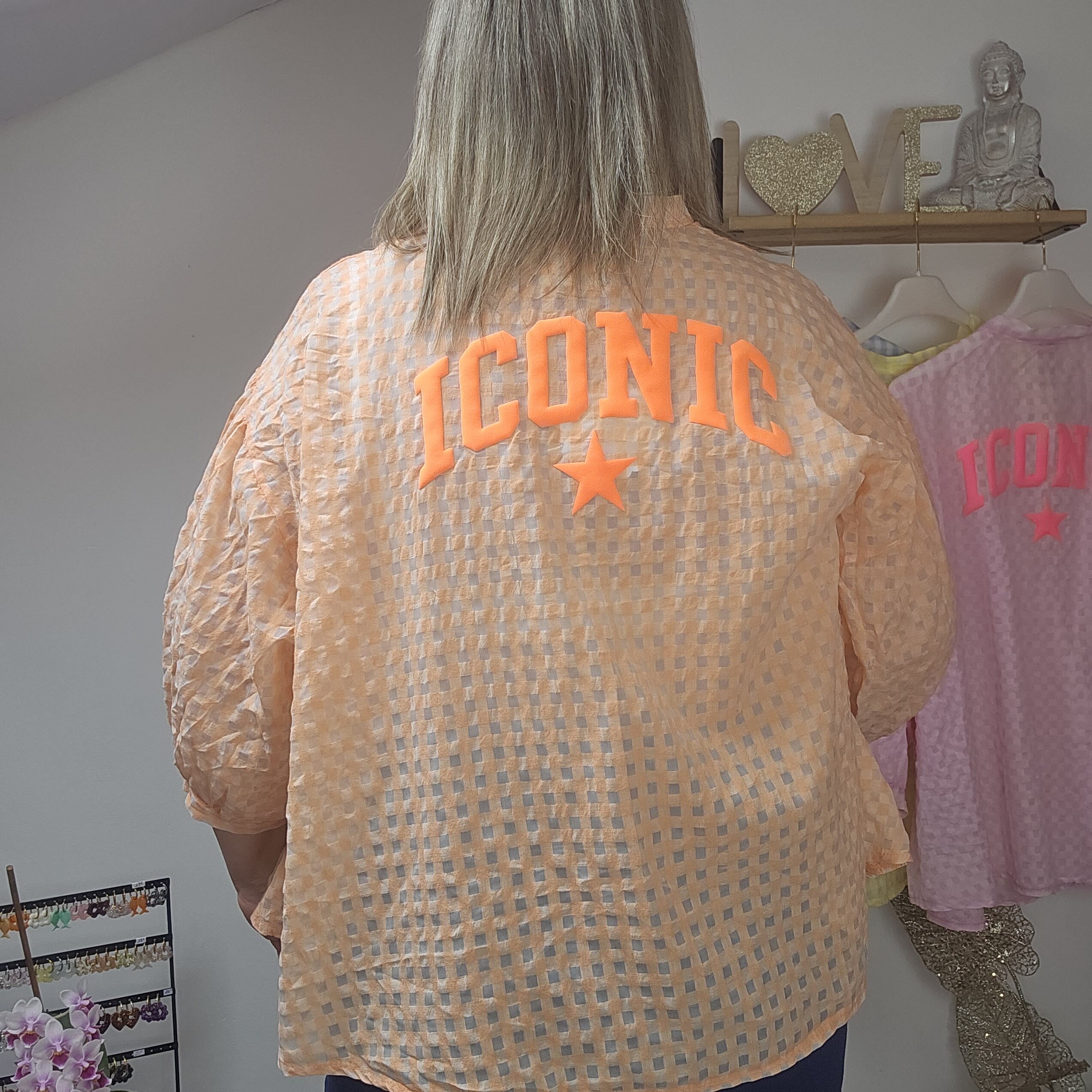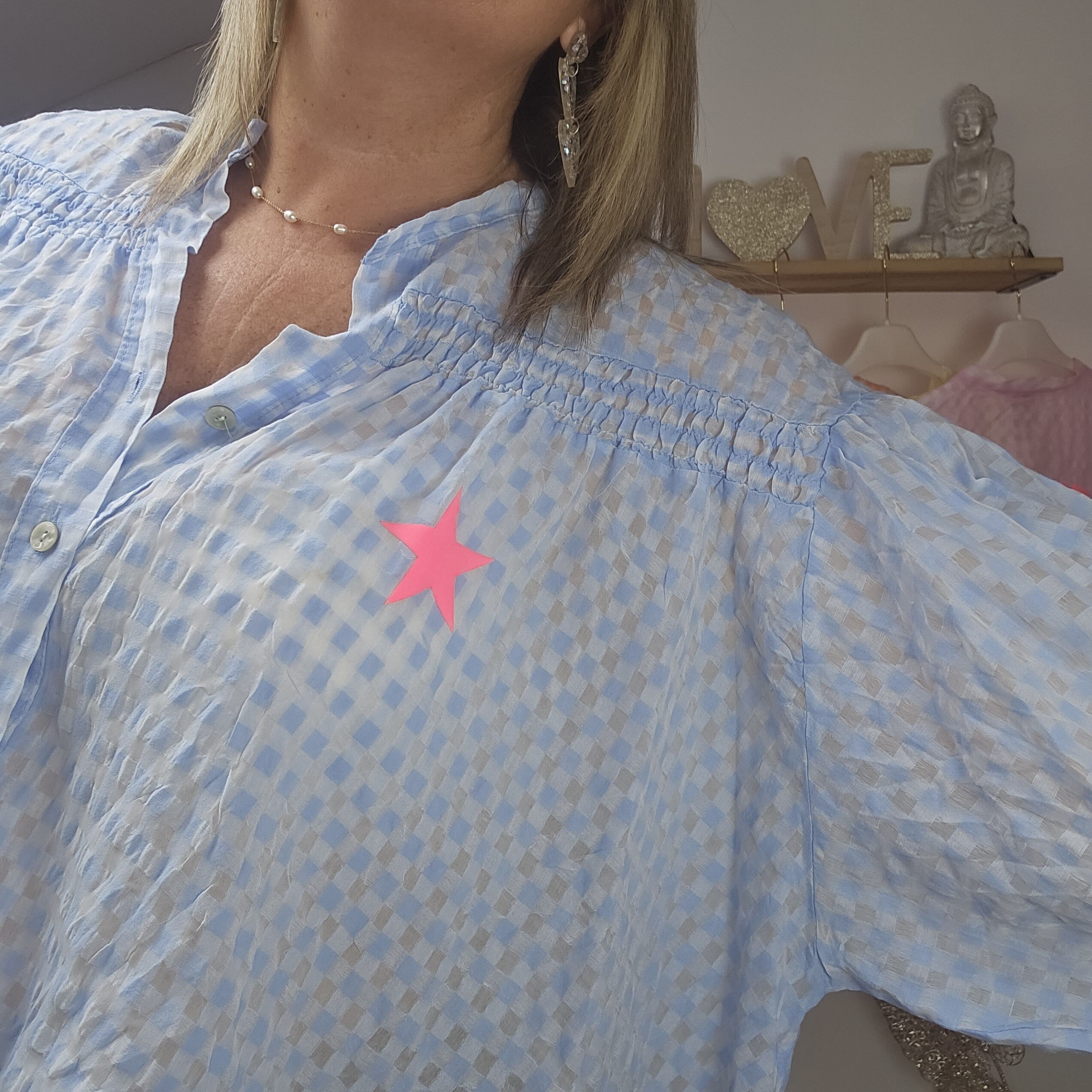 Chemise à carreaux par l’alternance du tissage des fils, manches bouffantes 3/4, col officier, boutonnée. Au dos écriture fluo ICONIC STARS et une étoile. Sur le devant une petite étoile. Cette chemise donne une touche originale et estivale. Coupe ample, évasée et fluide. Légère et très agréable à porter. Existe en jaune, orange, rose, bleu. TU