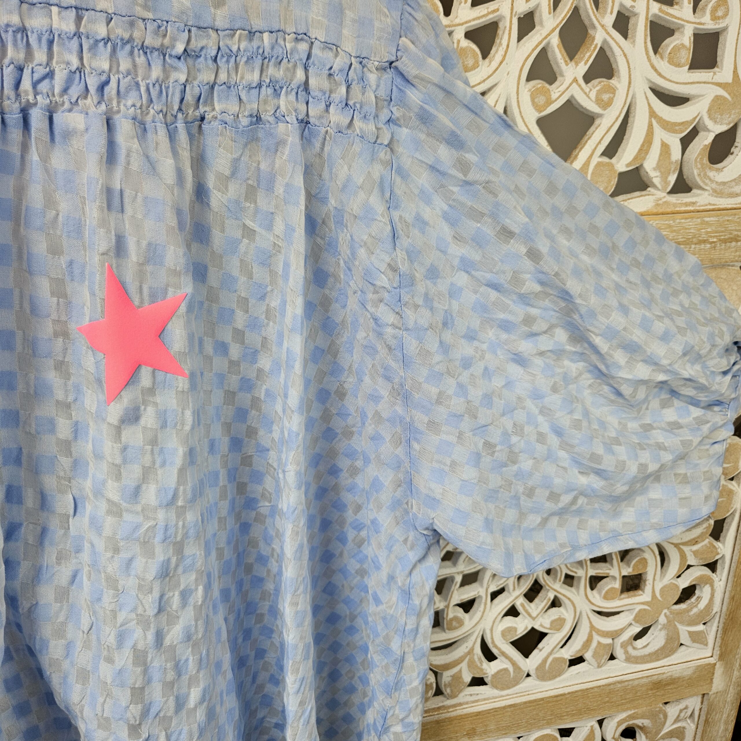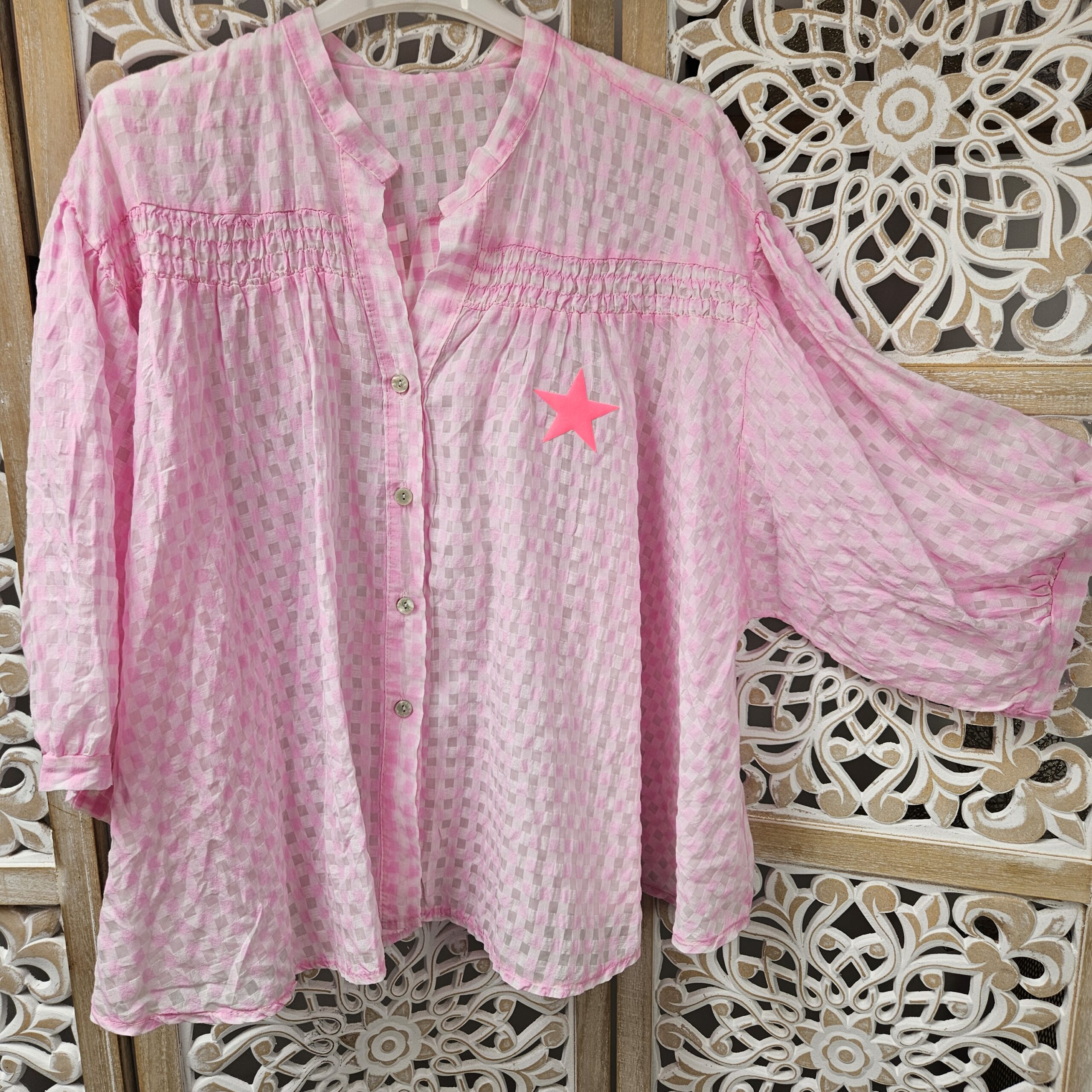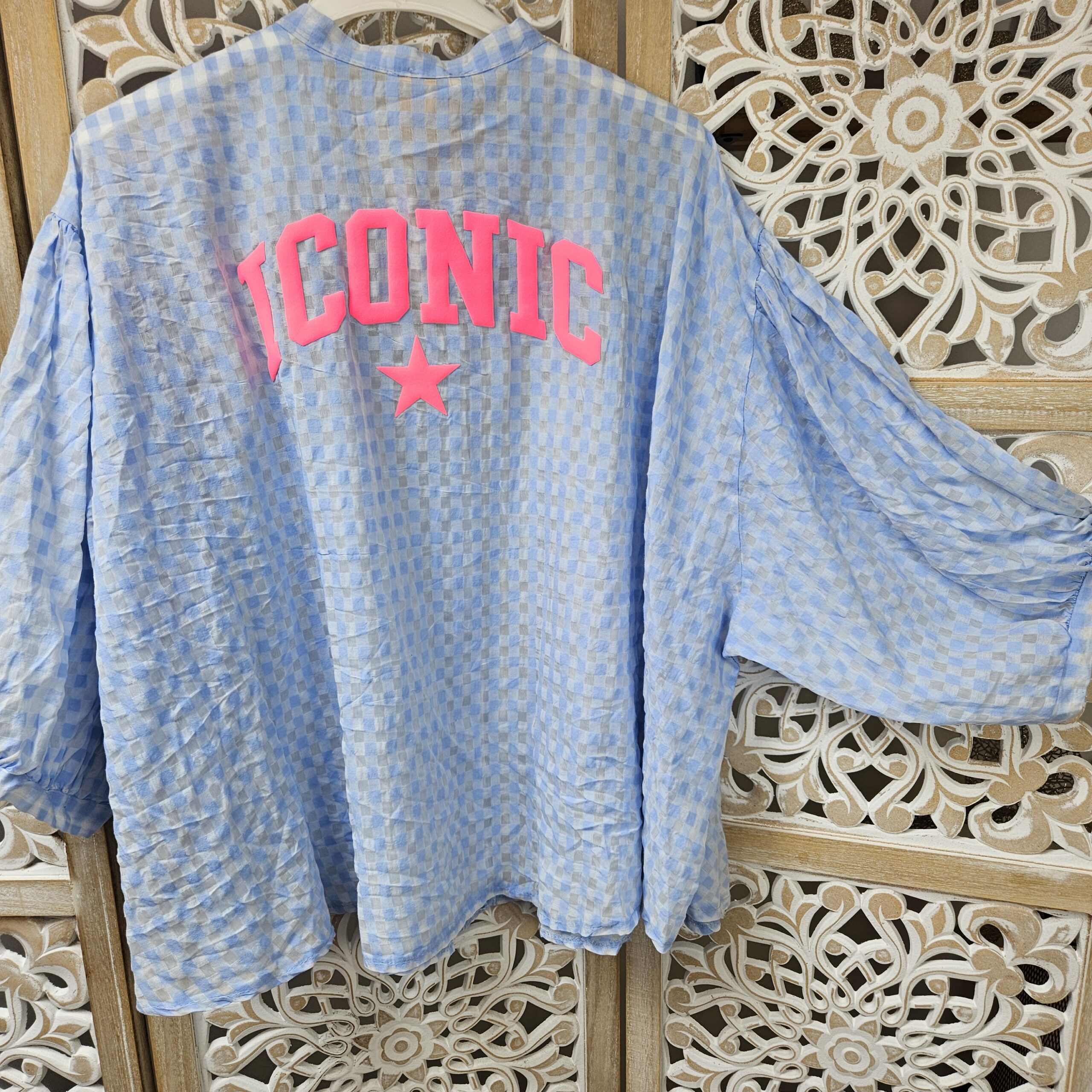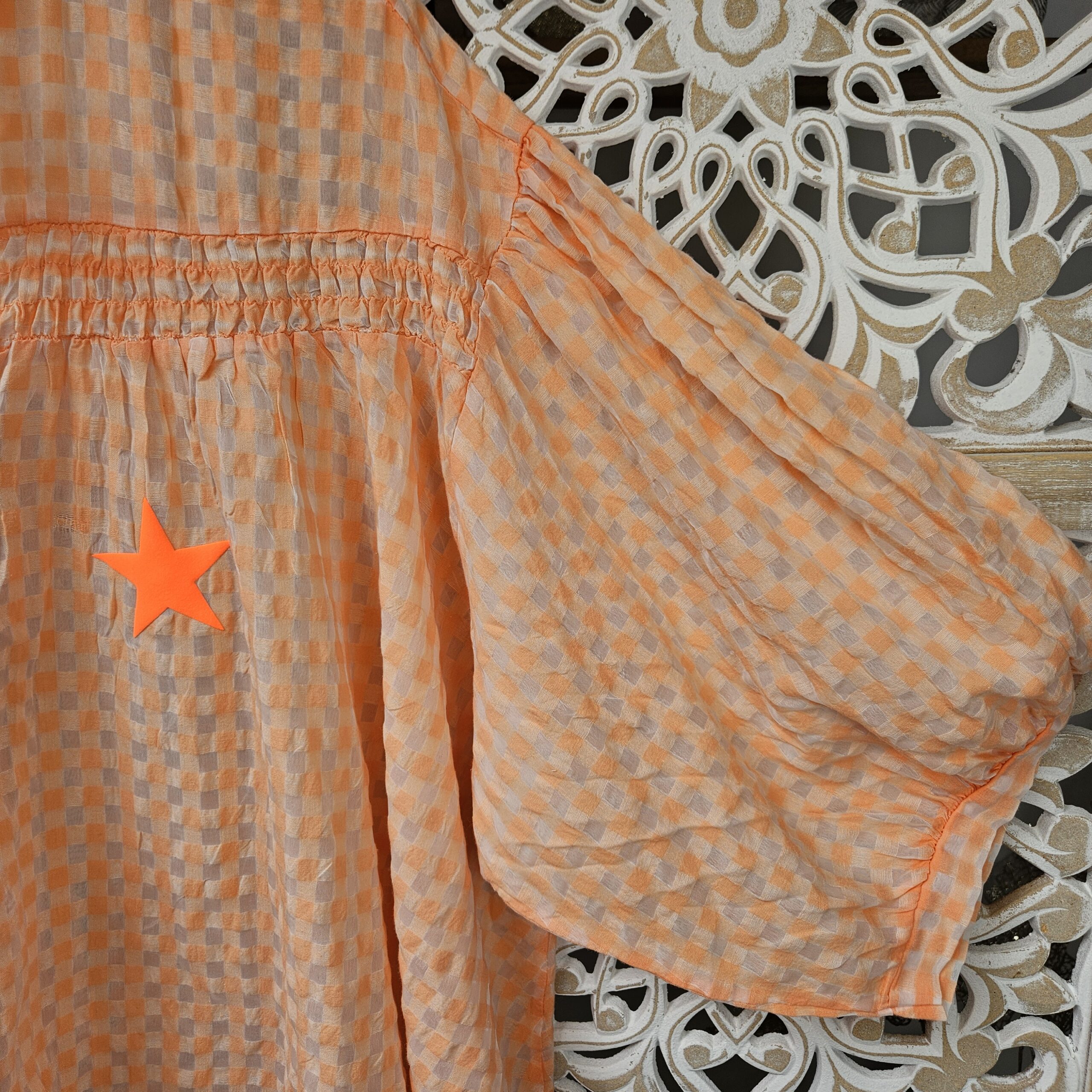 Chemise à carreaux par l’alternance du tissage des fils, manches bouffantes 3/4, col officier, boutonnée. Au dos écriture fluo ICONIC STARS et une étoile. Sur le devant une petite étoile. Cette chemise donne une touche originale et estivale. Coupe ample, évasée et fluide. Légère et très agréable à porter. Existe en jaune, orange, rose, bleu. TU