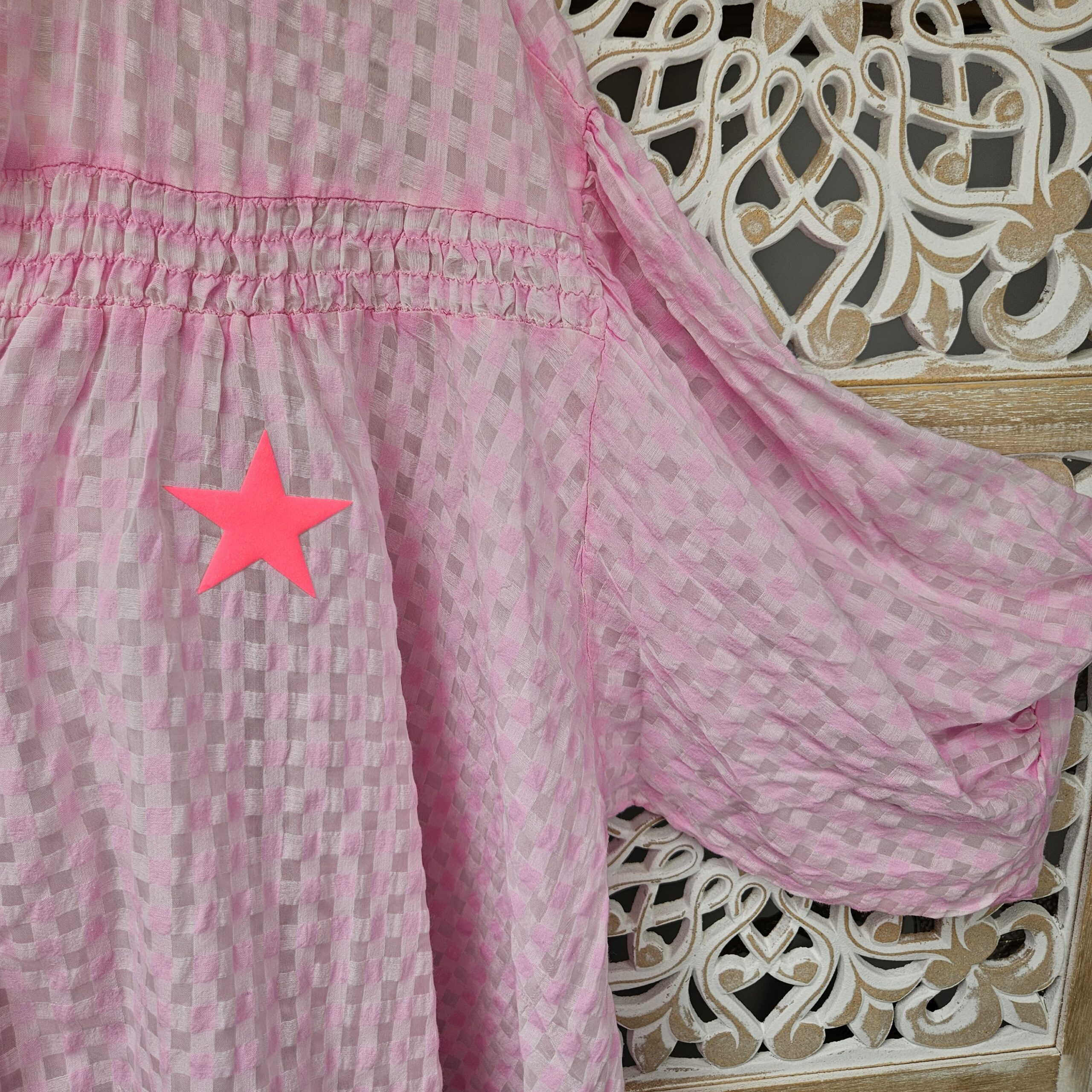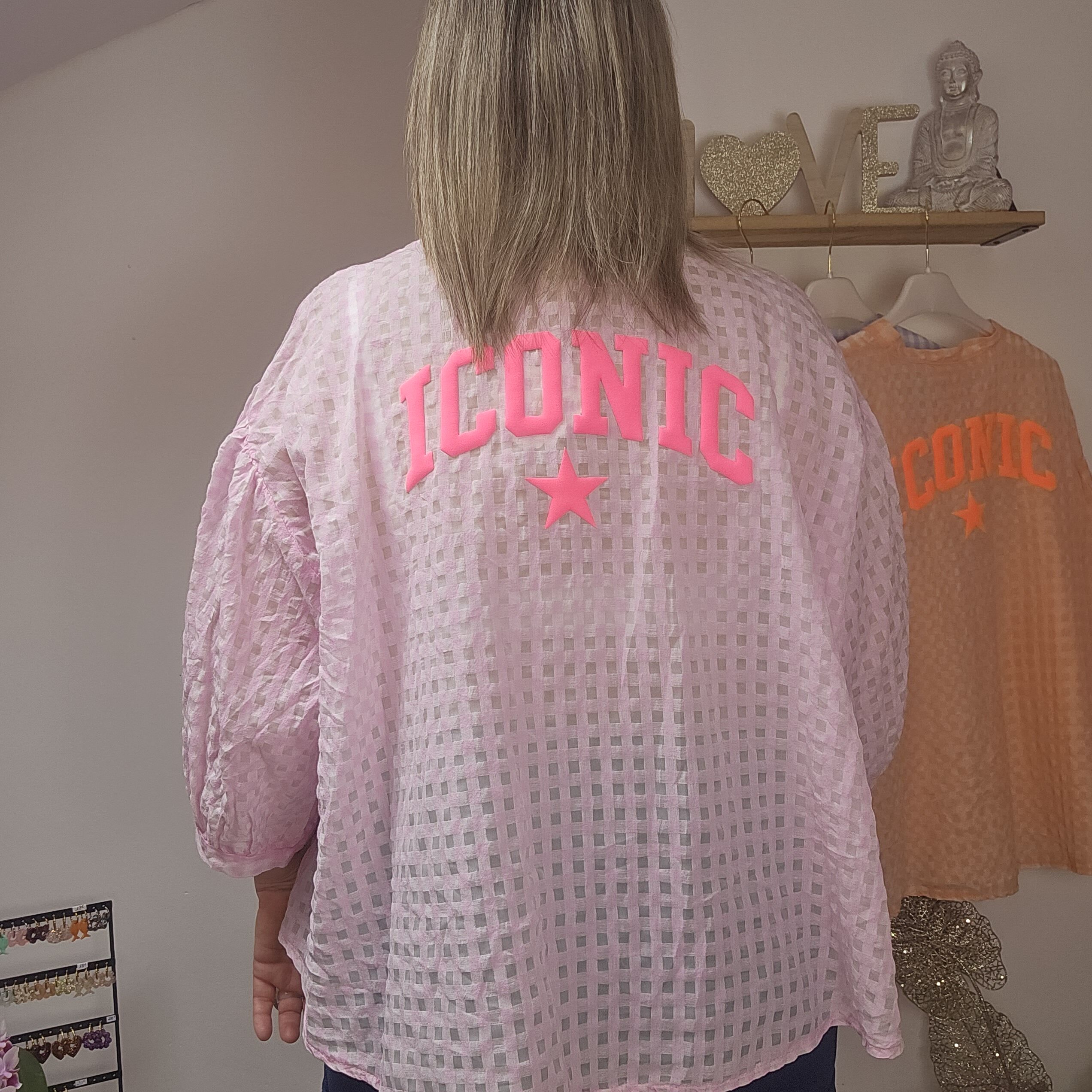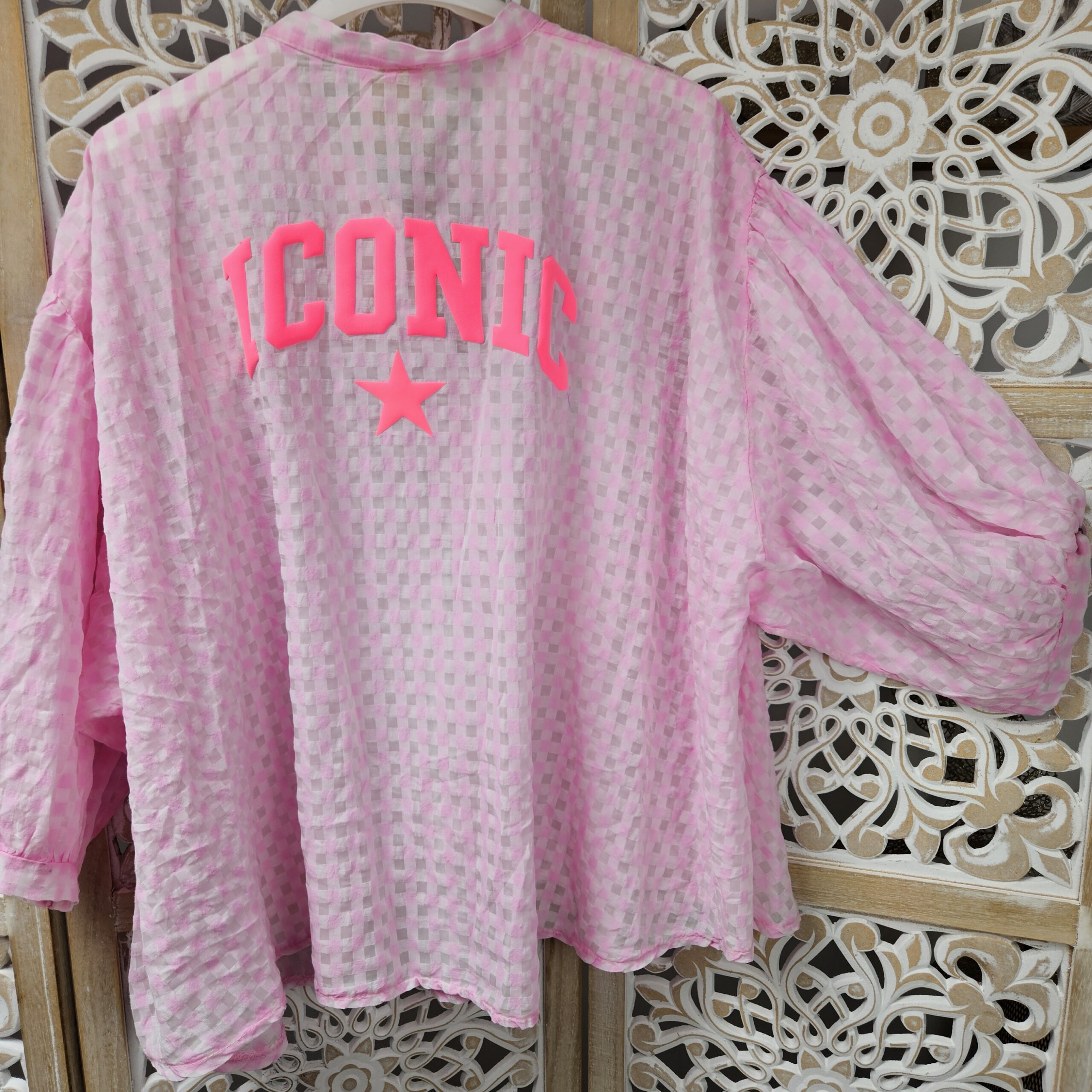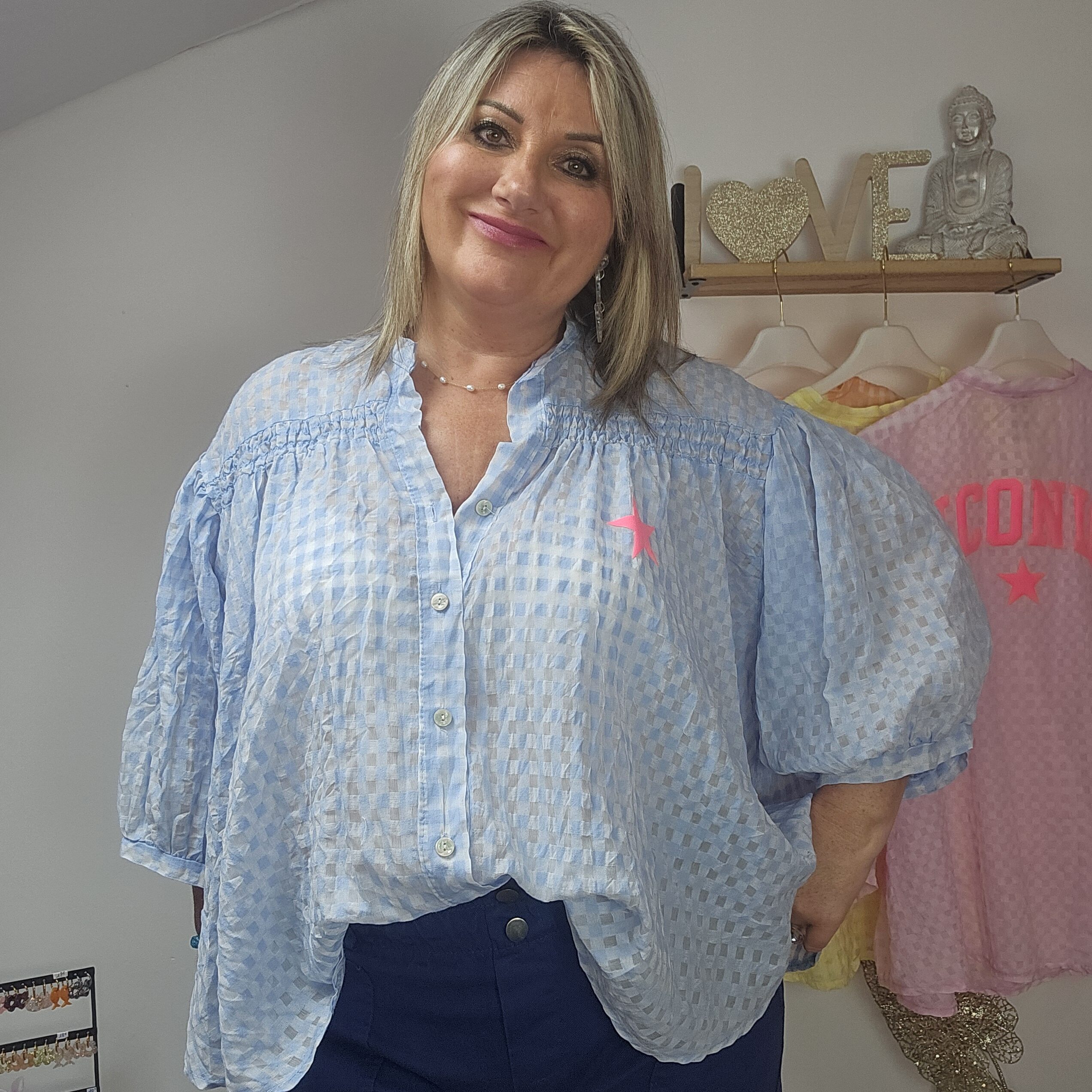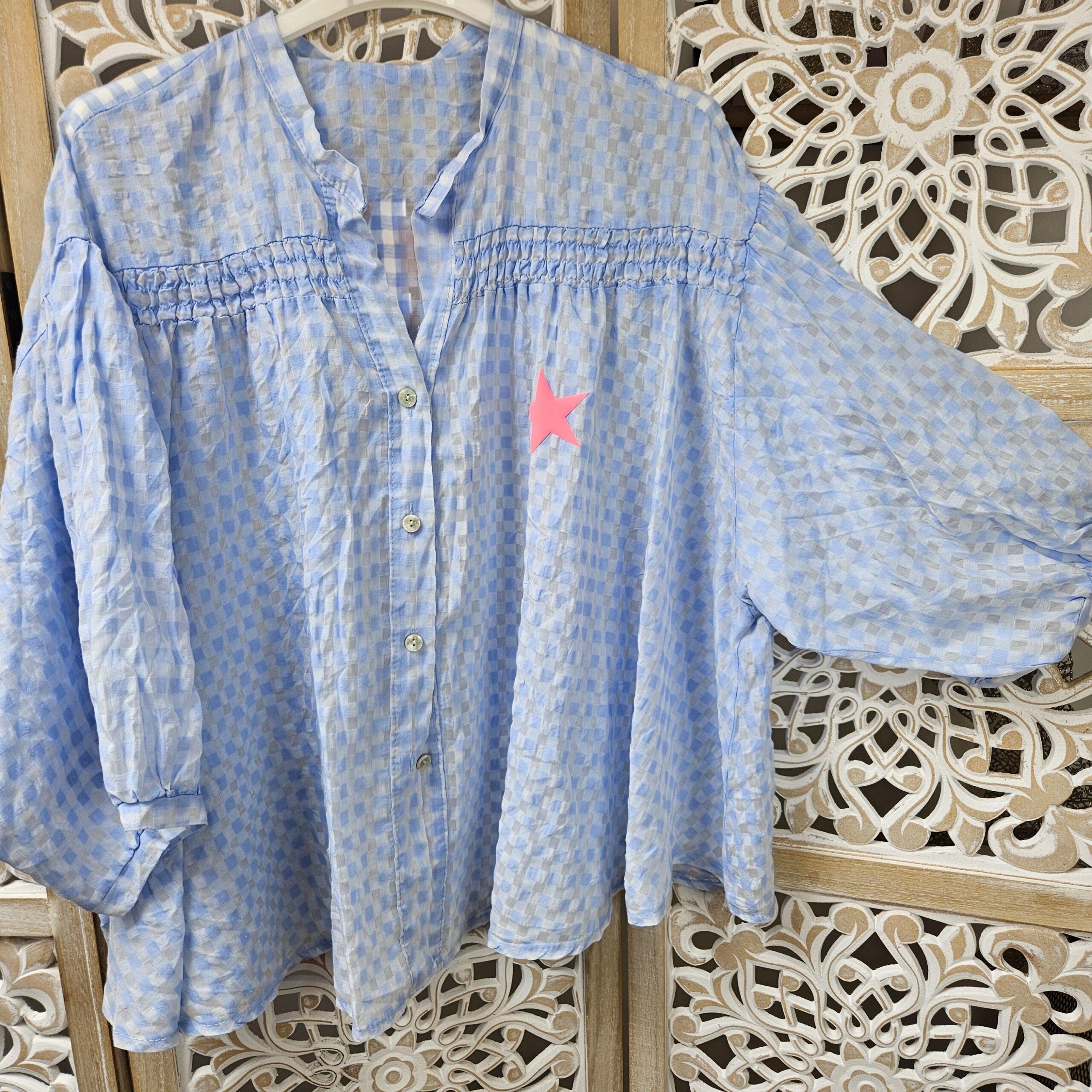 Chemise à carreaux par l’alternance du tissage des fils, manches bouffantes 3/4, col officier, boutonnée. Au dos écriture fluo ICONIC STARS et une étoile. Sur le devant une petite étoile. Cette chemise donne une touche originale et estivale. Coupe ample, évasée et fluide. Légère et très agréable à porter. Existe en jaune, orange, rose, bleu. TU