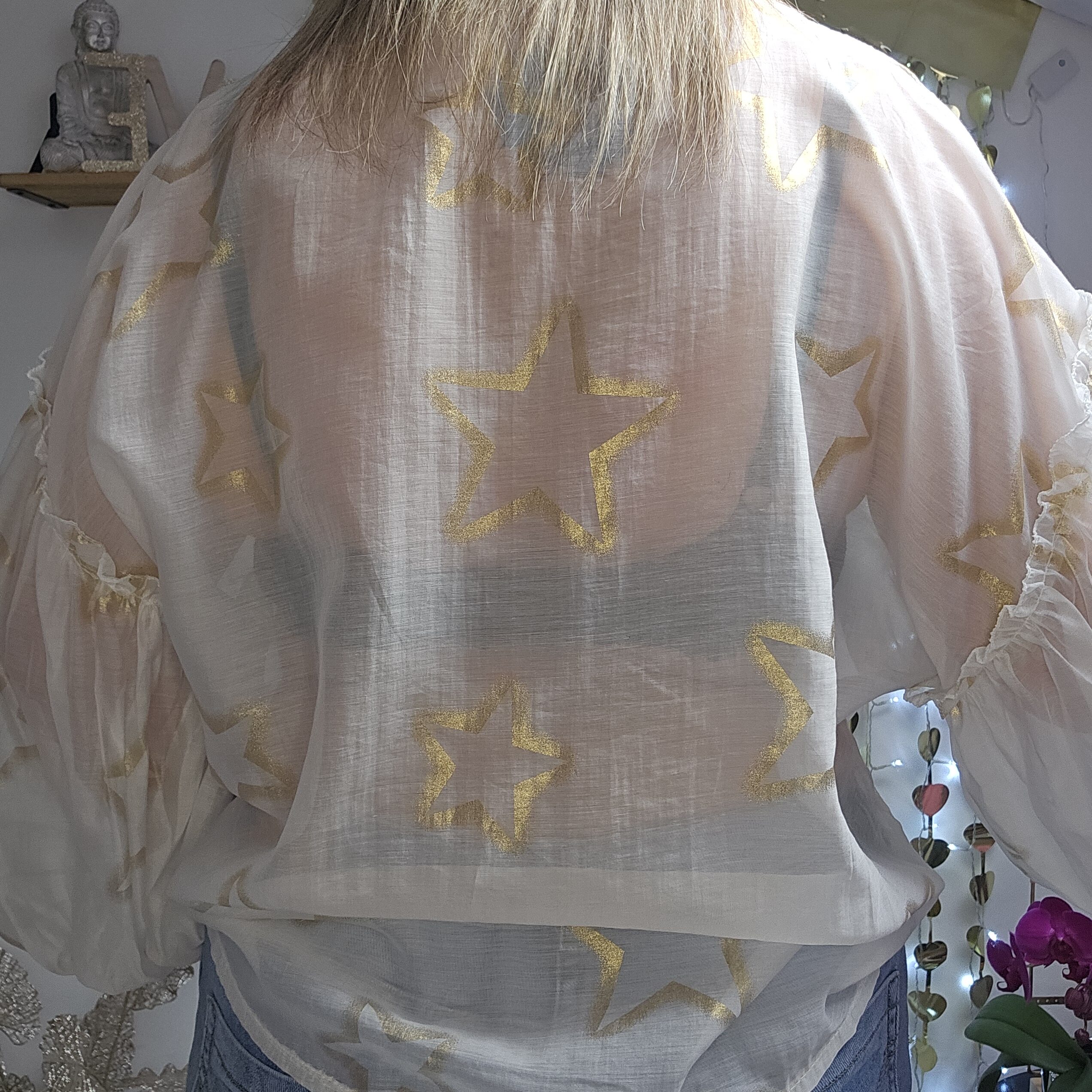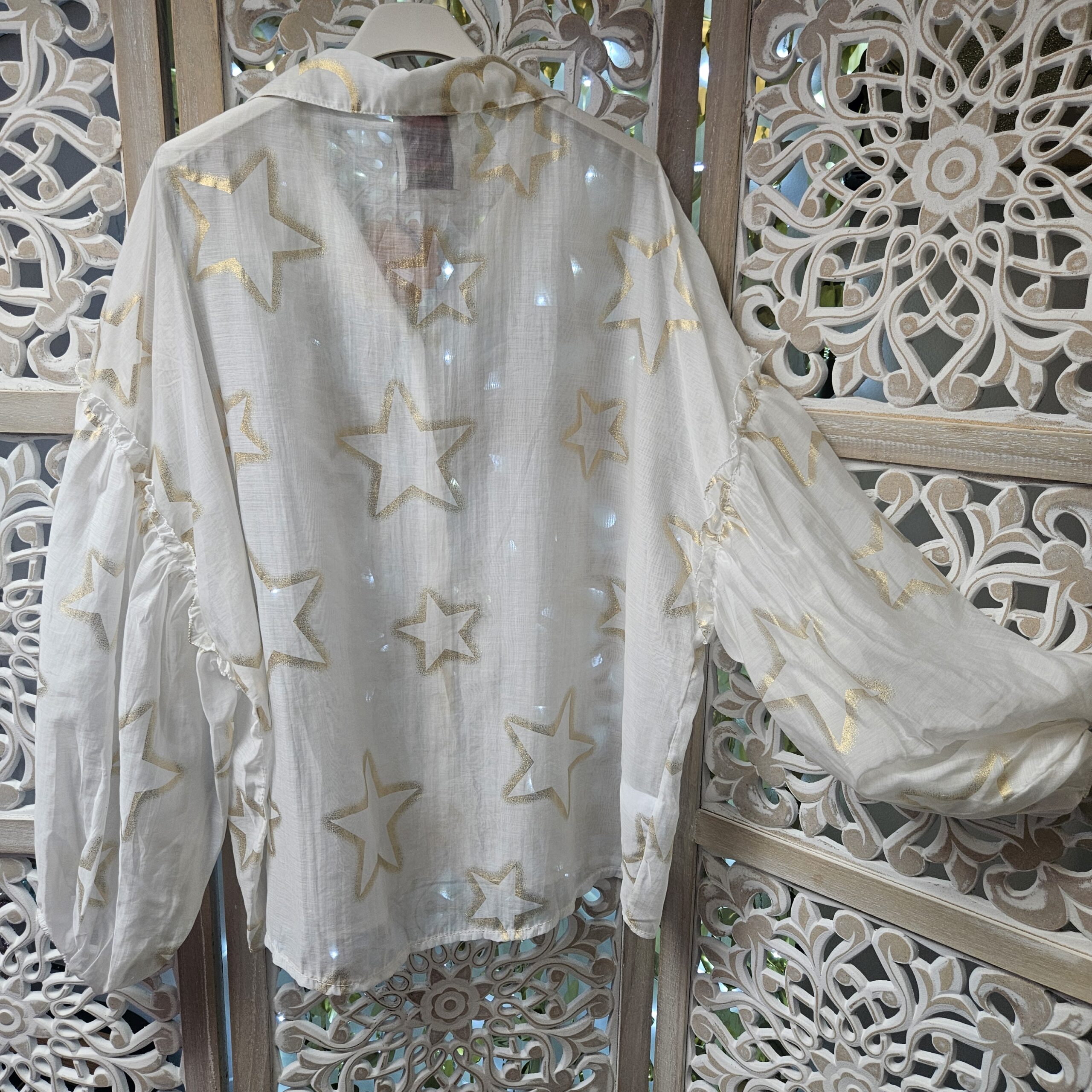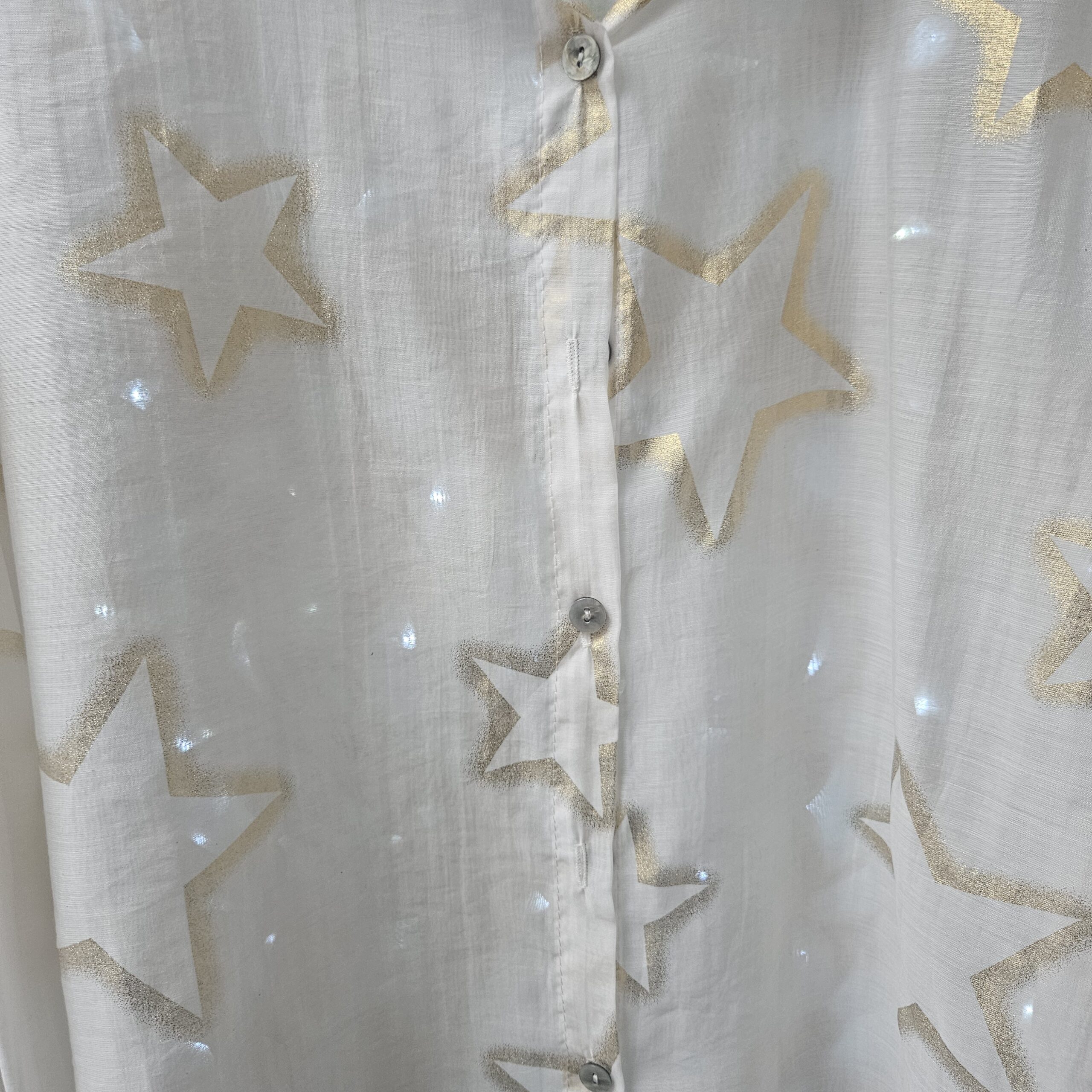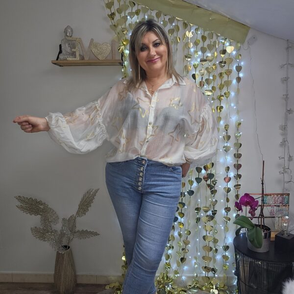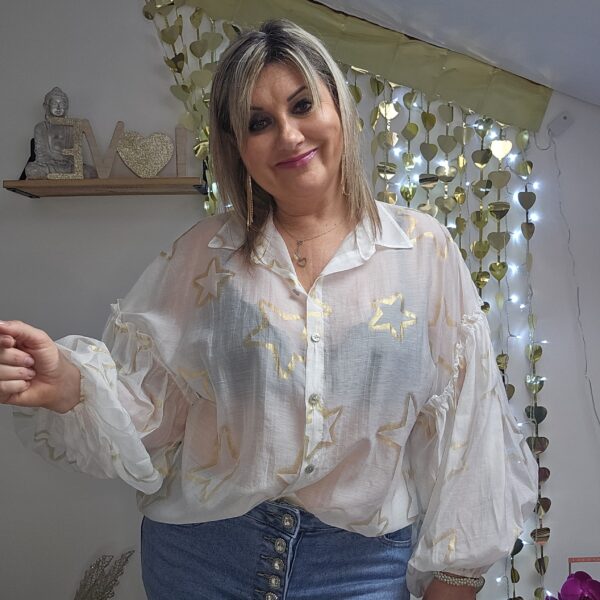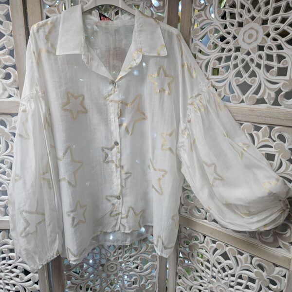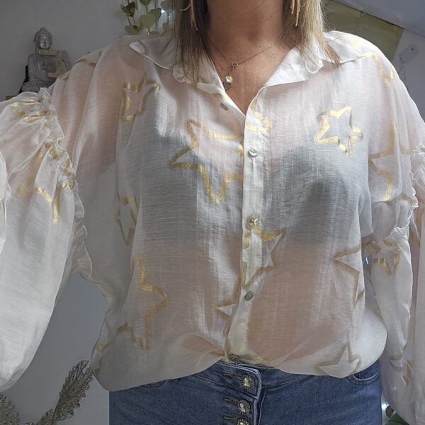 Chemise blanche semi transparente, avec des étoiles dorées, en voile de tencel, manches longues type « ballon », élastique au bout des manches, coupe droite au niveau du buste. A la jonction de la manche, des froufrous. Plus longue derrière et en arrondit TU.