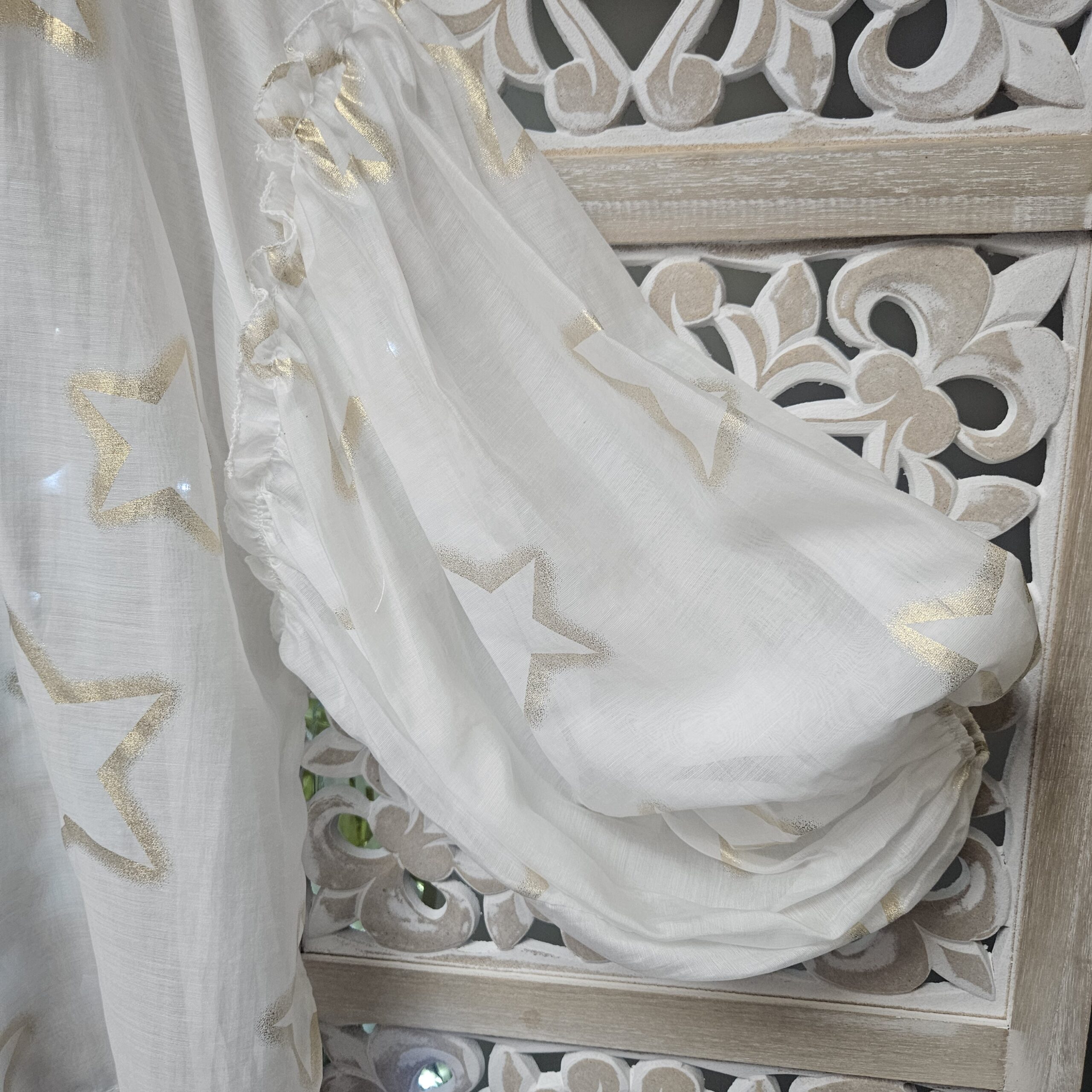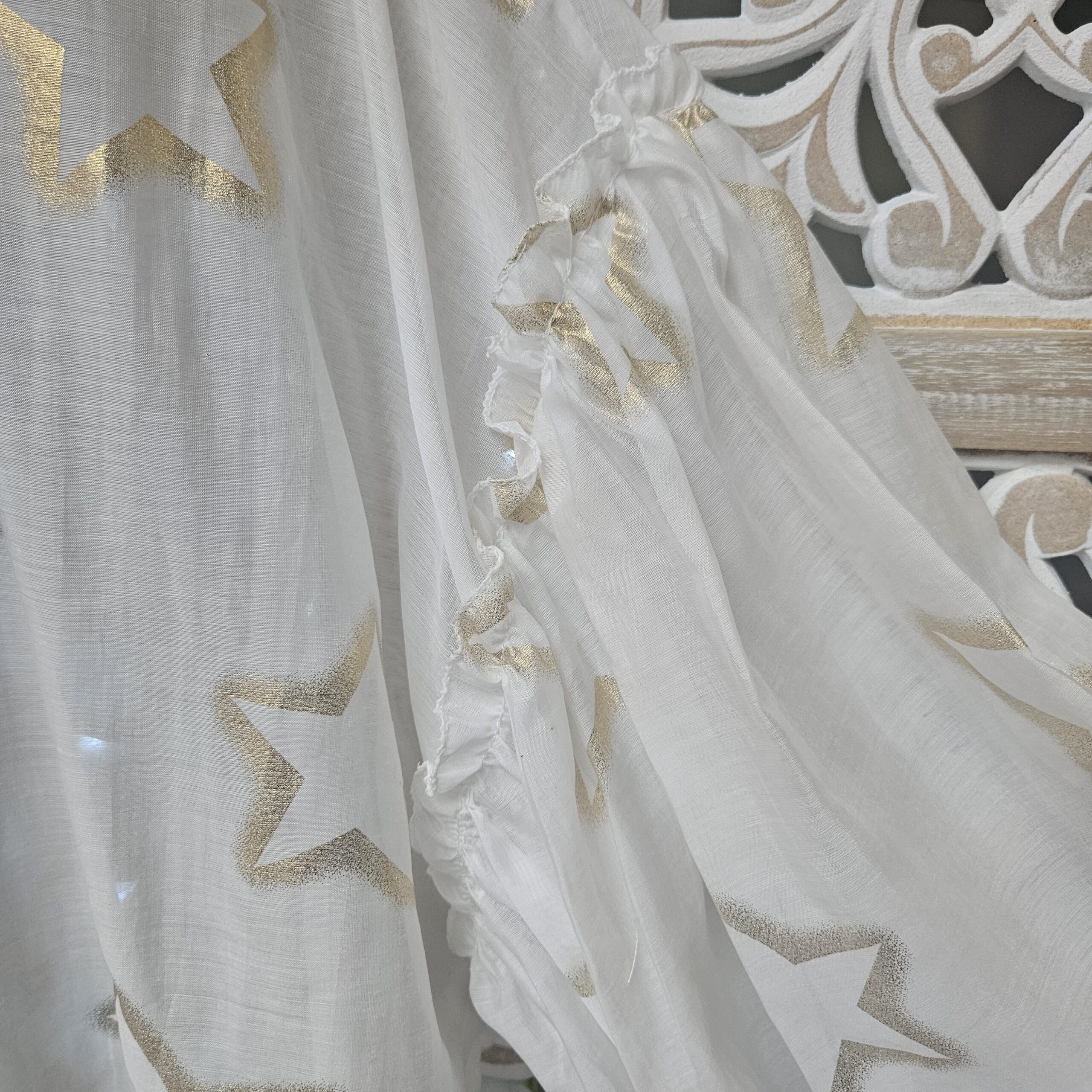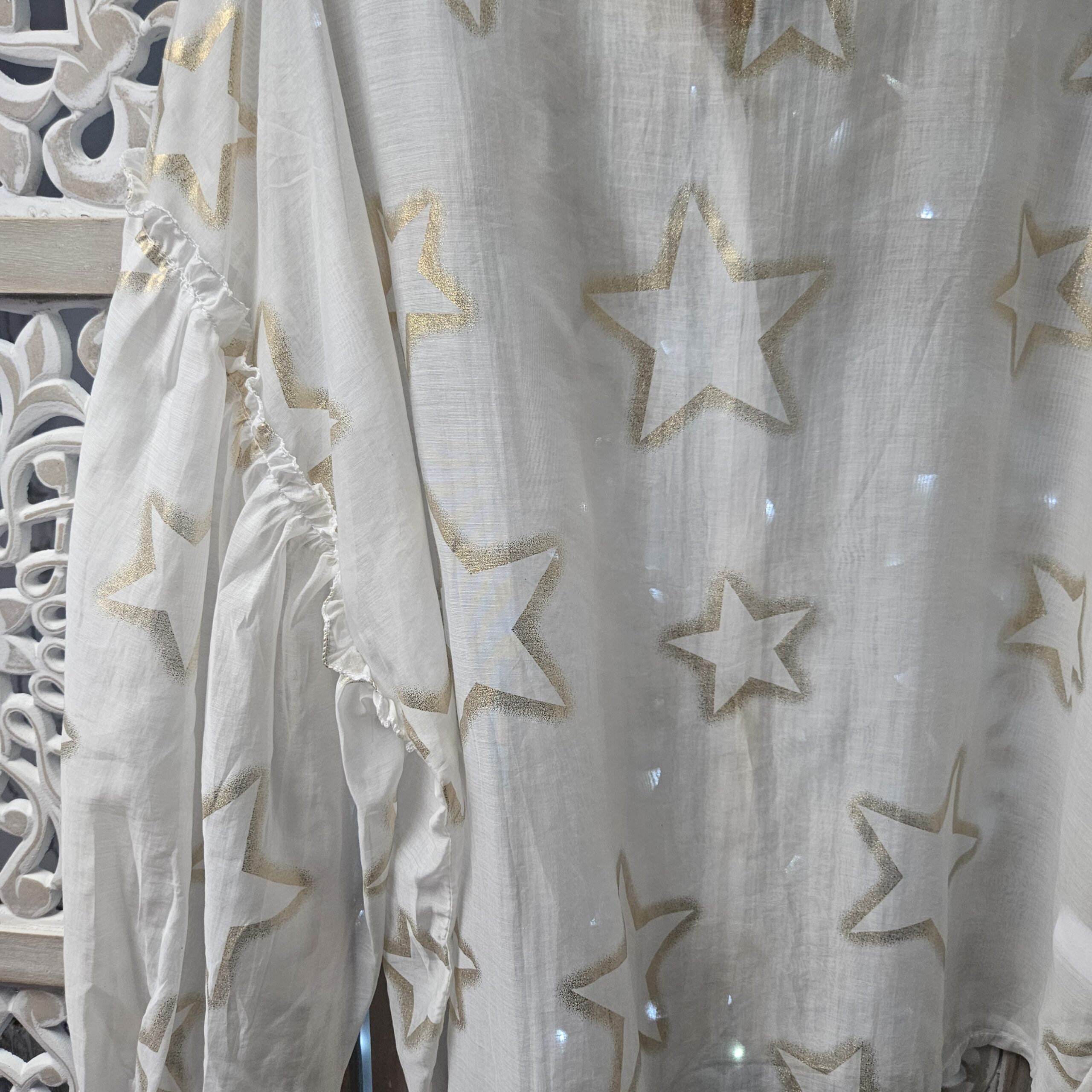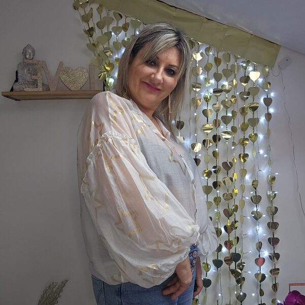 Chemise blanche semi transparente, avec des étoiles dorées, en voile de tencel, manches longues type « ballon », élastique au bout des manches, coupe droite au niveau du buste. A la jonction de la manche, des froufrous. Plus longue derrière et en arrondit TU.