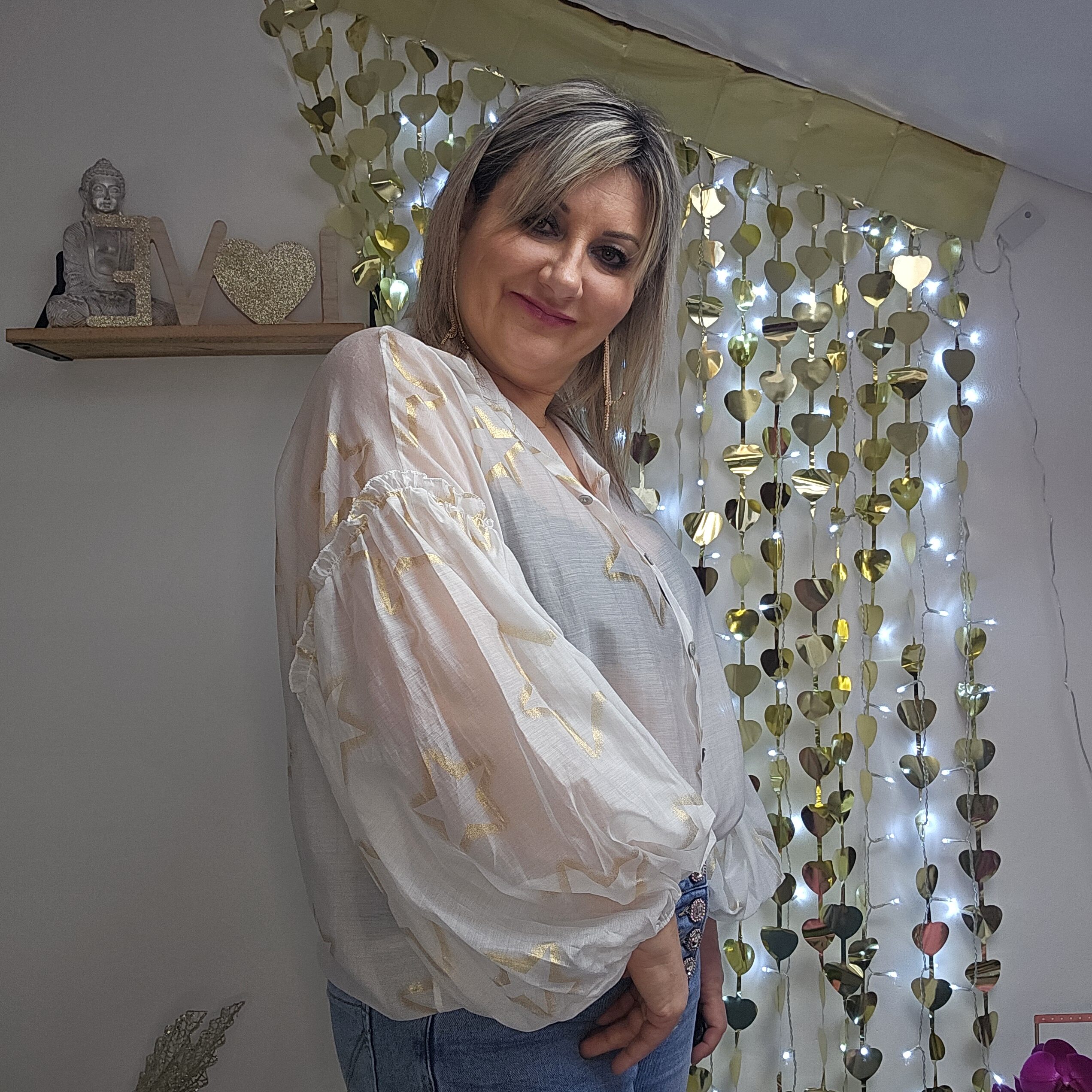 Mon regard pailleté : On aime cette chemise blanche avec ses étoiles dorées et ses manches « ballon » ! Très agréable à porter, et légère. Convient à différentes morphologies.