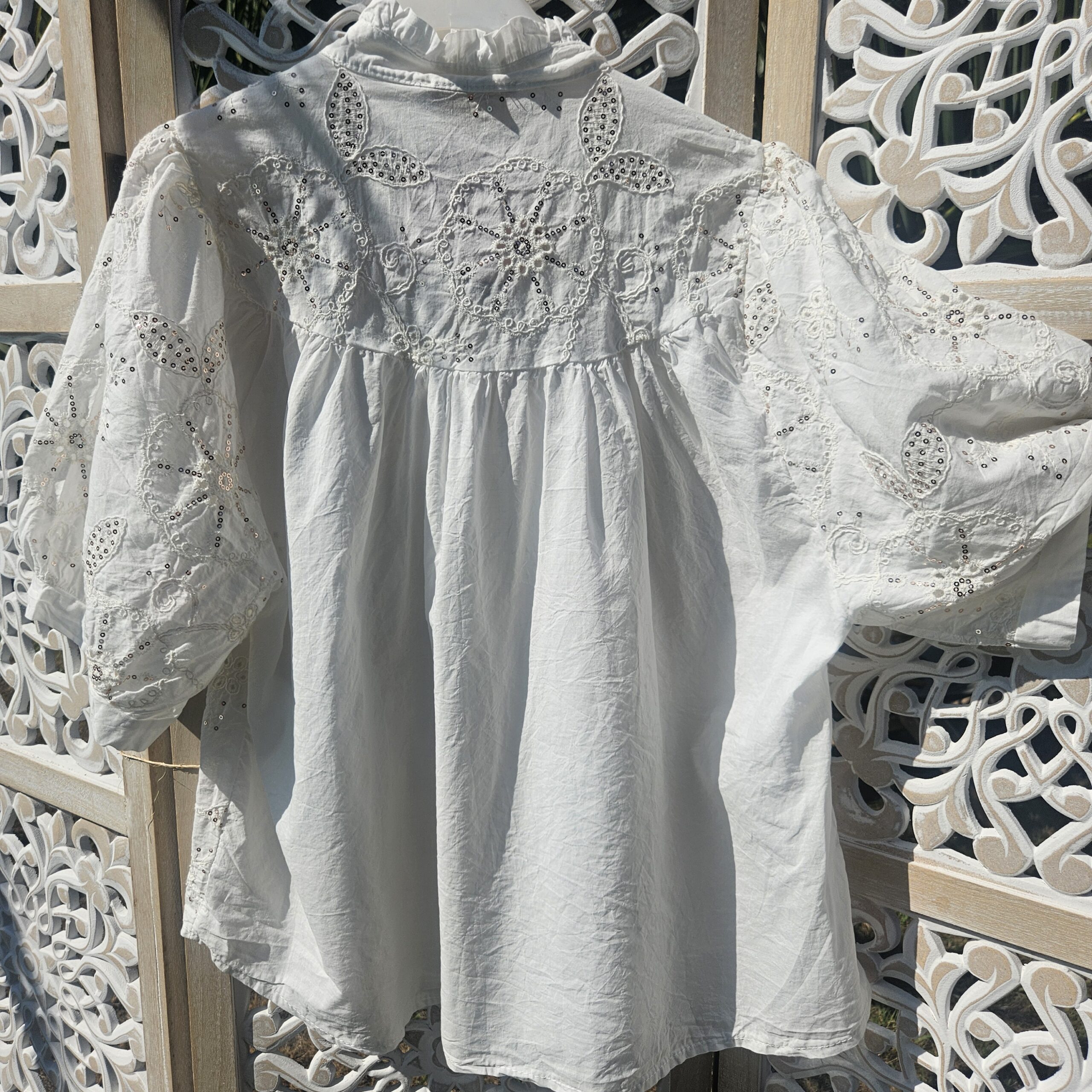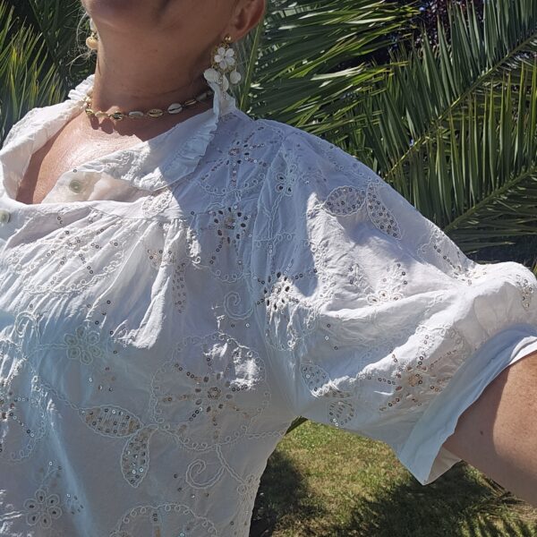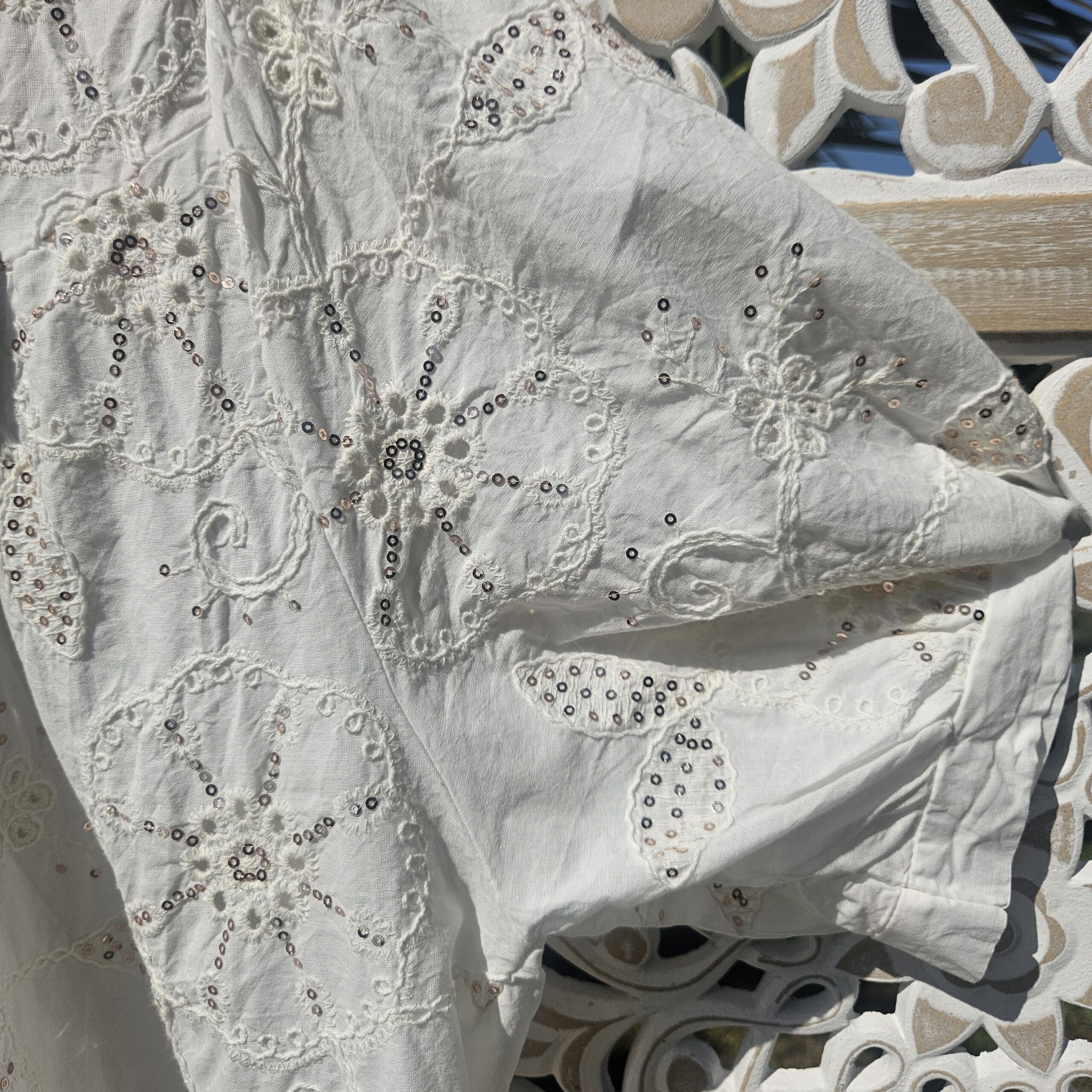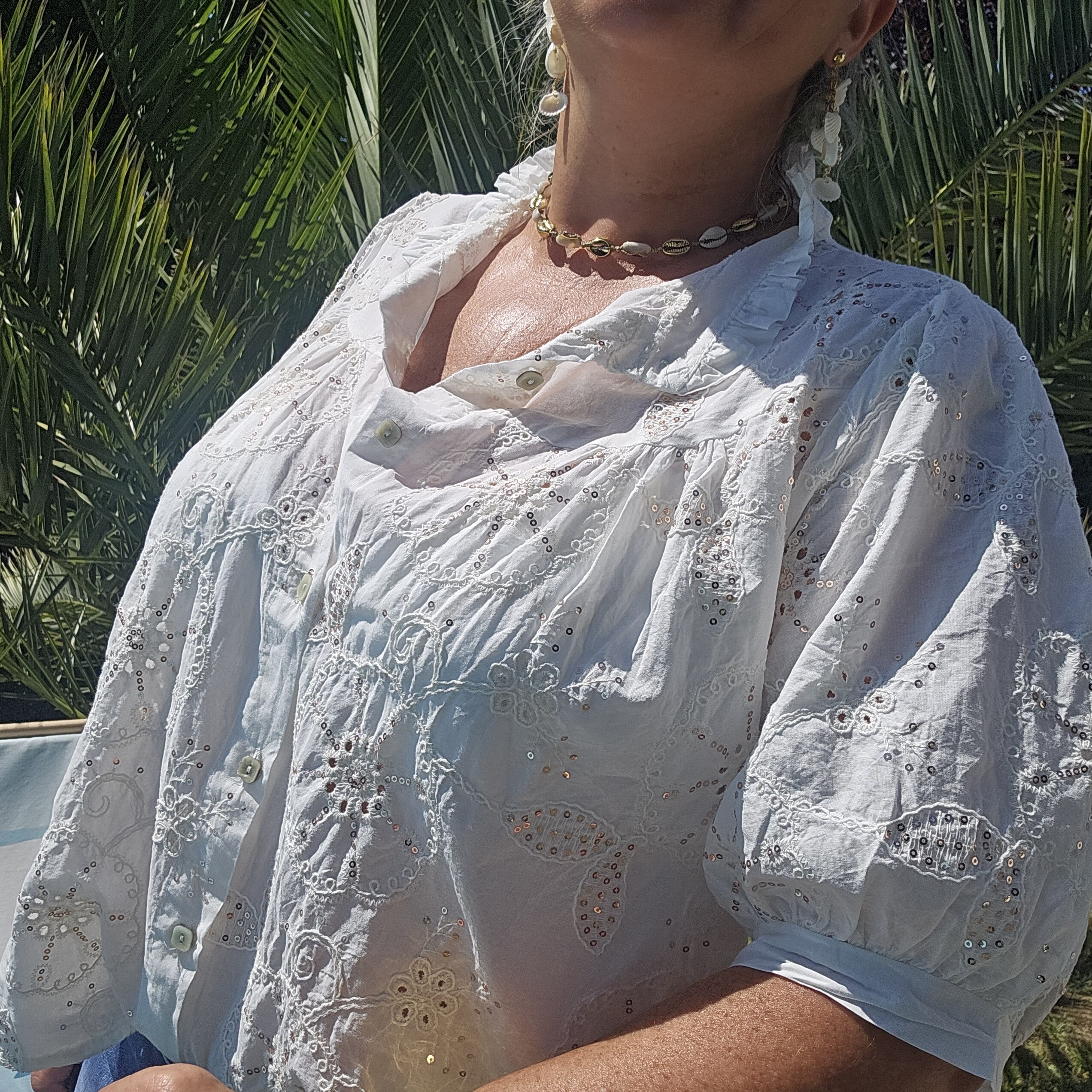 Chemise blanche avec broderies ajourées et des sequins, col volanté et manches courtes bouffantes. Coupe ample et confortable pour un look frais et élégant. TU