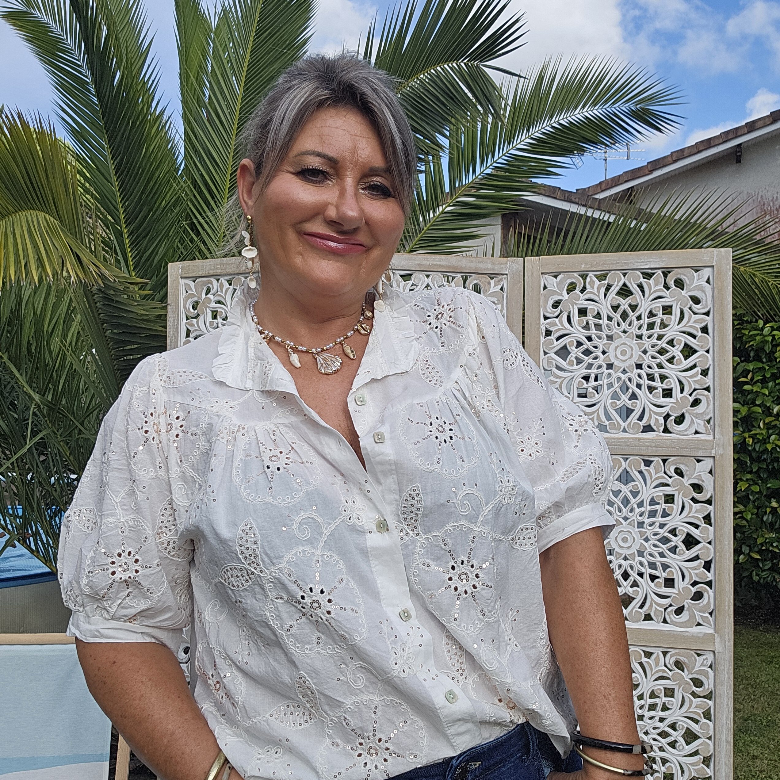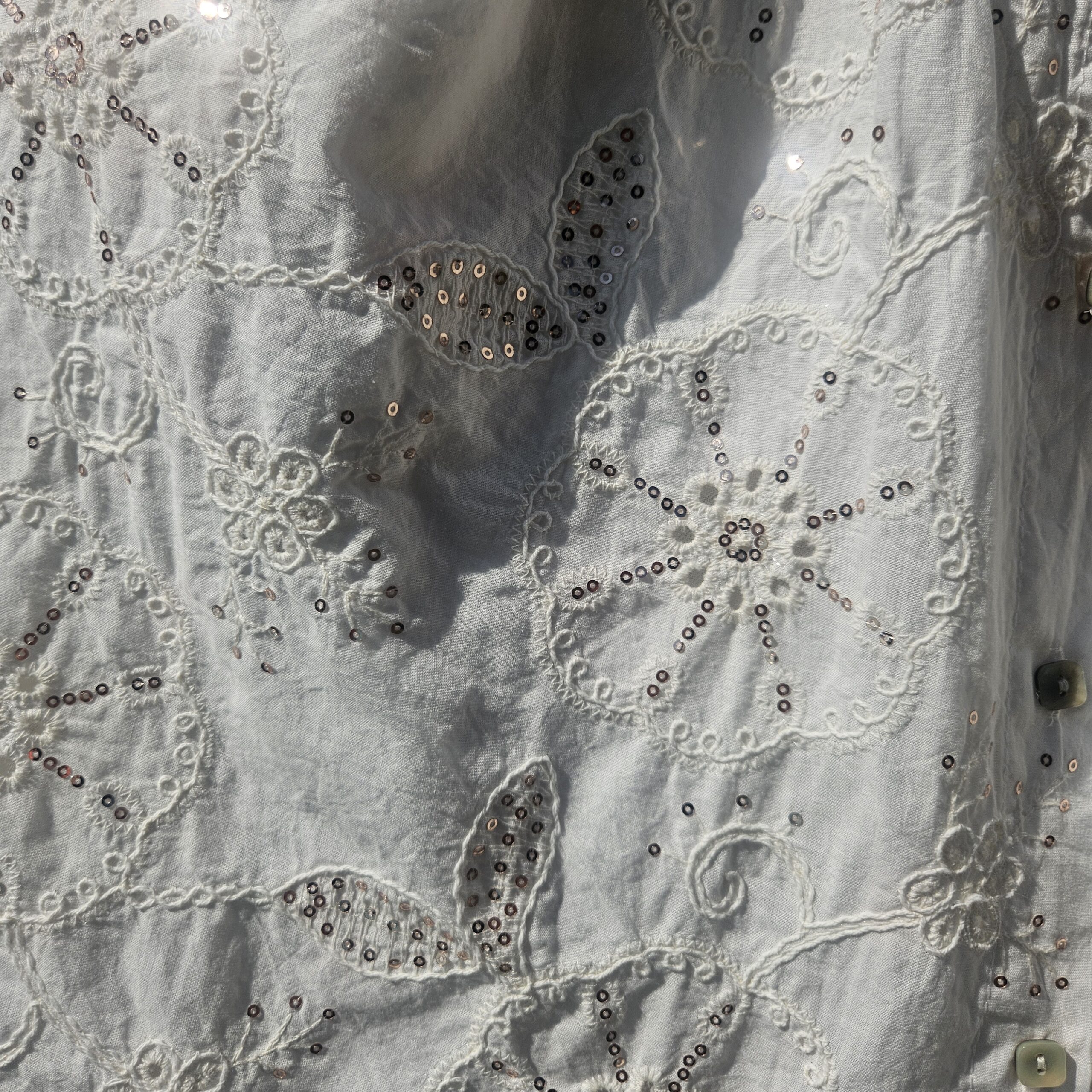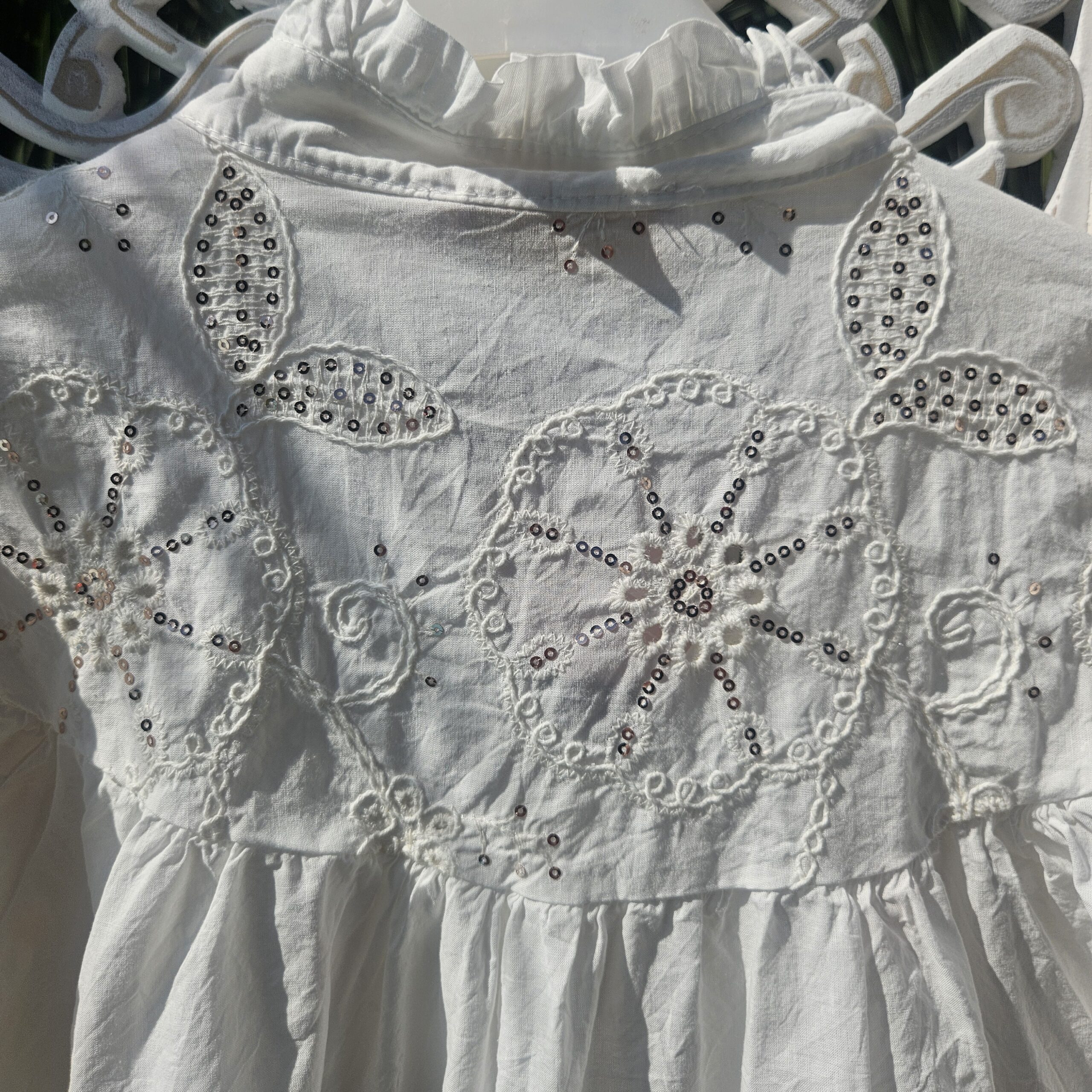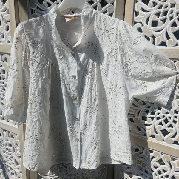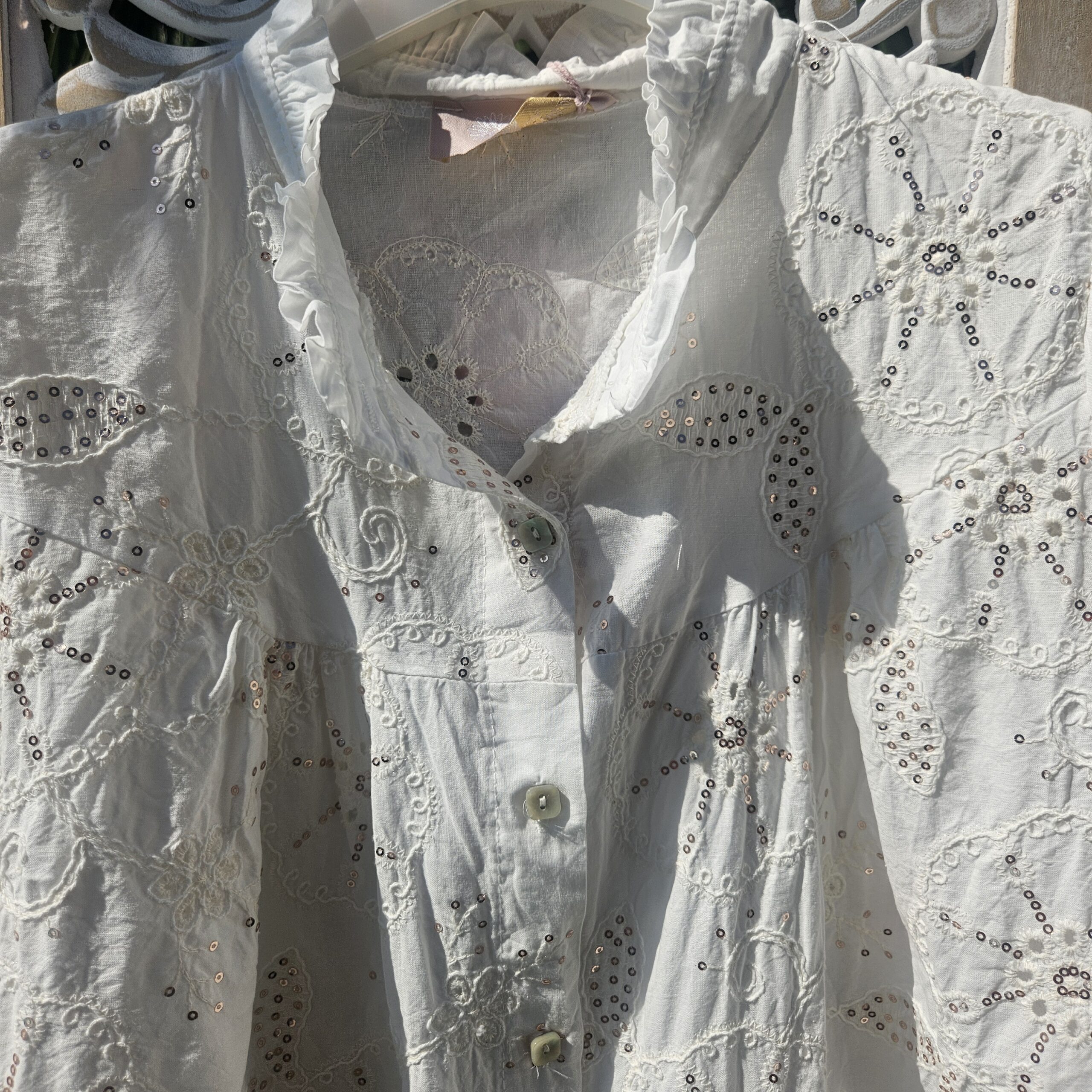 Chemise blanche avec broderies ajourées et des sequins, col volanté et manches courtes bouffantes. Coupe ample et confortable pour un look frais et élégant. TU