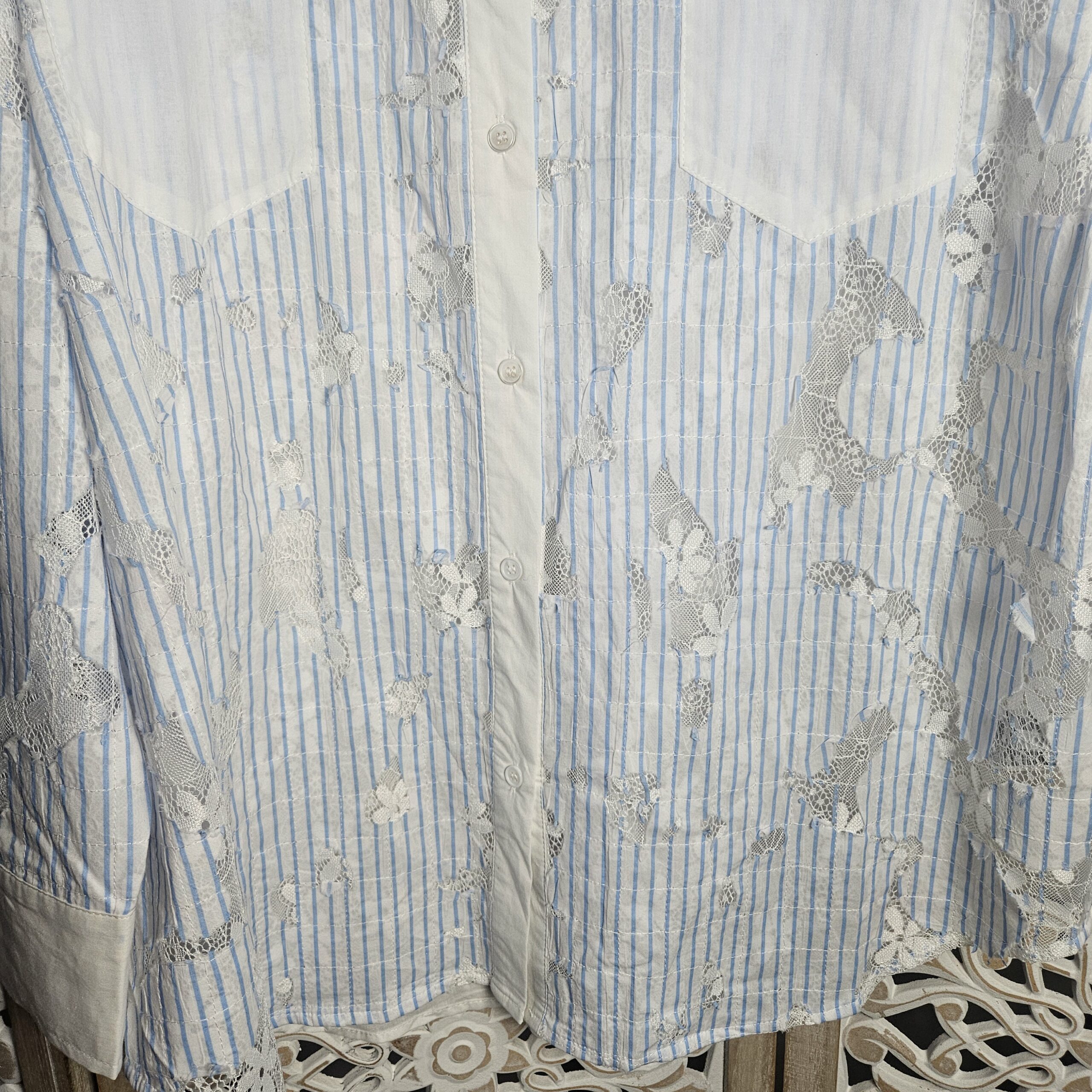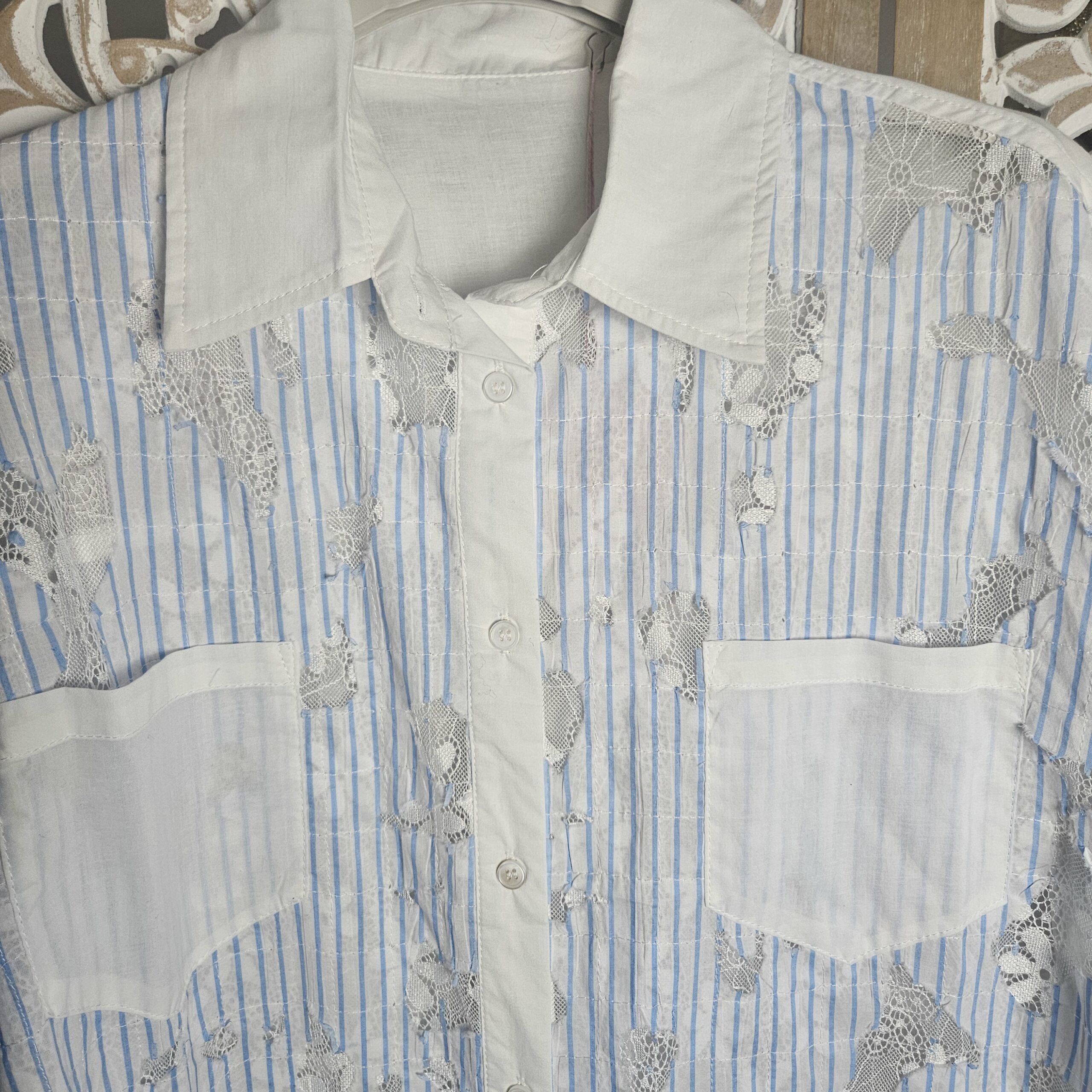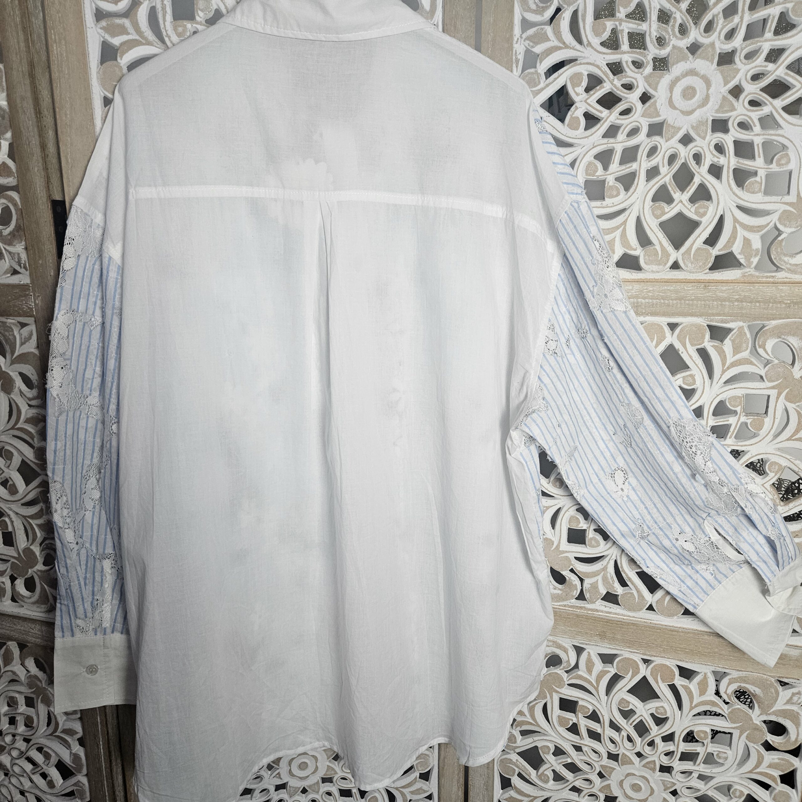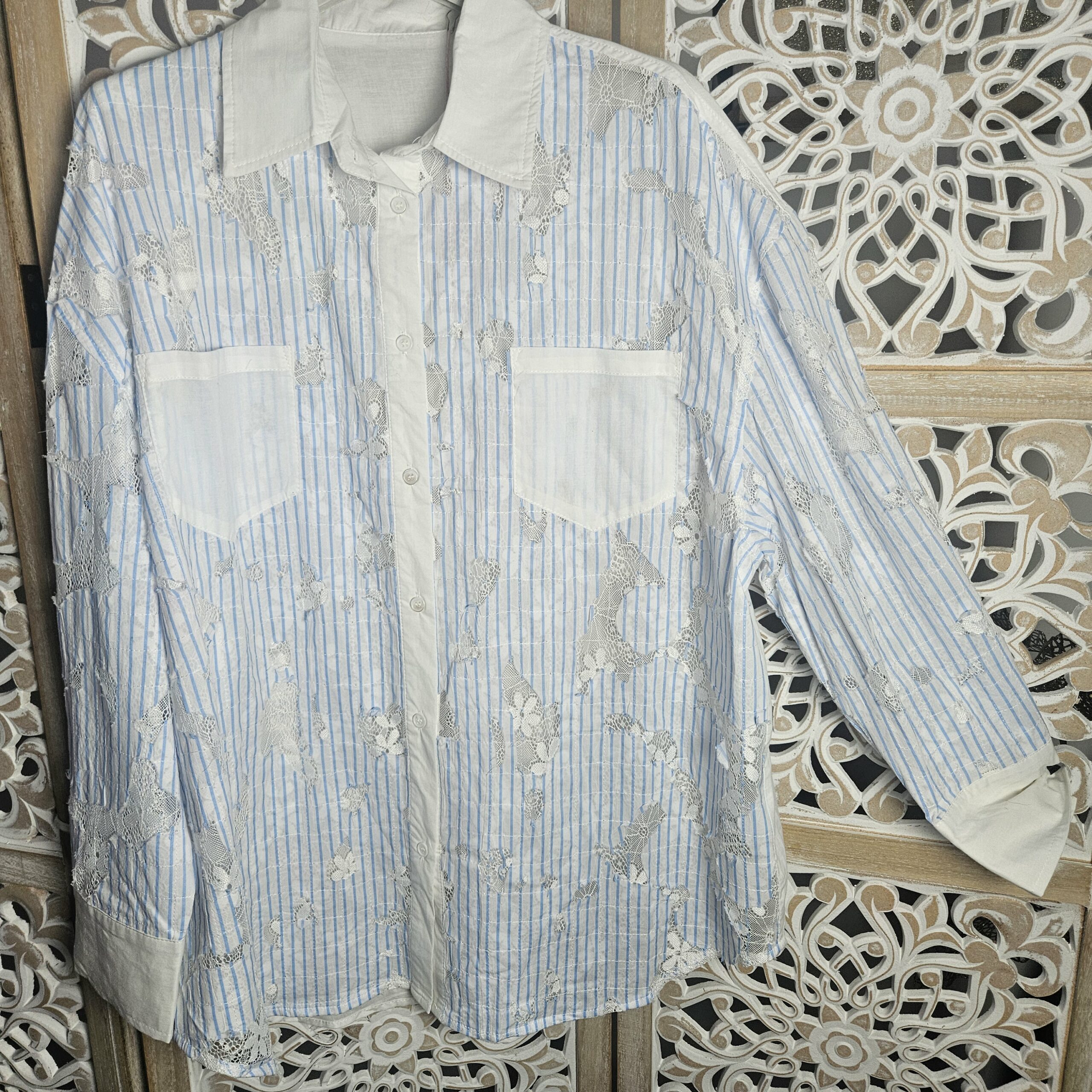 Chemise blanche rayée bleue avec de la dentelle sur le devant et les manches, derrière elle est unie blanche. Manches longues. Arrondit sur les côté. Coupe droite et légèrement ample, confortable pour un look frais et élégant. Marque Sexy Woman