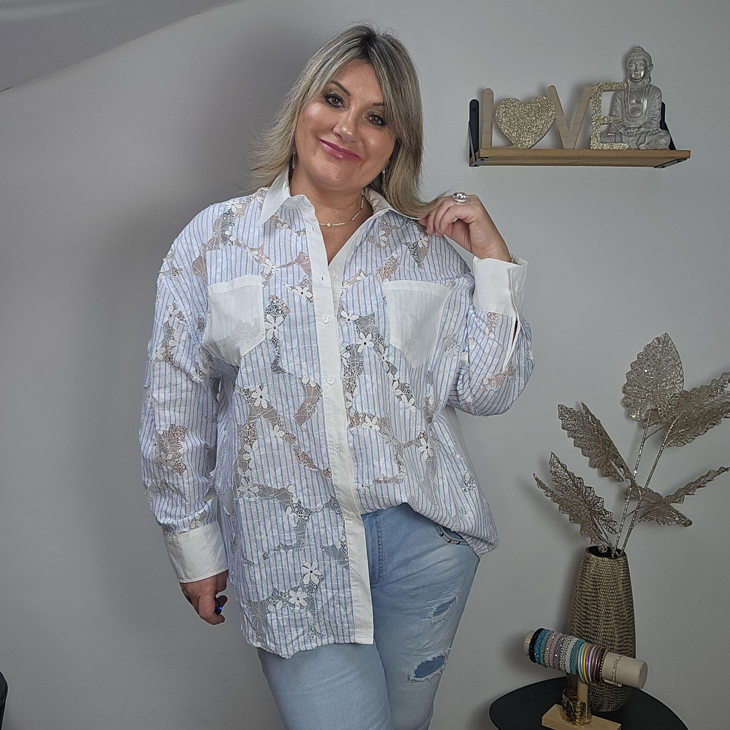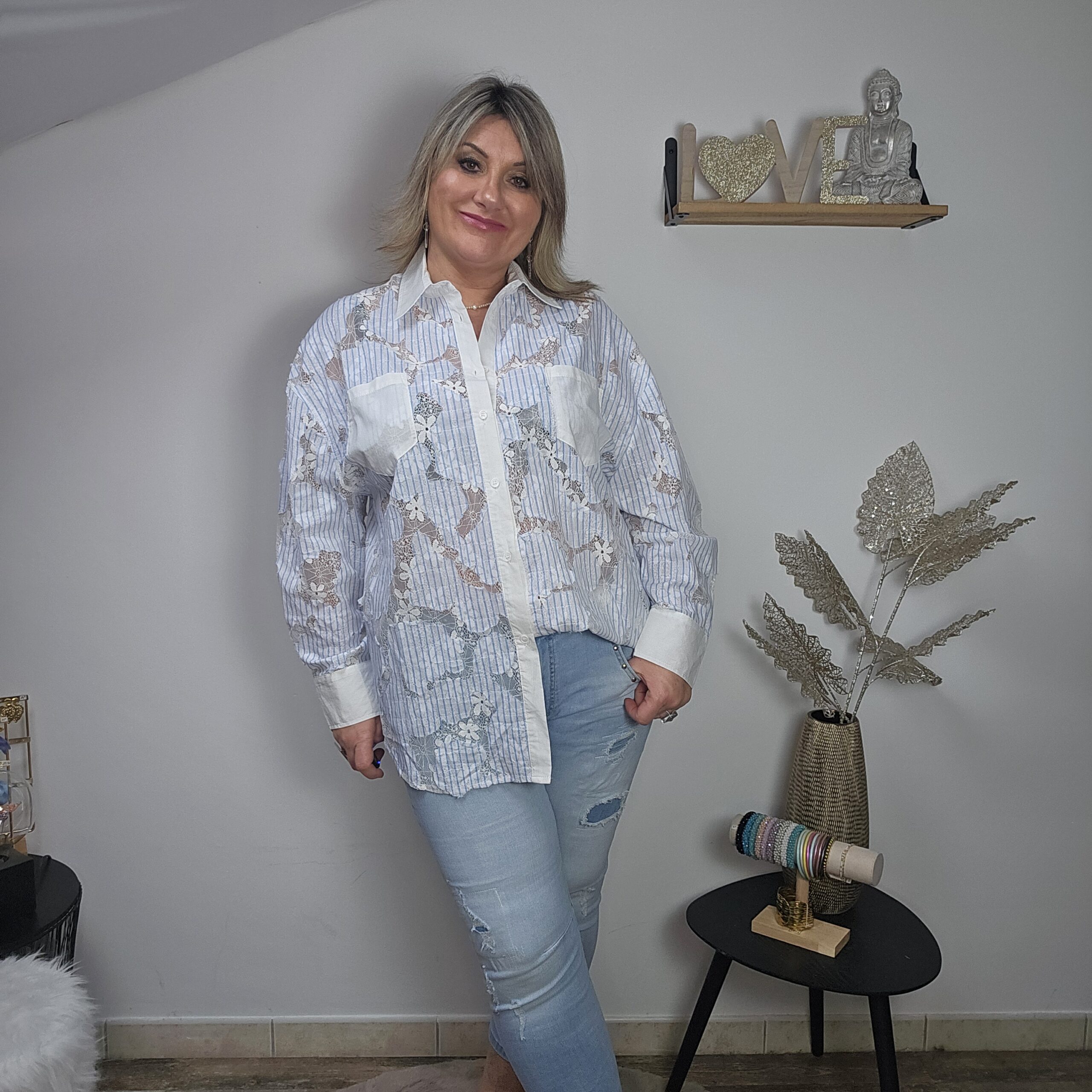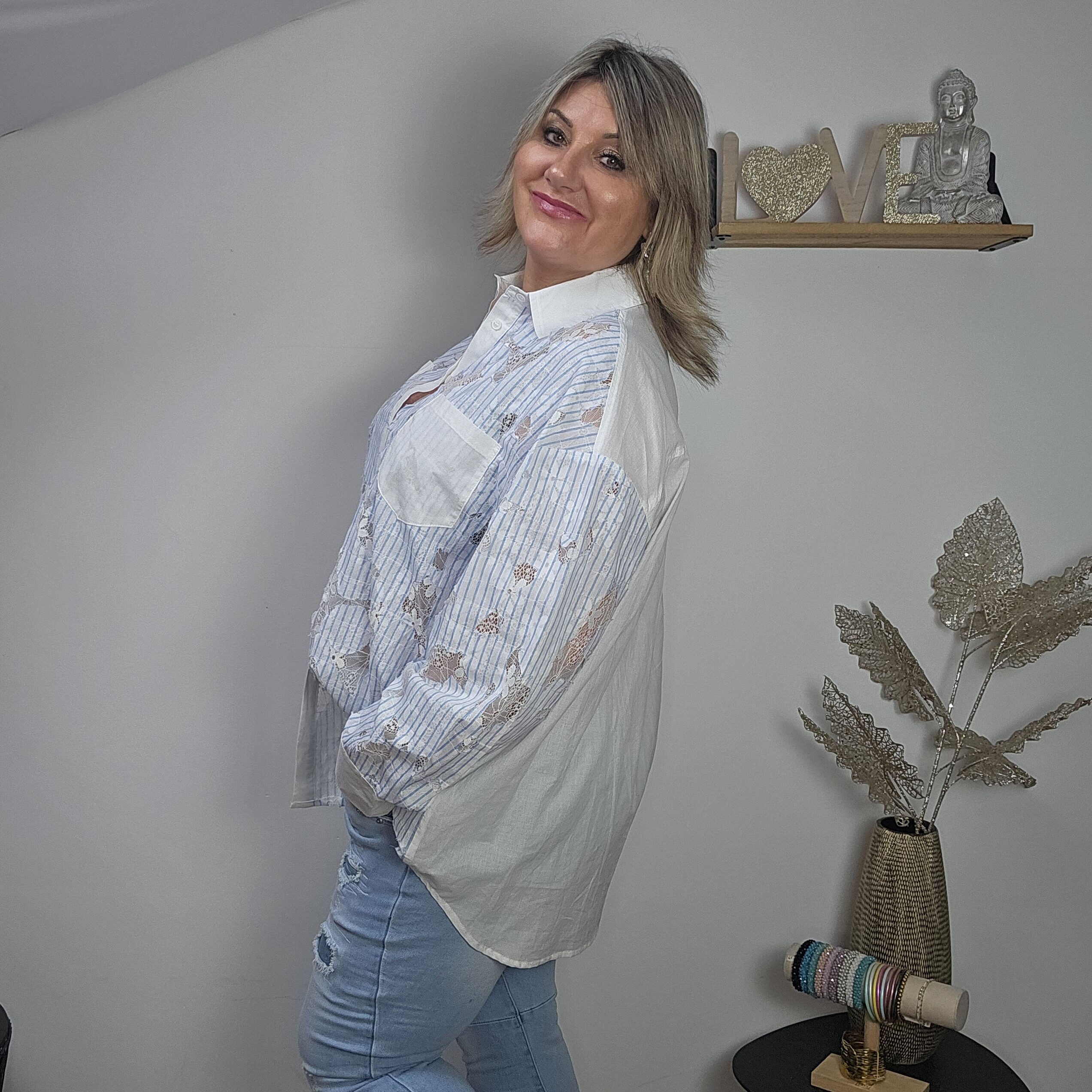 Mon regard pailleté : Cette chemise blanche rayée bleue est très originale avec ses touches de dentelle, elle vous apporte un look frais et élégant pour ce printemps ! Peut se porter avec un gilet sans manches et un jean’s.