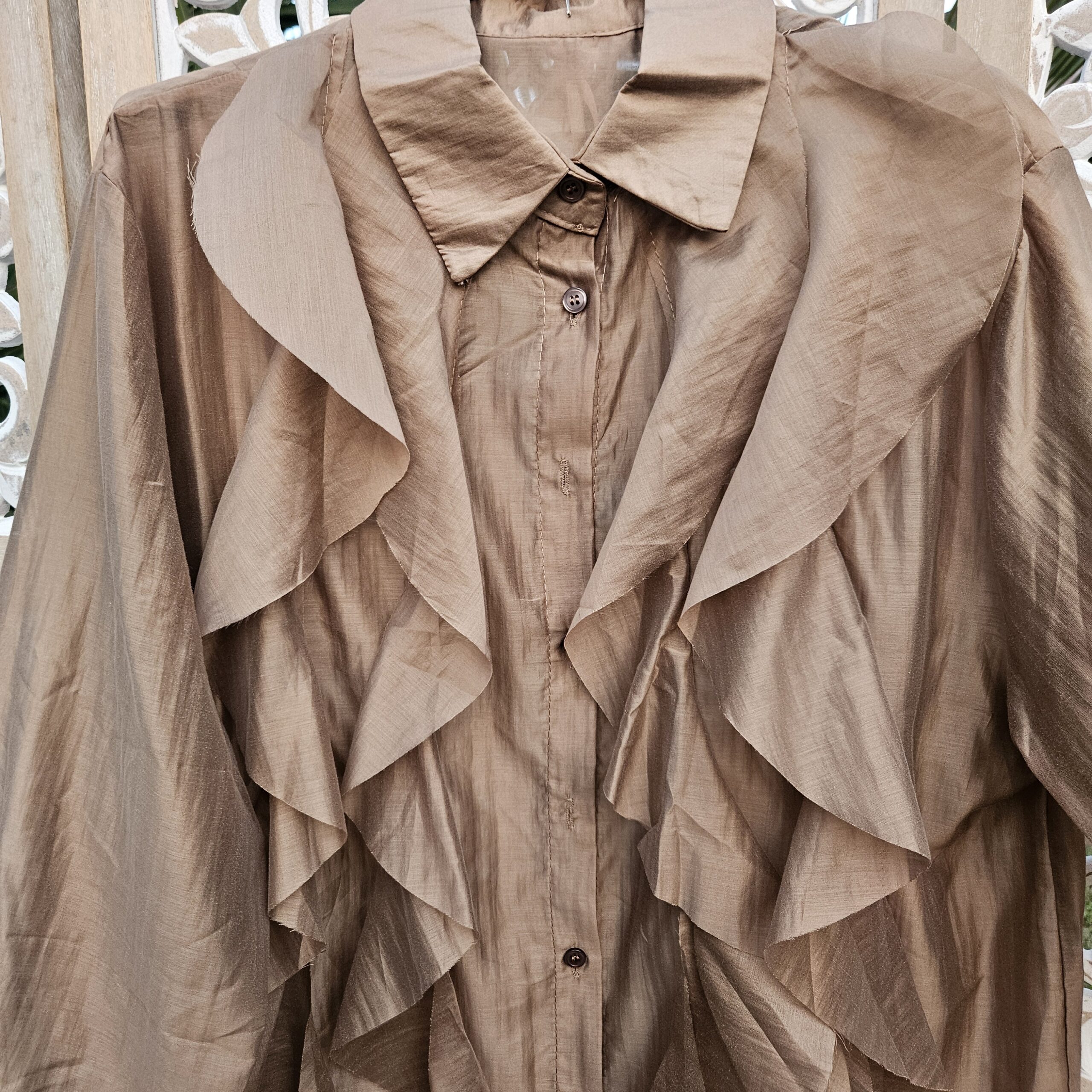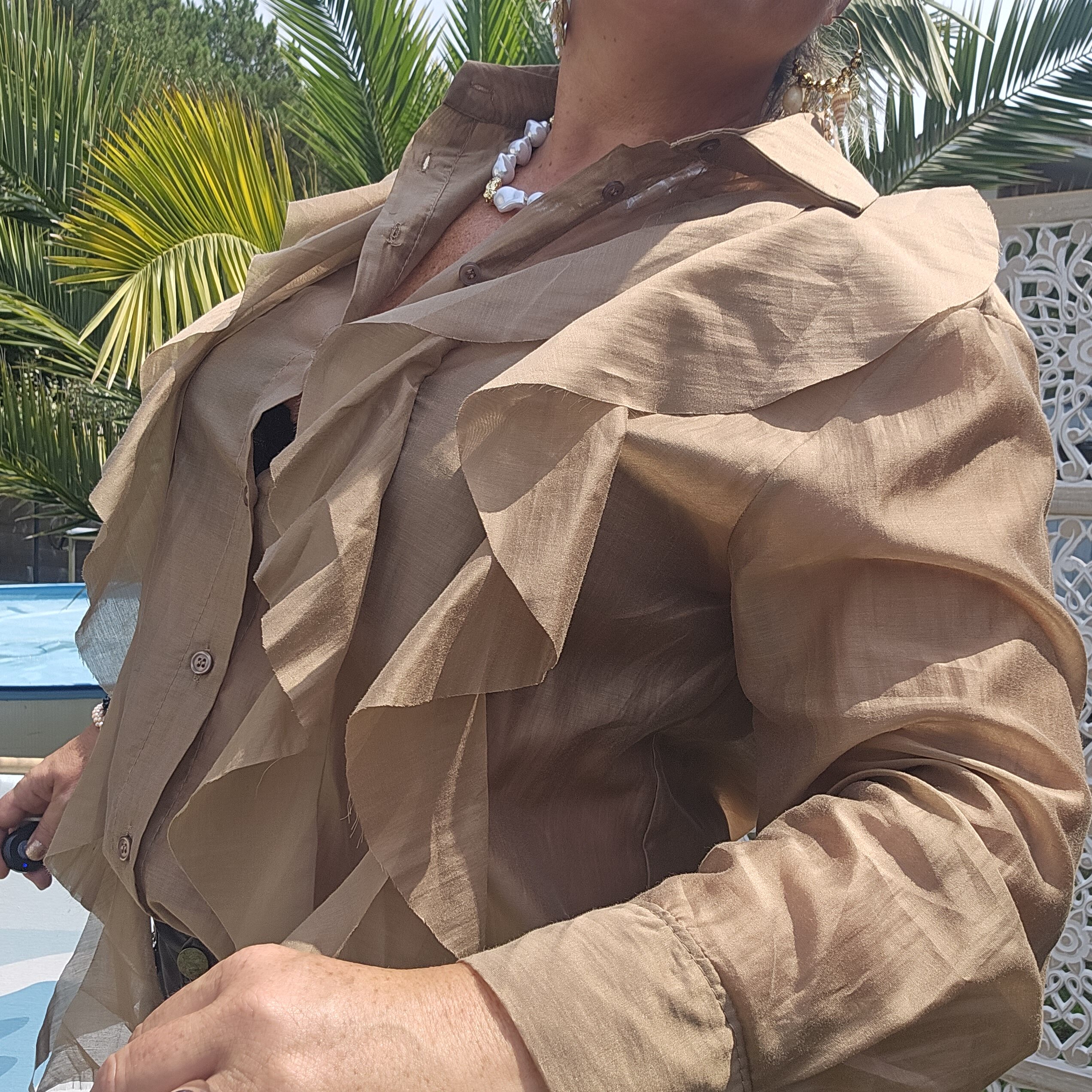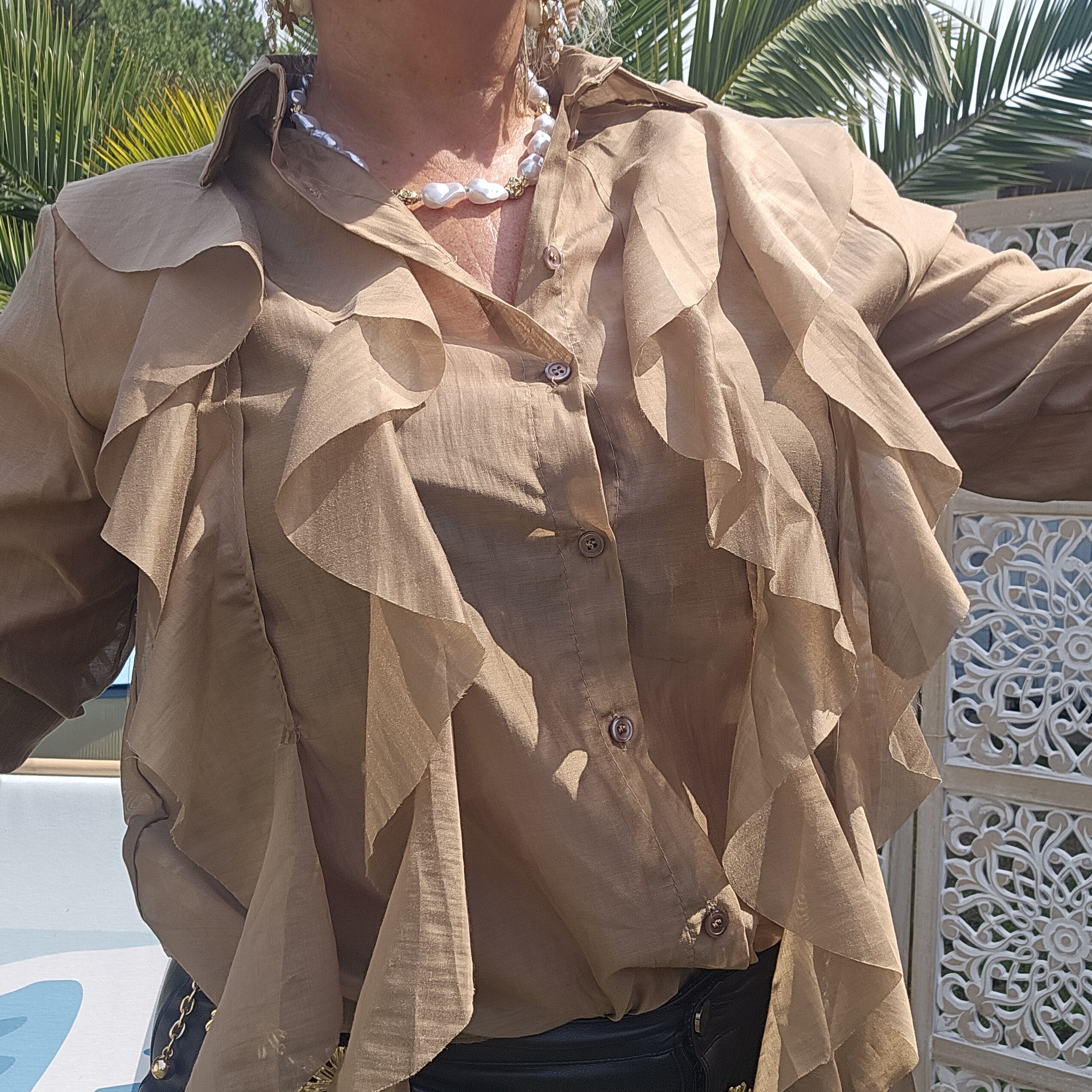 Chemise camel brillante avec des volants sur le devant, manches longue. Coupe ample et confortable pour un look frais et élégant. Semi transparente par la présence de lyocell et qui rend cette chemise légère et fluide. TU