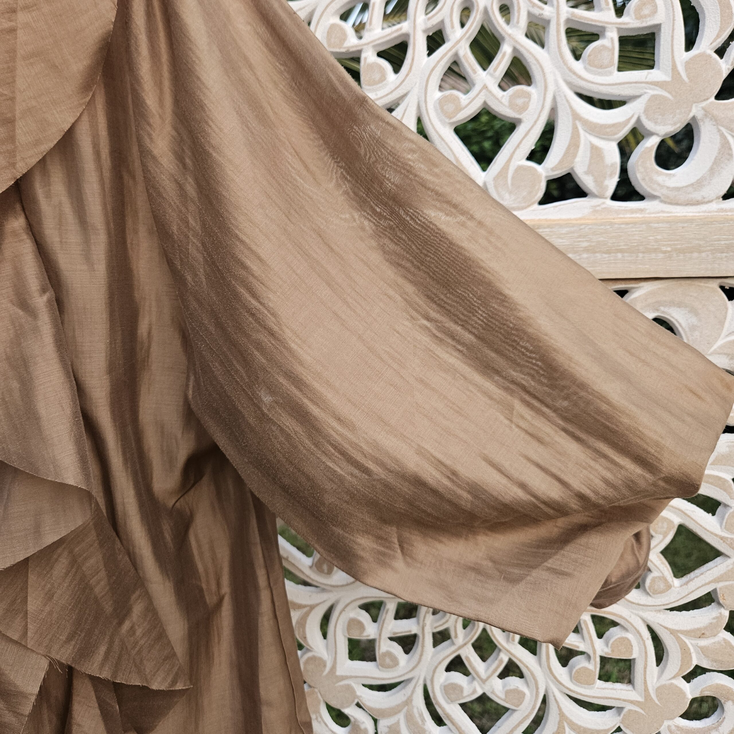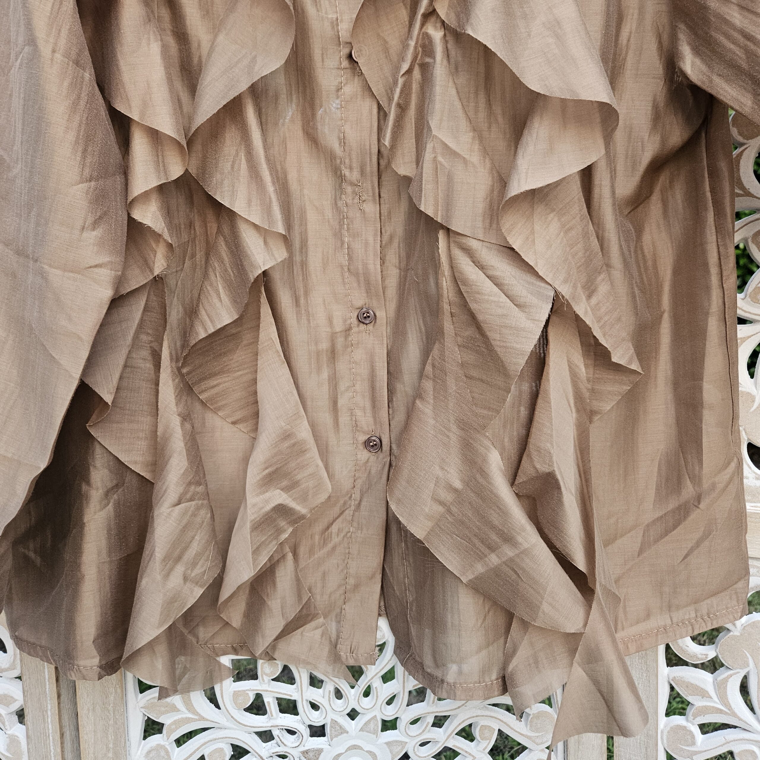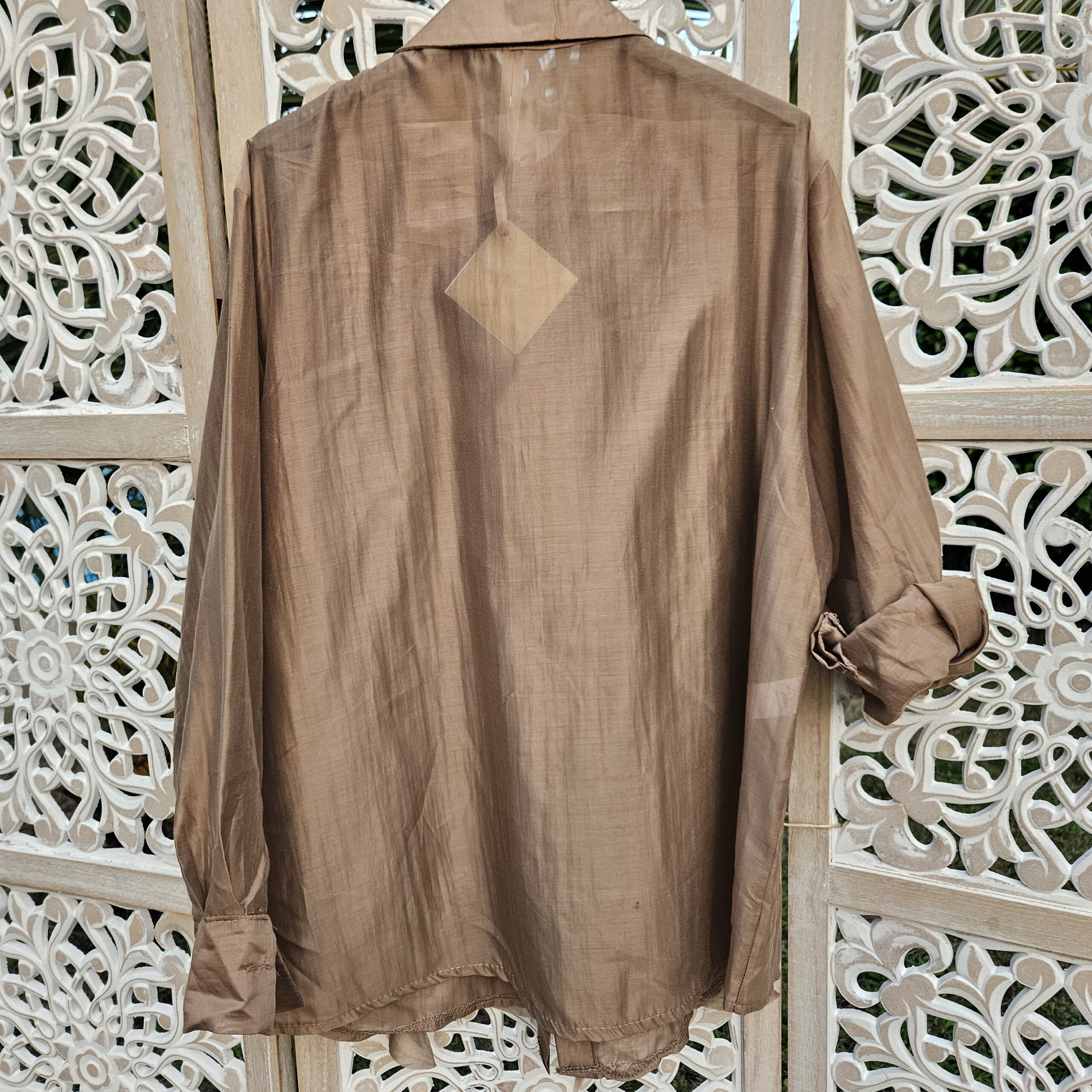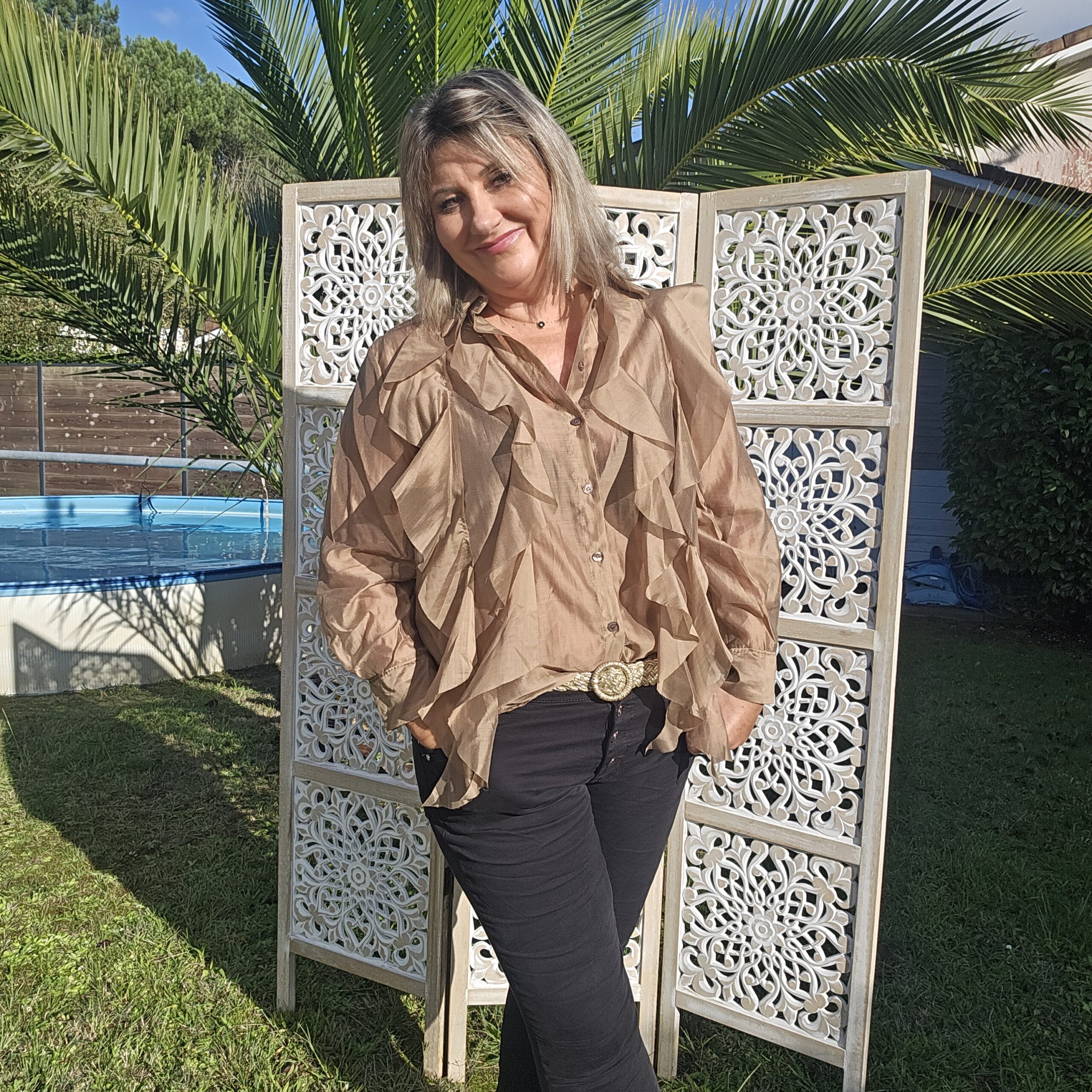 Chemise camel brillante avec des volants sur le devant, manches longue. Coupe ample et confortable pour un look frais et élégant. Semi transparente par la présence de lyocell et qui rend cette chemise légère et fluide. TU