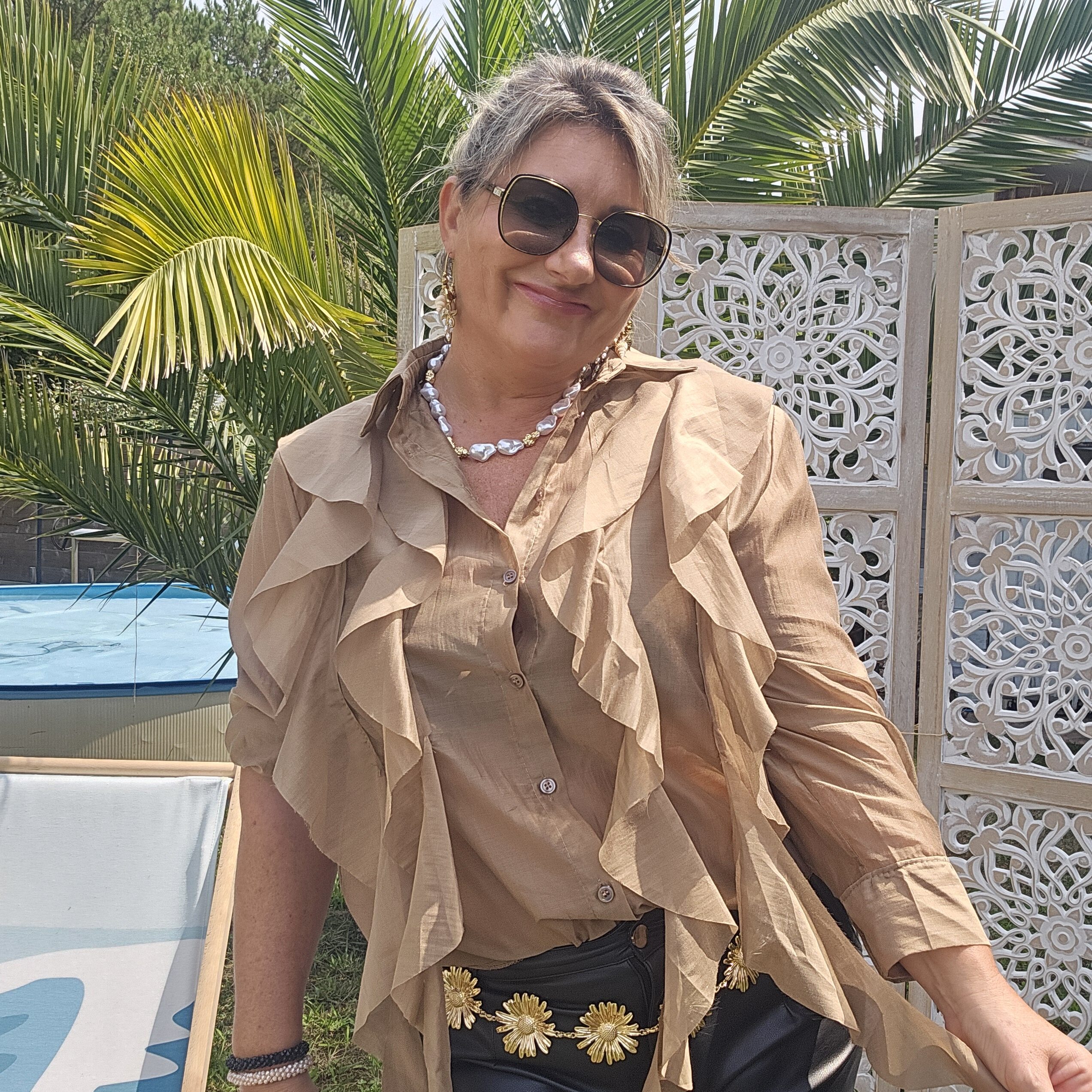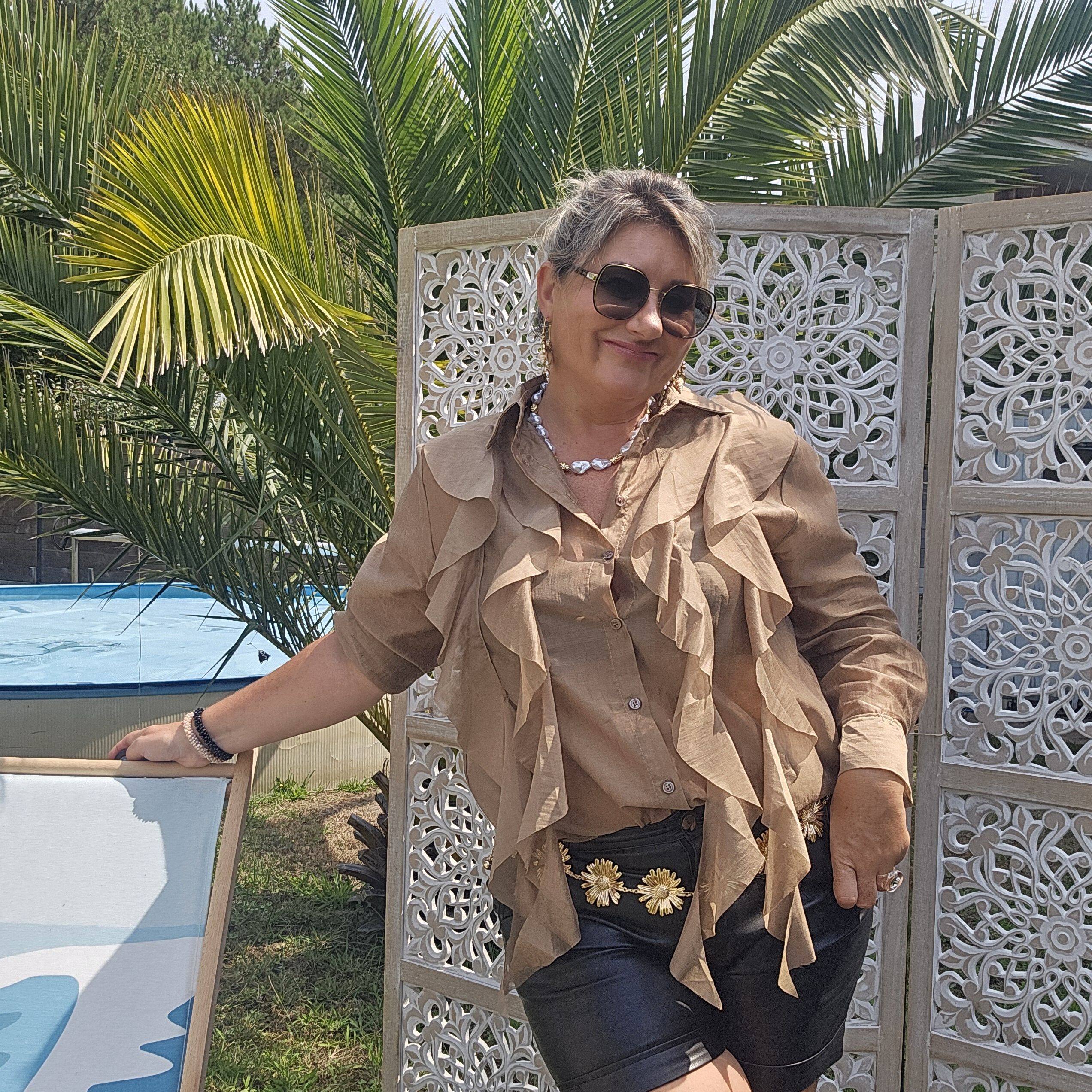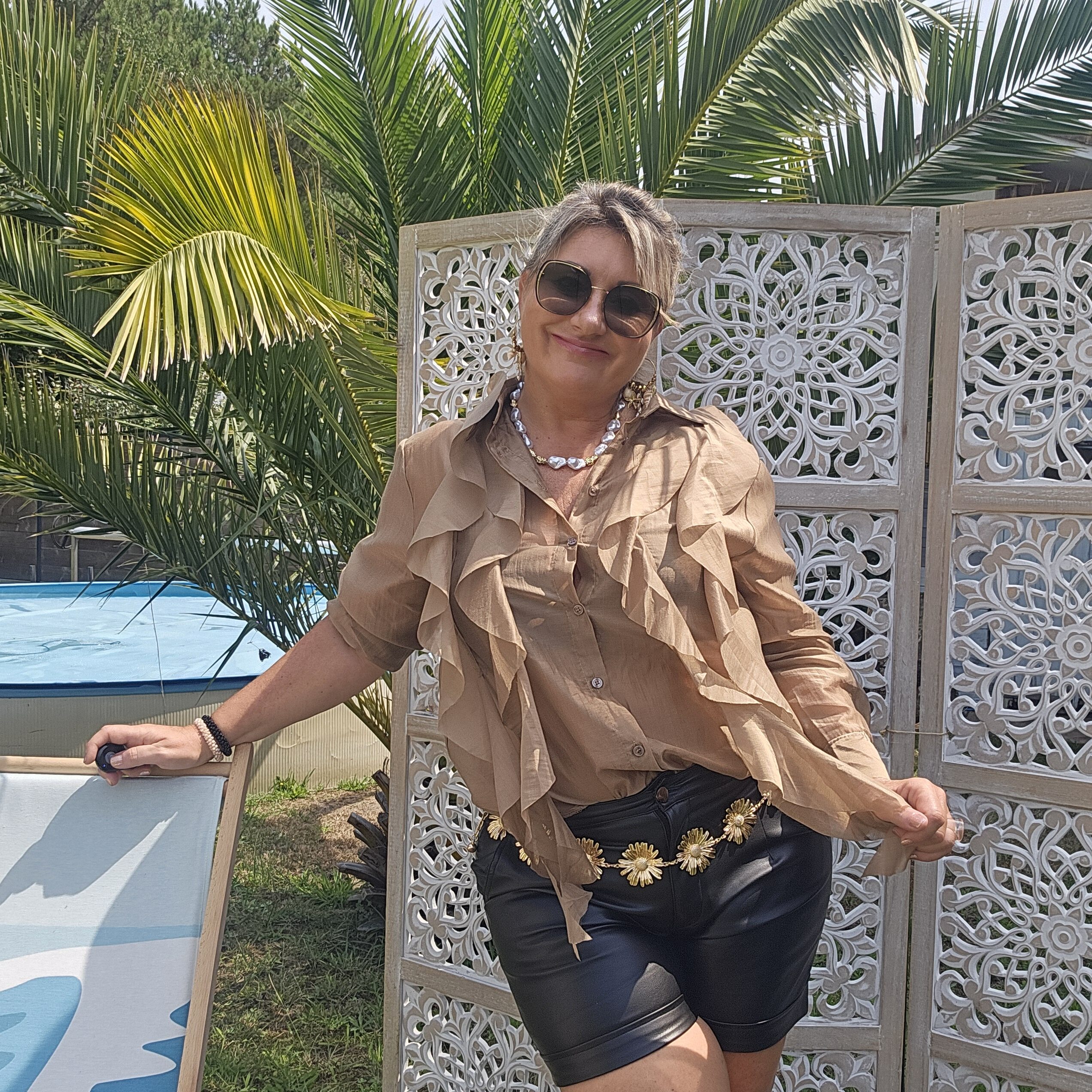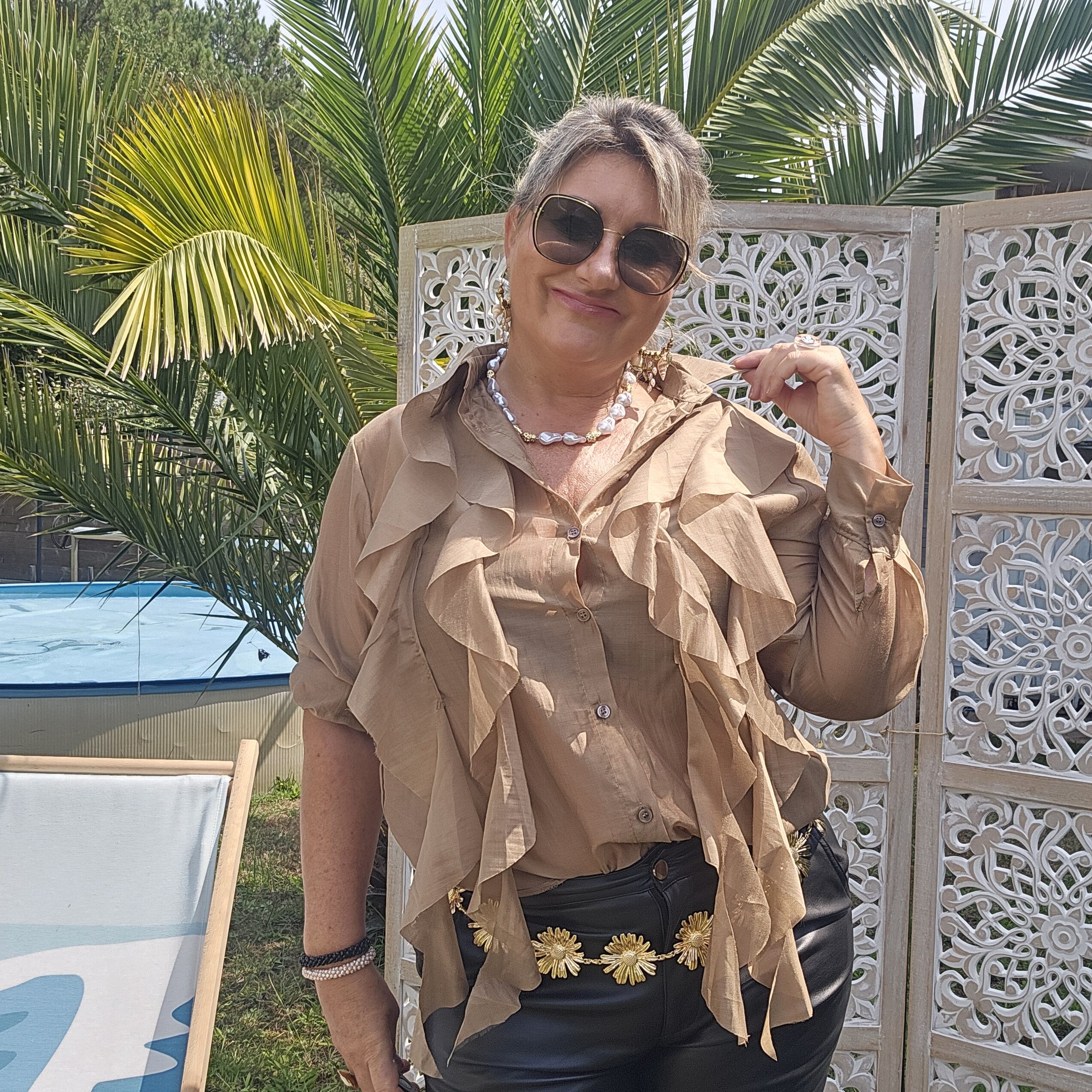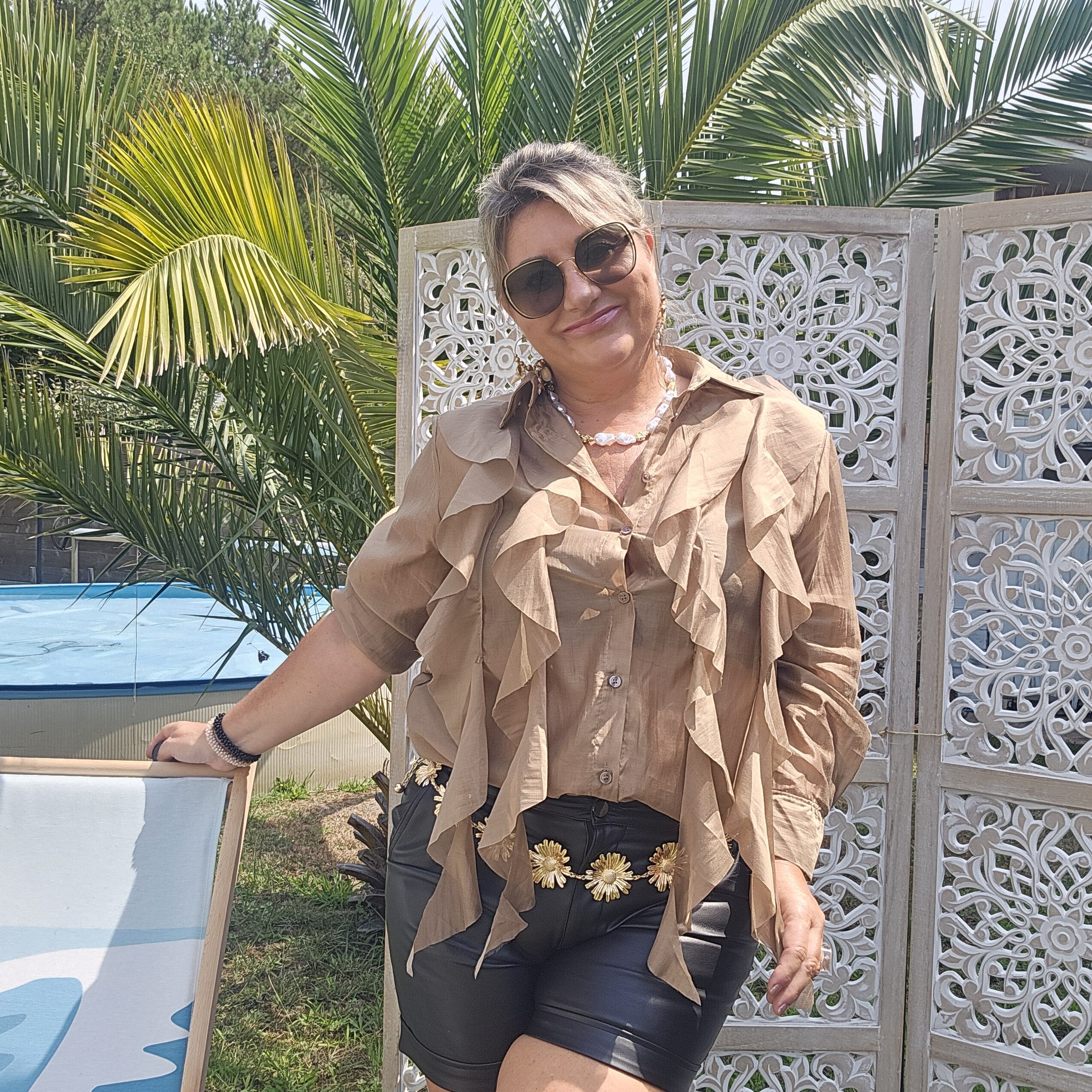 Mon regard pailleté : Chemise camel avec des volants qui vous apporte un look frais et élégant pour cet automne ! Peut se porter avec un jean’s, un pantalon large, une jupe ou short en simili cuir.