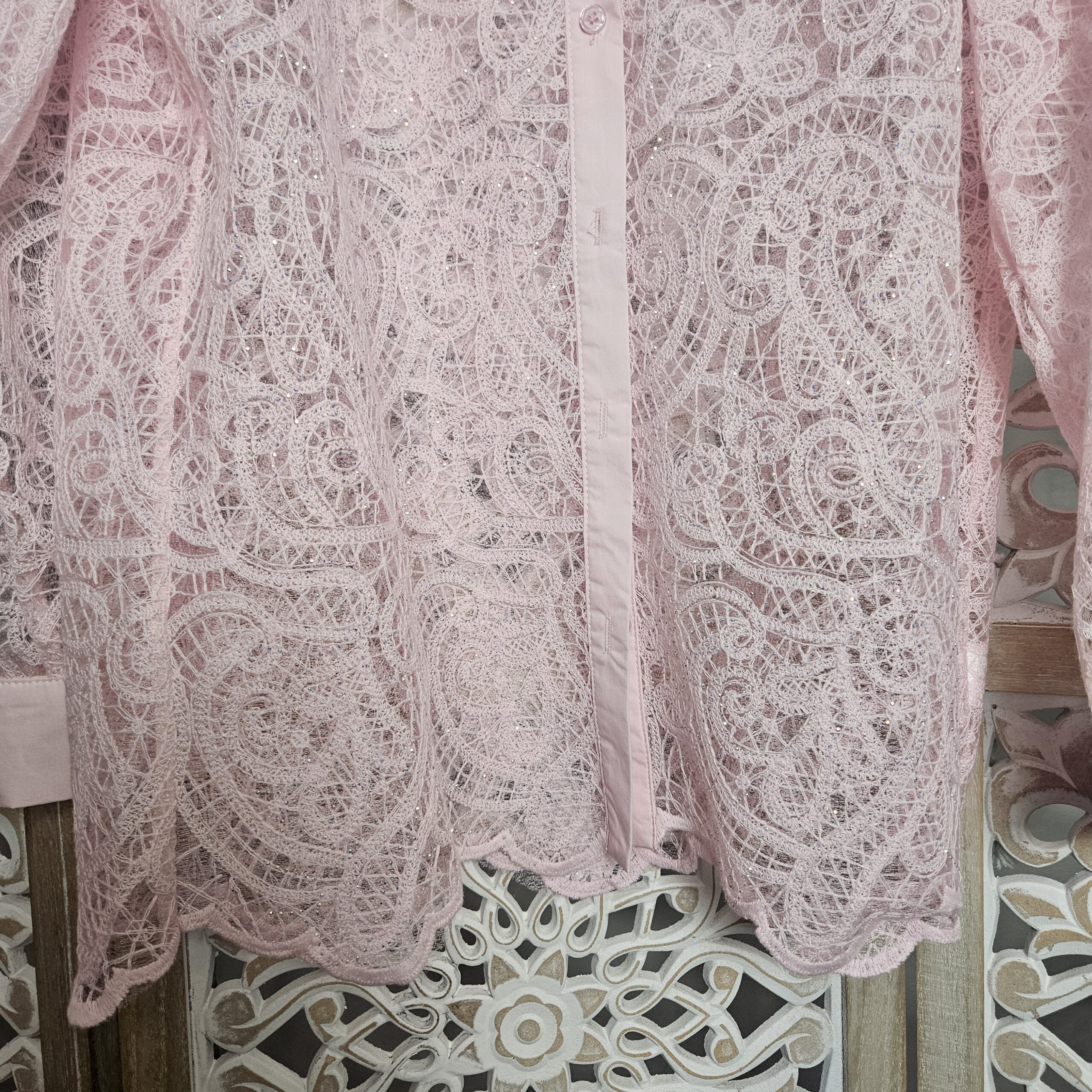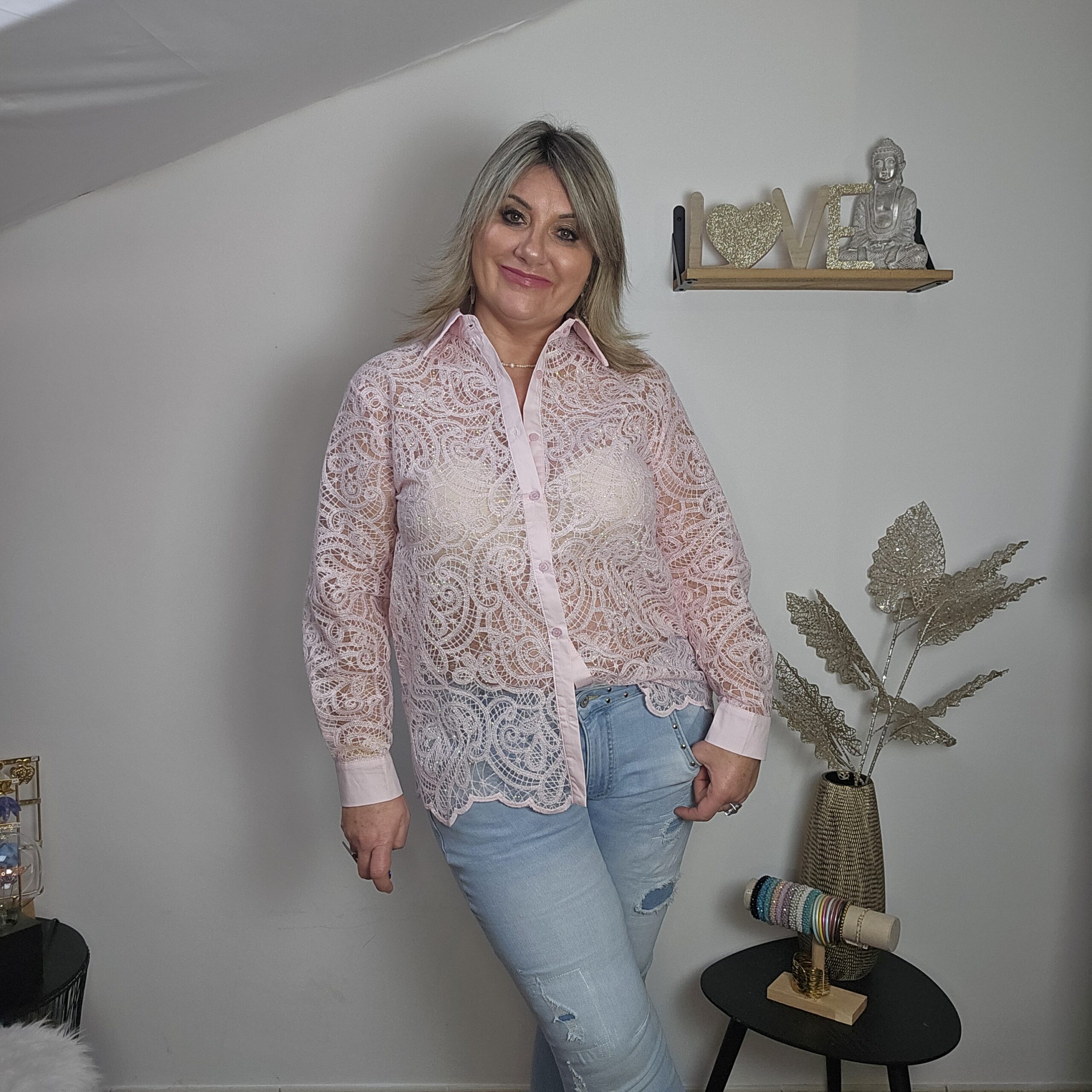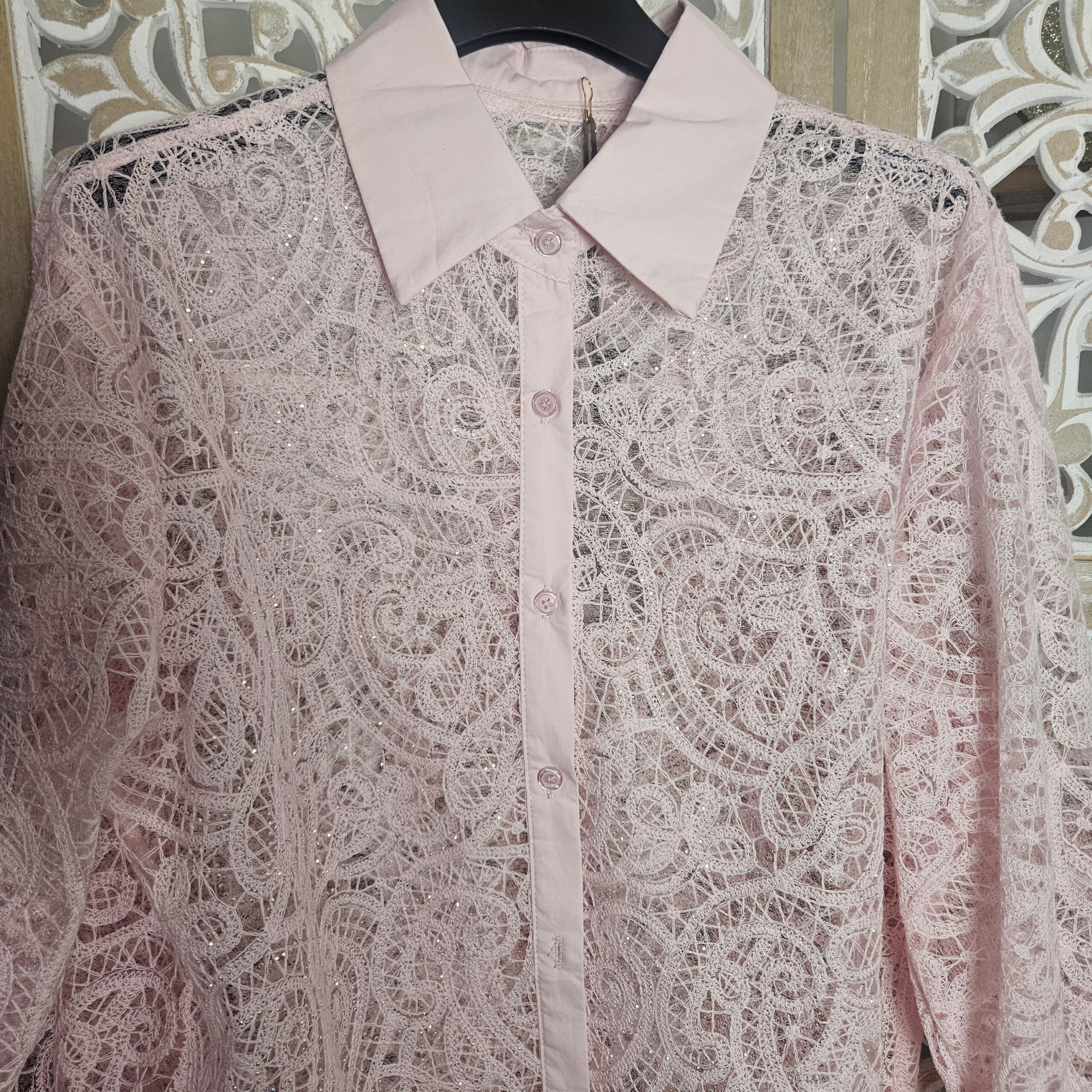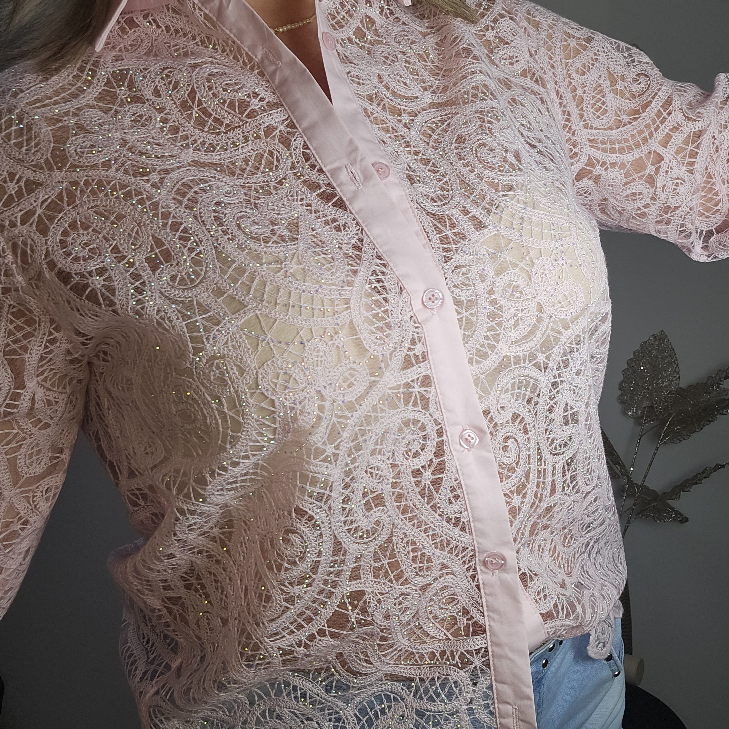 Chemise en dentelle avec des petits strass sur le devant. Col, bout des manches et boutonnière en tissu uni. Manches longues. Existe en blanc et rose clair. TU