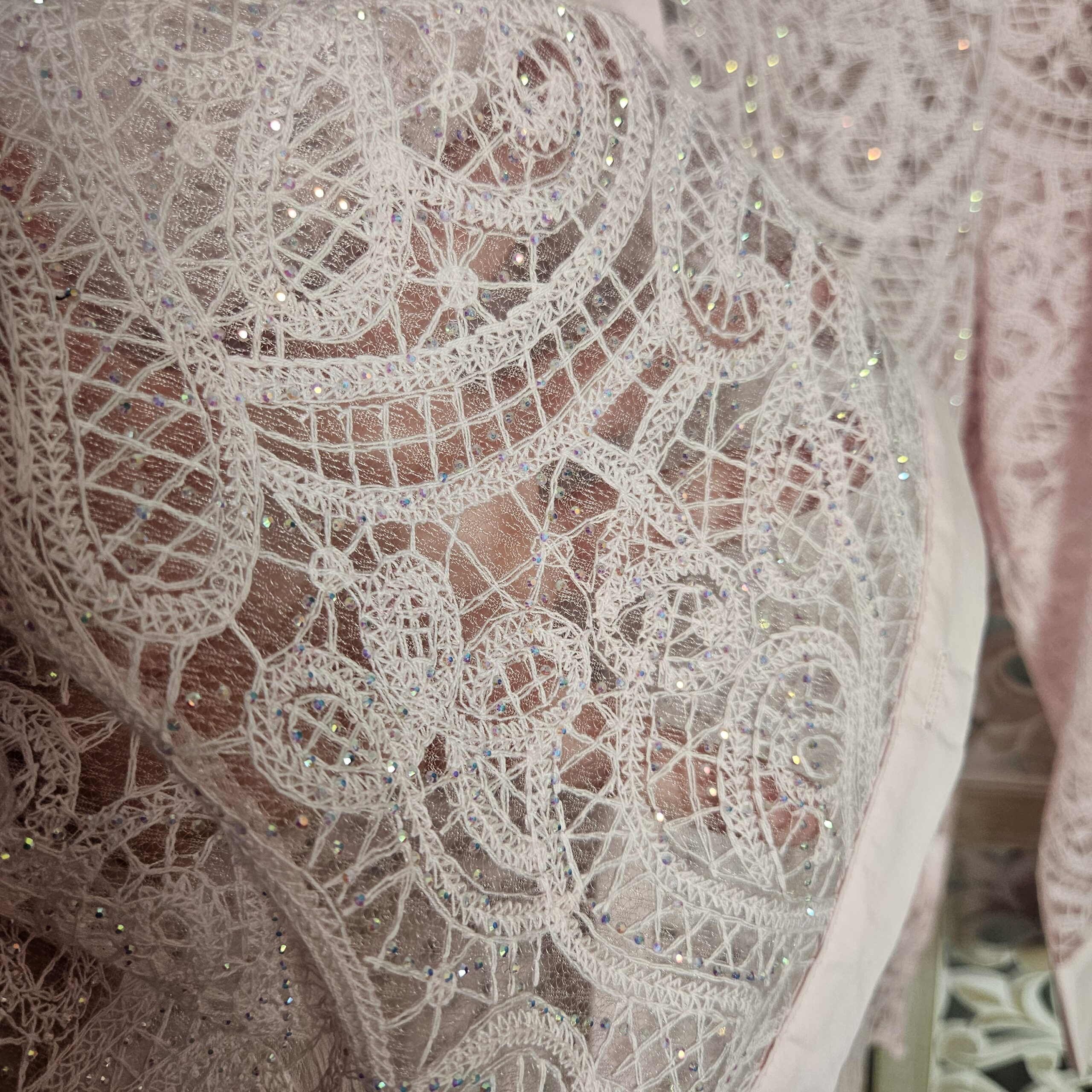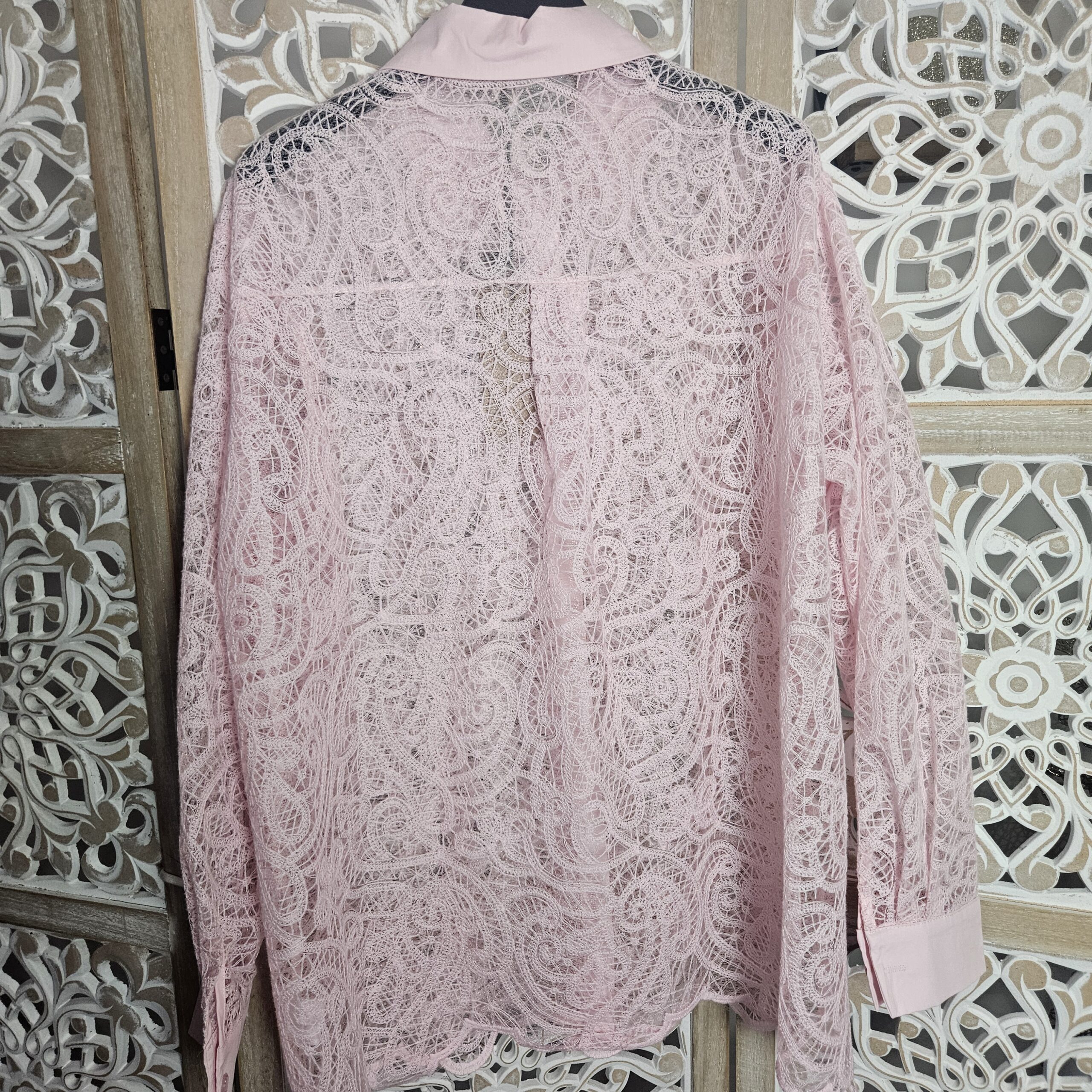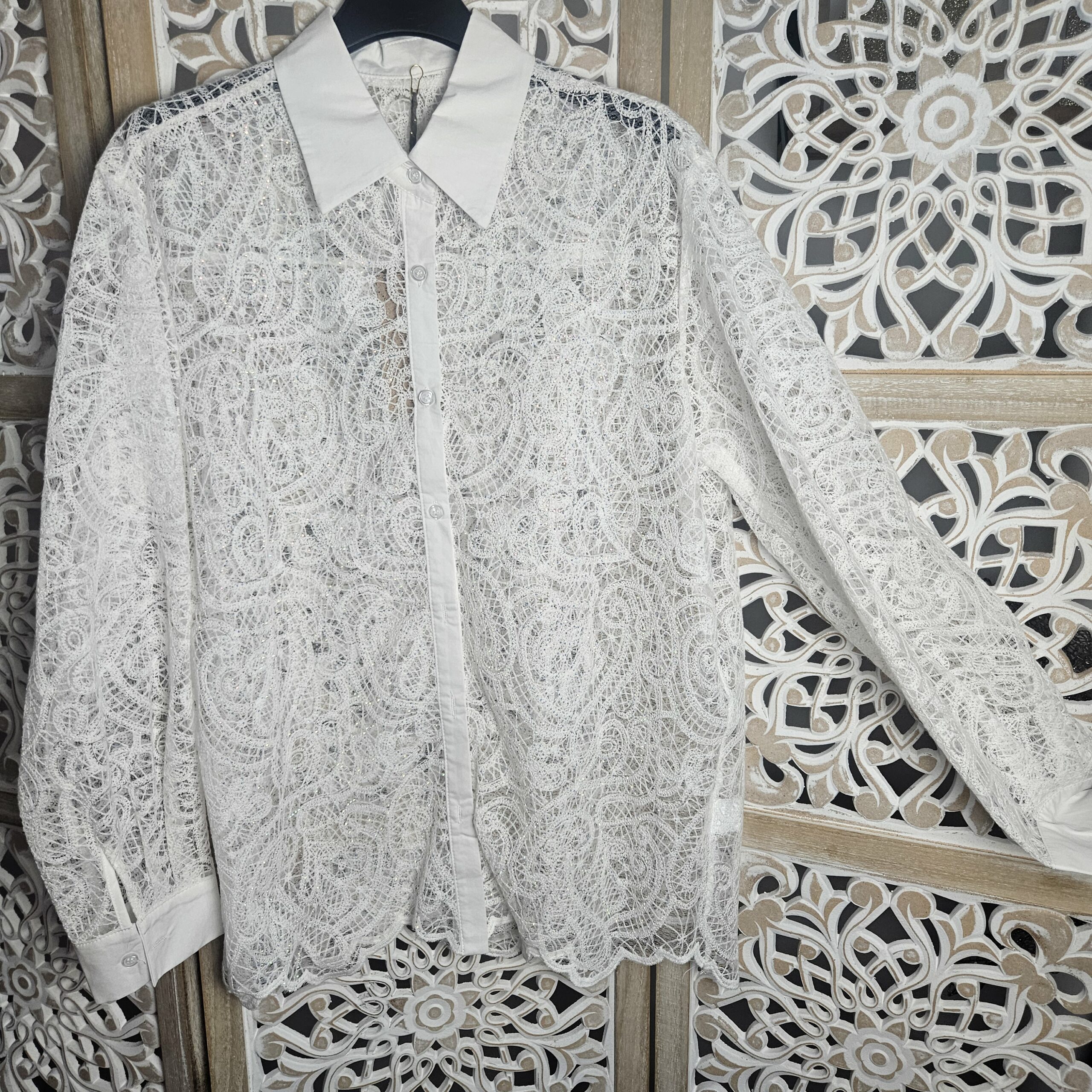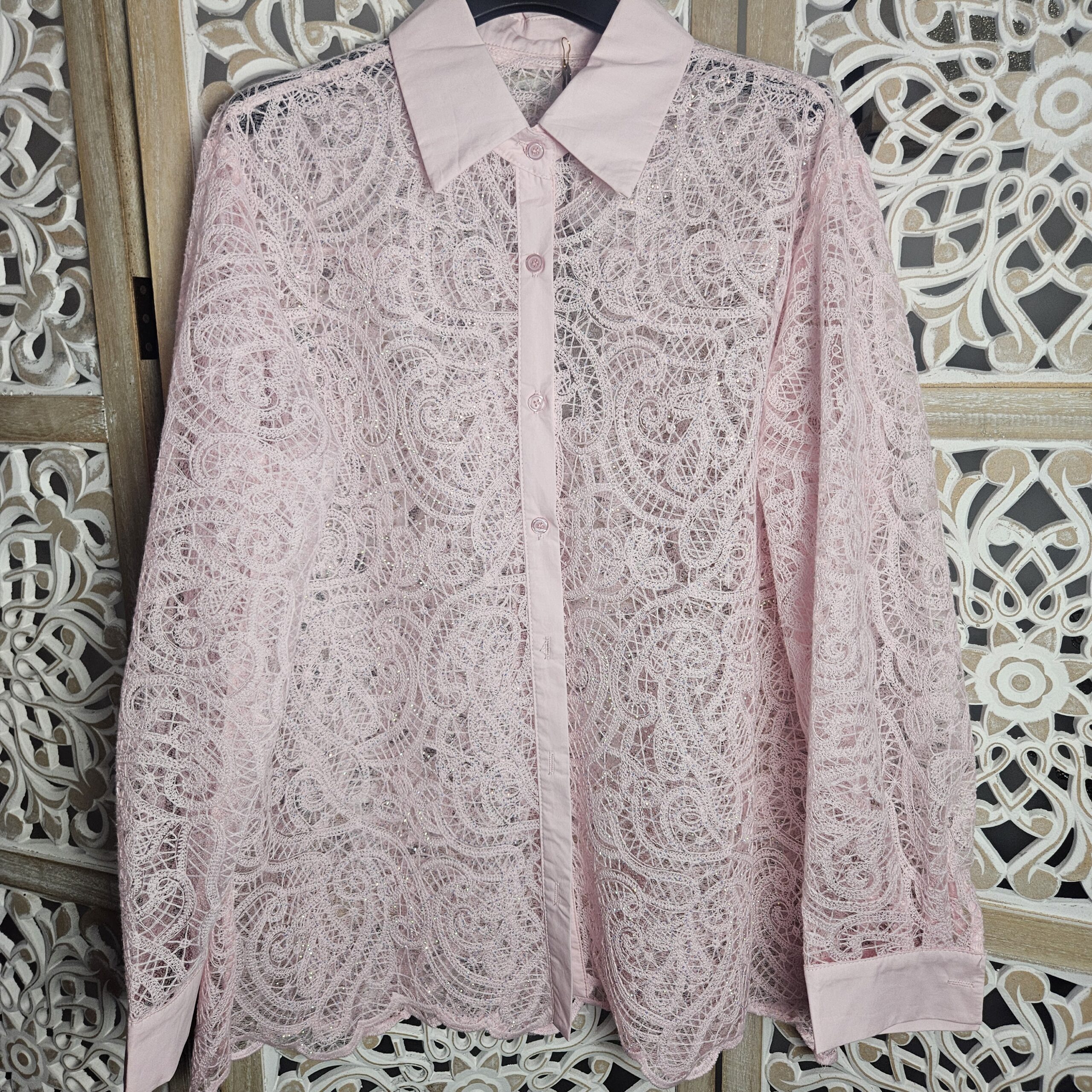 Chemise en dentelle avec des petits strass sur le devant. Col, bout des manches et boutonnière en tissu uni. Manches longues. Existe en blanc et rose clair. TU