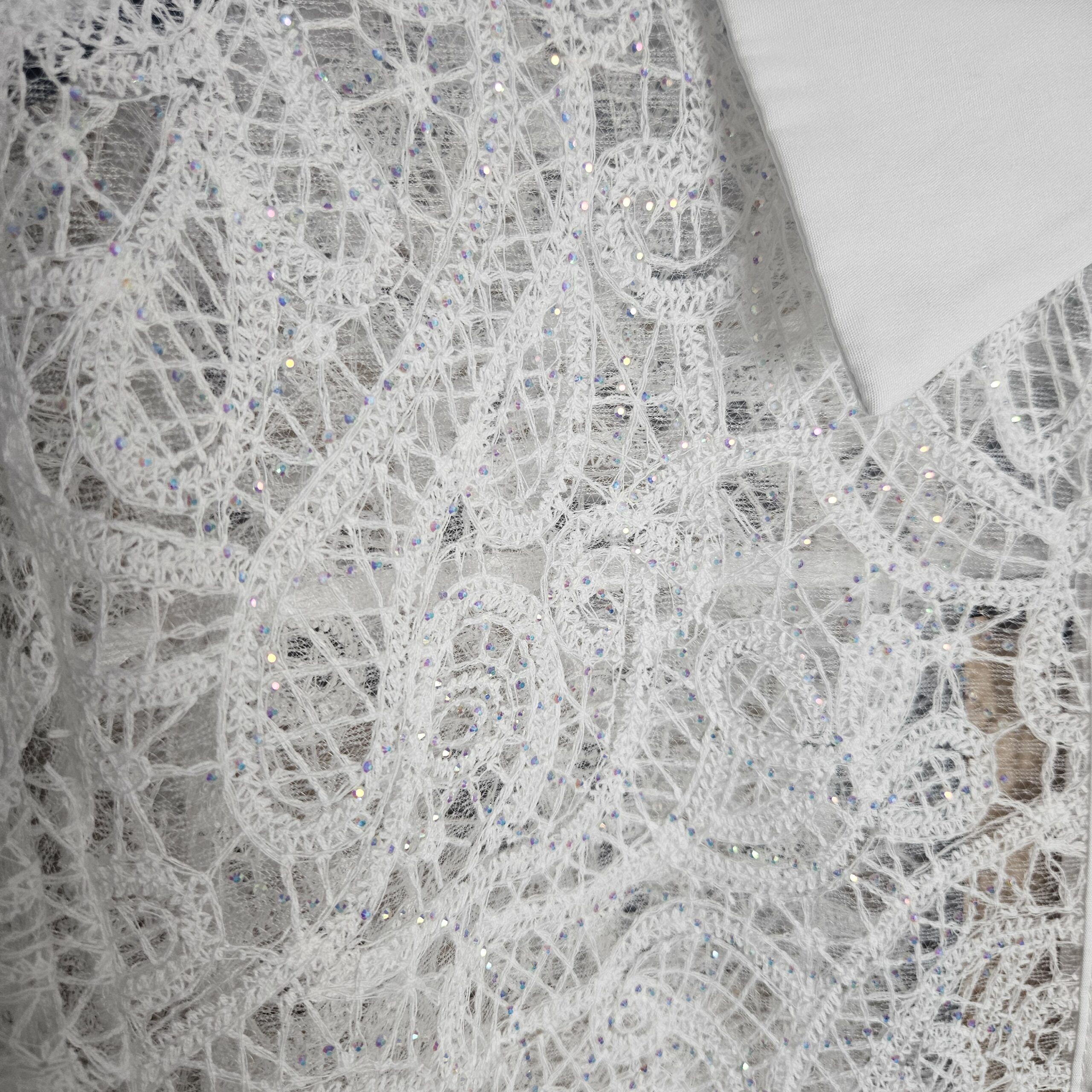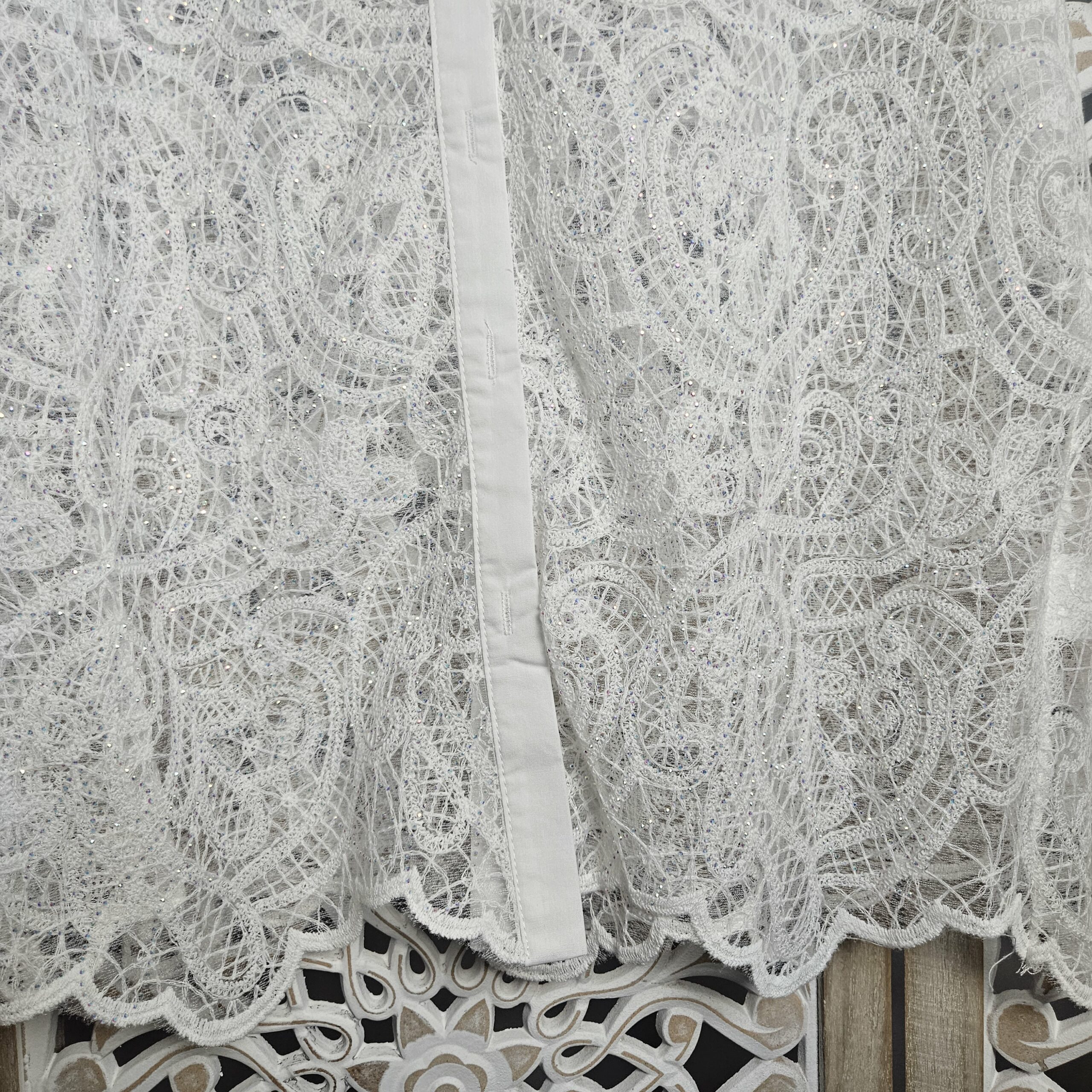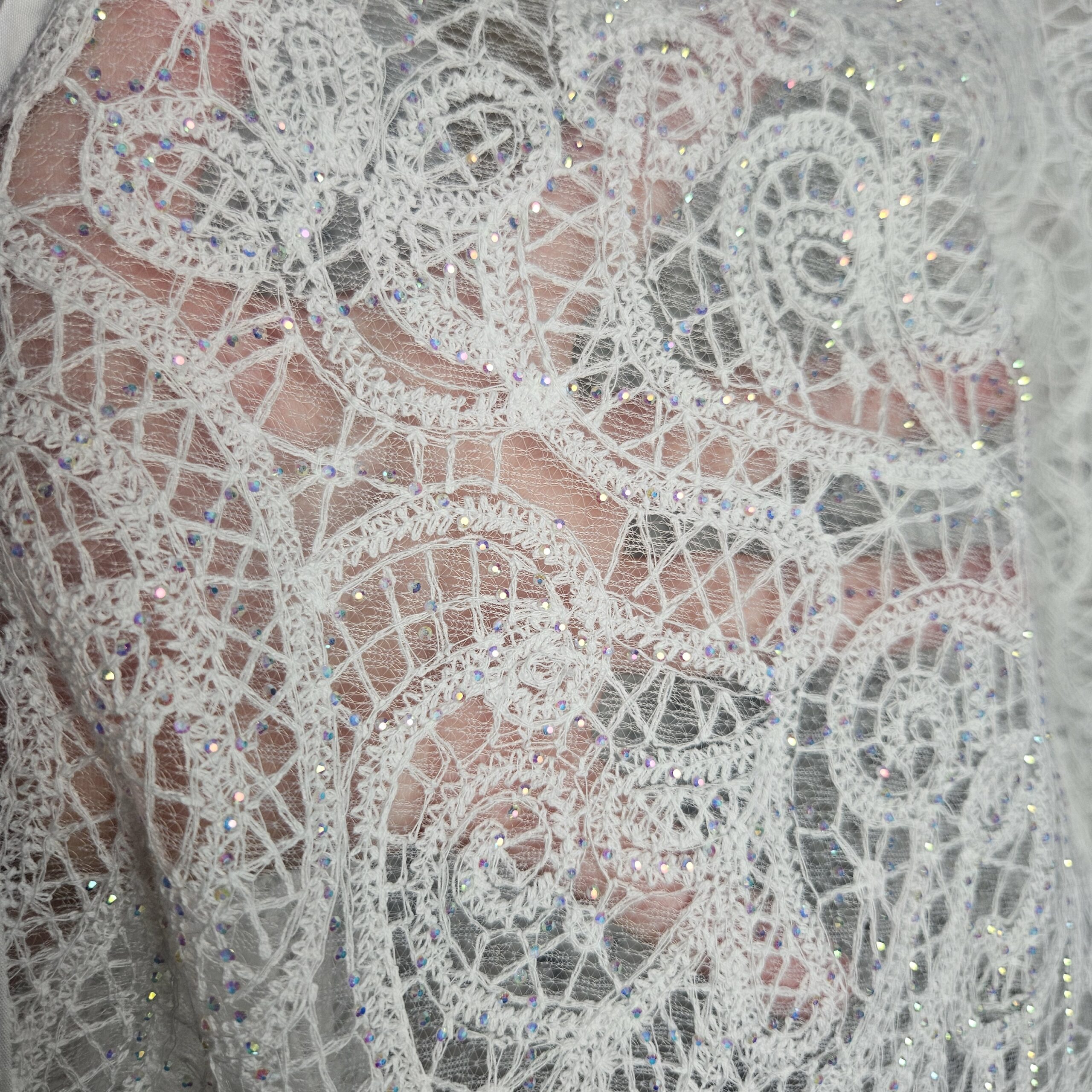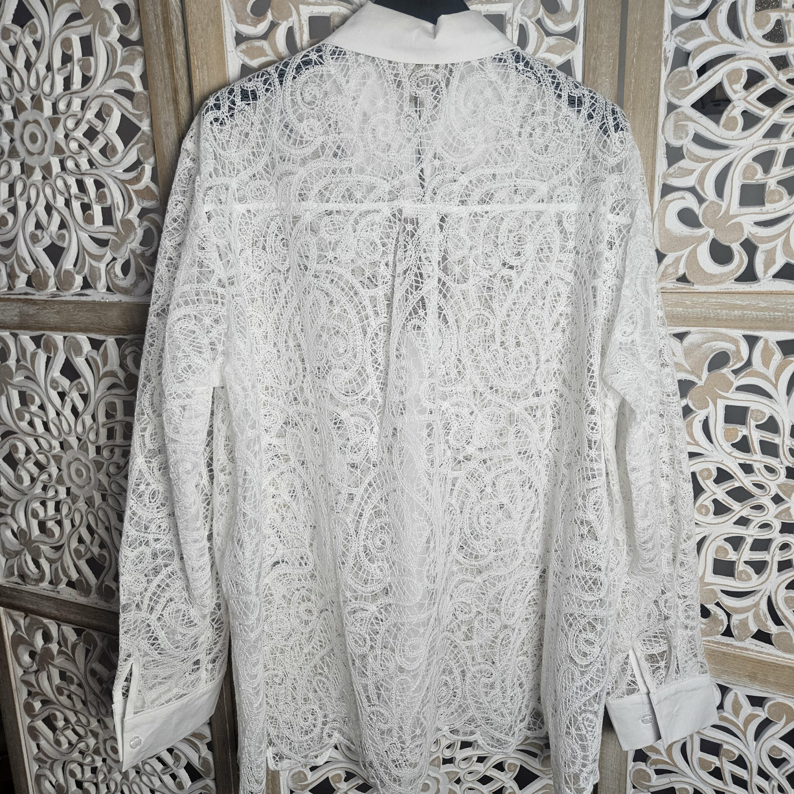 Chemise en dentelle avec des petits strass sur le devant. Col, bout des manches et boutonnière en tissu uni. Manches longues. Existe en blanc et rose clair. TU