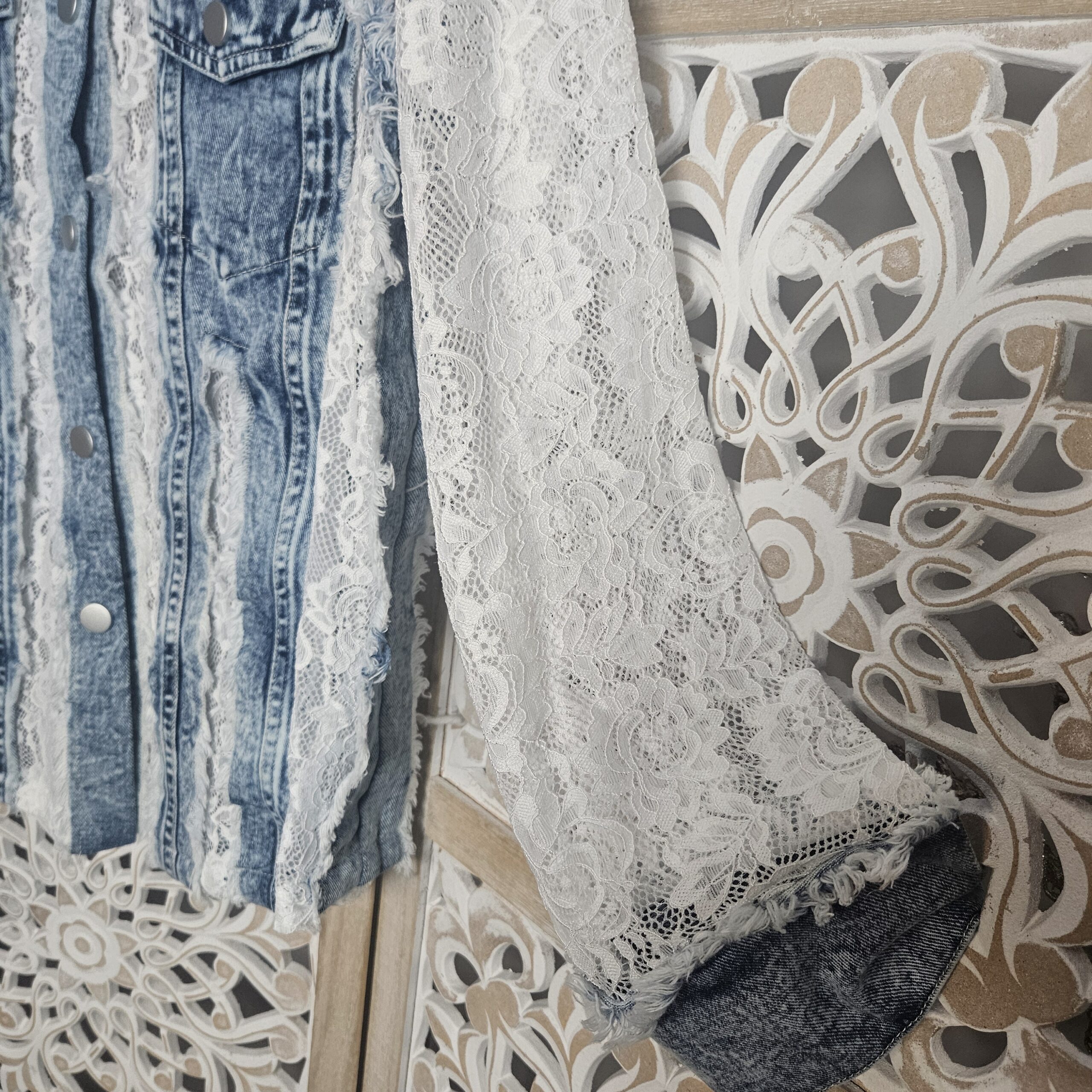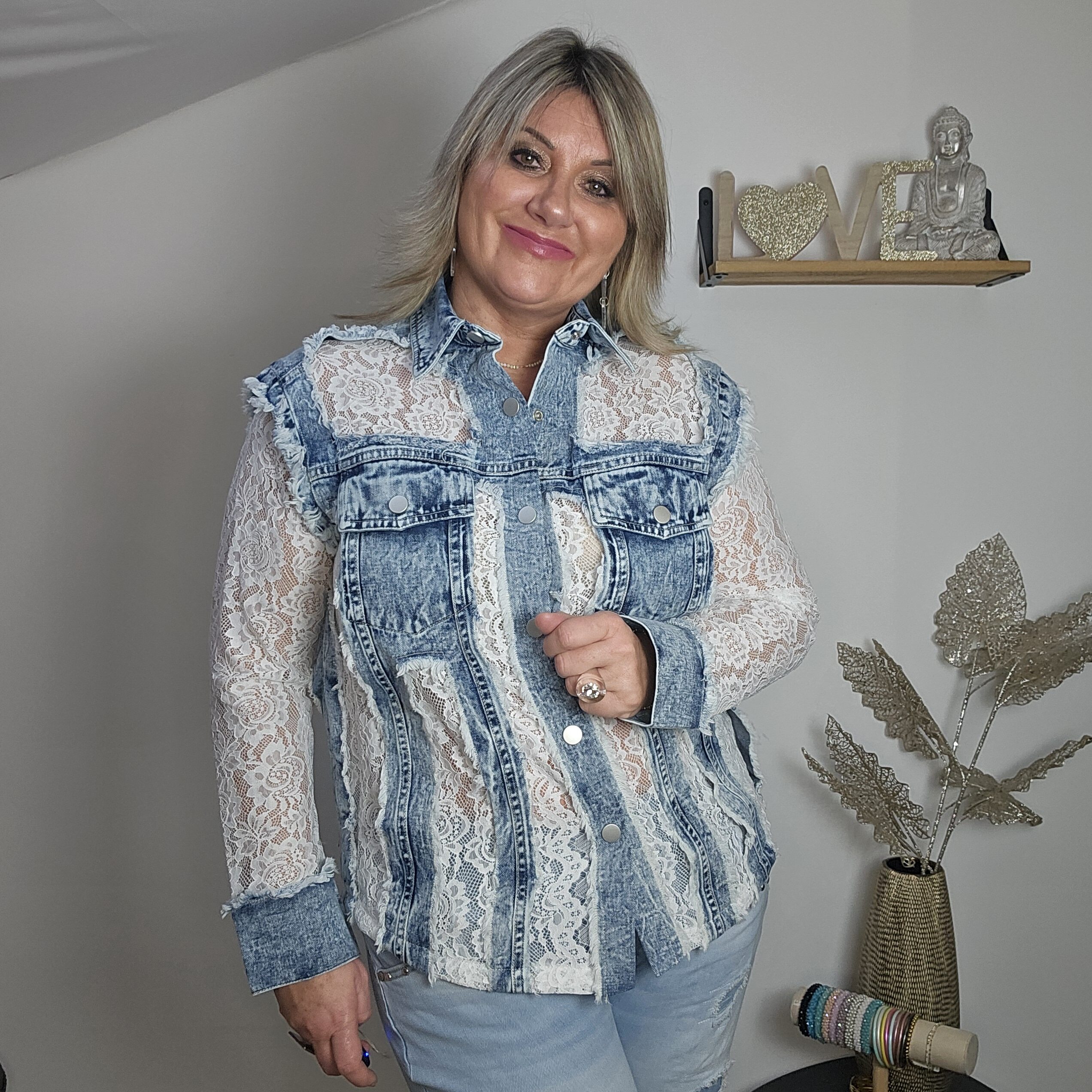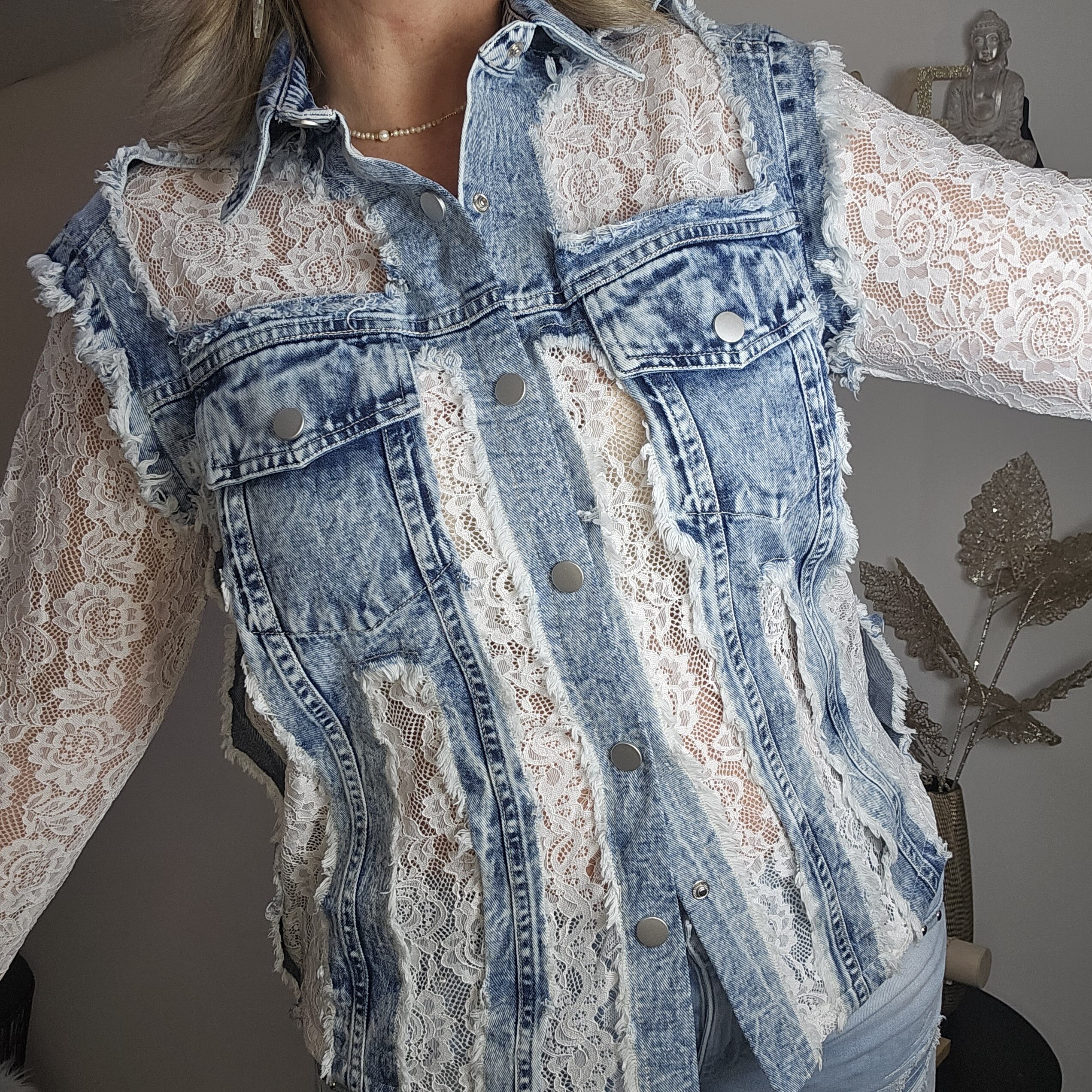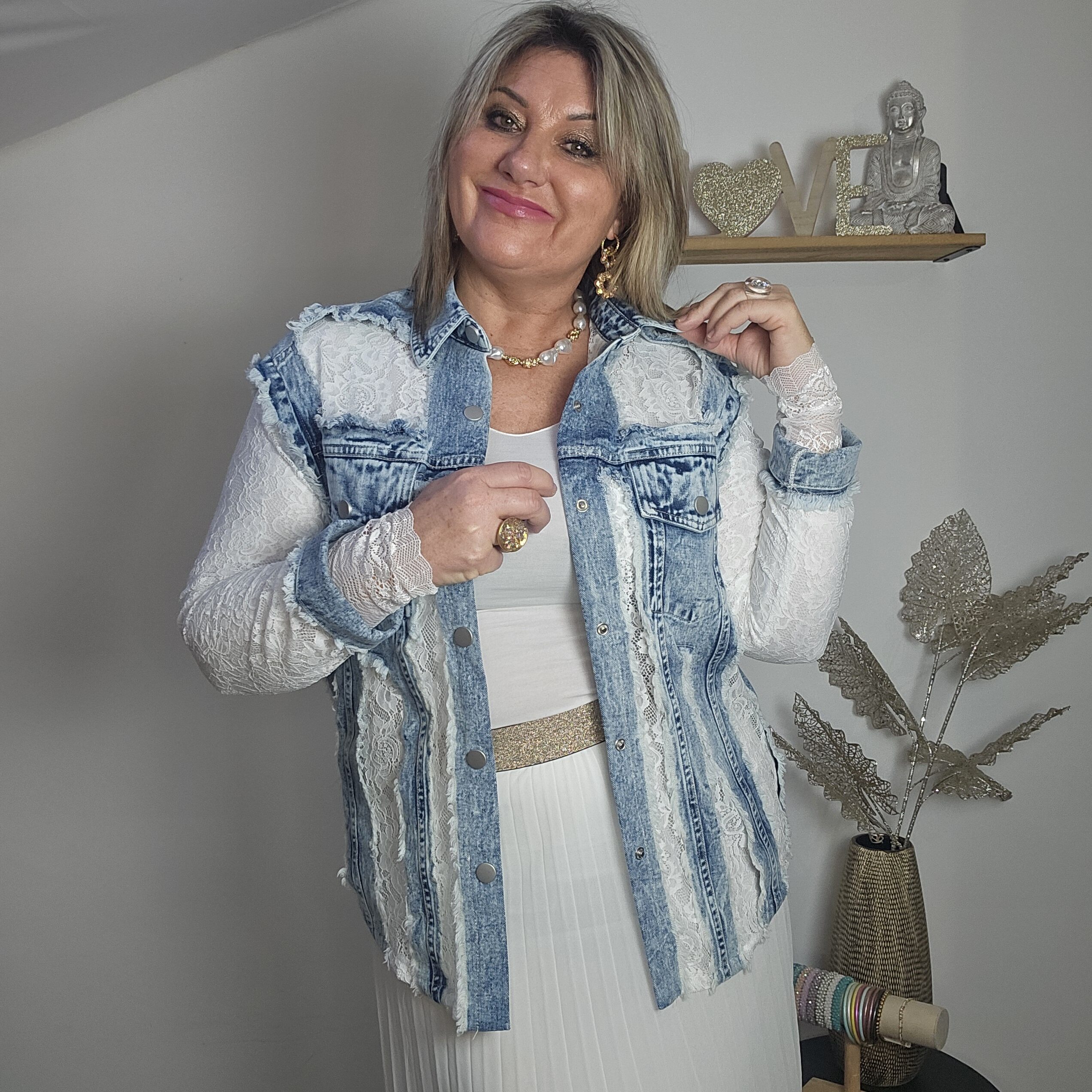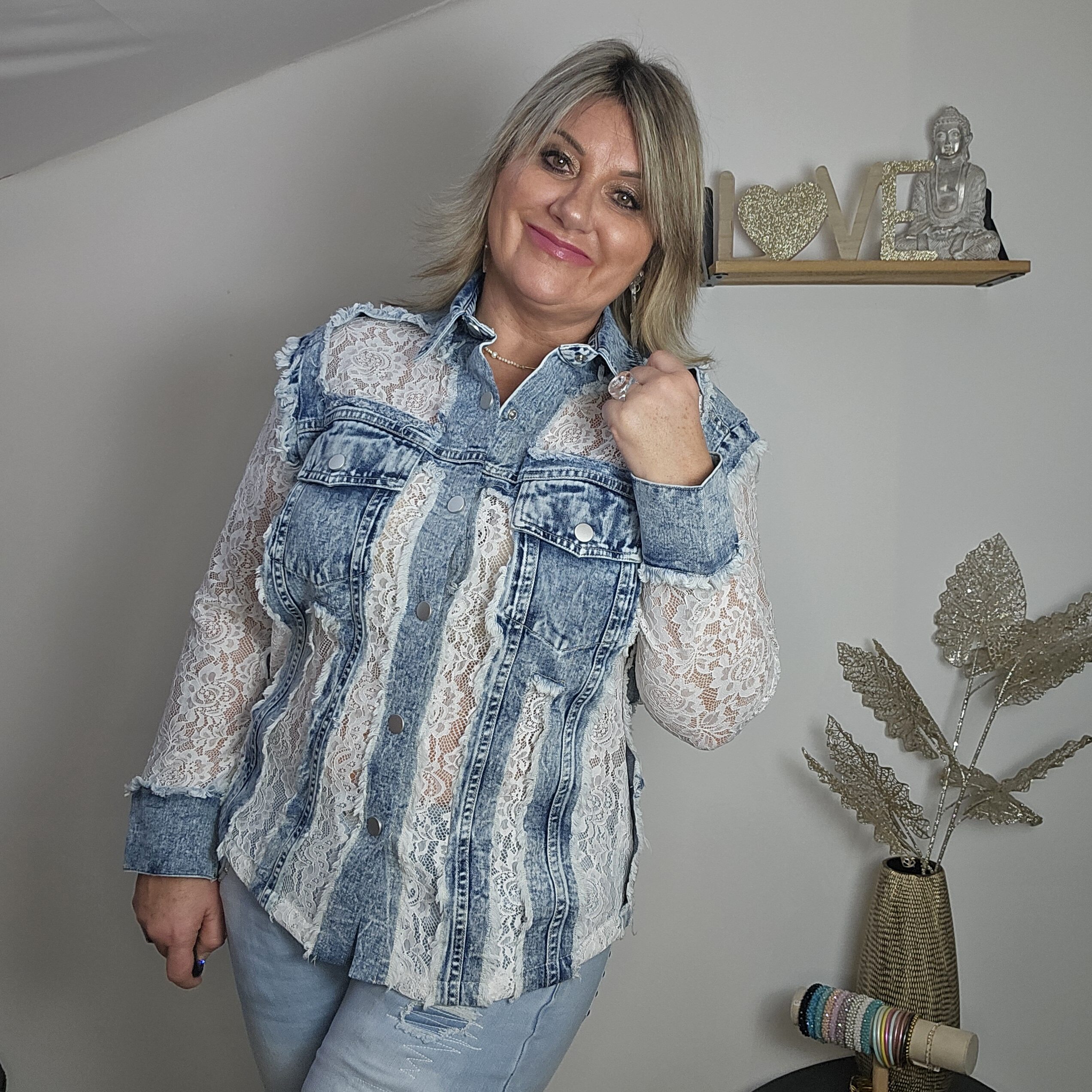 Mon regard pailleté : Magnifique chemise en jean et dentelle, une vraie perle ! Elle vous apporte un look frais et élégant pour ce printemps ! Peut se porter en veste, avec un jean ou une jupe blanche.