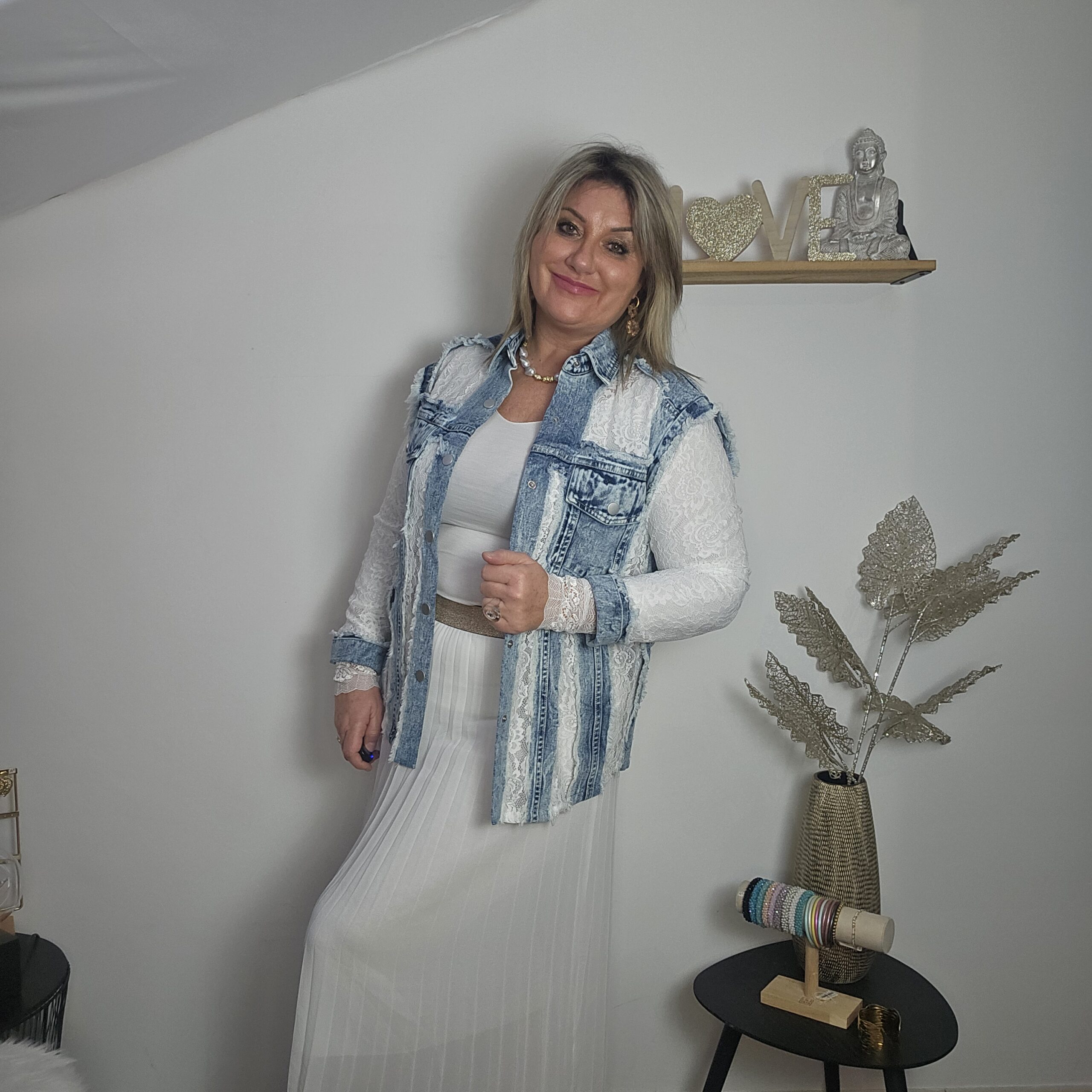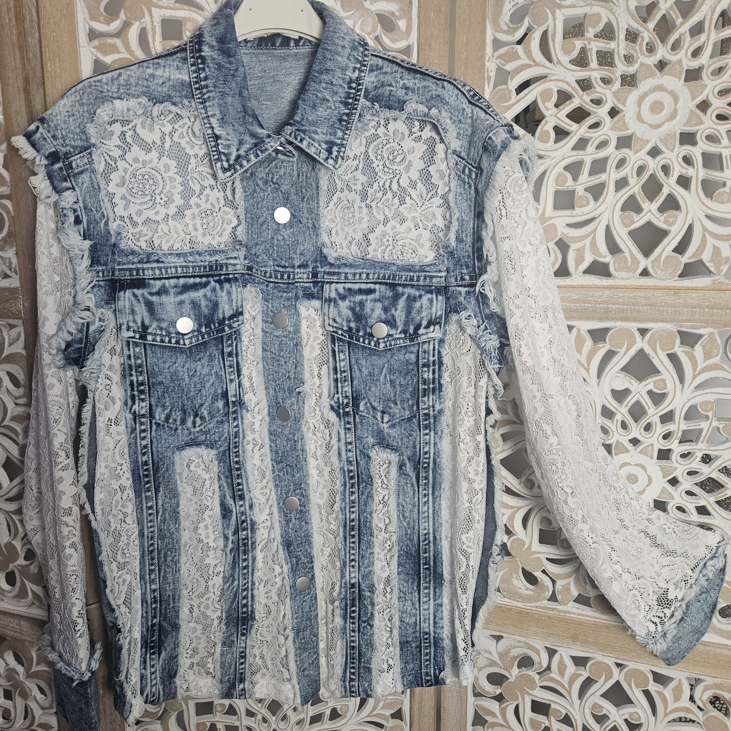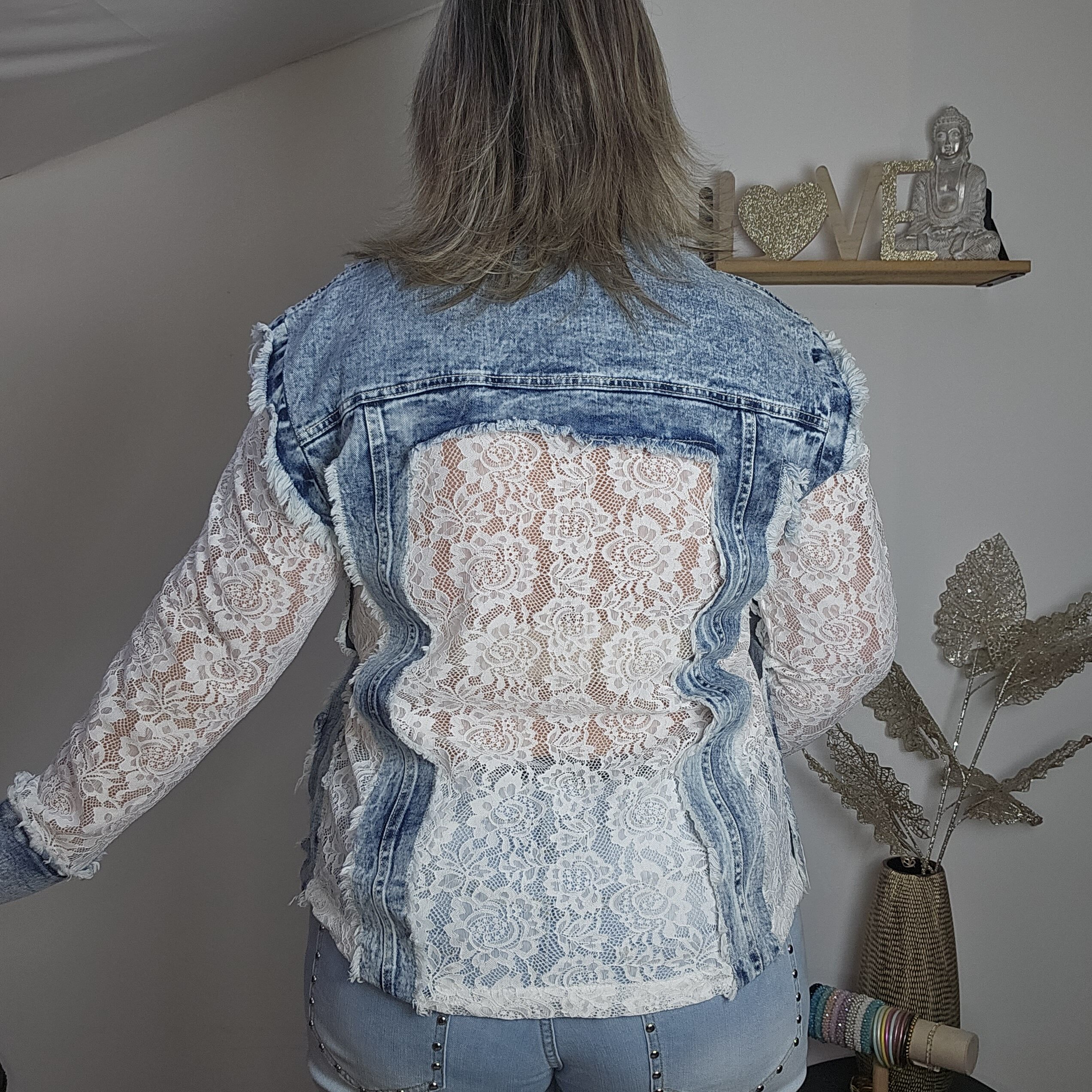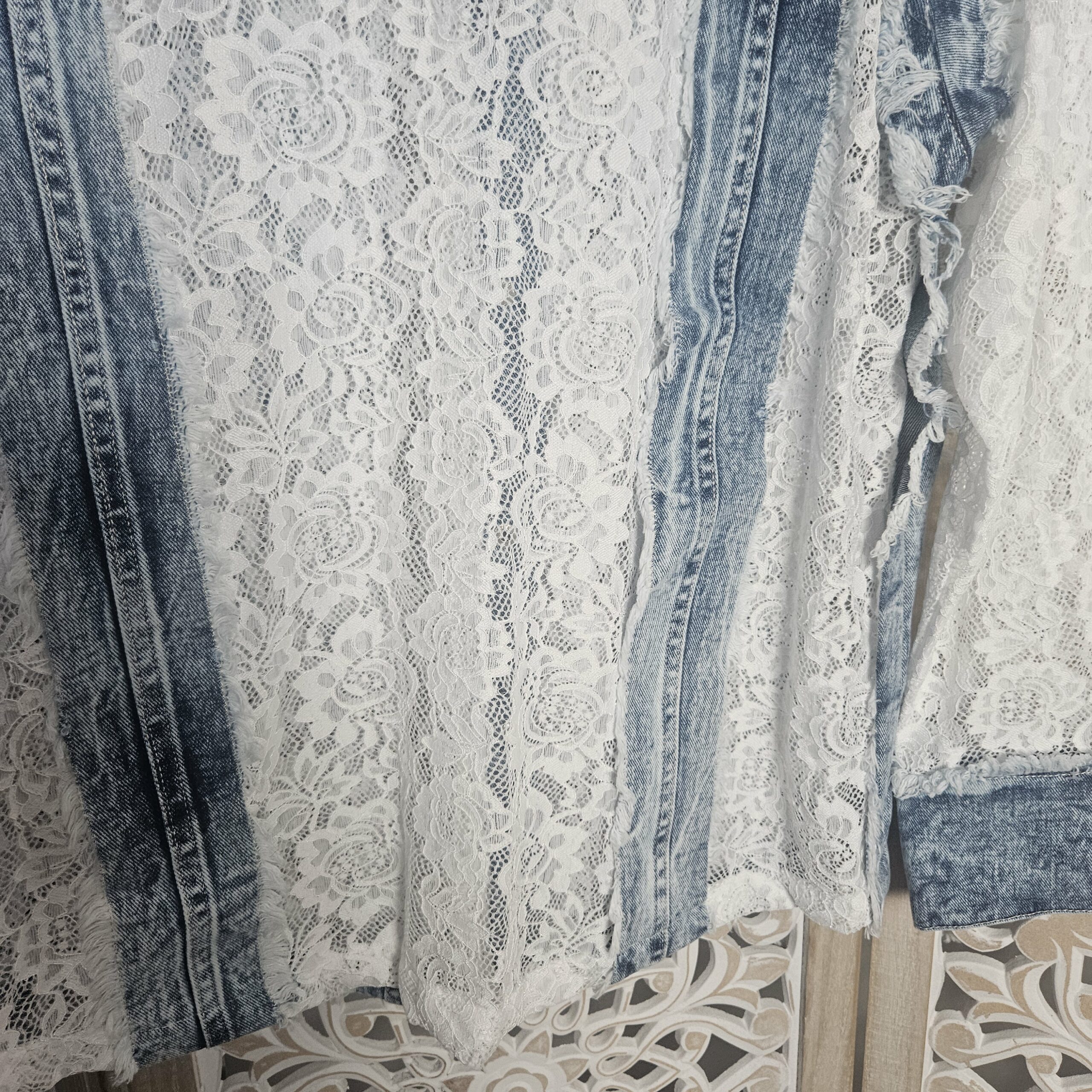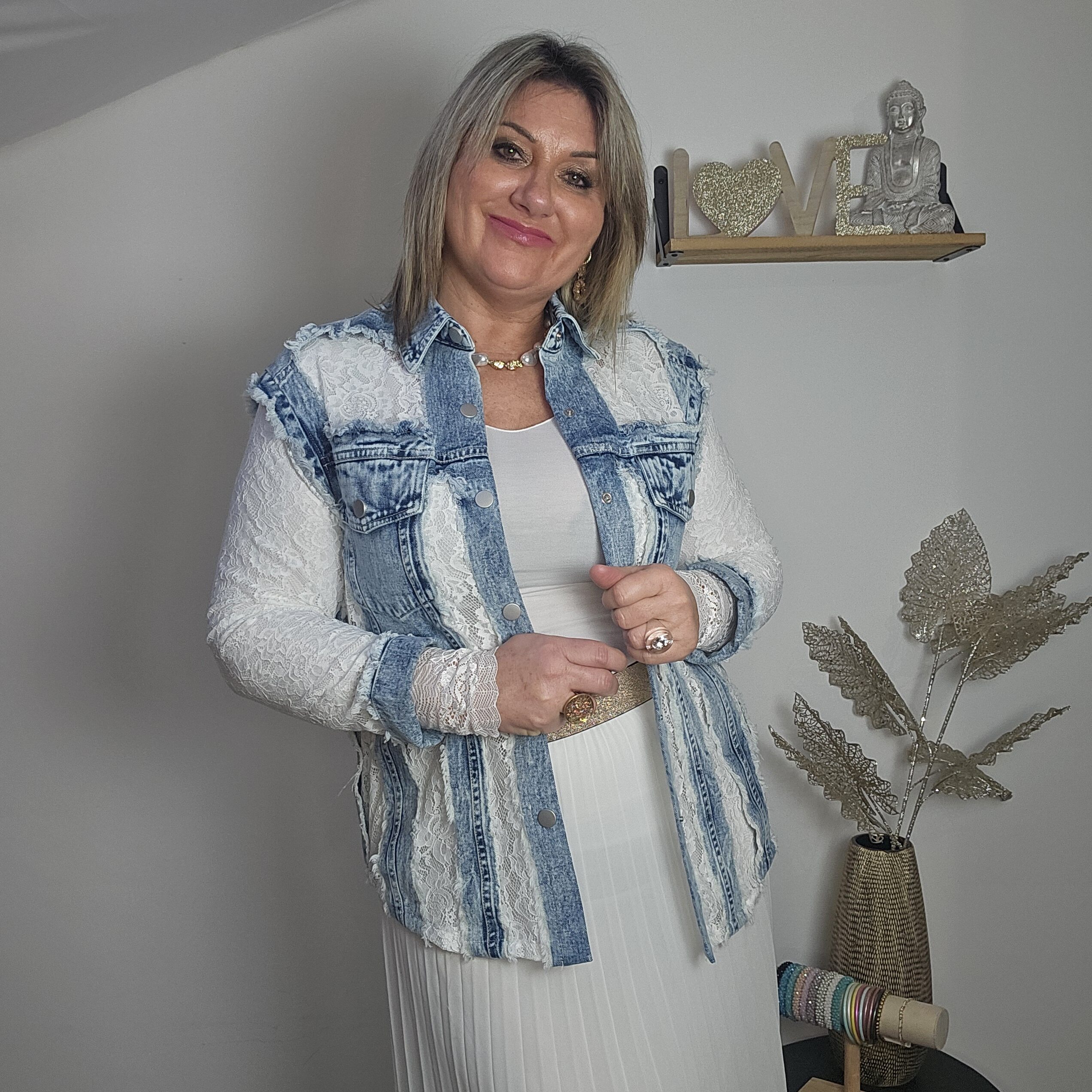 Mon regard pailleté : Magnifique chemise en jean et dentelle, une vraie perle ! Elle vous apporte un look frais et élégant pour ce printemps ! Peut se porter en veste, avec un jean ou une jupe blanche.
