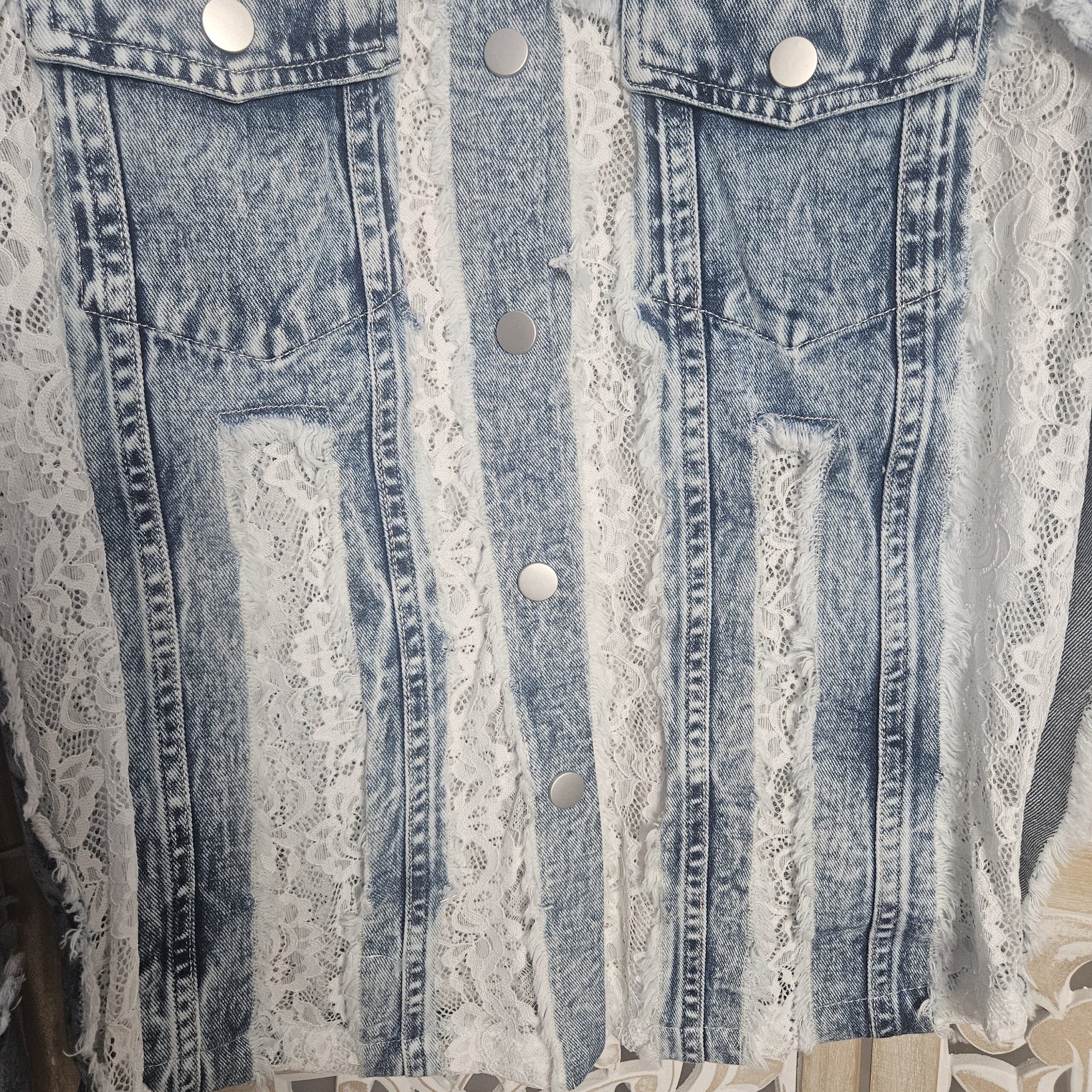Chemise en jean avec des alternances de dentelle blanche, manches longues, 2 poches sur la poitrine. Arrondit sur les côtés. Boutons pressions. Coupe cintrée et confortable pour un look frais et élégant. Peut être également portée en veste. TU