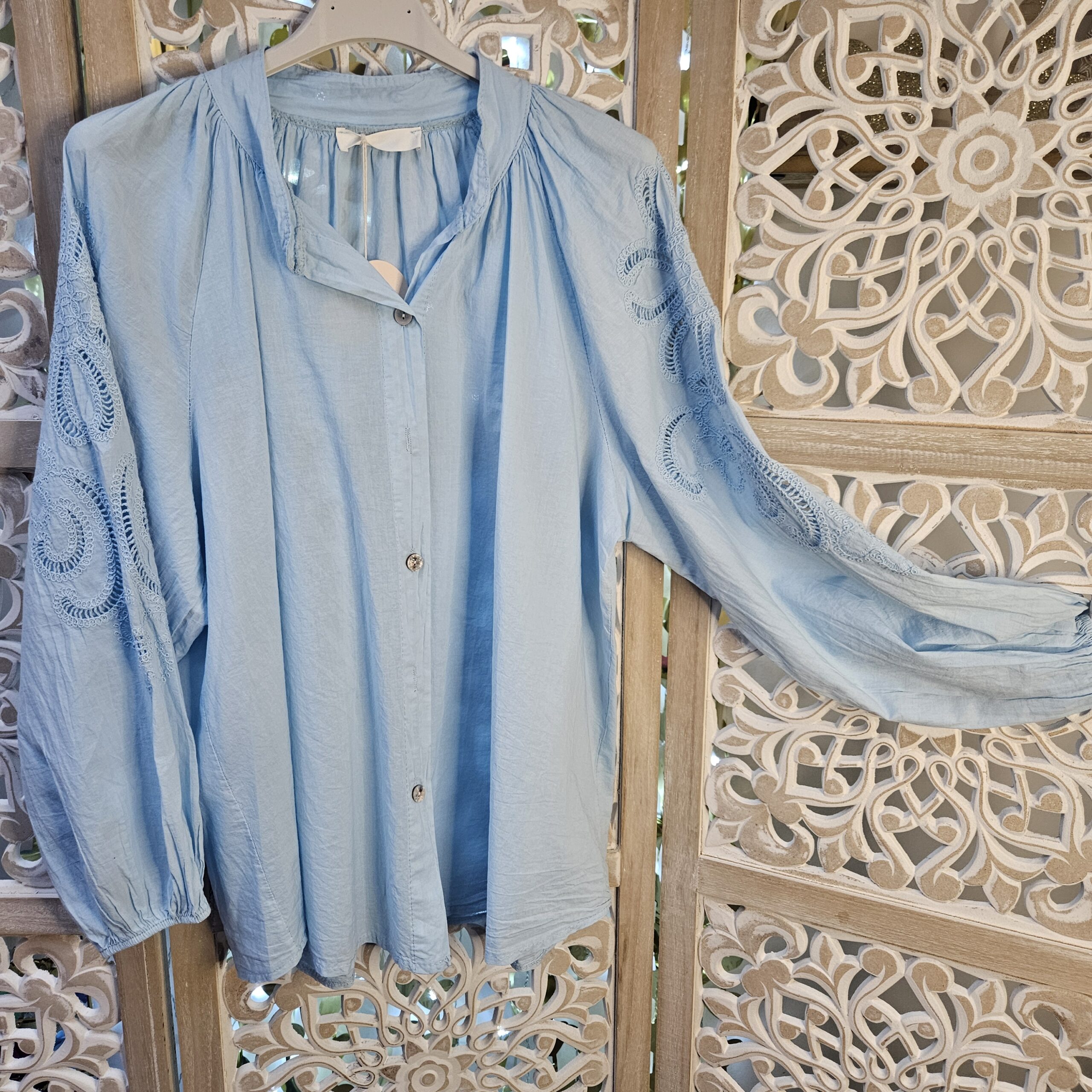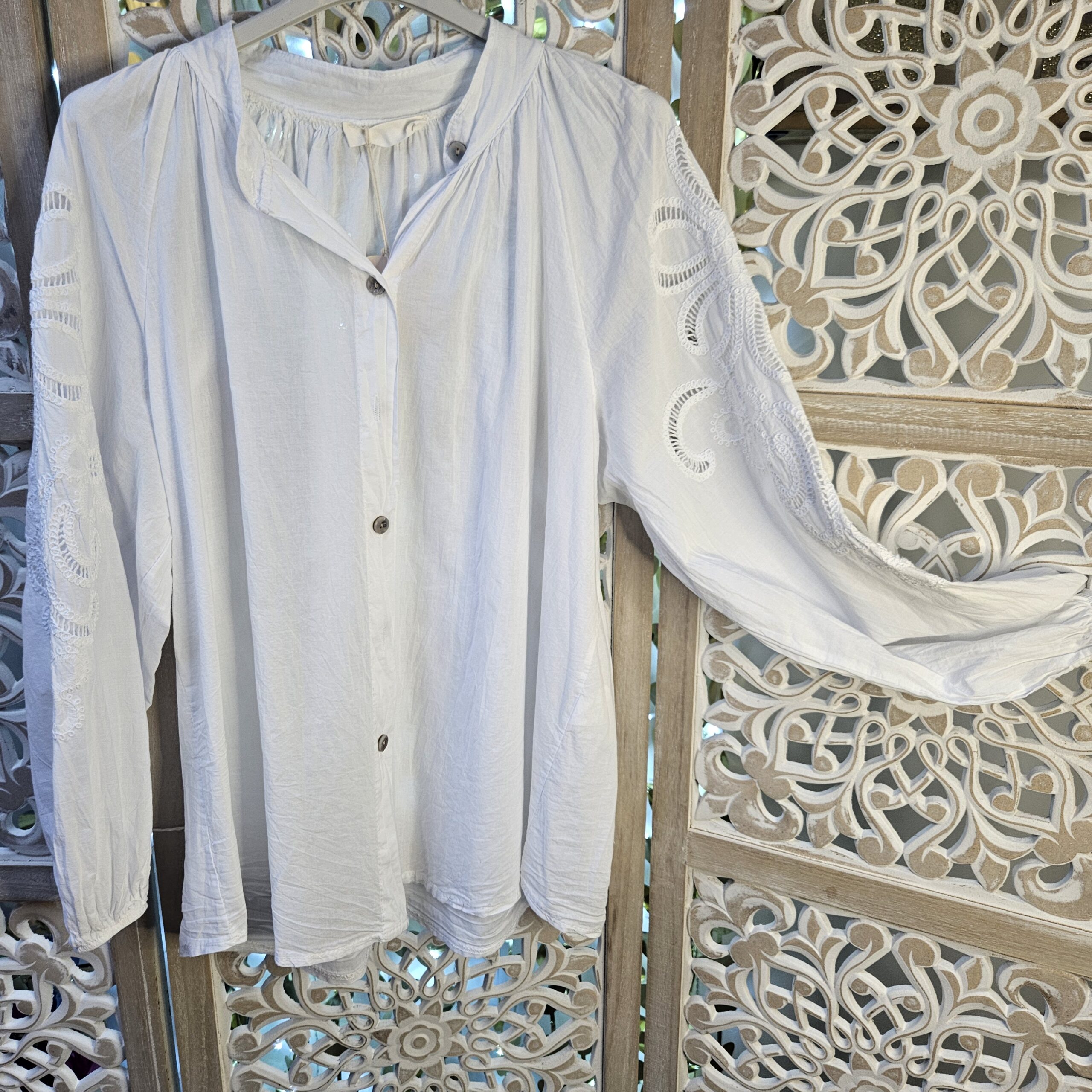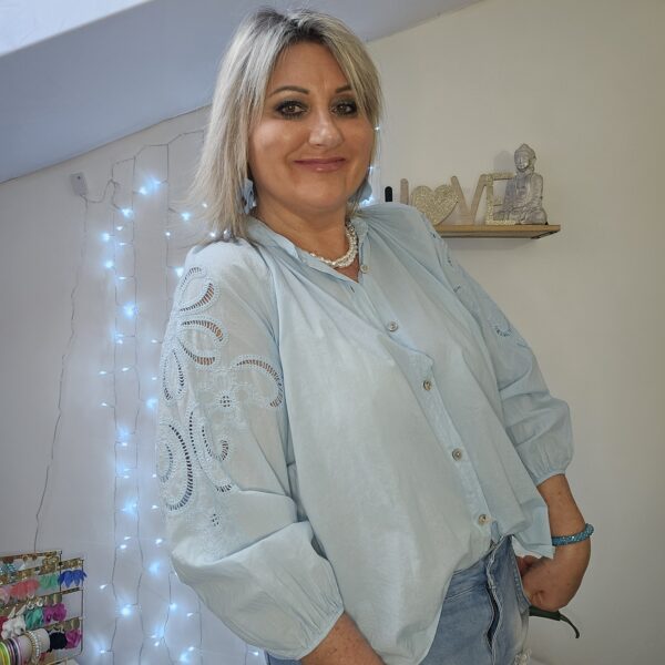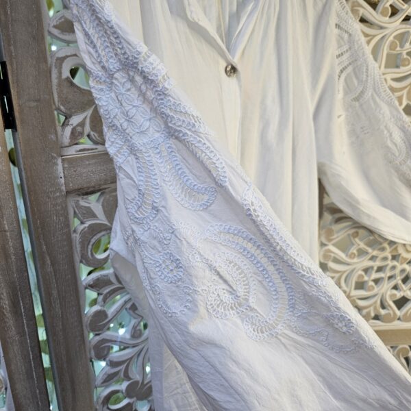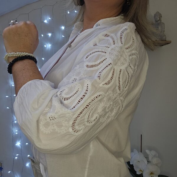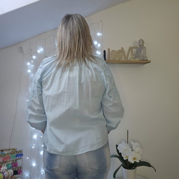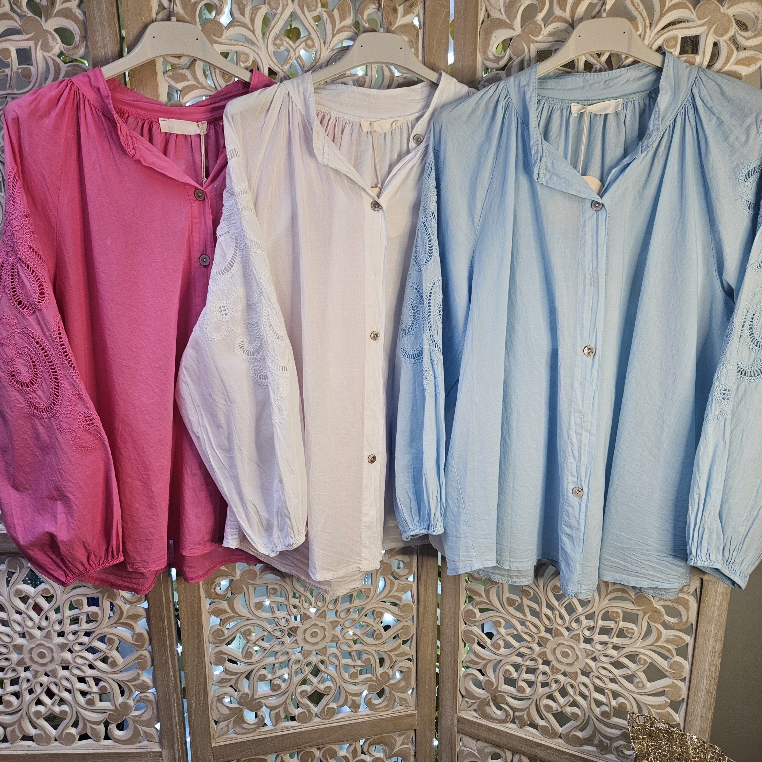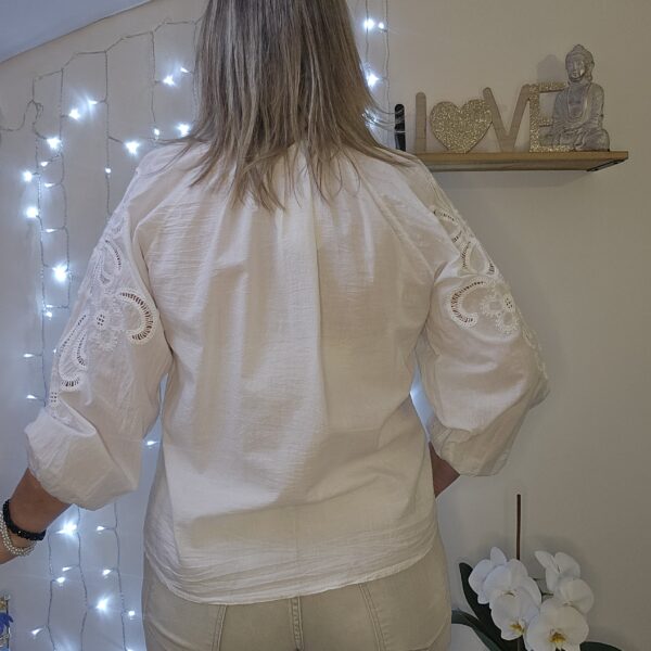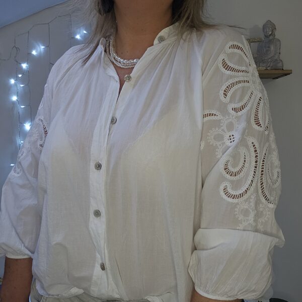 Chemise col officier, sur les manches des fleurs sont brodées, manches 3/4 type « ballon », élastique au bout. Coupe droite au niveau du buste. En bas arrondit. Existe en blanc, bleu ciel et fuchsia. TU.