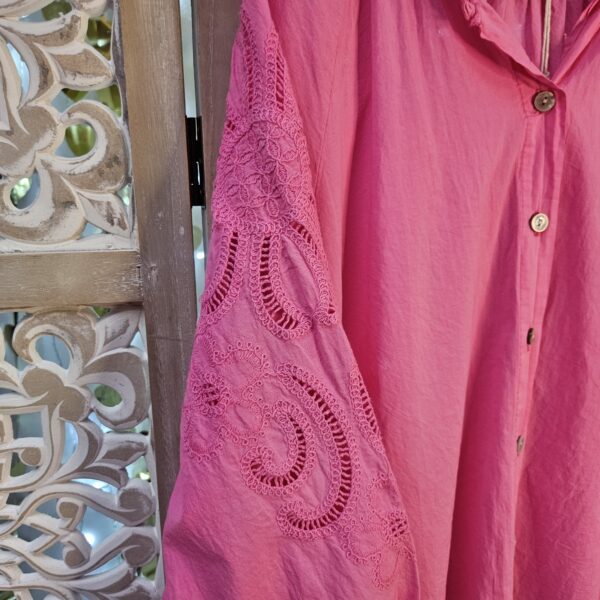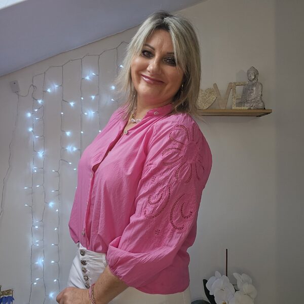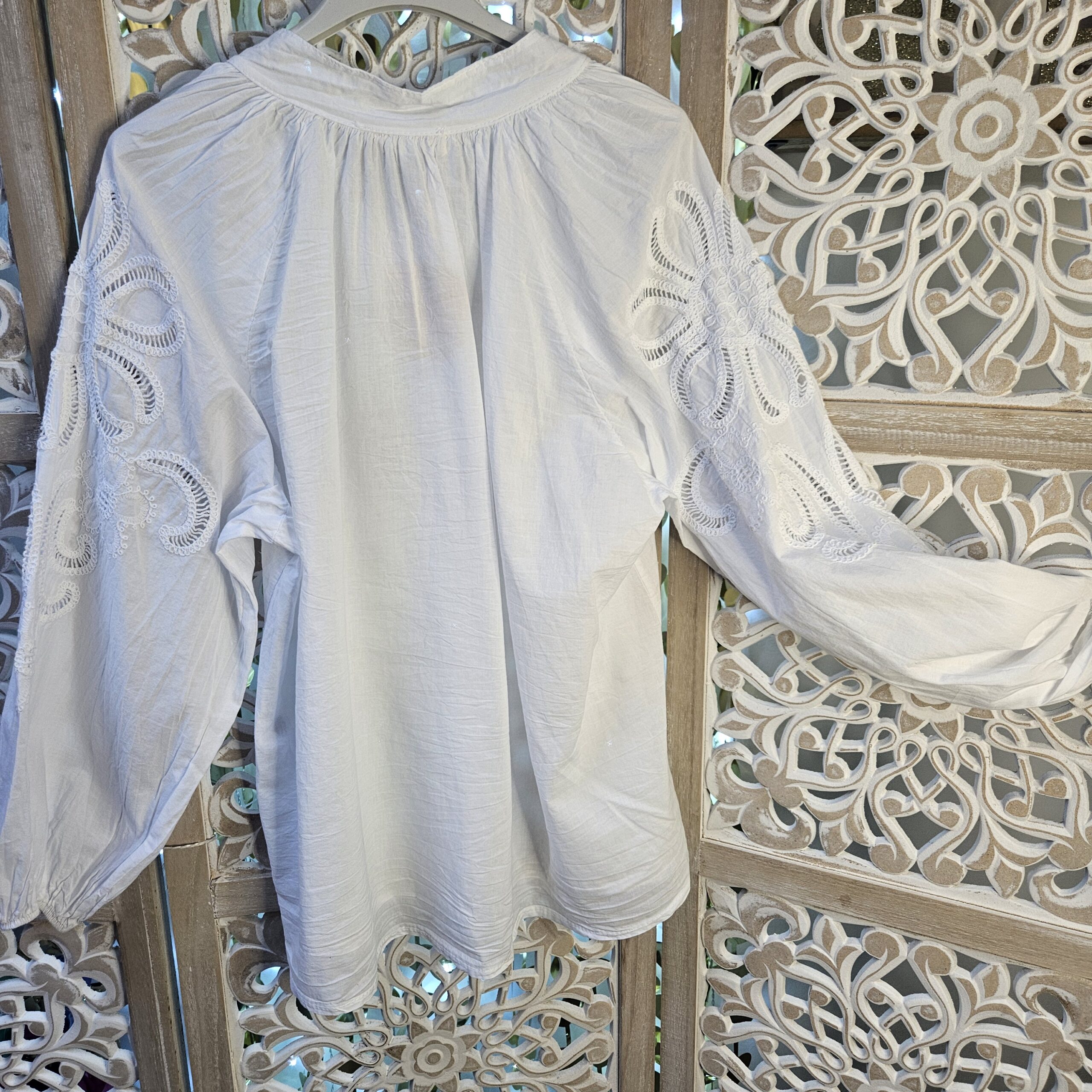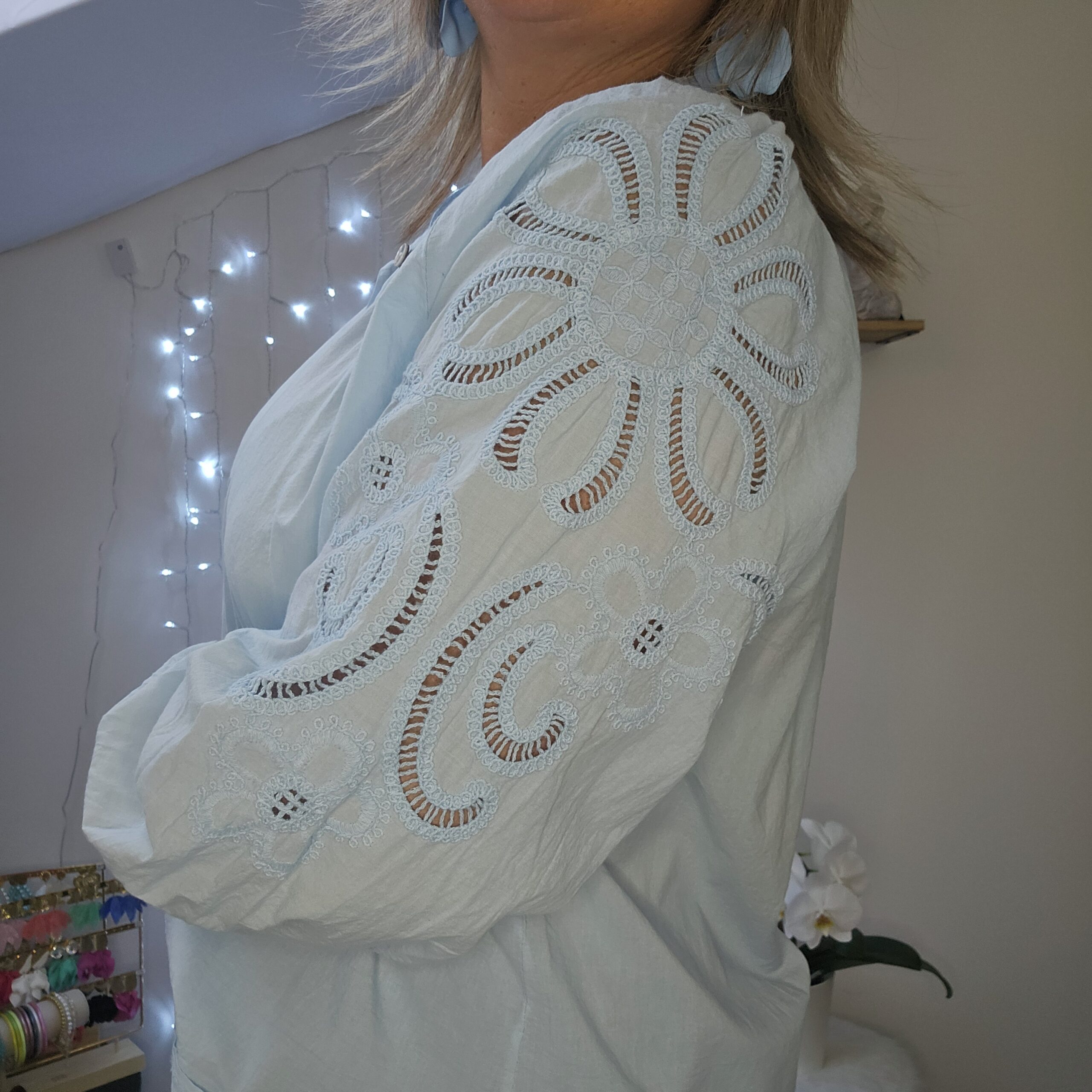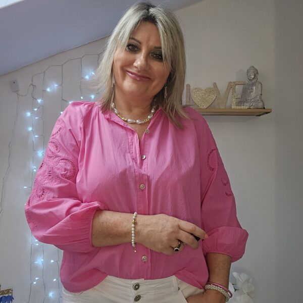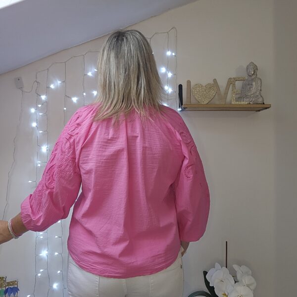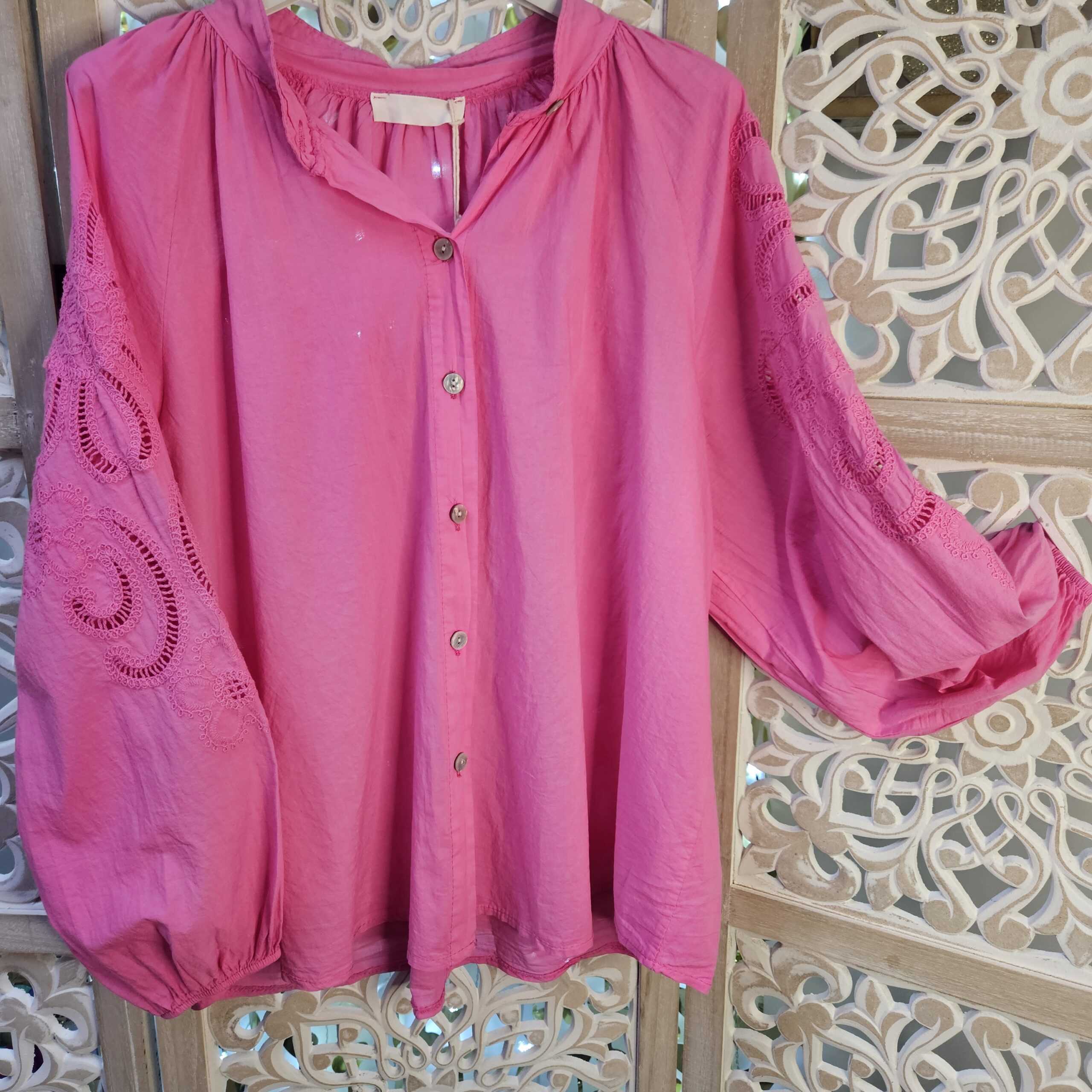 Chemise col officier, sur les manches des fleurs sont brodées, manches 3/4 type « ballon », élastique au bout. Coupe droite au niveau du buste. En bas arrondit. Existe en blanc, bleu ciel et fuchsia. TU.