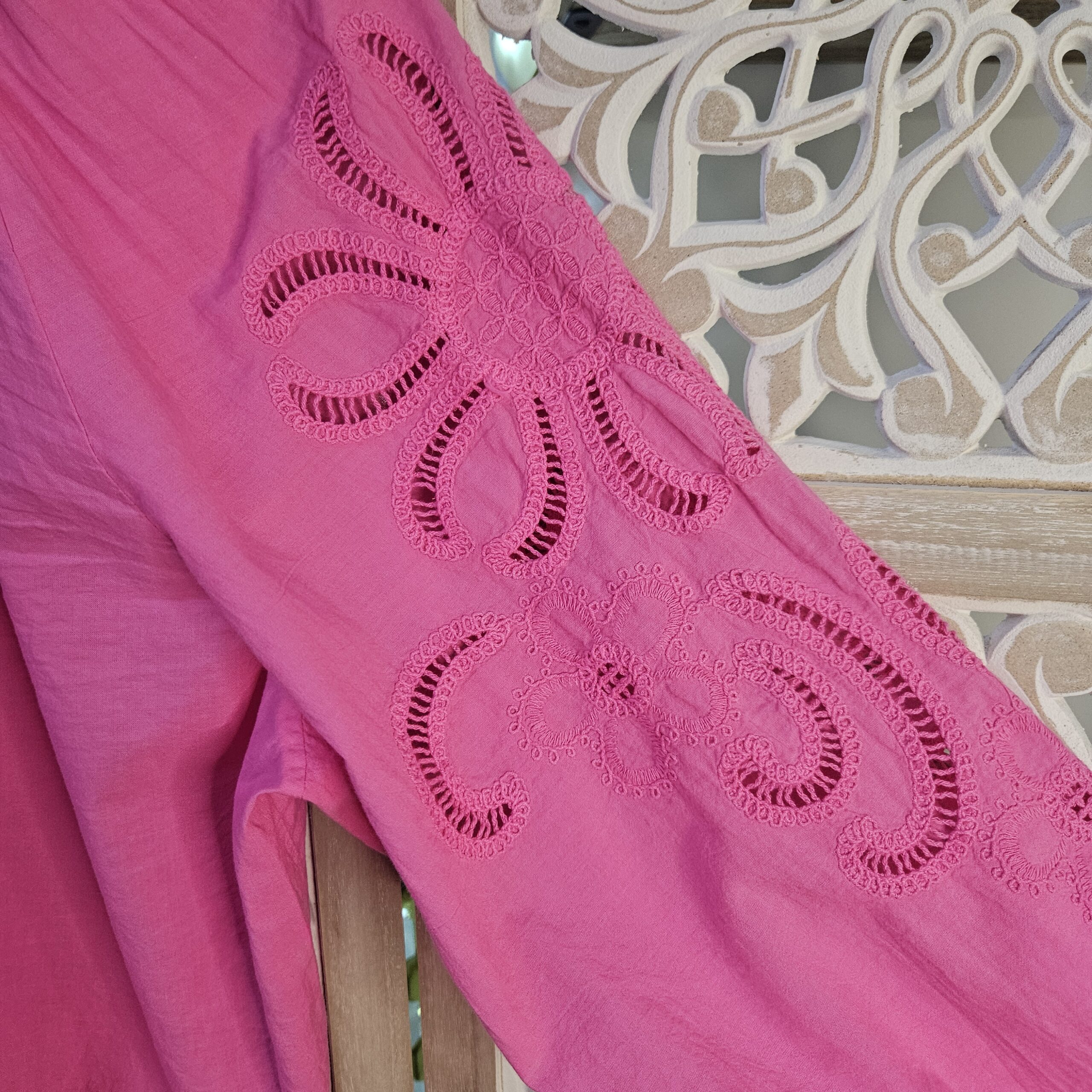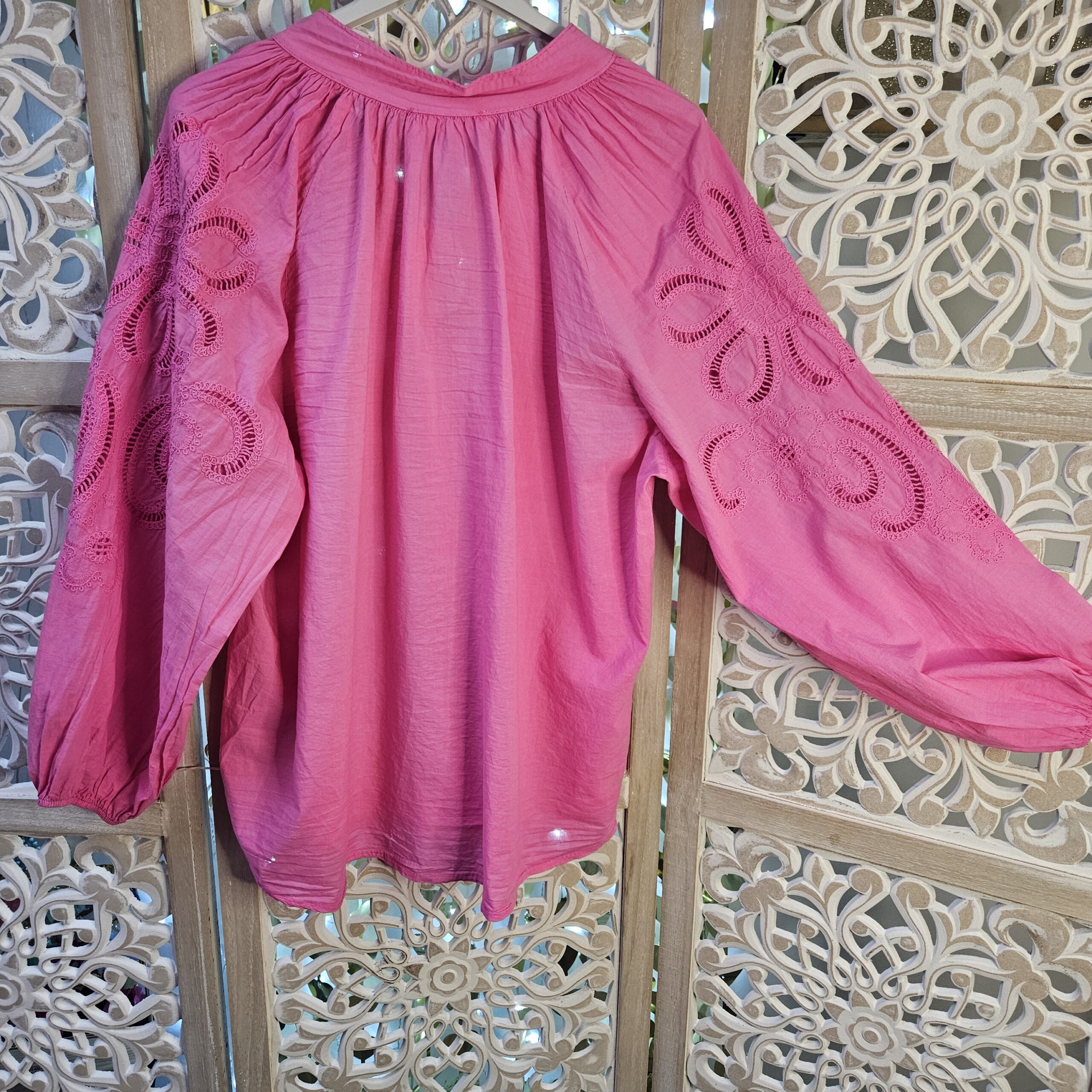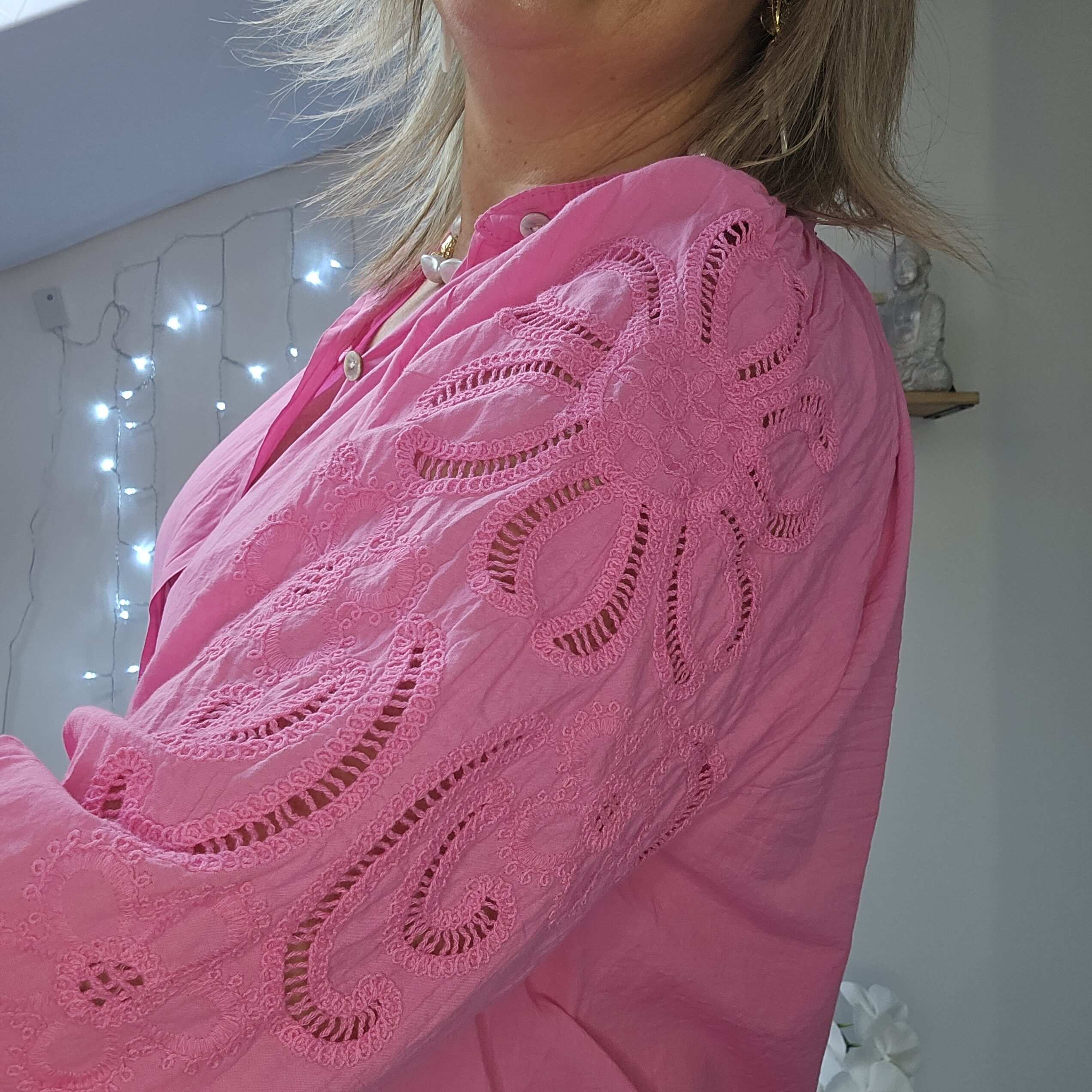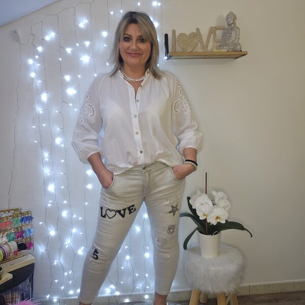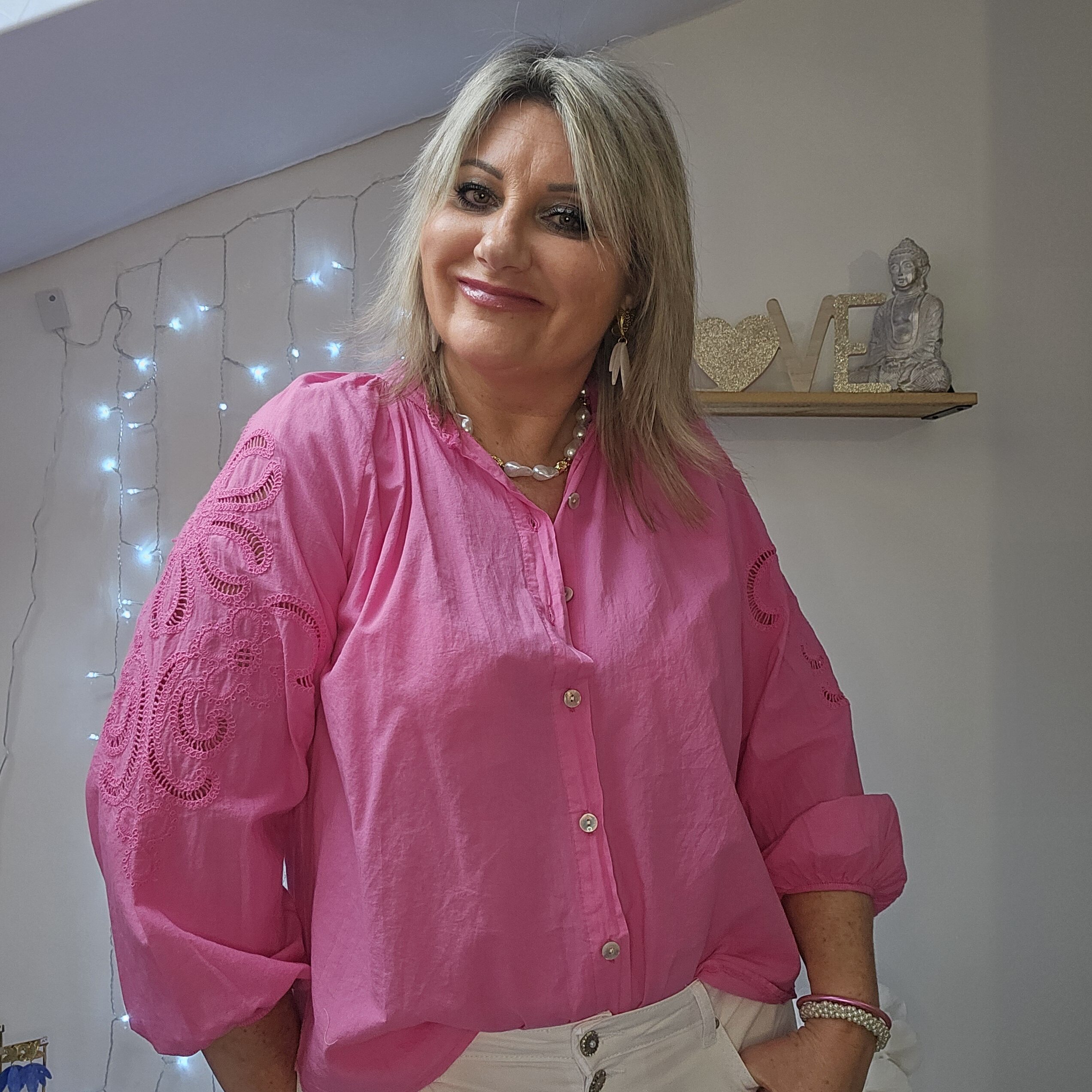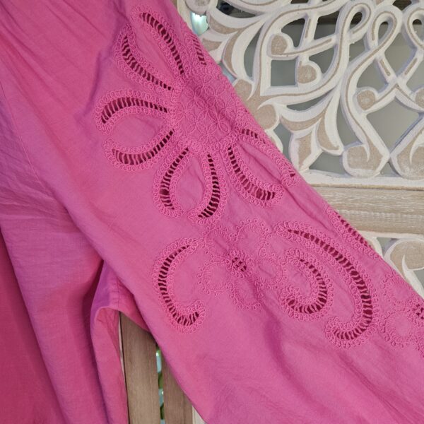Chemise col officier, sur les manches des fleurs sont brodées, manches 3/4 type « ballon », élastique au bout. Coupe droite au niveau du buste. En bas arrondit. Existe en blanc, bleu ciel et fuchsia. TU.