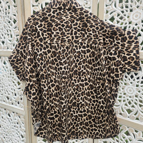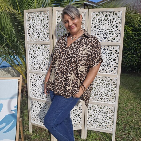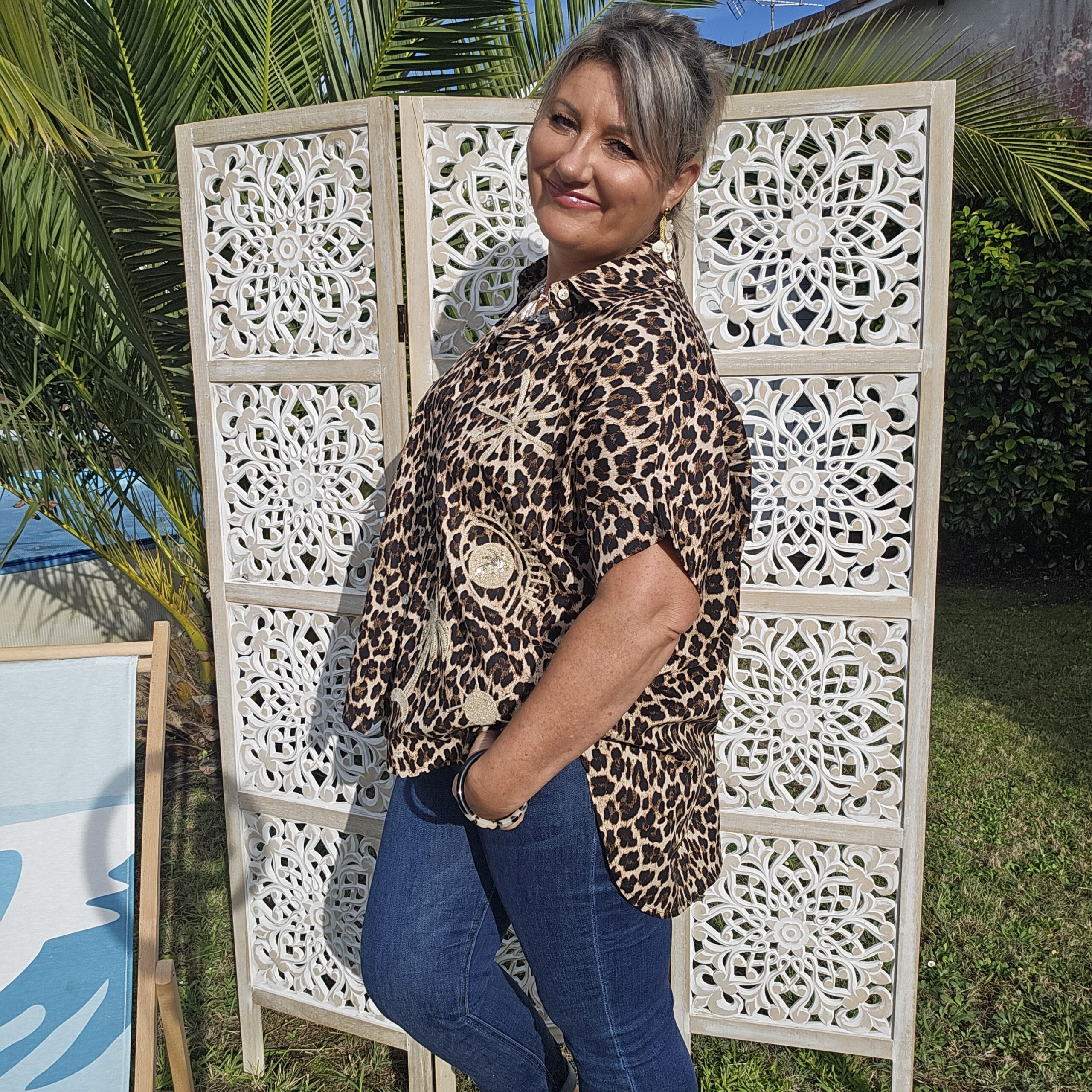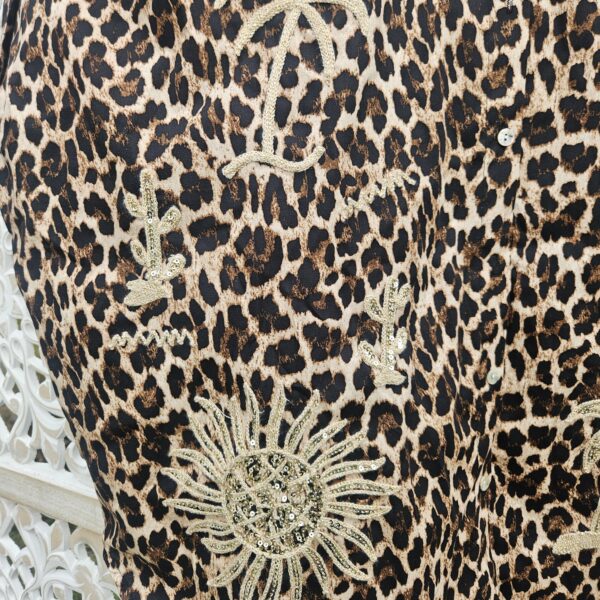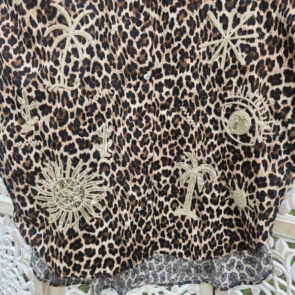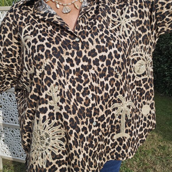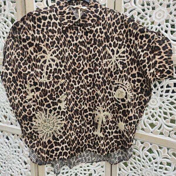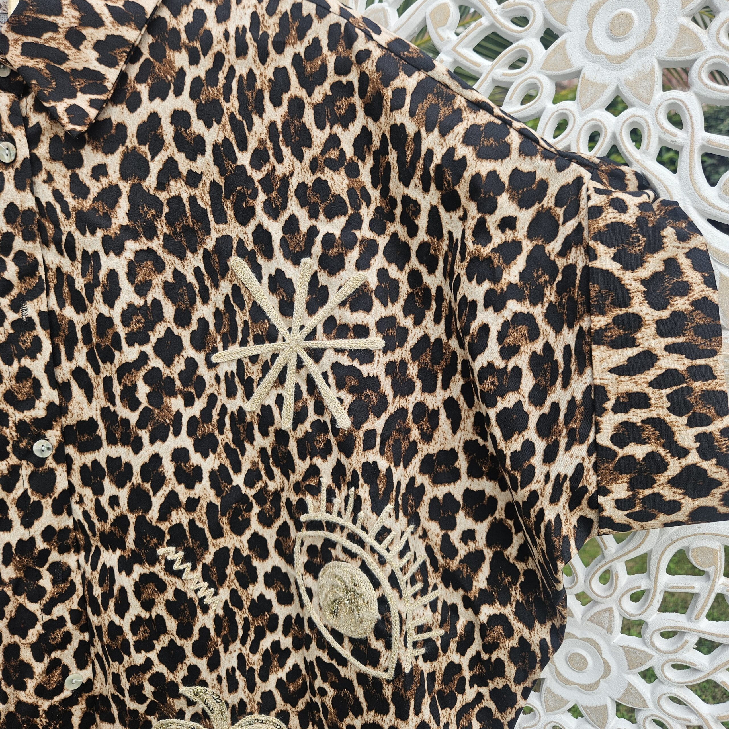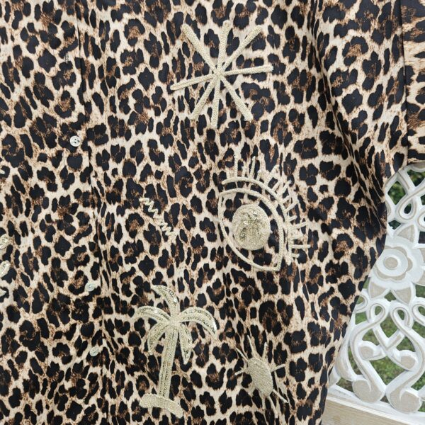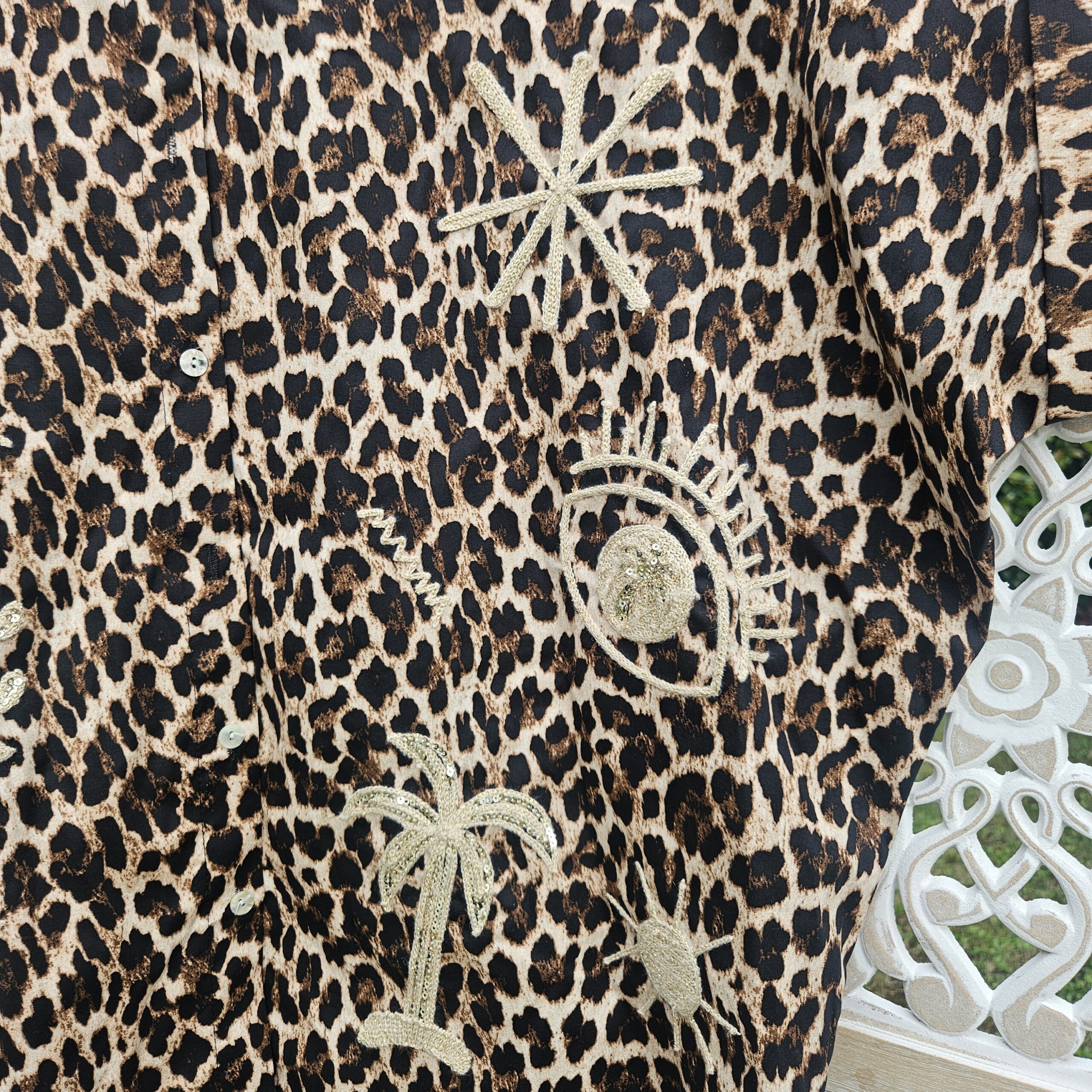 Chemise oversize en léopard avec des broderies en sequins de palmiers, cactus, œil, soleil. Manches courtes avec revers. Coupe ample et confortable pour un look frais et élégant. TU