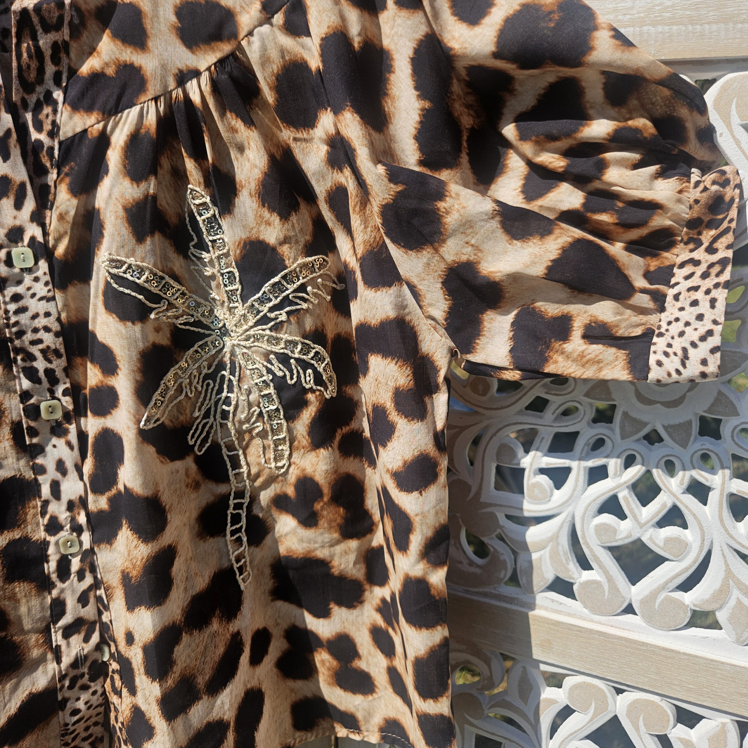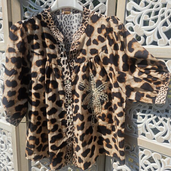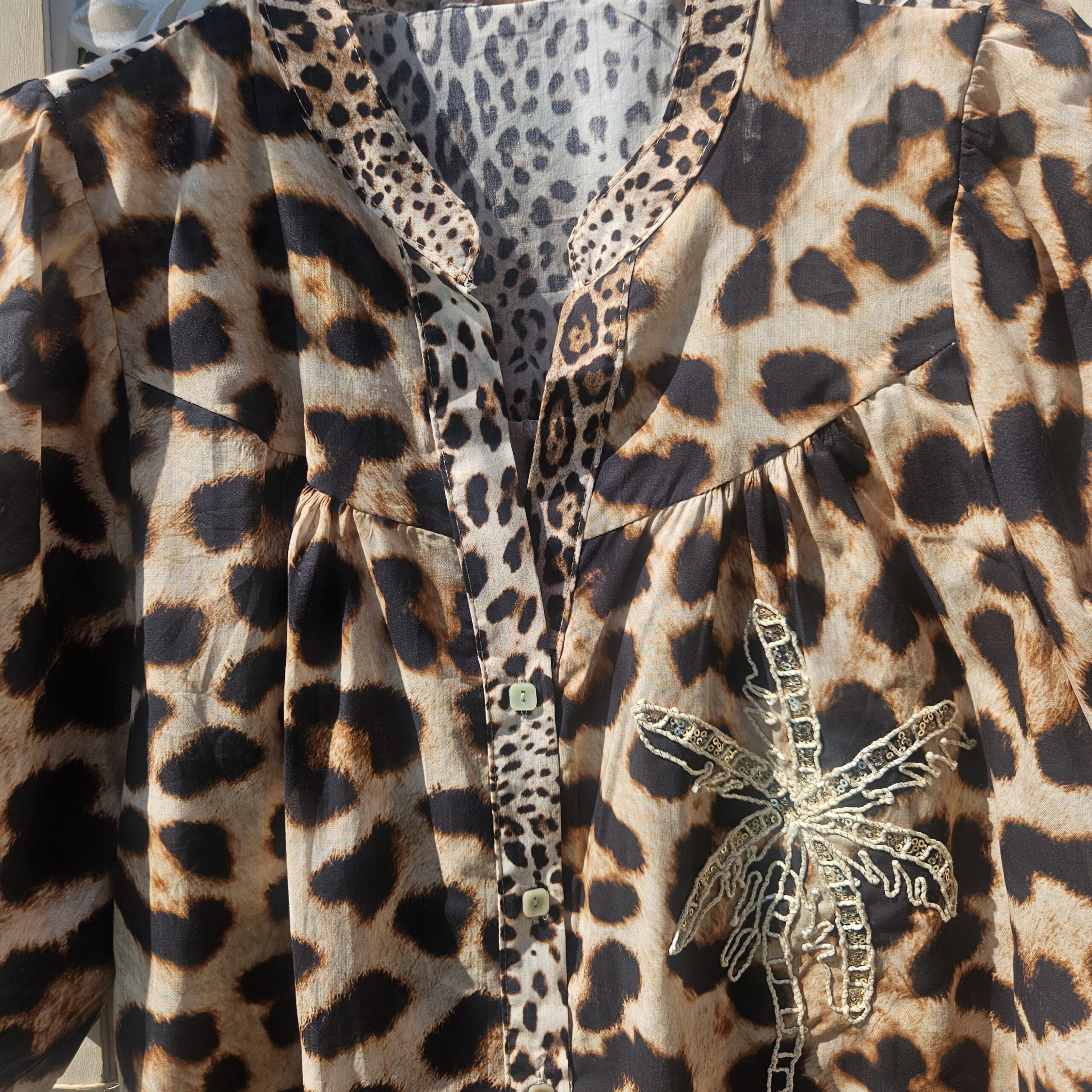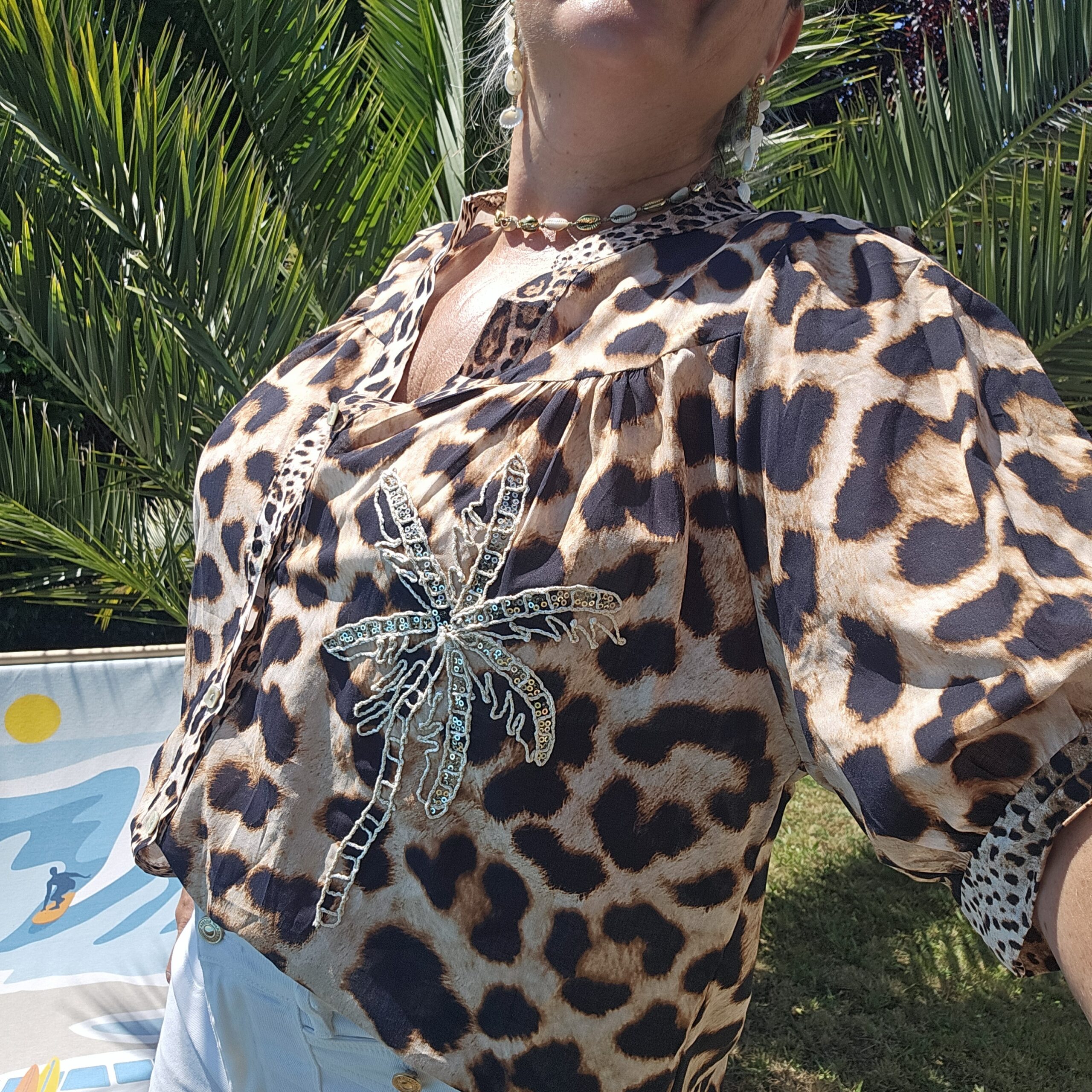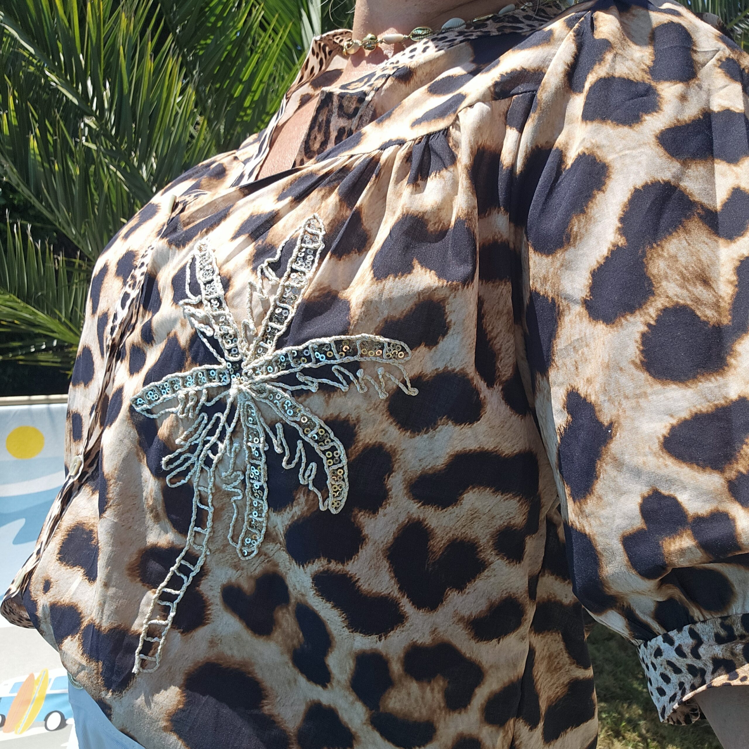Chemise manches bouffantes léopard avec une broderie Gold et sequins en forme de PALMIER sur le devant pour une touche originale et estivale. Col rond, coupe ample et fluide. Légère et très agréable à porter. TU