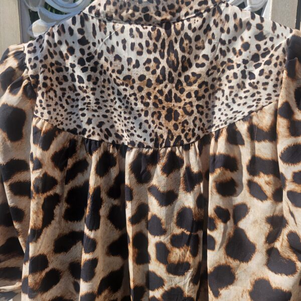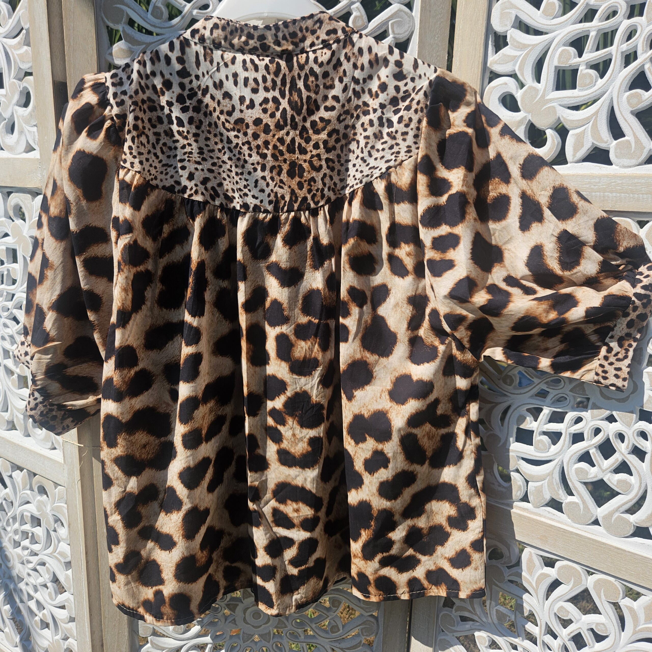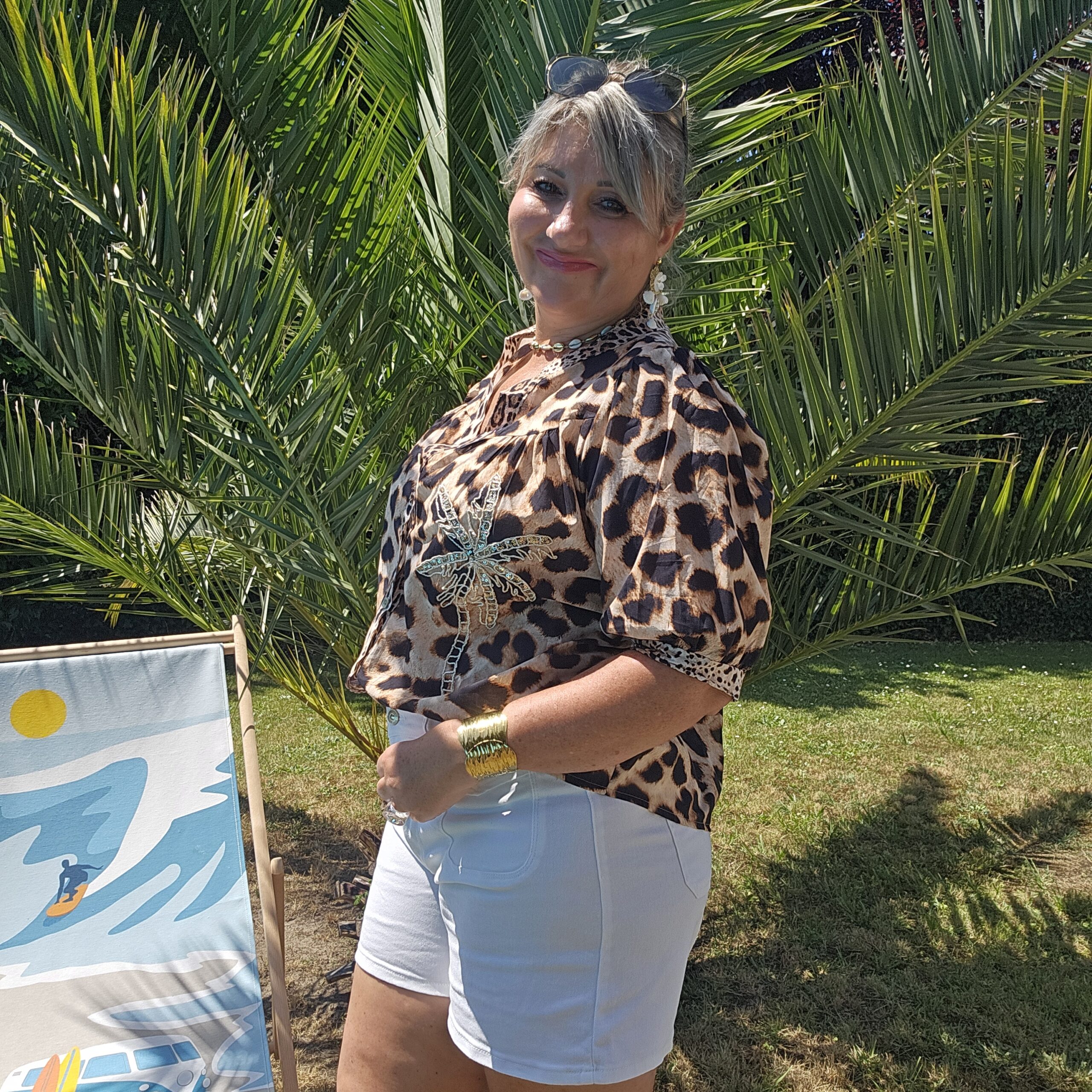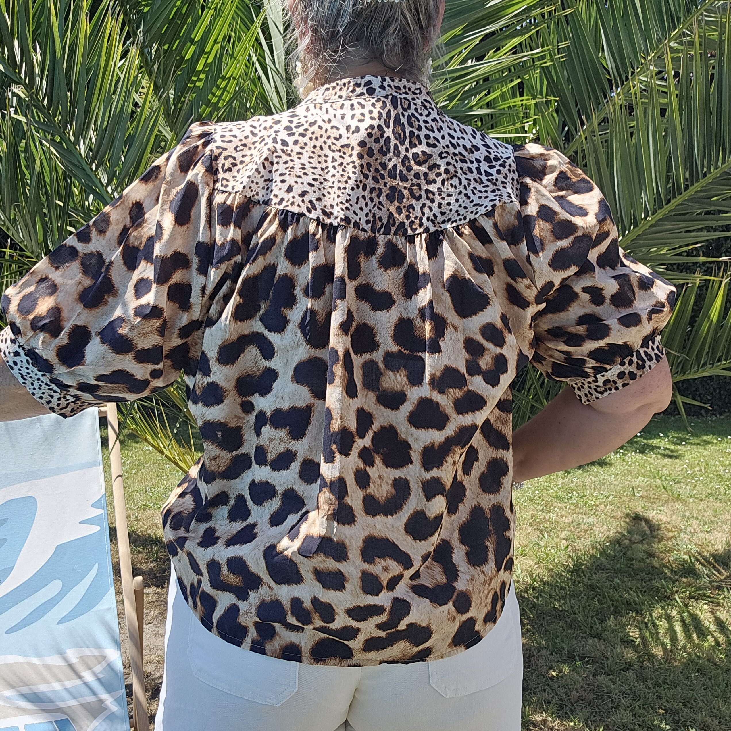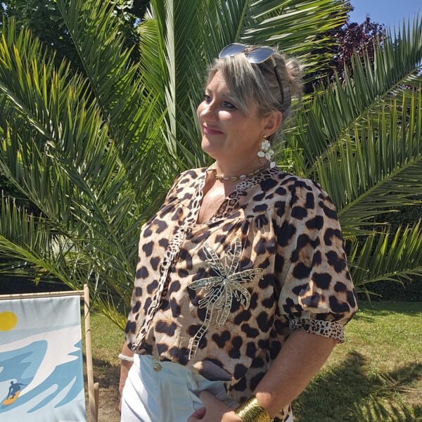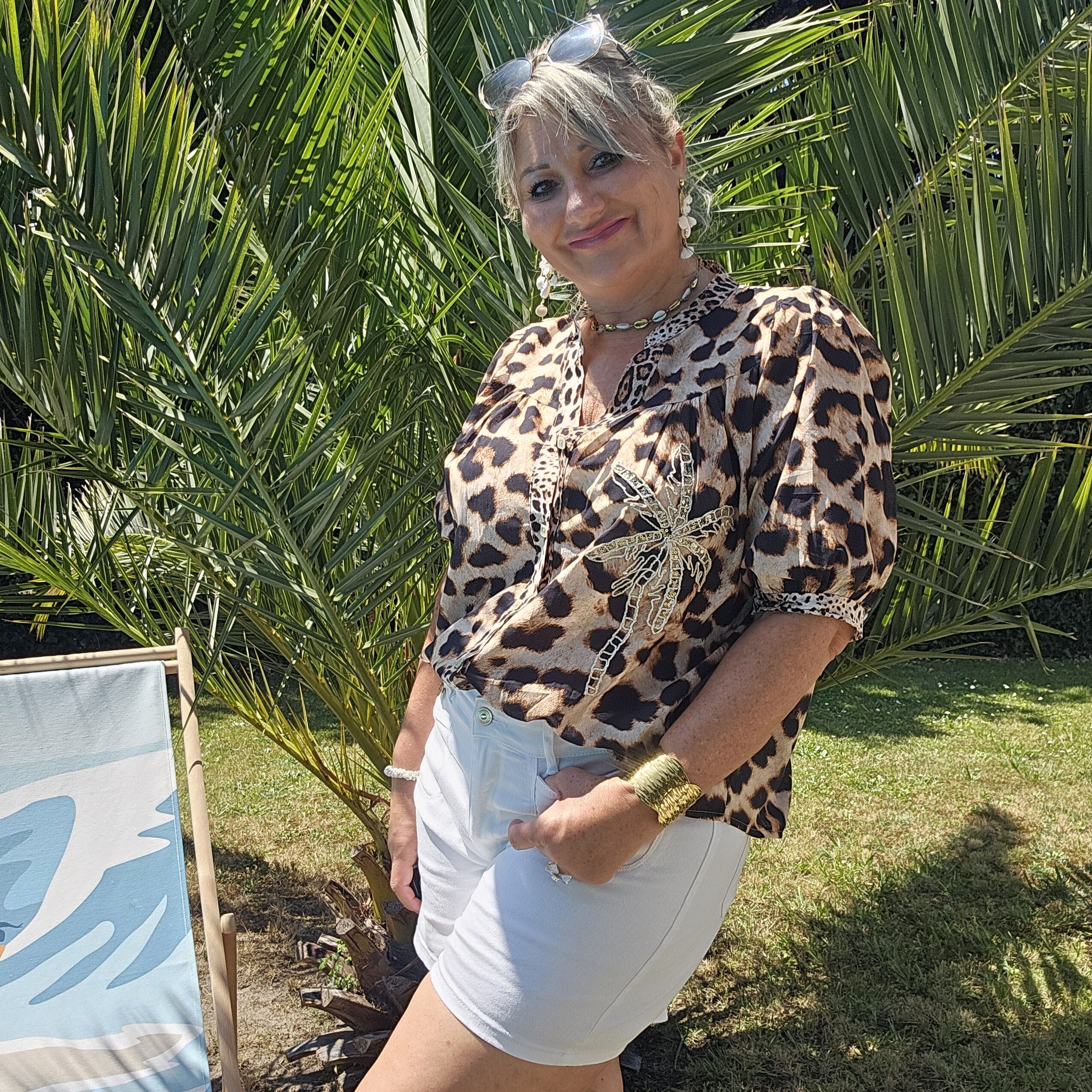Chemise manches bouffantes léopard avec une broderie Gold et sequins en forme de PALMIER sur le devant pour une touche originale et estivale. Col rond, coupe ample et fluide. Légère et très agréable à porter. TU