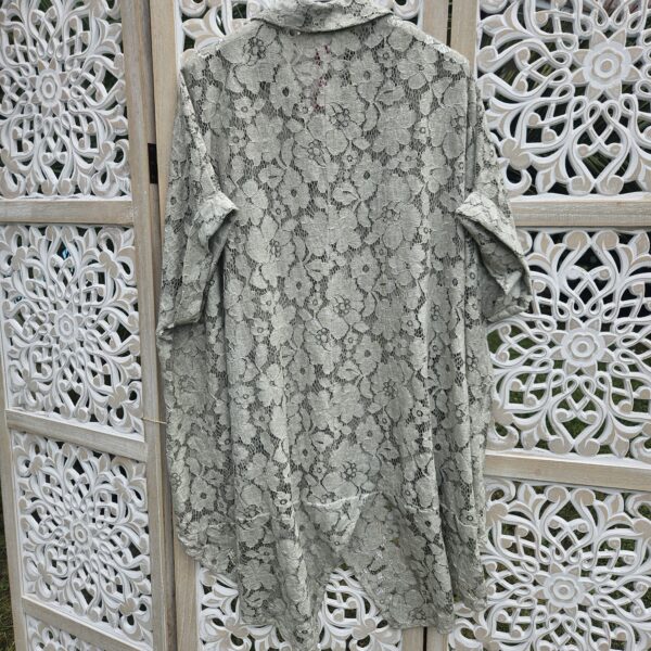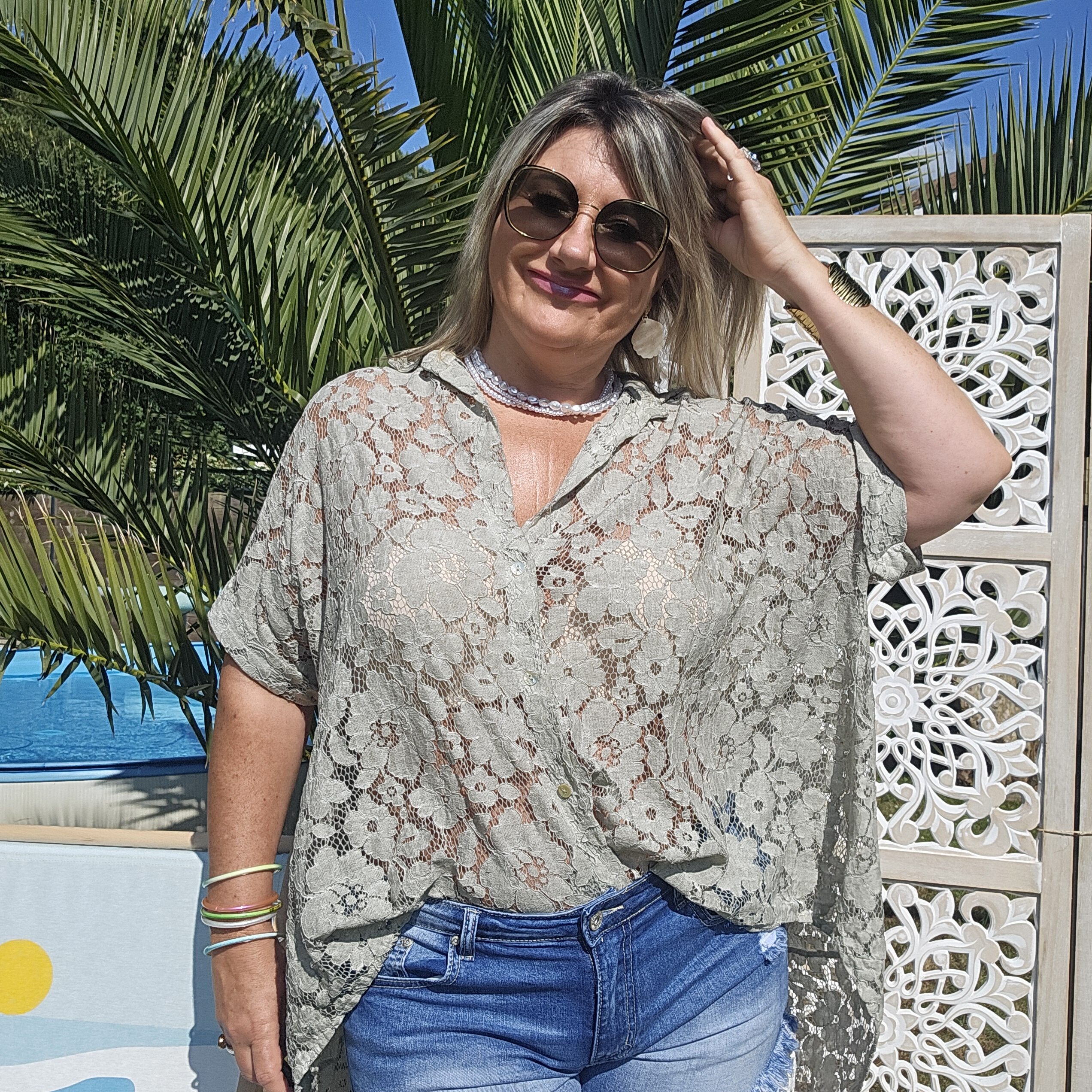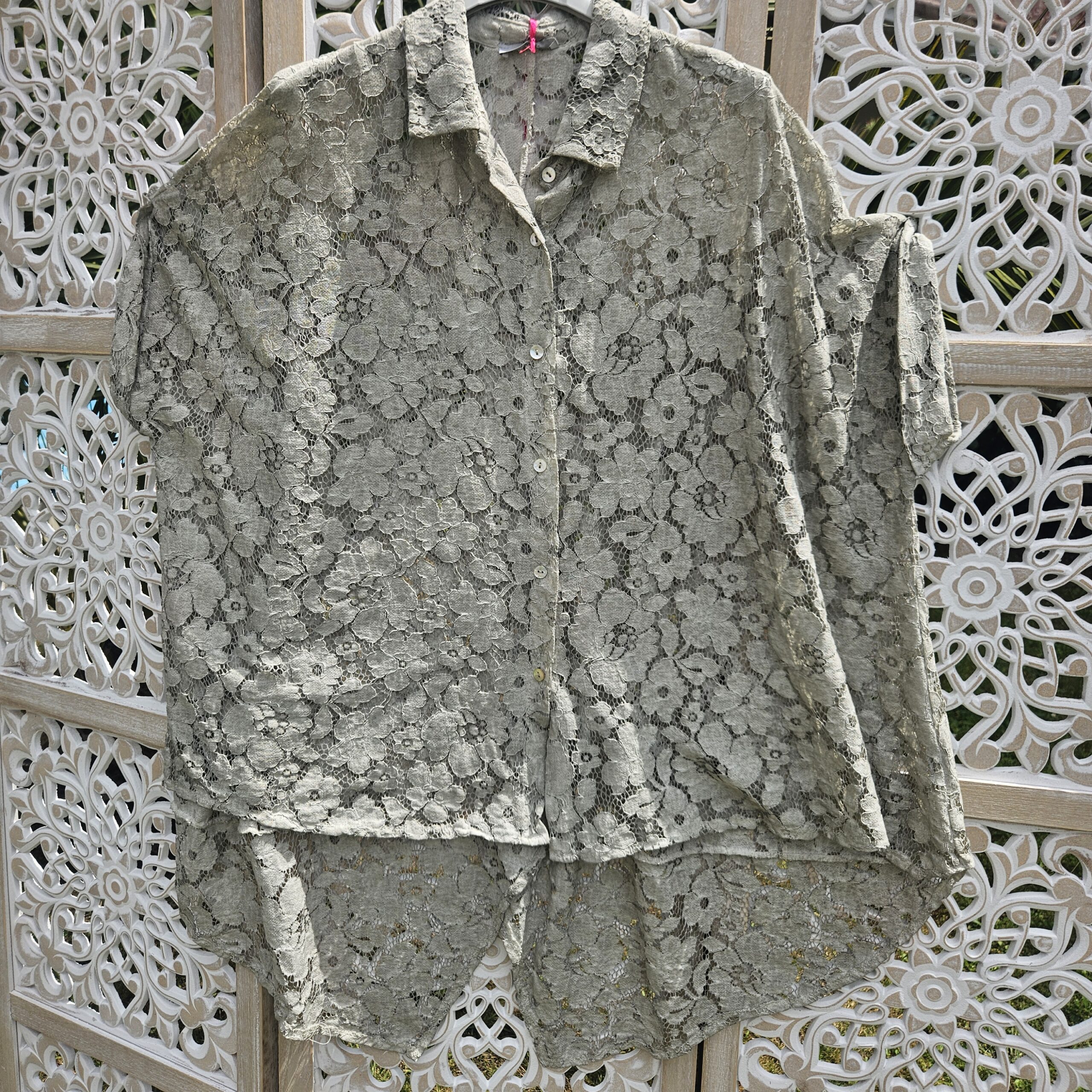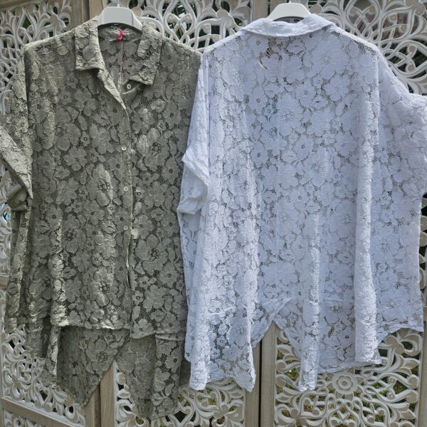 Chemise oversize en dentelle, plus courte devant que derrière . A l’arrière 2 pointes en bas avec une ouverture. Manches courtes. Existe en blanc et en kaki. Légère et très agréable à porter. Semi transparente. TU
