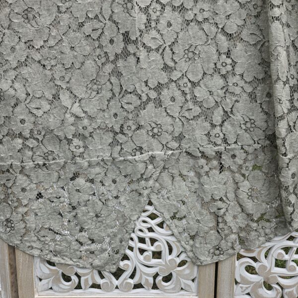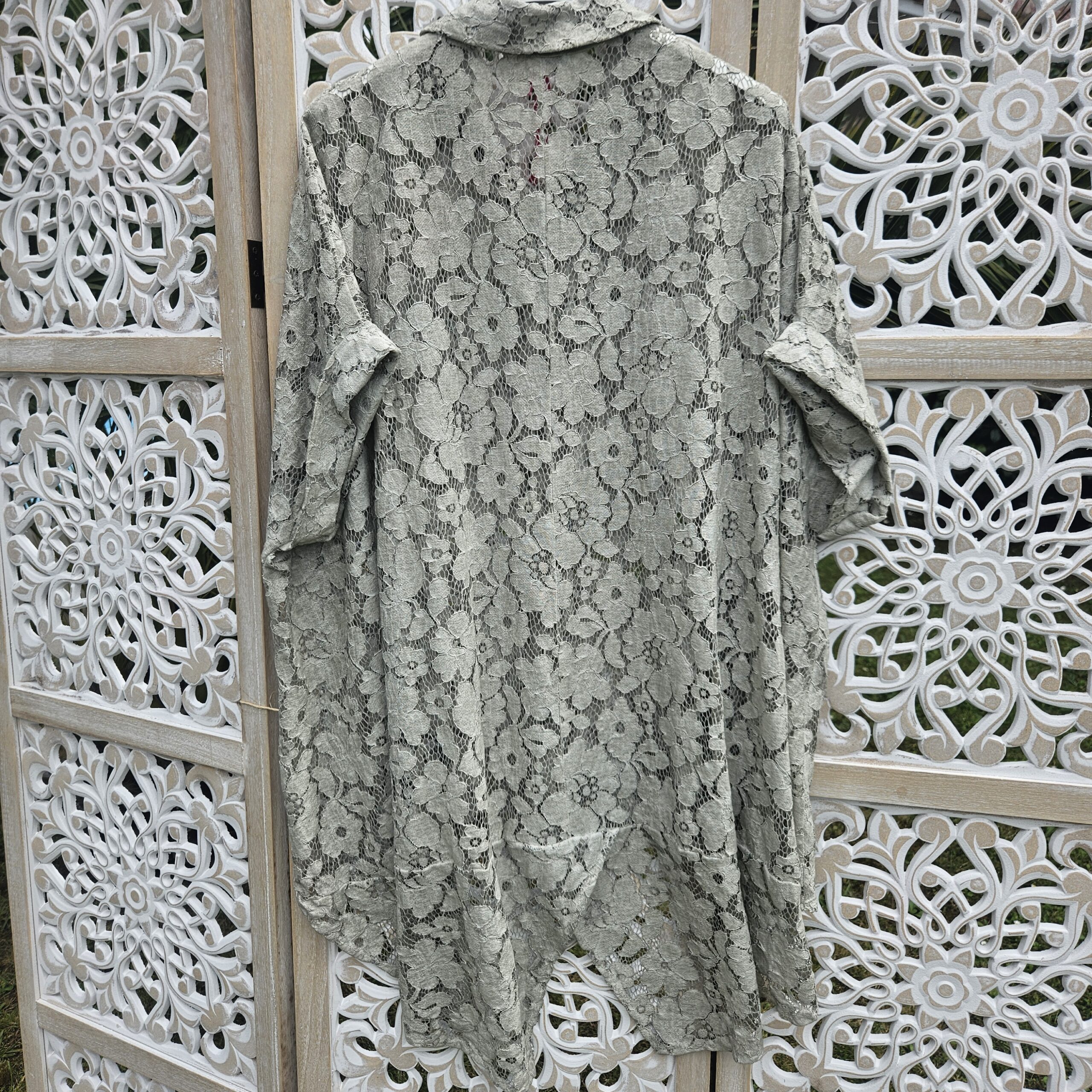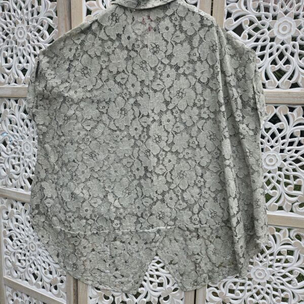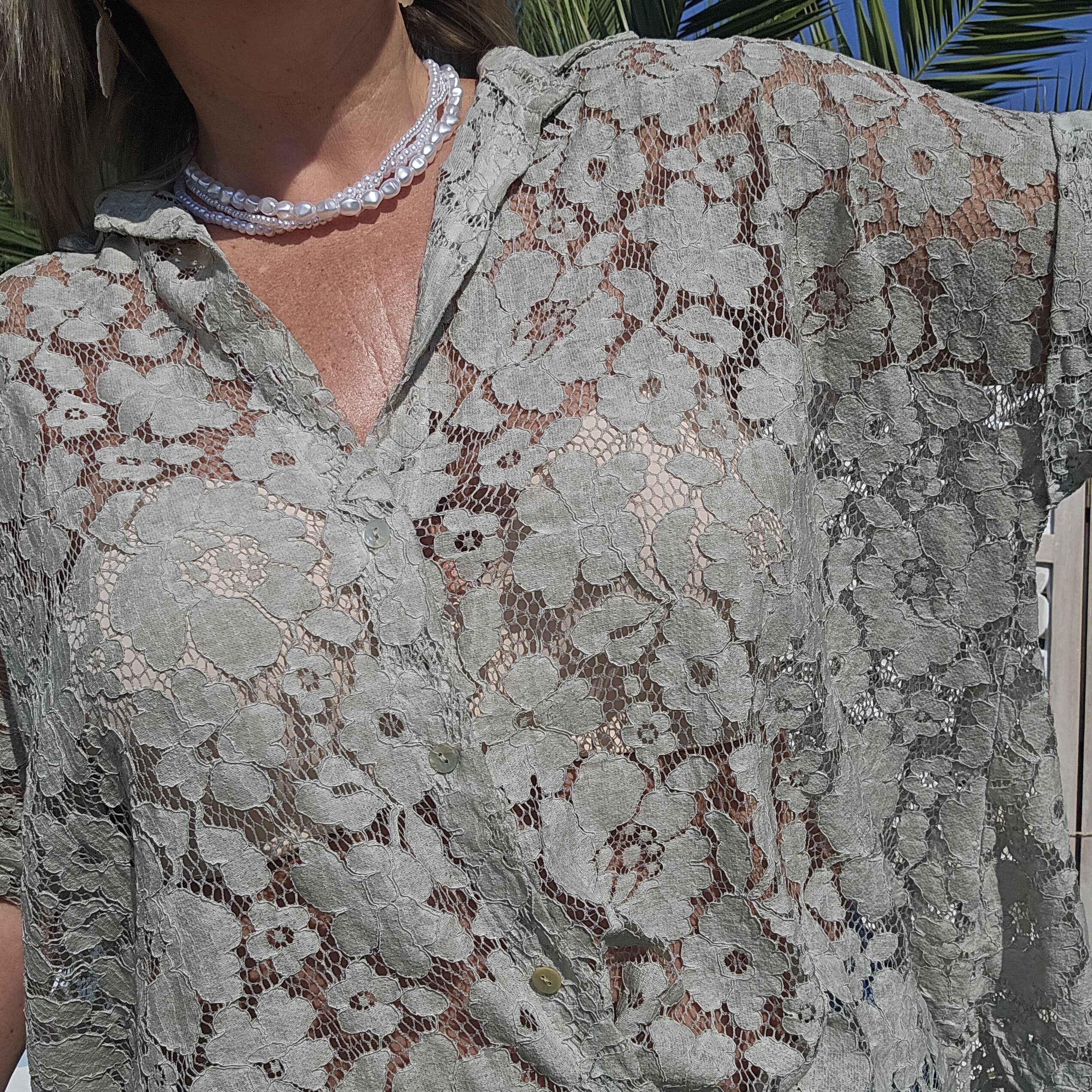 Chemise oversize en dentelle, plus courte devant que derrière . A l’arrière 2 pointes en bas avec une ouverture. Manches courtes. Existe en blanc et en kaki. Légère et très agréable à porter. Semi transparente. TU