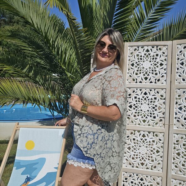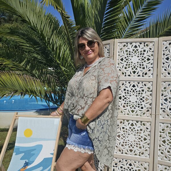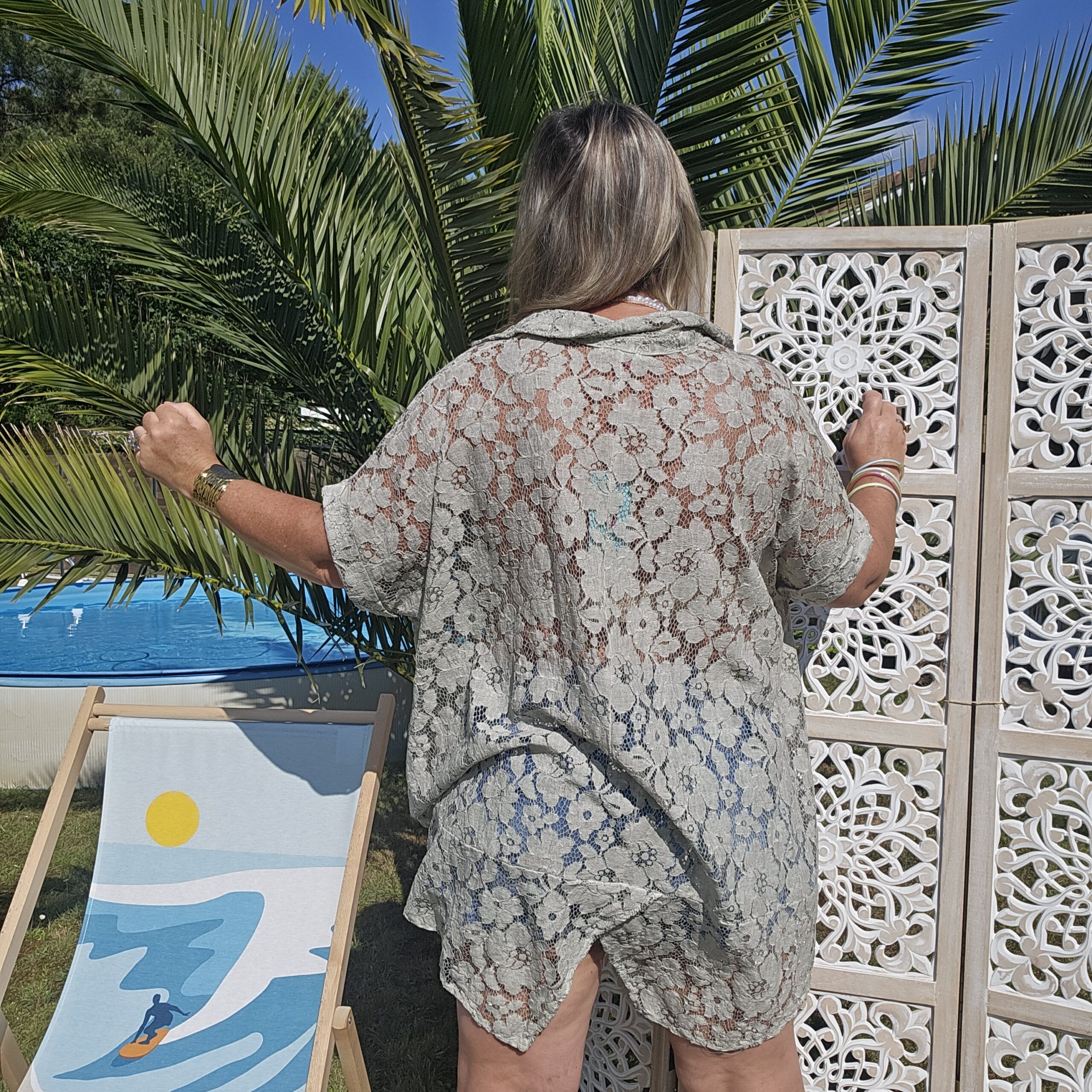 Mon regard pailleté : Chemise oversize en dentelle, très légère, et agréable à porter. Peut se porter avec le short en jean’s avec dentelle ou avec un jean’s. Idéale pour cet été.