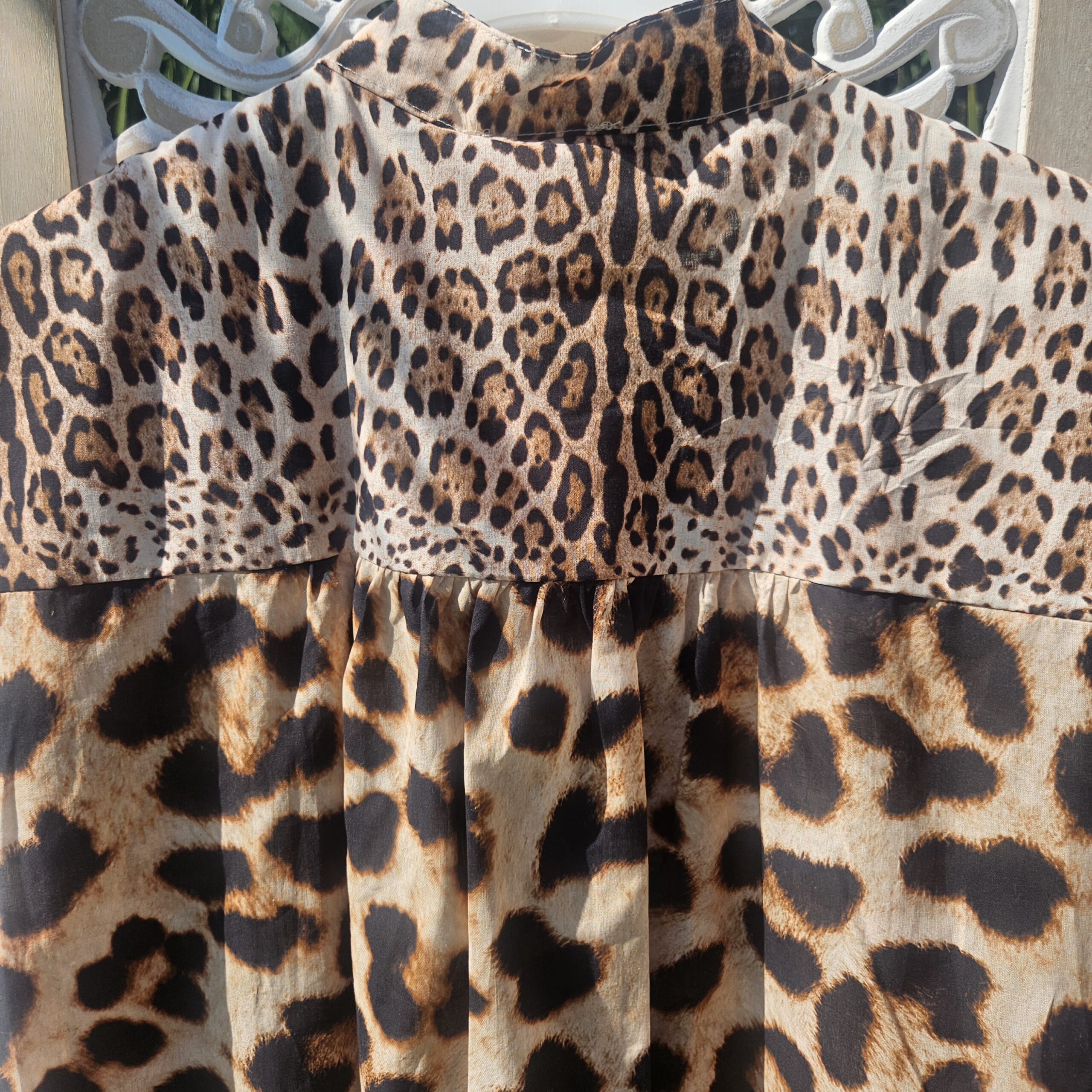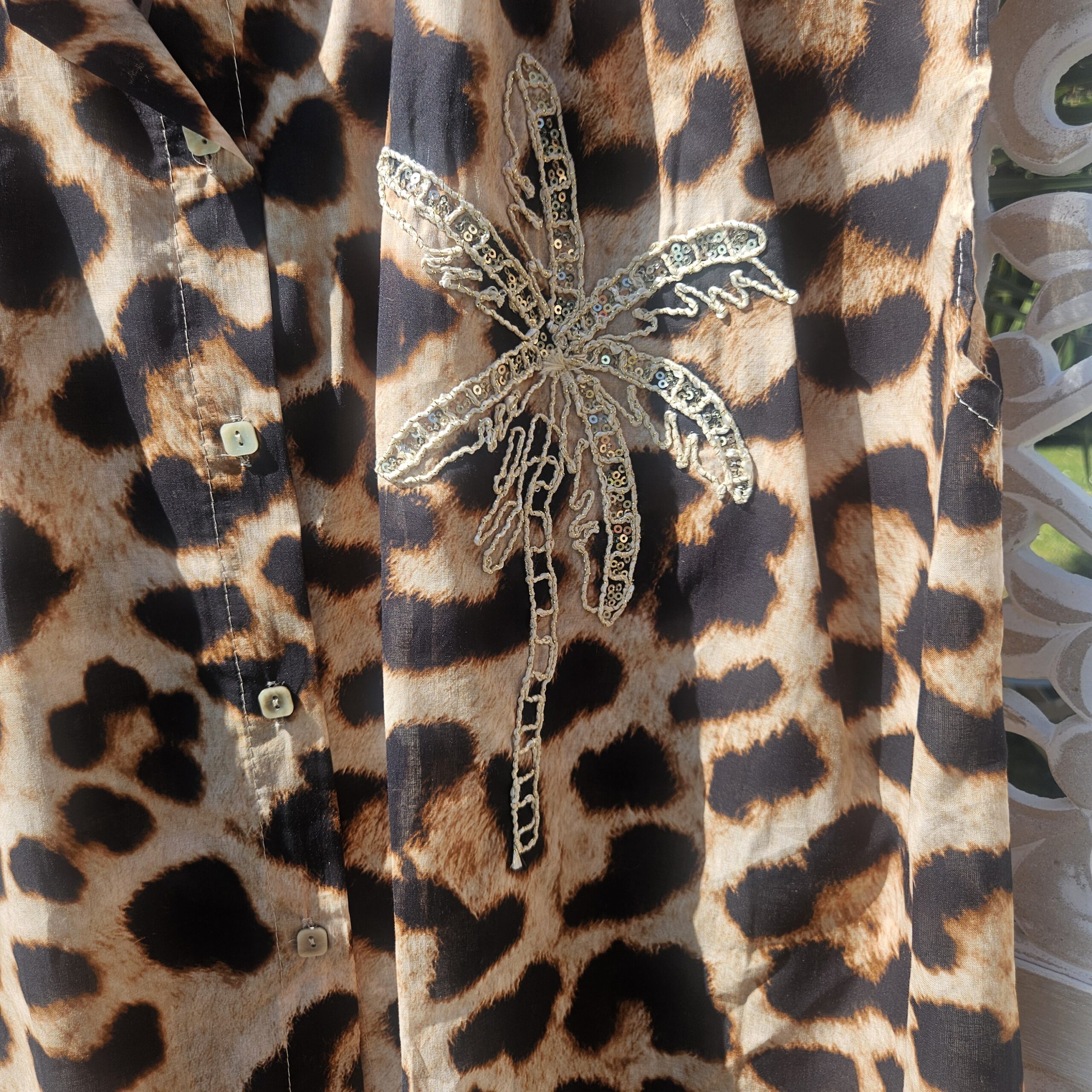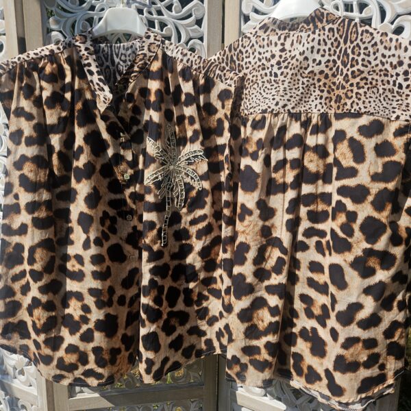 Mon regard pailleté : Chemise léopard avec son palmier, originale, tendance, très légère, et agréable à porter pour cette saison estivale ! Peut se porter avec un short ou avec un jean’s.