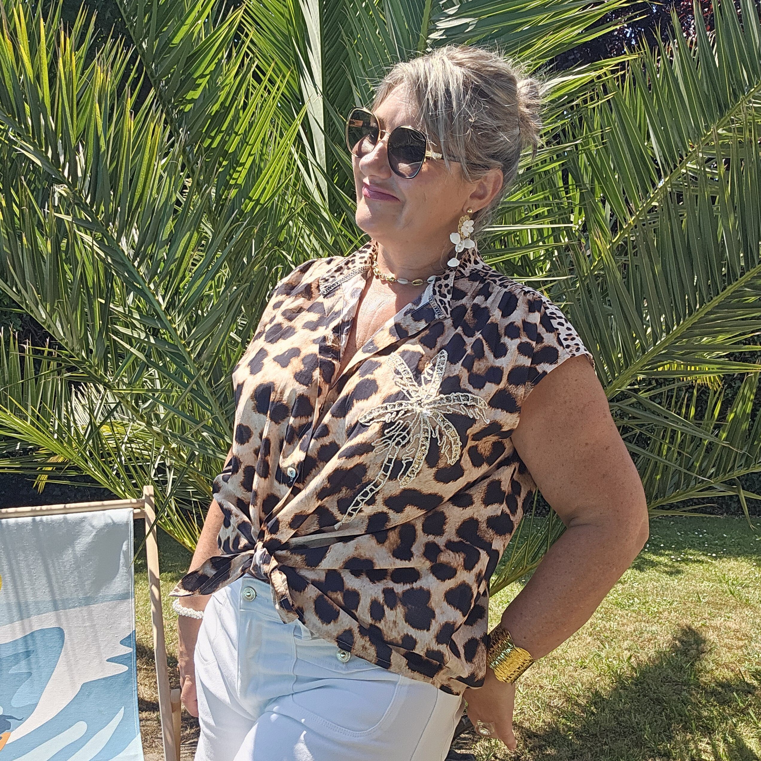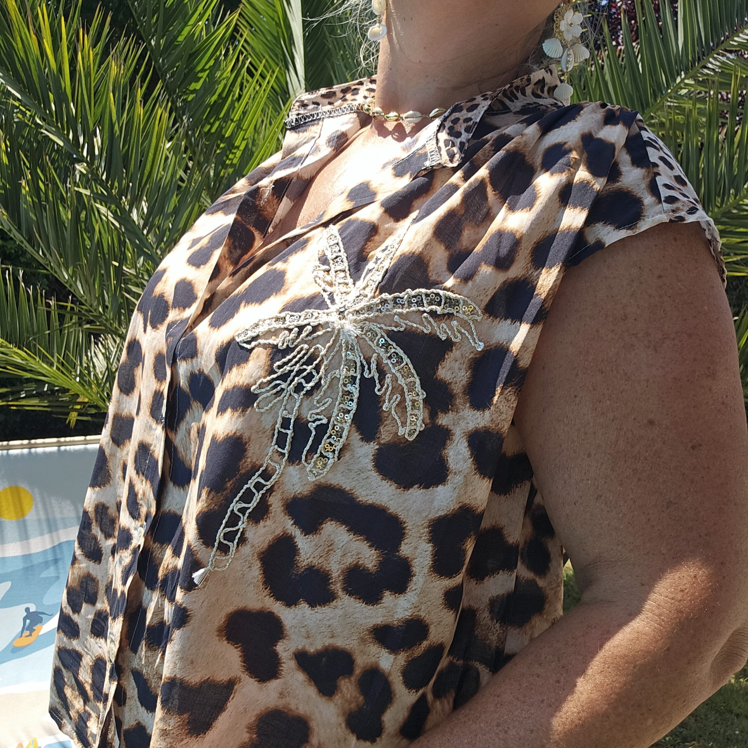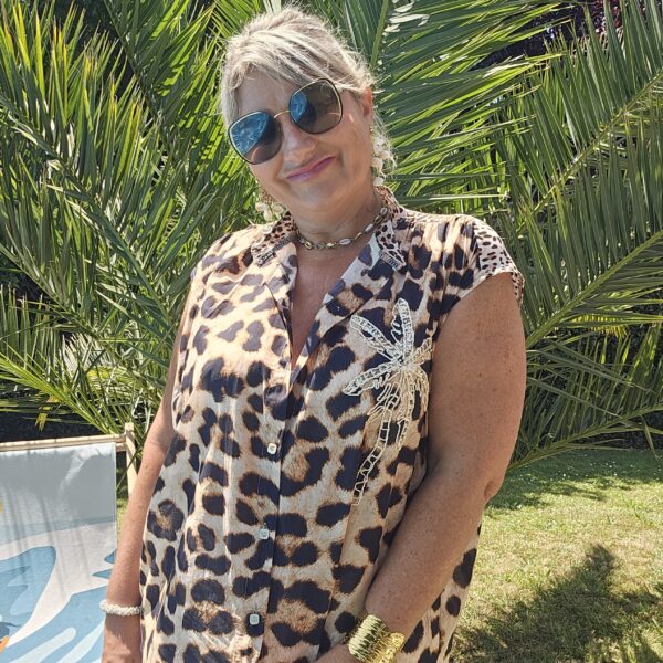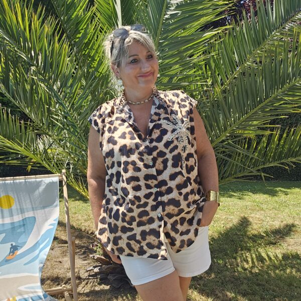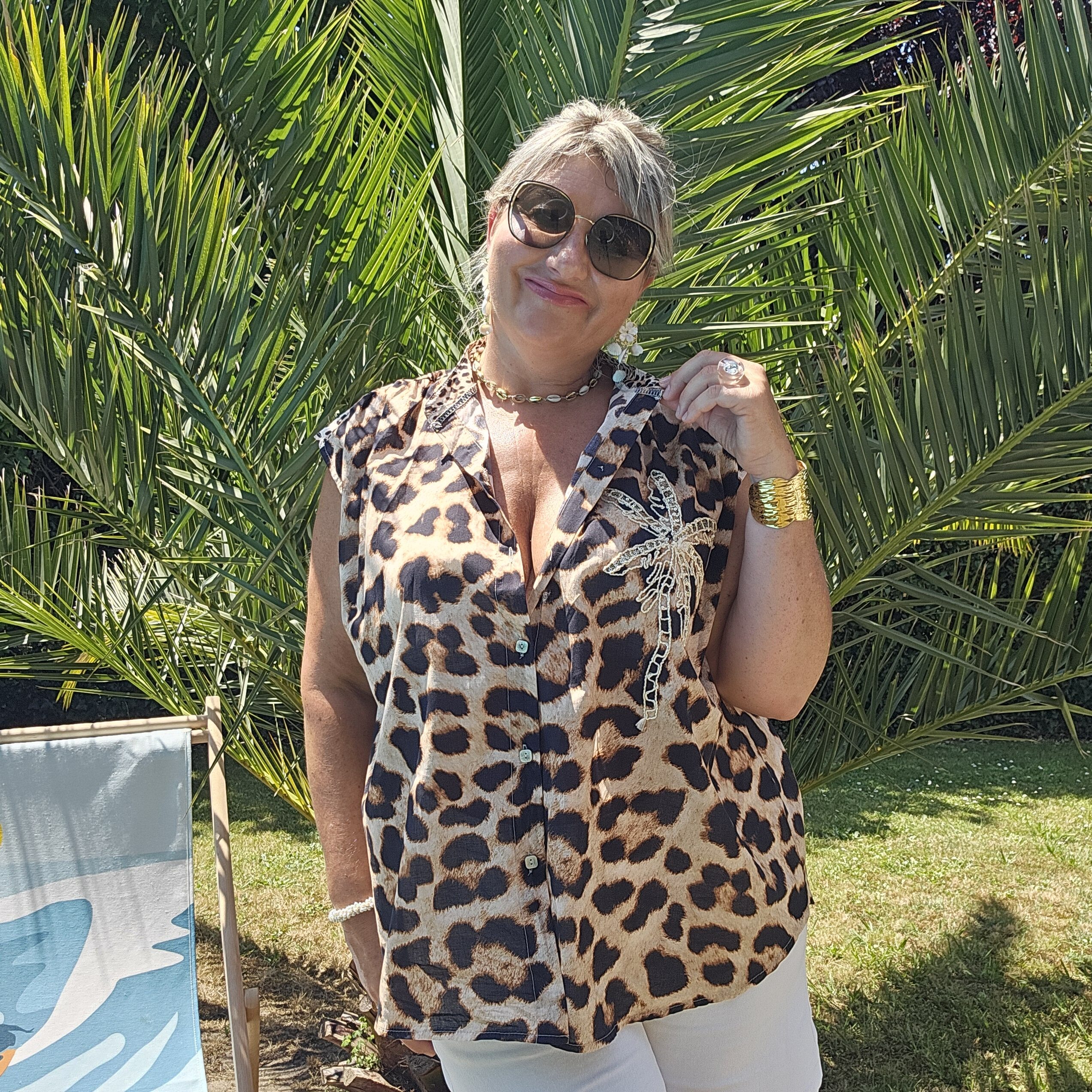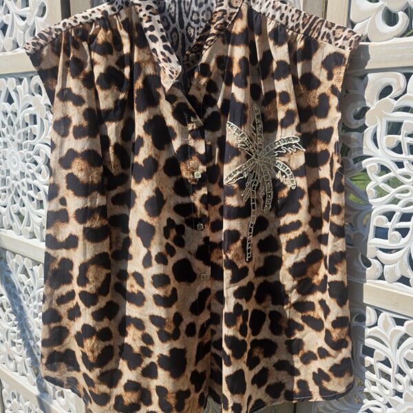 Chemise sans manches léopard avec une broderie Gold et sequins en forme de PALMIER sur le devant pour une touche originale et estivale. Col officier. Légère et très agréable à porter. TU