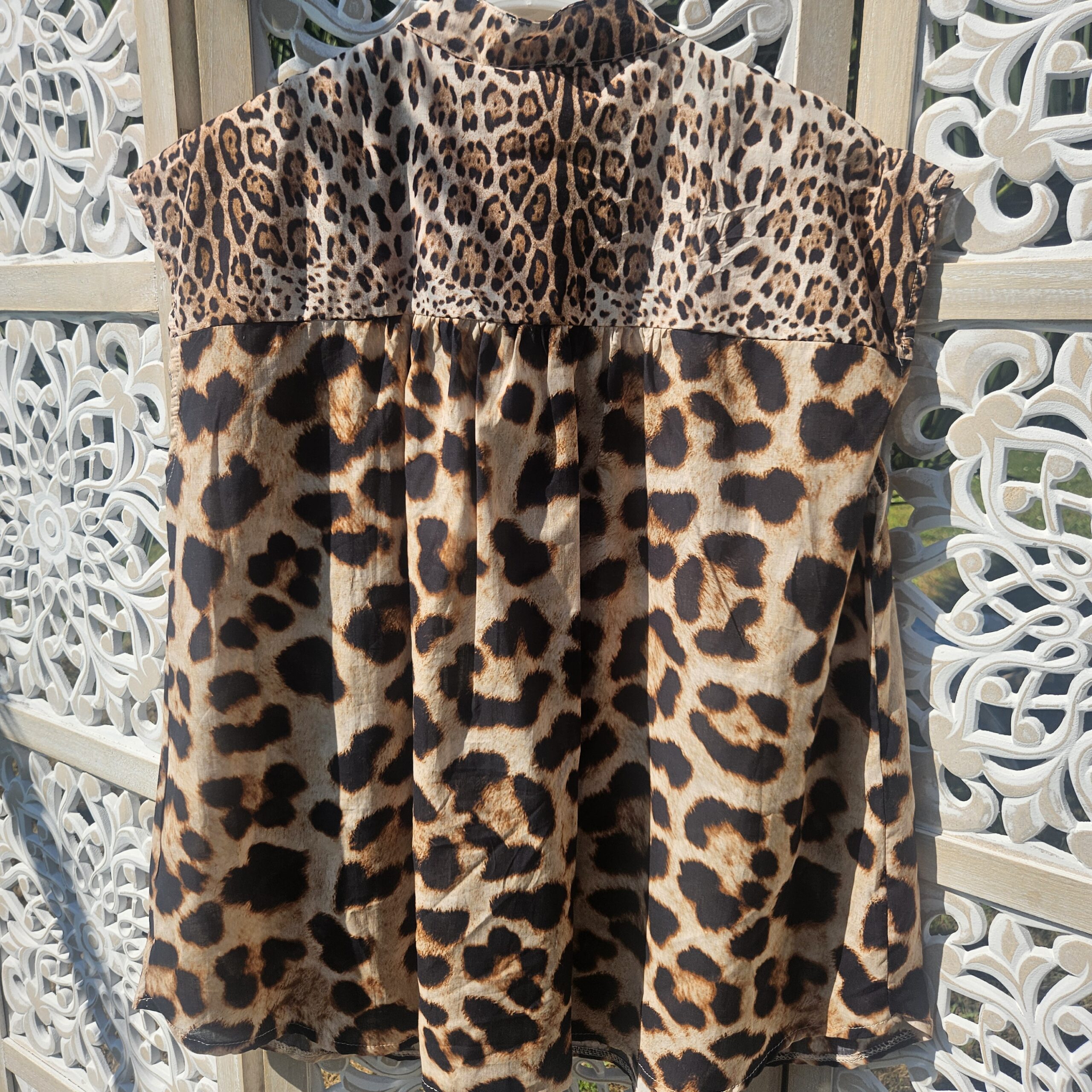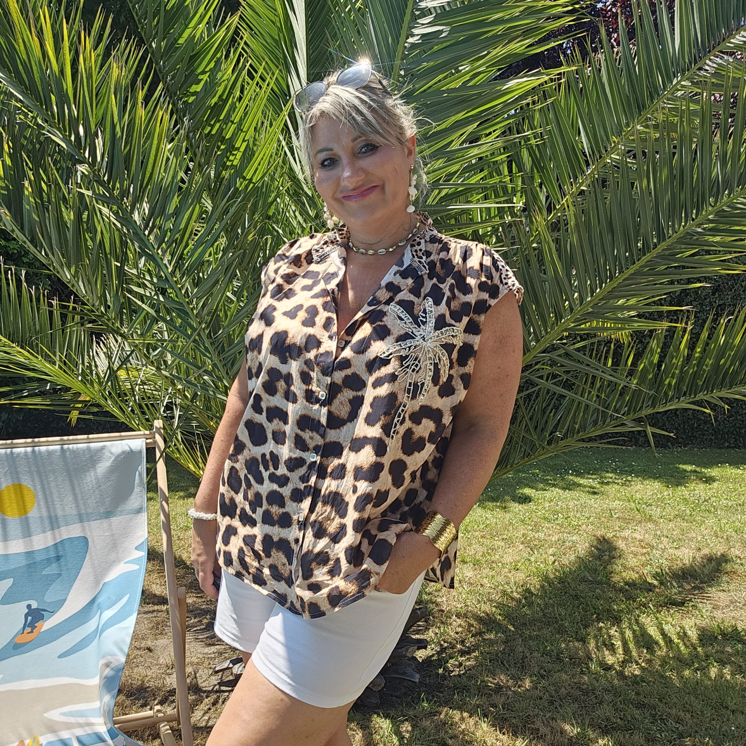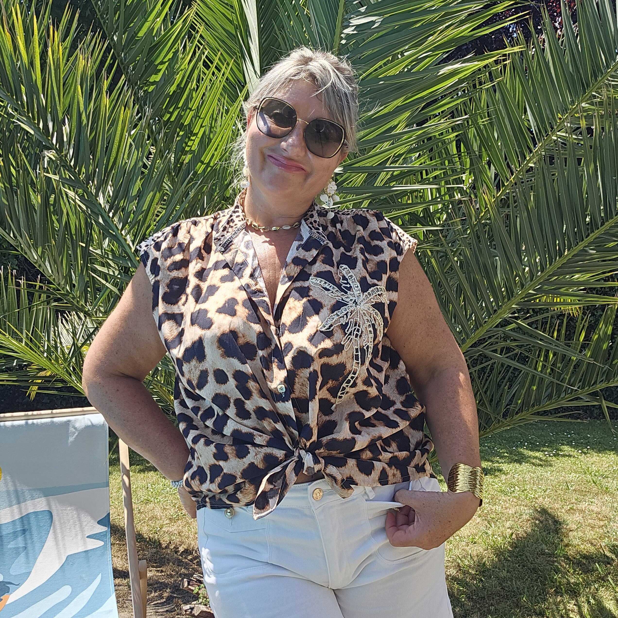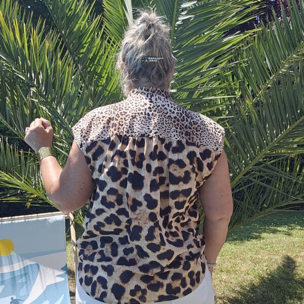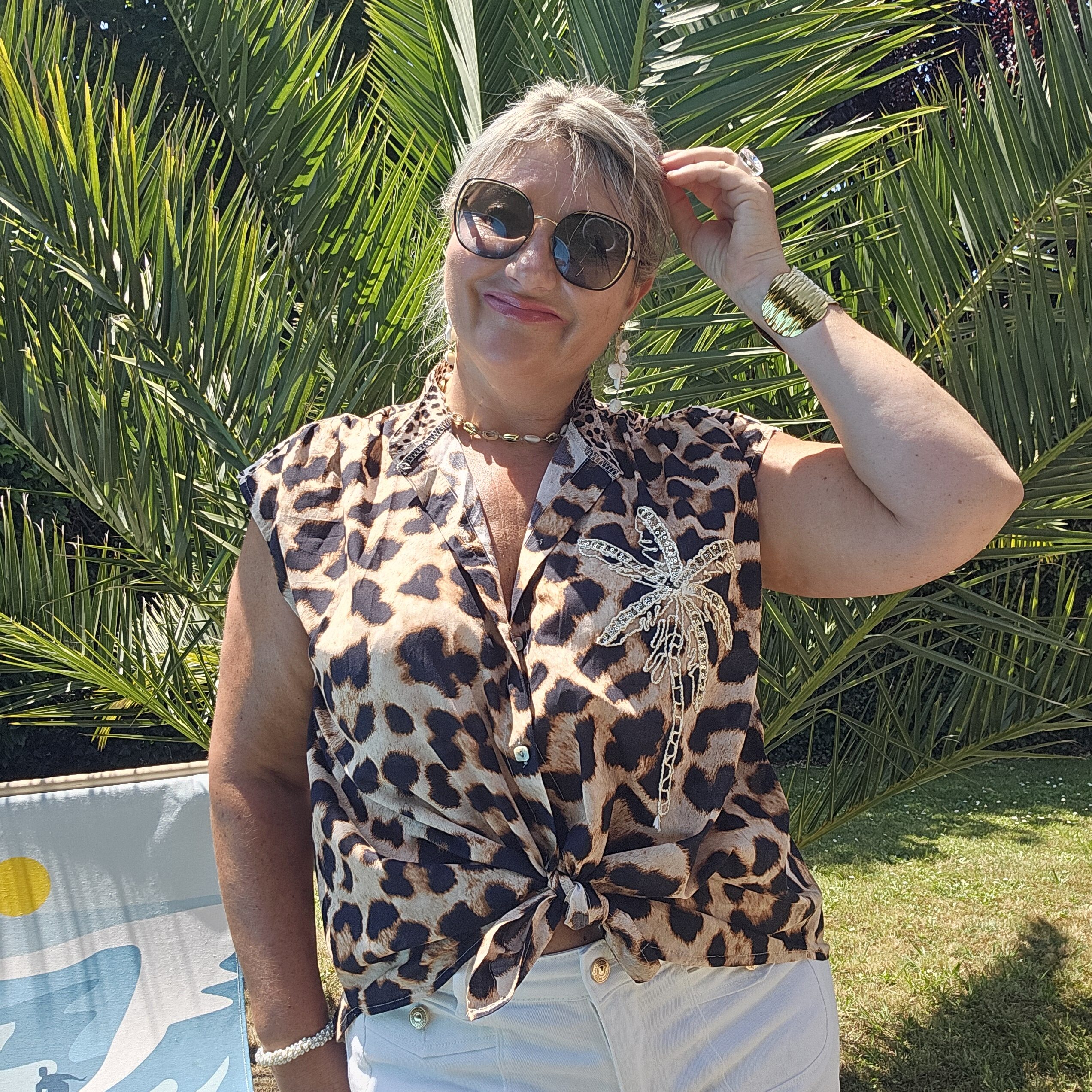 Chemise sans manches léopard avec une broderie Gold et sequins en forme de PALMIER sur le devant pour une touche originale et estivale. Col officier. Légère et très agréable à porter. TU