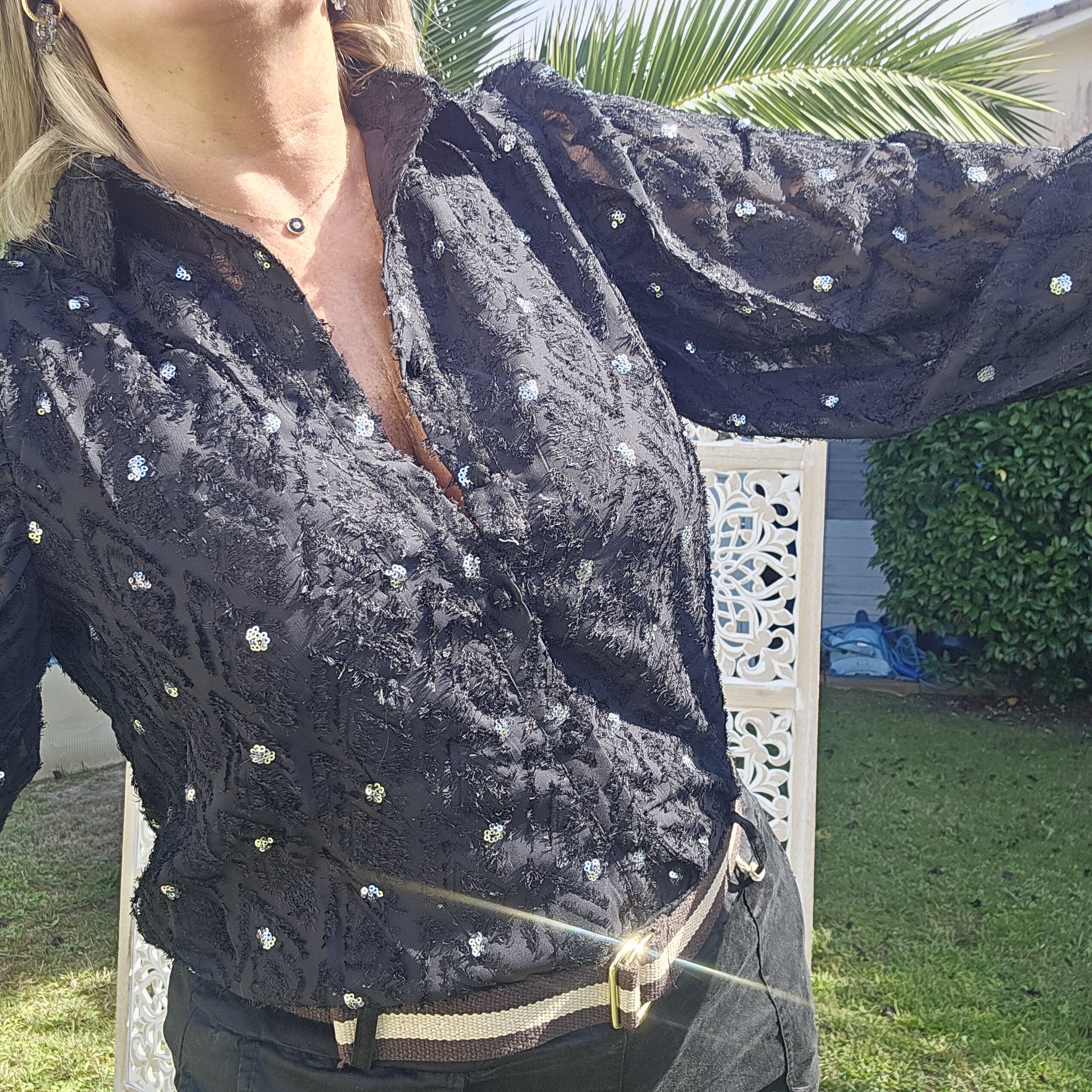 Chemisier noir avec des amas de sequins argentés, doublé, manches transparentes et amples, plus long derrière avec arrondi.