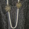 Collier de perles blanches type « perles de culture » avec alternance de minis perles dorées, 2 grandes fleurs dorées, diamètre 4 et 4,5 cm, longueur réglable avec une petite chainette. TU longueur 45/47 cm