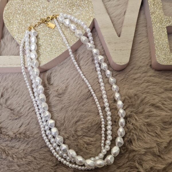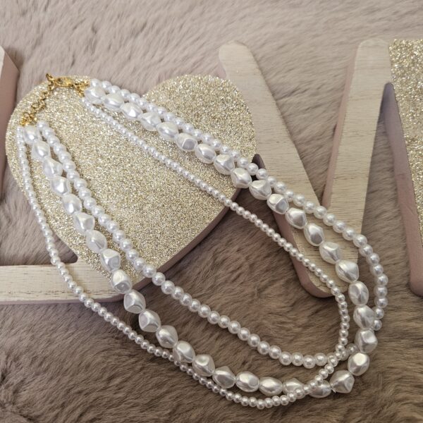Collier triple en perles blanches fantaisies, 3 tailles de perles différentes sur chaque collier . Longueur réglable avec une petite chainette. TU longueur