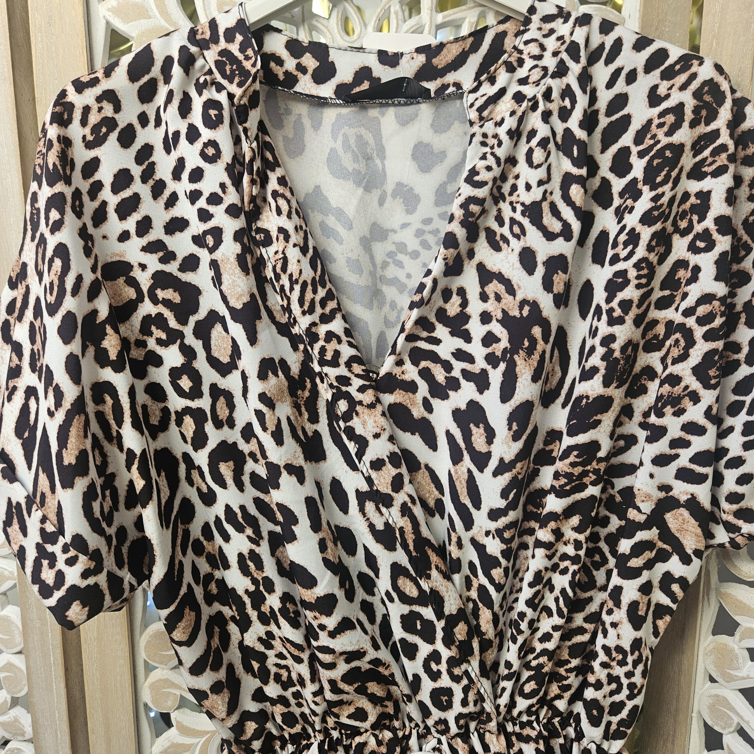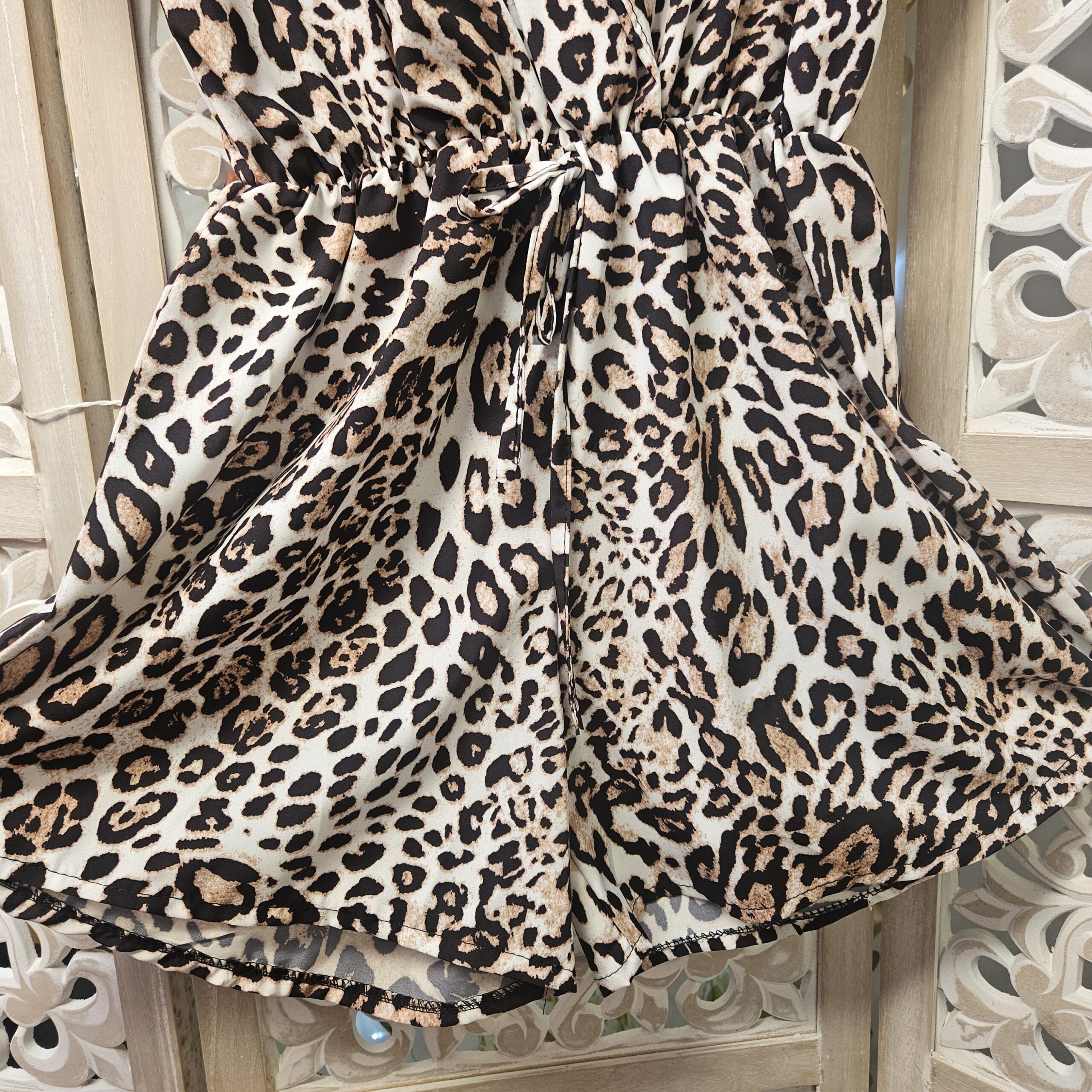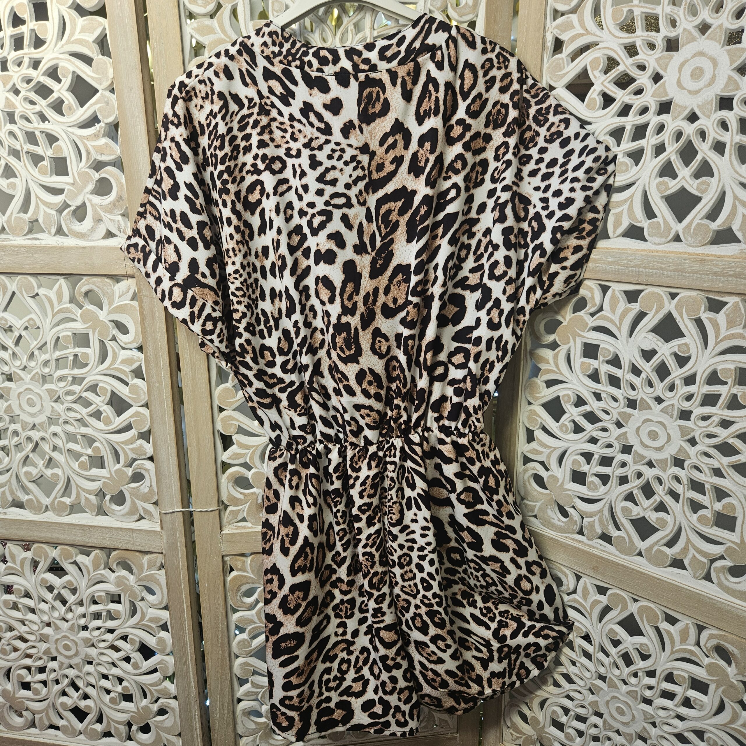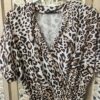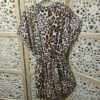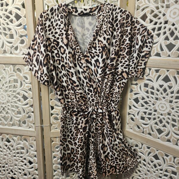 Combishort en léopard, décolleté en cache cœur, fermeture avec une bouton caché, petit col, élastique autour de la taille et petit nœud fantaisie, petites manches avec revers. Légère et très agréable à porter. TU.