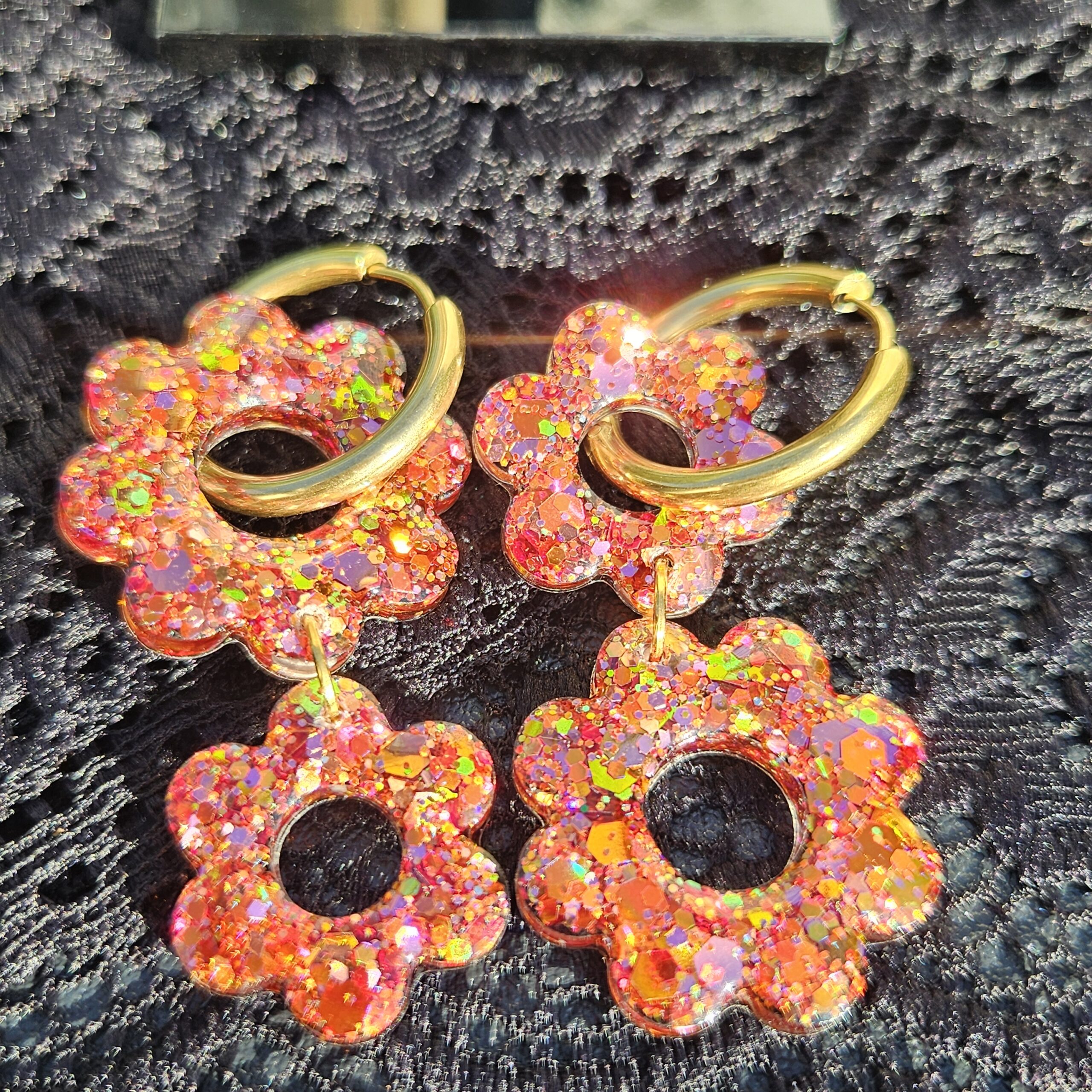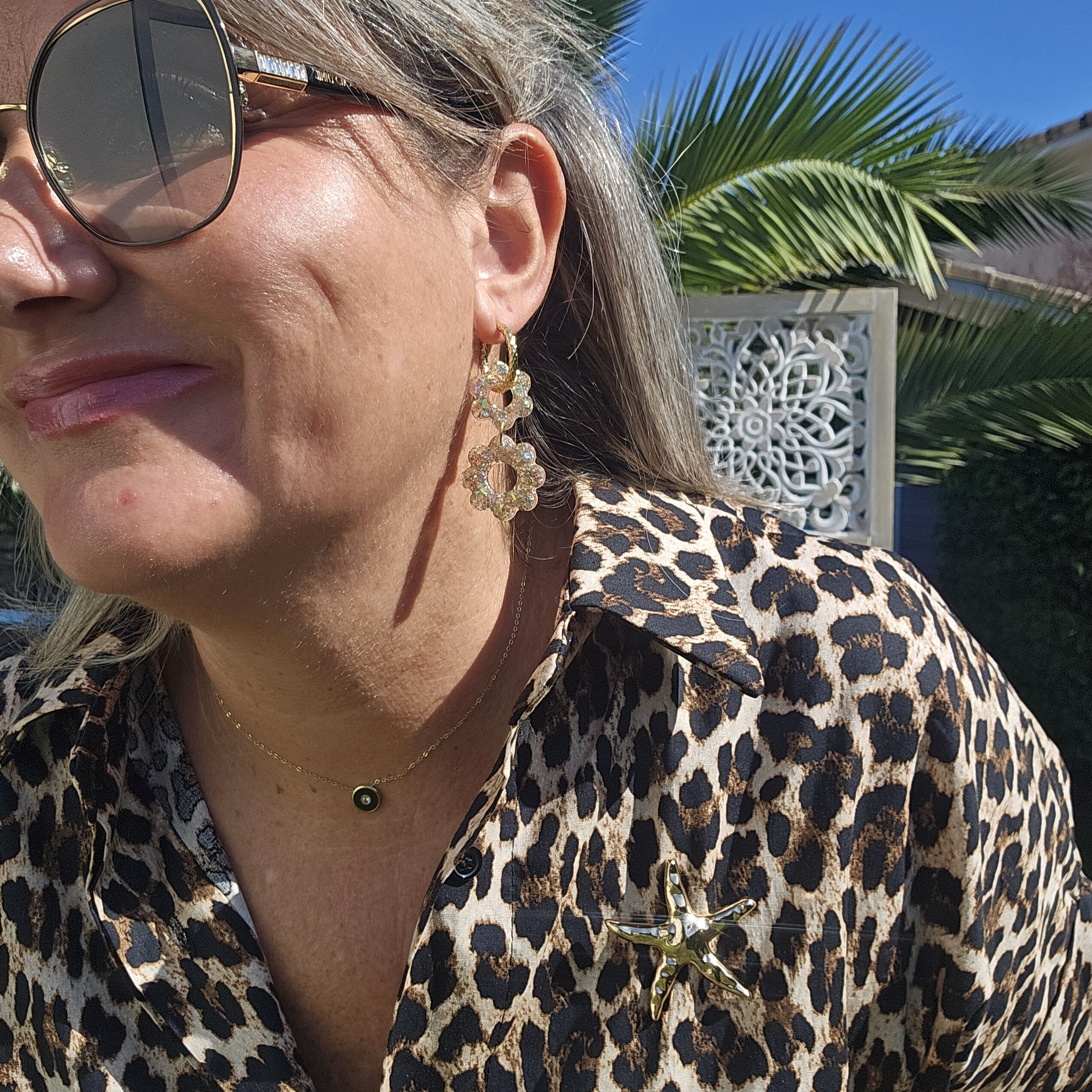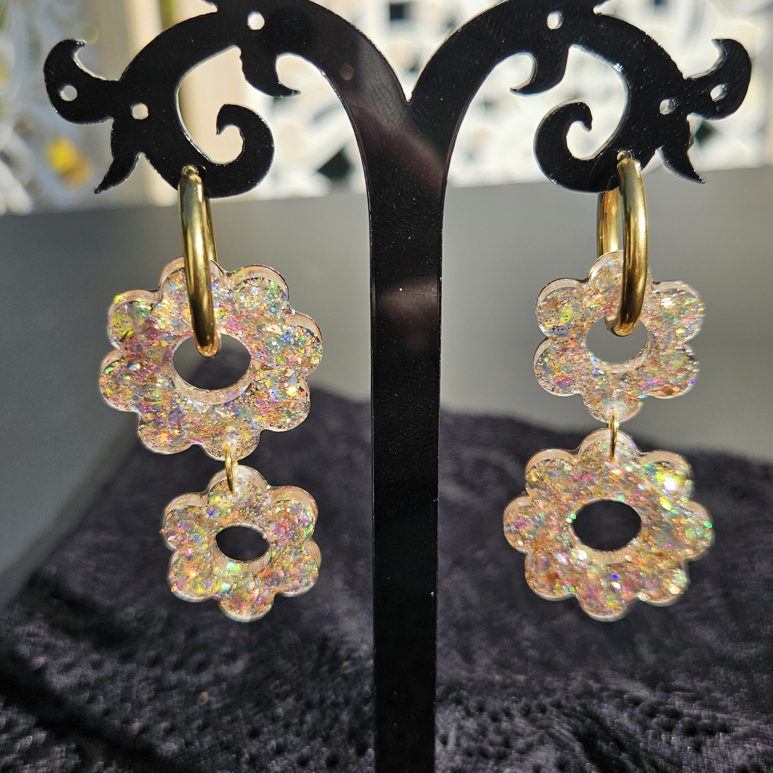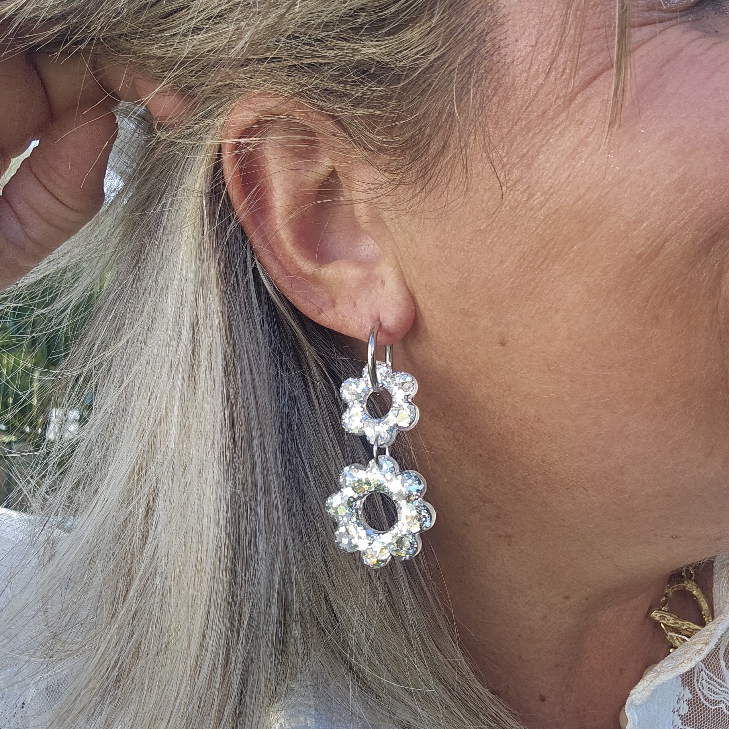 Créole double avec 2 fleurs pailletées de 8 pétales, diamètre 2,5 cm et 2 cm, qu’on peut mettre dans les 2 sens, en mettant la créole soit dans la petite fleur soit dans la grande. Elle est composée de paillettes de différentes tailles, en résine époxy avec un support en acier inoxydable, qui peut être variable : lisse, martelé.. Ses boucles d’oreilles complèteront vos looks du quotidien aux moments plus spéciaux. A associer absolument avec les bagues !!!