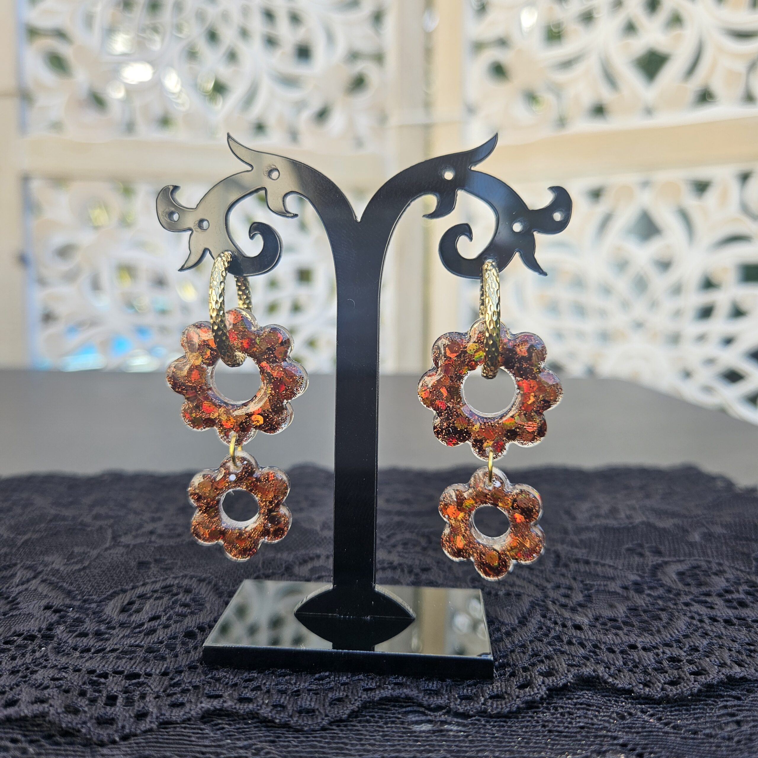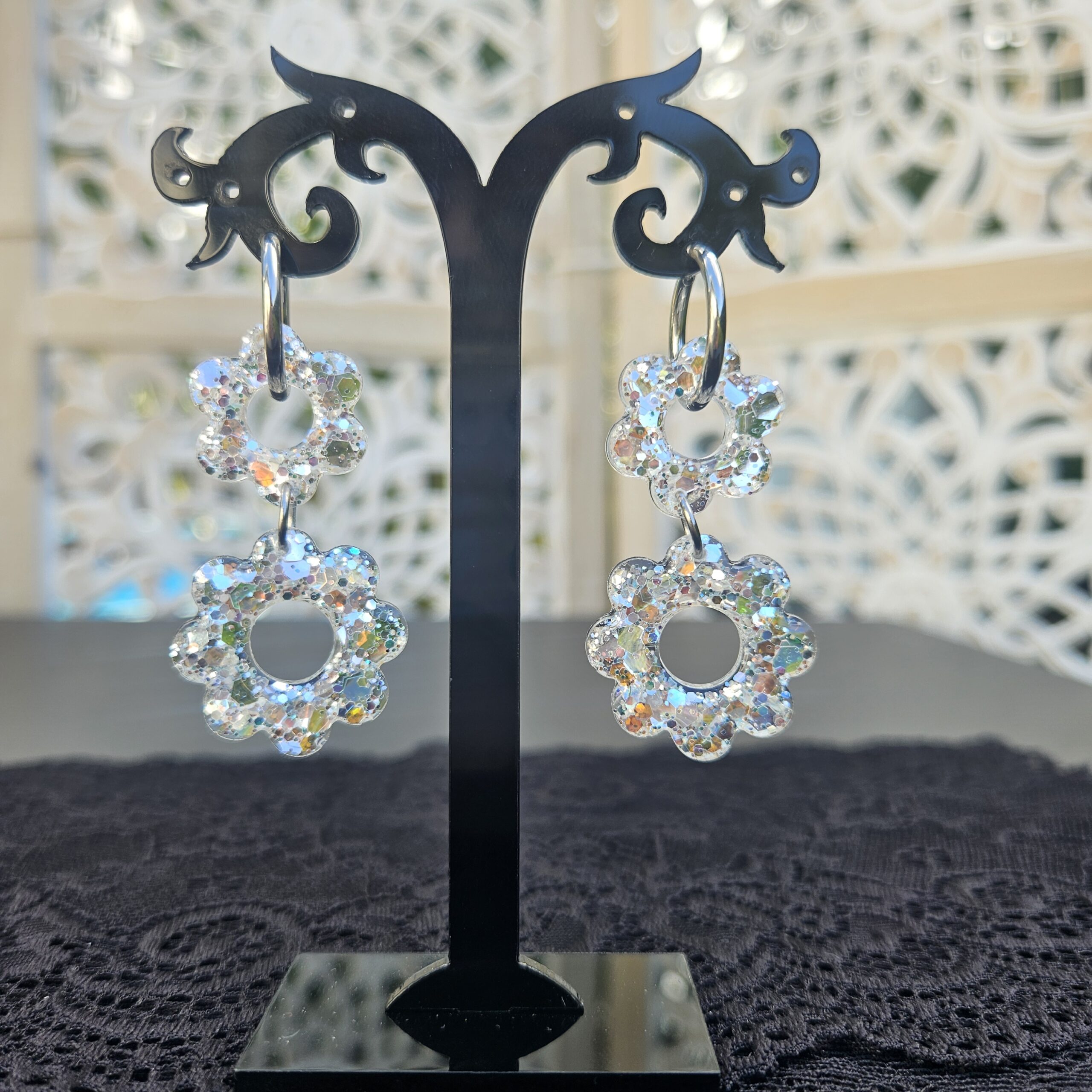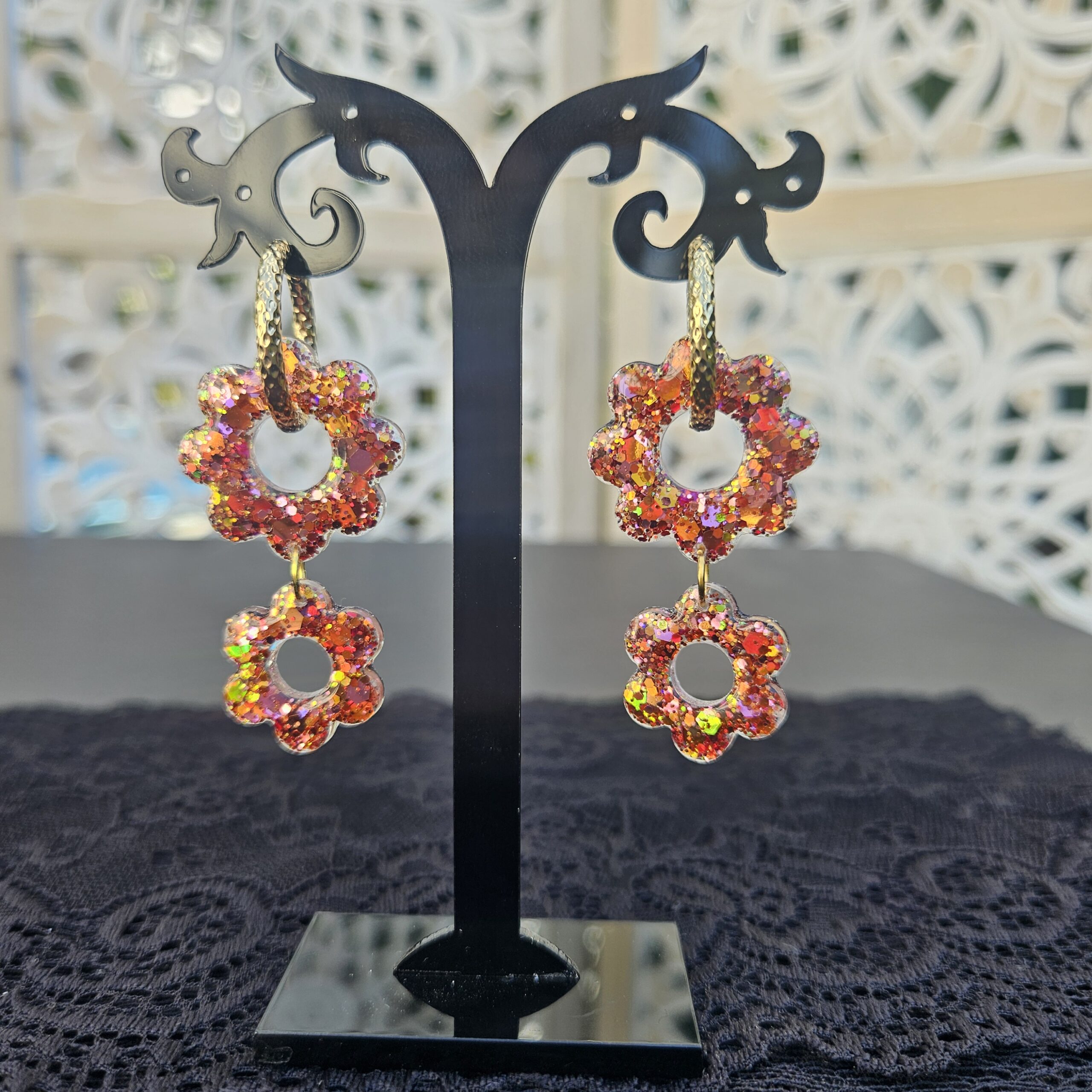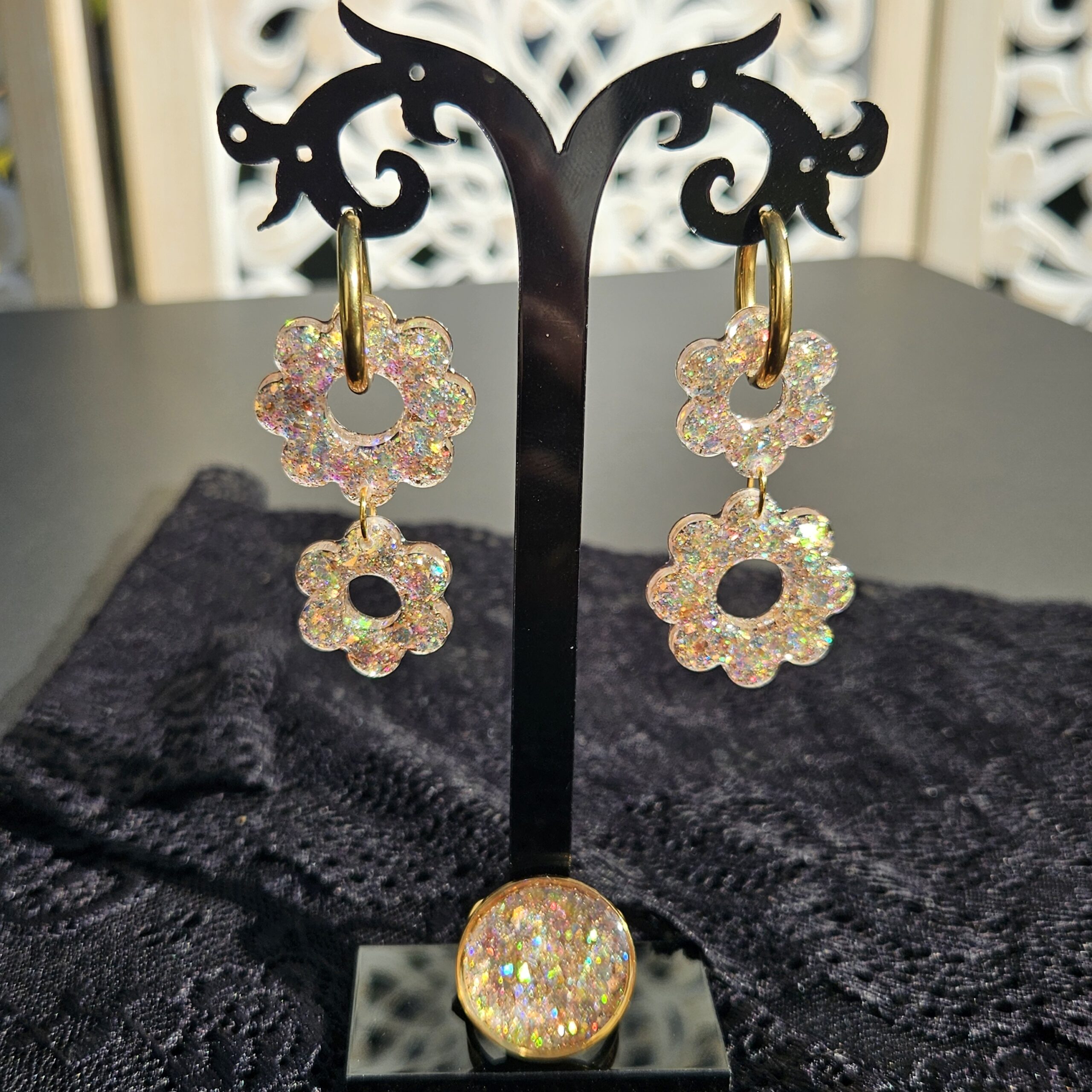 Créole double avec 2 fleurs pailletées de 8 pétales, diamètre 2,5 cm et 2 cm, qu’on peut mettre dans les 2 sens, en mettant la créole soit dans la petite fleur soit dans la grande. Elle est composée de paillettes de différentes tailles, en résine époxy avec un support en acier inoxydable, qui peut être variable : lisse, martelé.. Ses boucles d’oreilles complèteront vos looks du quotidien aux moments plus spéciaux. A associer absolument avec les bagues !!!