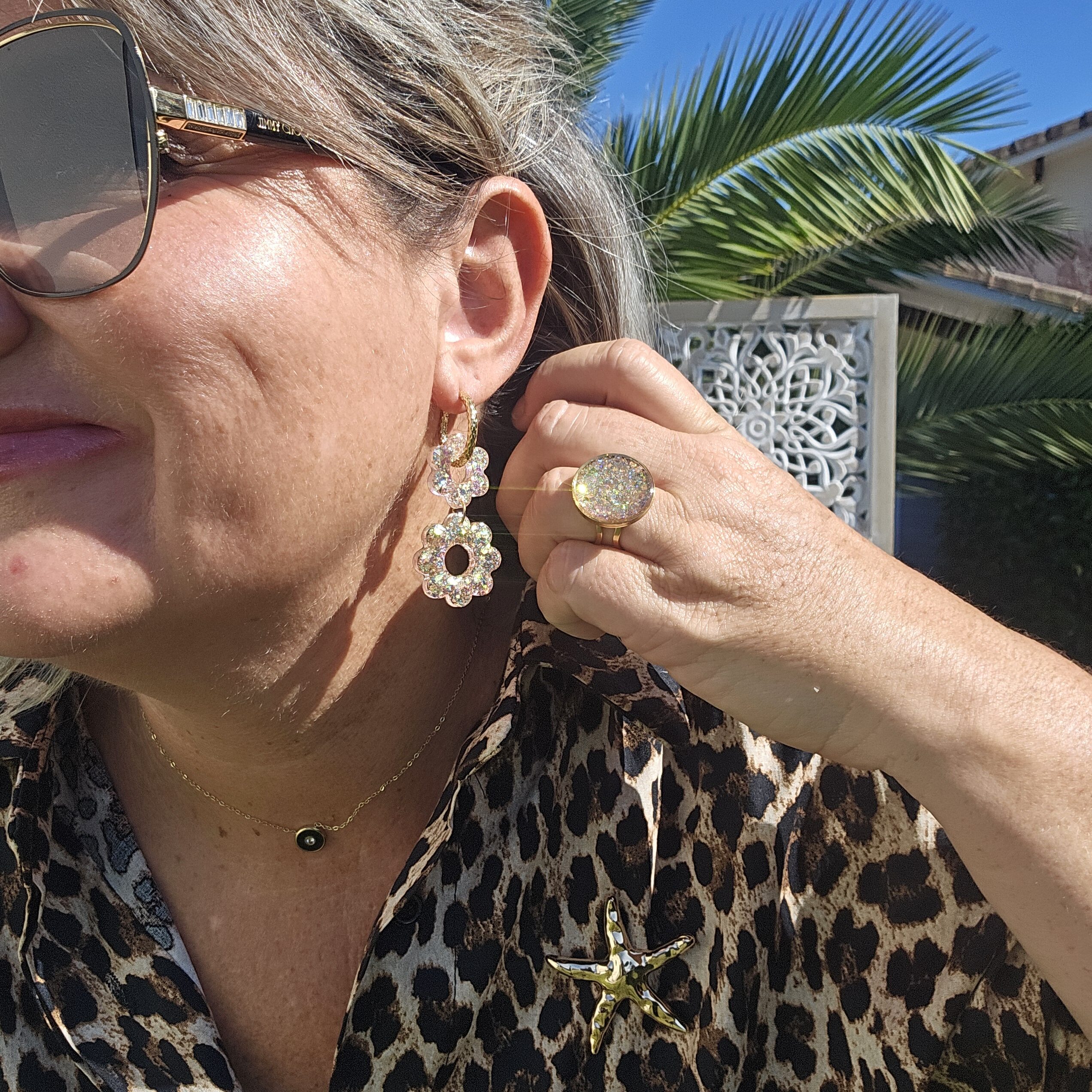 Mon regard pailleté : Fabrication artisanale et locale, par les mains de Sylvie. En raison de cette fabrication artisanale, chaque bague et boucles d’oreilles est unique et la disposition des paillettes peut varier par rapport aux photos de présentation. Les photos sont prises avec le soleil, les couleurs peuvent variées, et les bijoux sont encore plus beaux en vrai !!