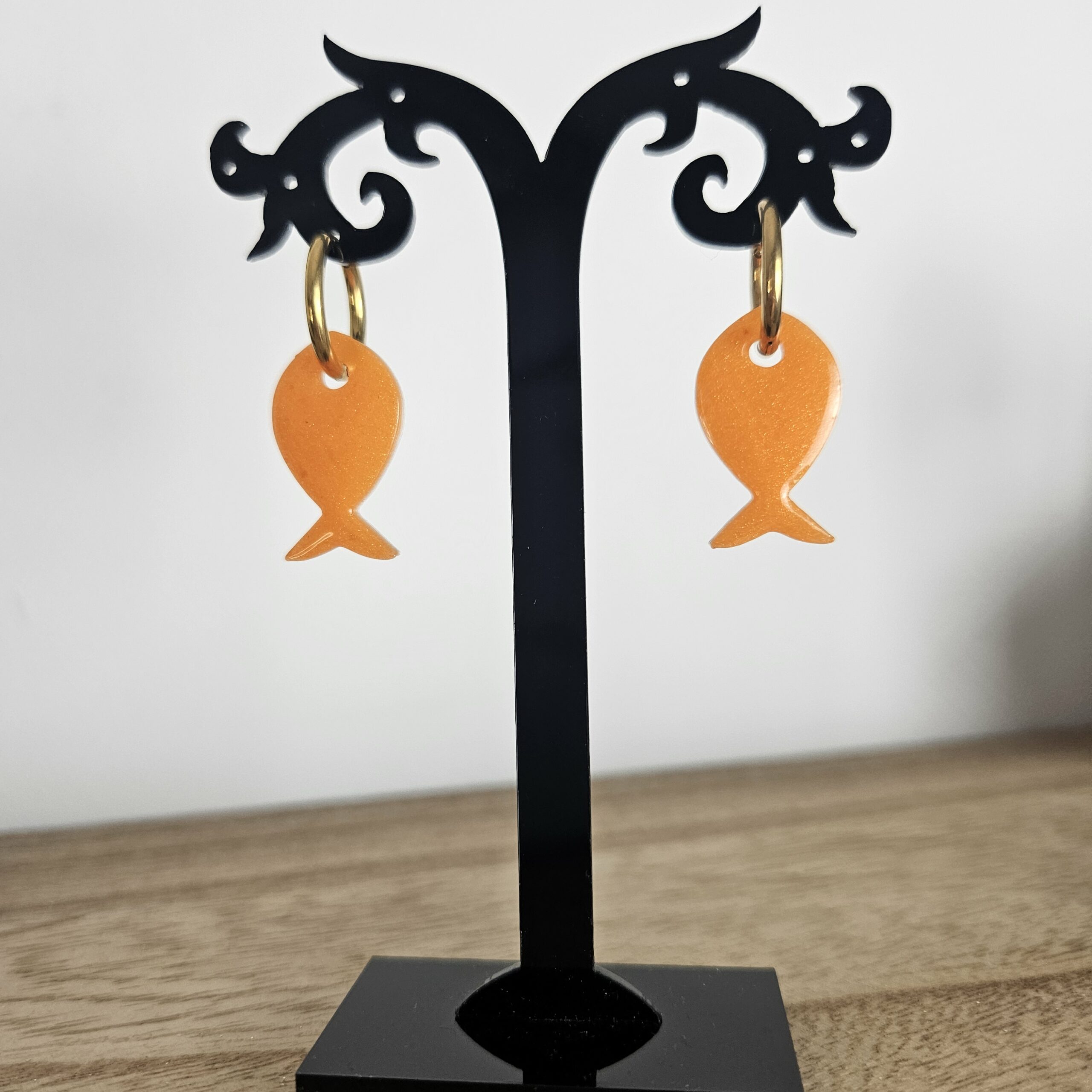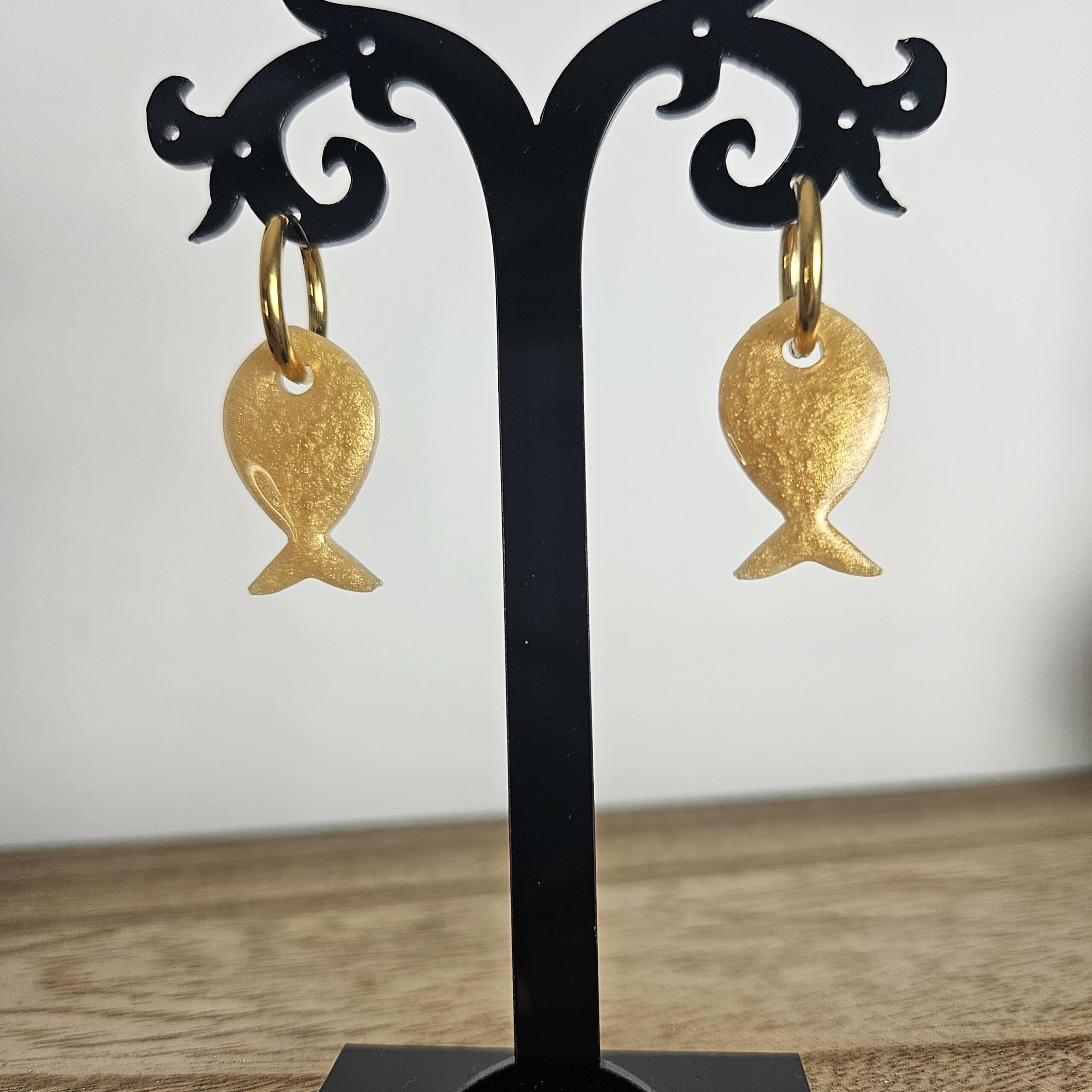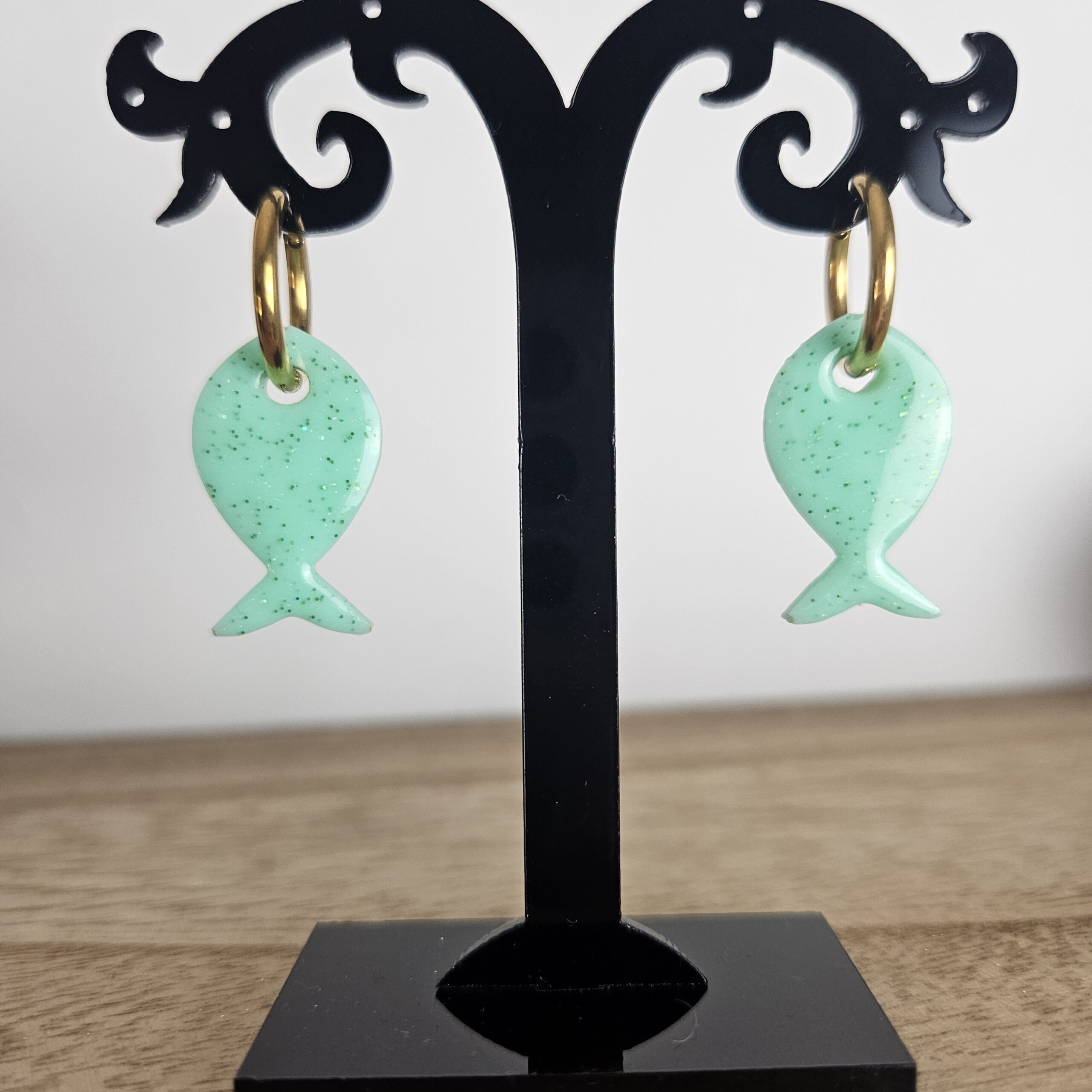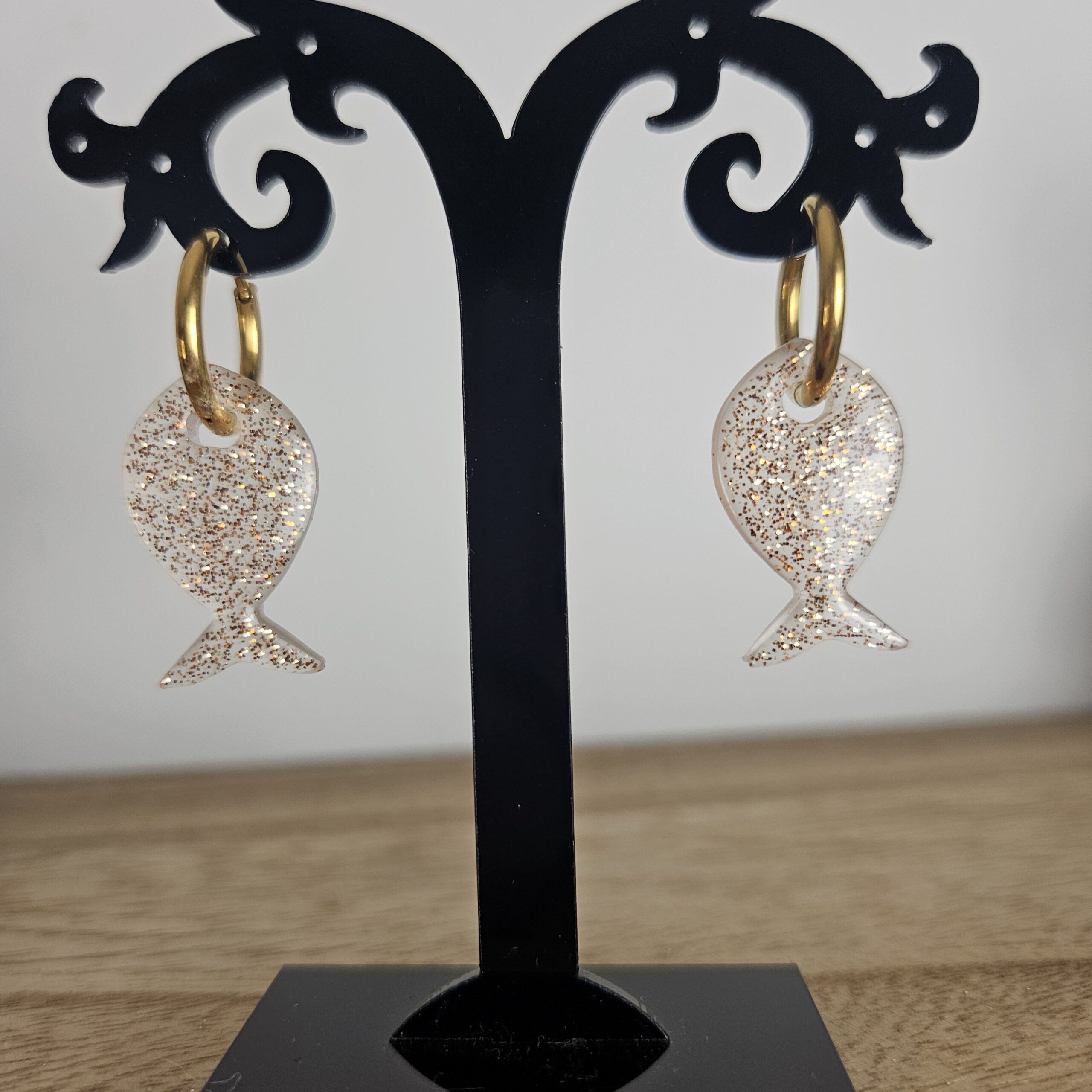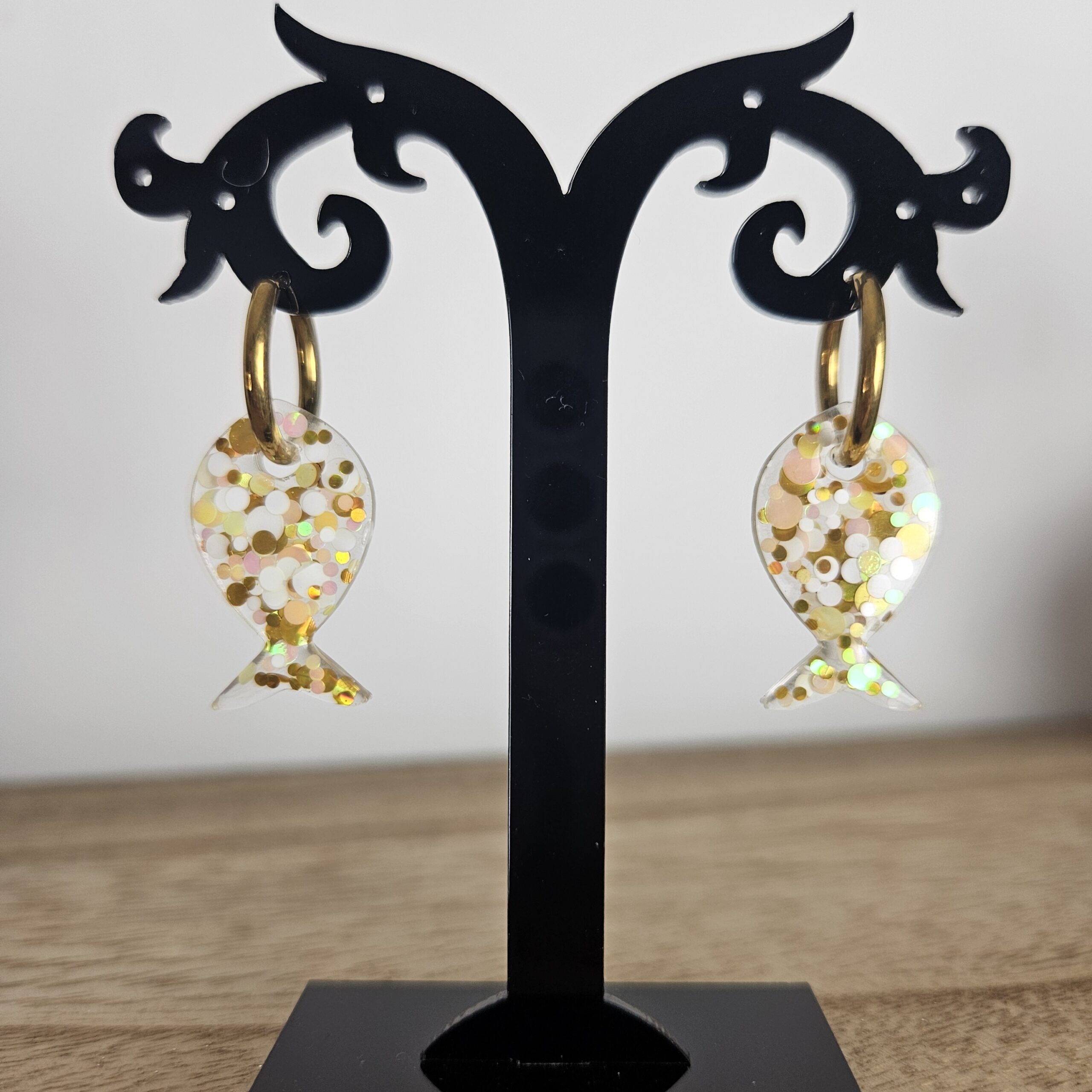 Créole poisson pailleté, taille 2,5 cm, créole 1,2 cm, composée de paillettes de différentes tailles, en résine époxy avec un support en acier inoxydable, qui peut être variable : lisse, martelé.. Ses boucles d’oreilles complèteront vos looks du quotidien aux moments plus spéciaux.