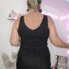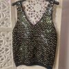 Débardeur noir en laine tout doux, avec des sequins dorés sur le devant, col V devant et derrière, uni derrière. TU